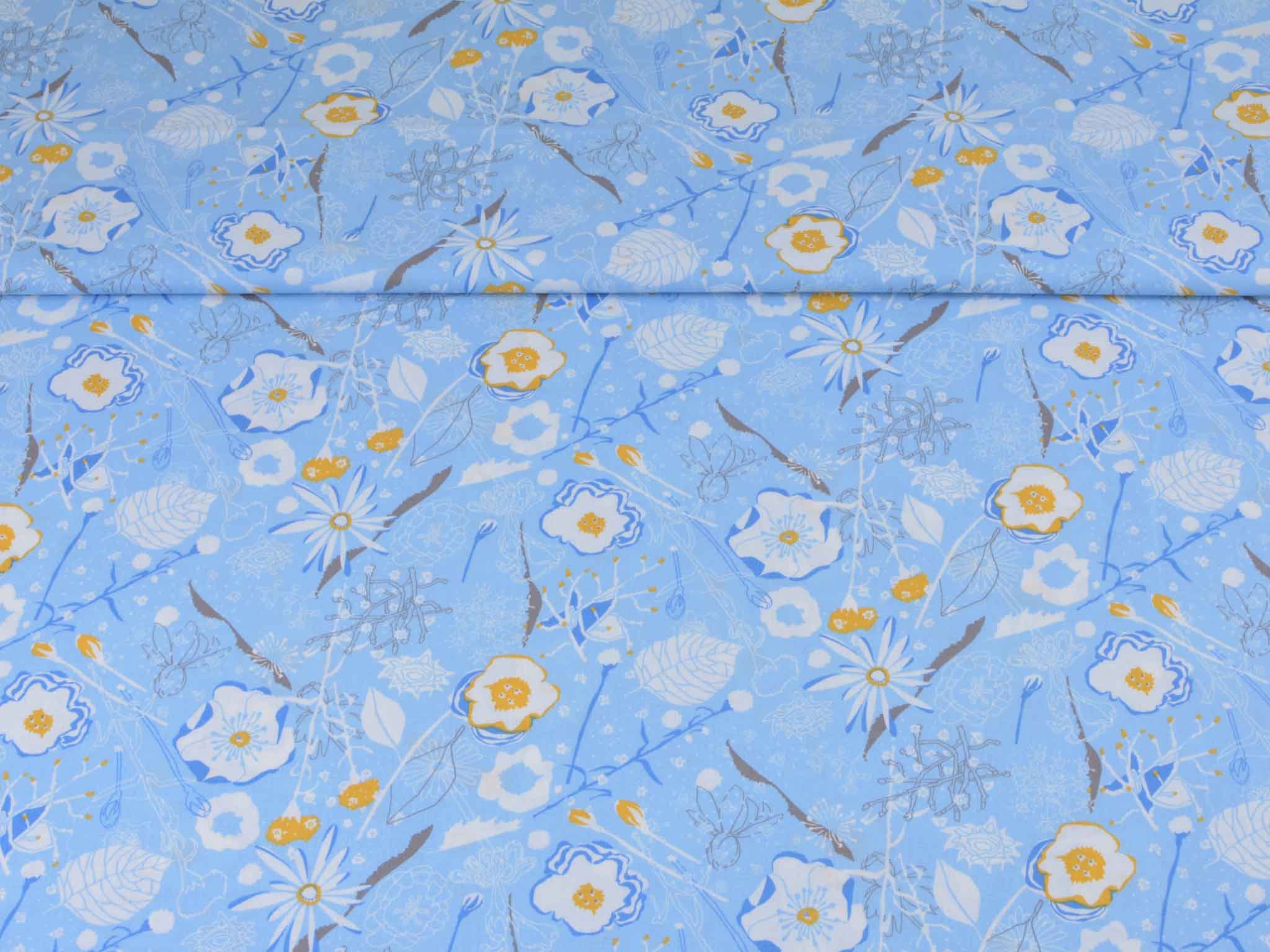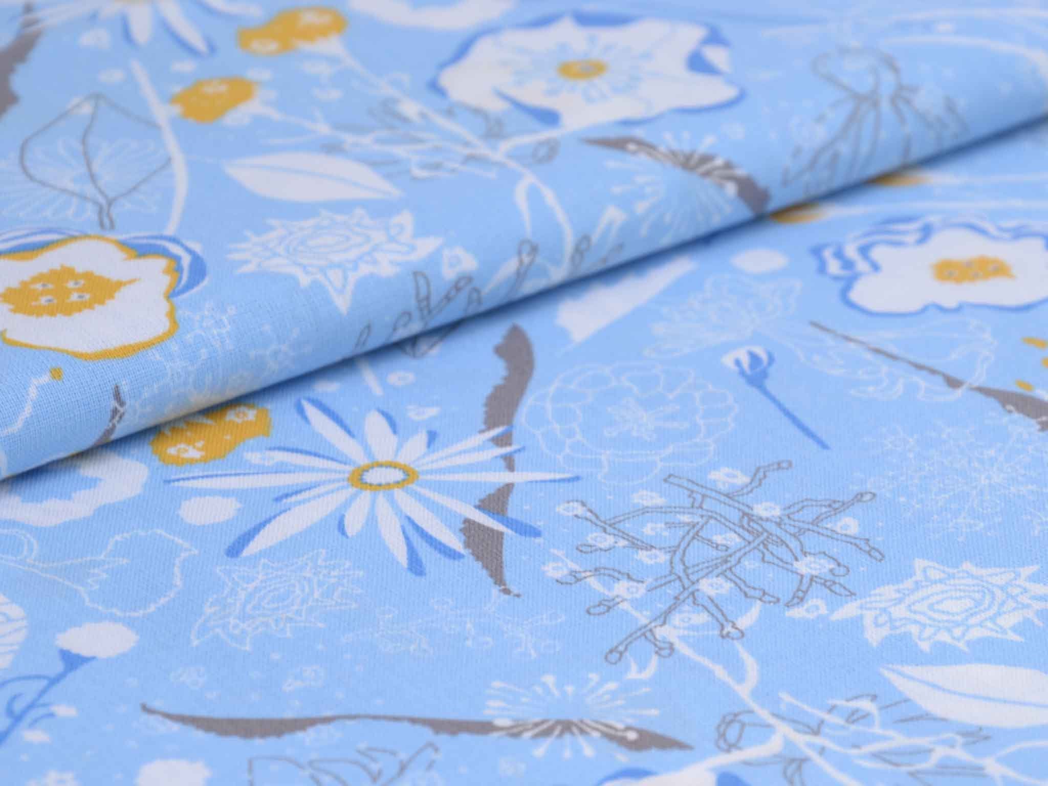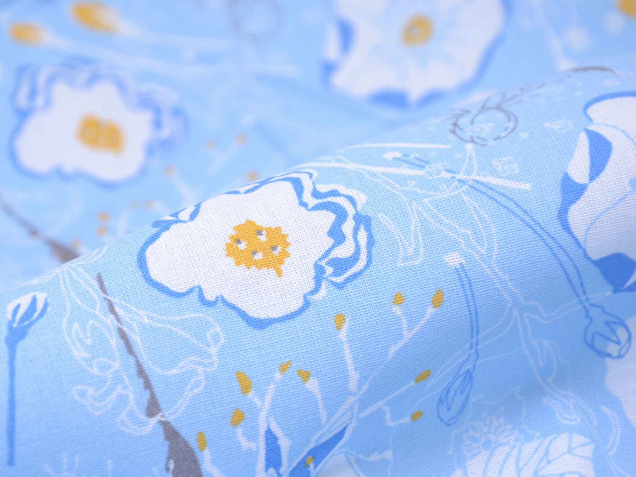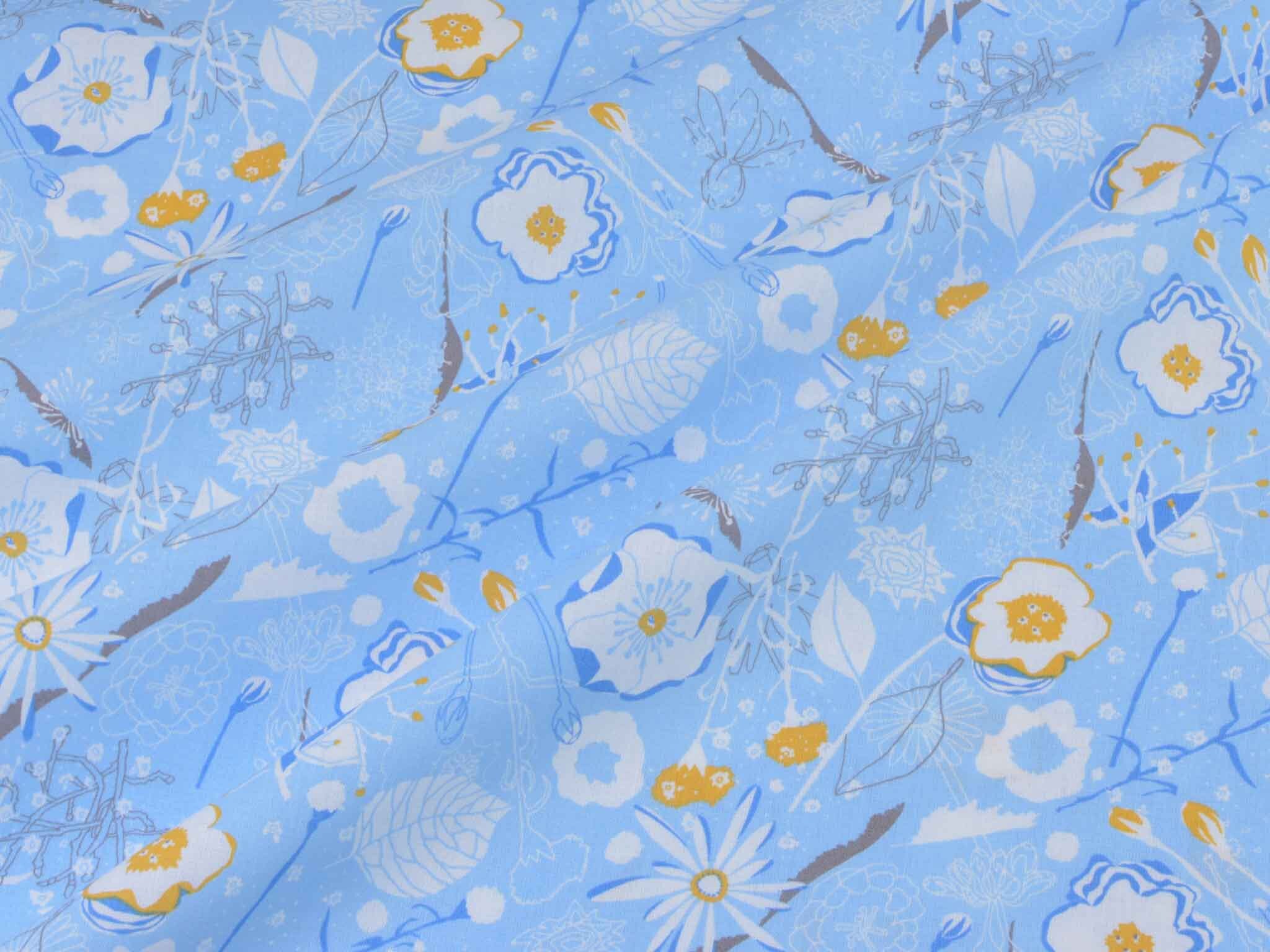 Sehr hochwertige Webware aus Baumwolle von Westfalenstoffe. Der Druckstoff ist hellblau mit Blumen in weiß. Die gelbe Blume ist ca. 3,5 cm groß. Er ist glatt und matt. Nähe daraus Blusen, Kleider, Röcke, Kissen, Taschen und vieles mehr. Der Stoff ist made in Germany.