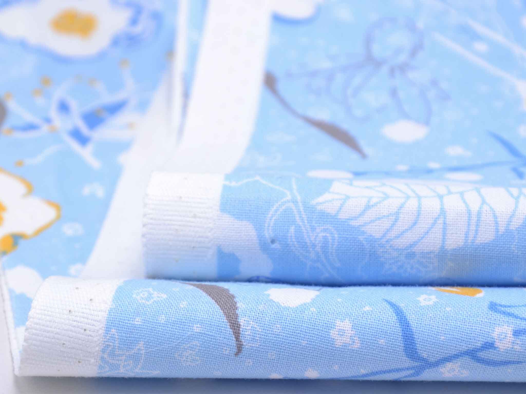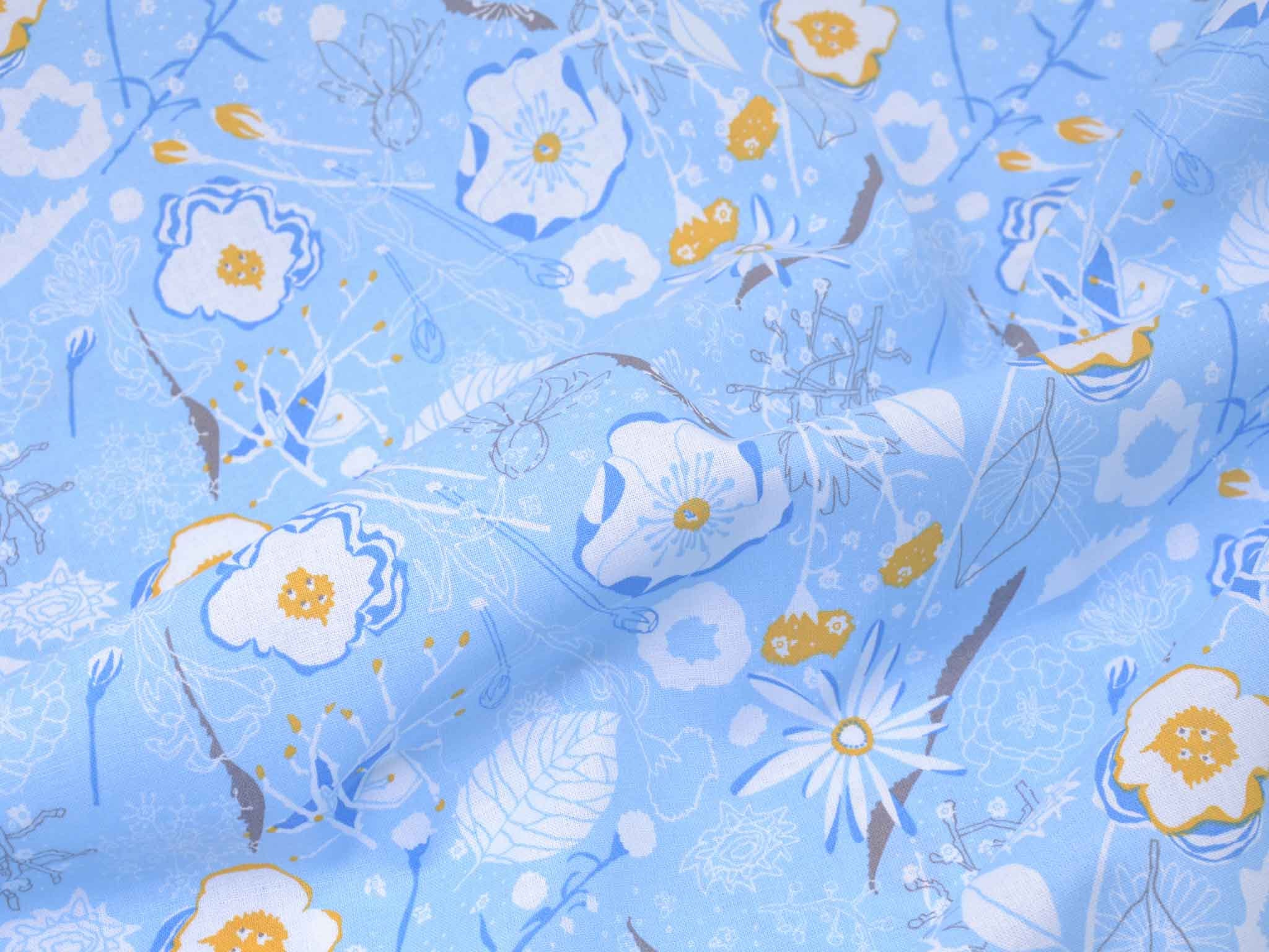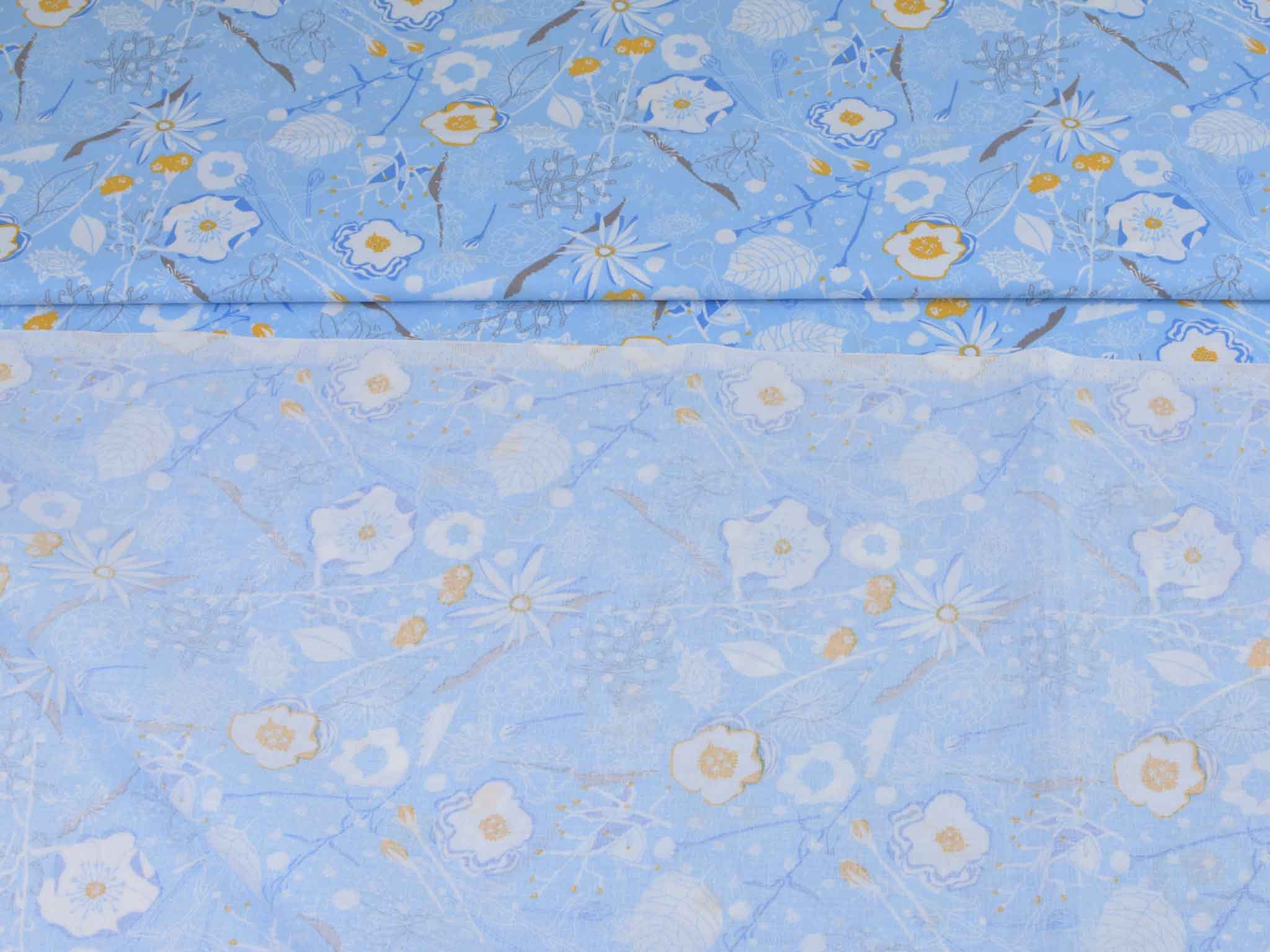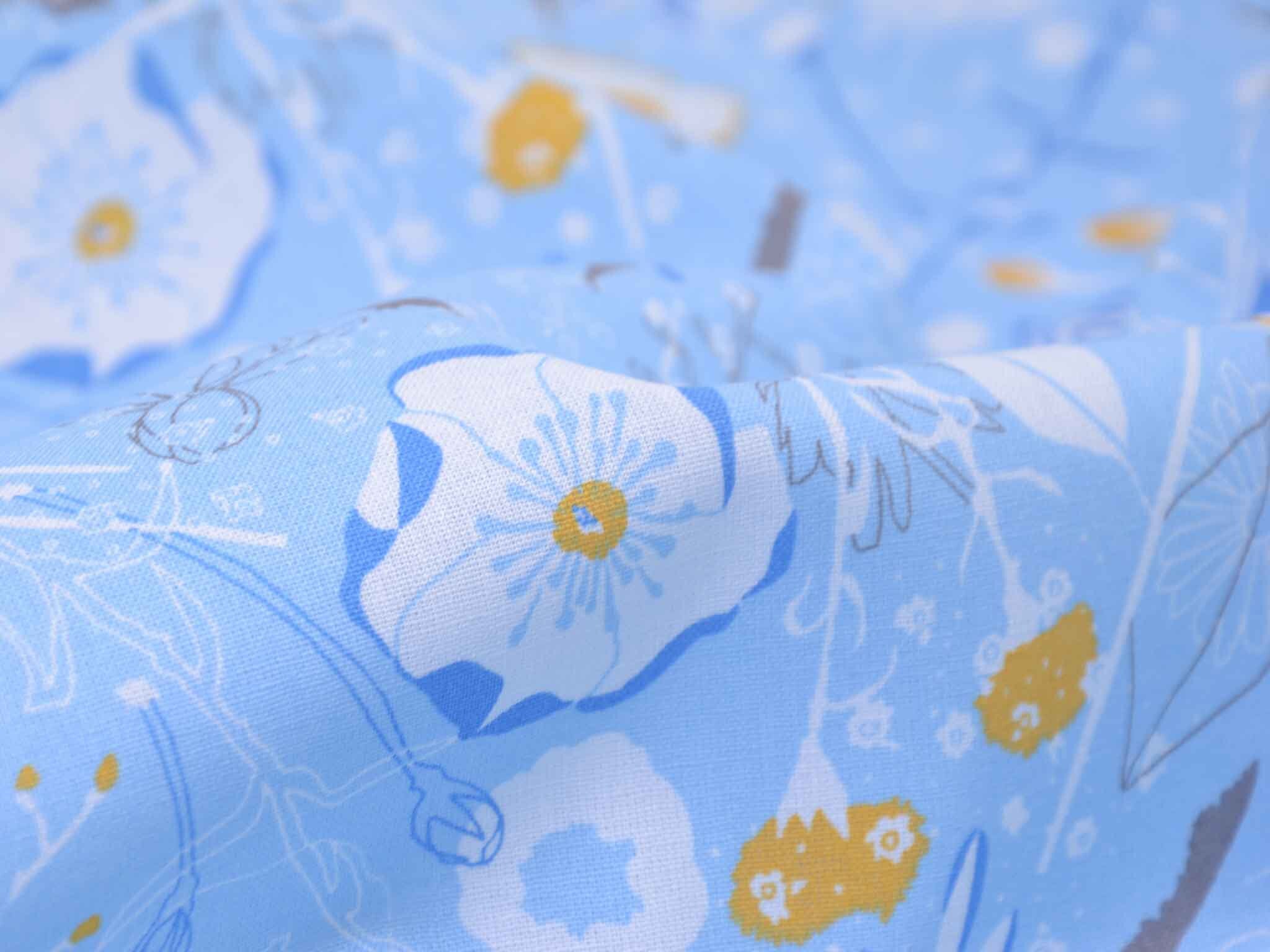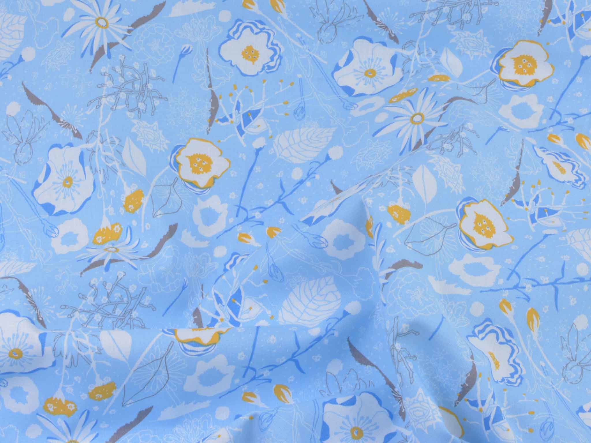 Sehr hochwertige Webware aus Baumwolle von Westfalenstoffe. Der Druckstoff ist hellblau mit Blumen in weiß. Die gelbe Blume ist ca. 3,5 cm groß. Er ist glatt und matt. Nähe daraus Blusen, Kleider, Röcke, Kissen, Taschen und vieles mehr. Der Stoff ist made in Germany.