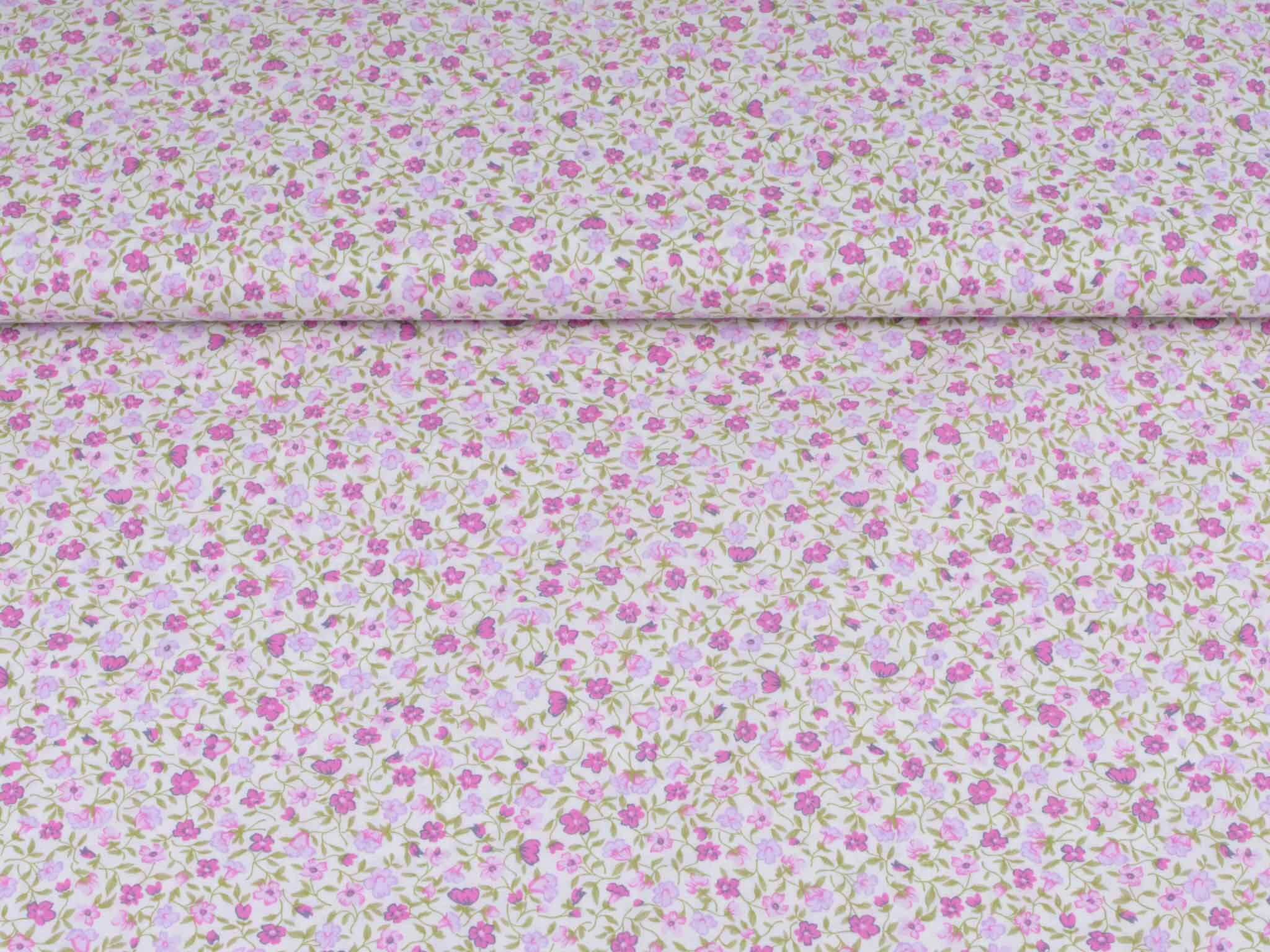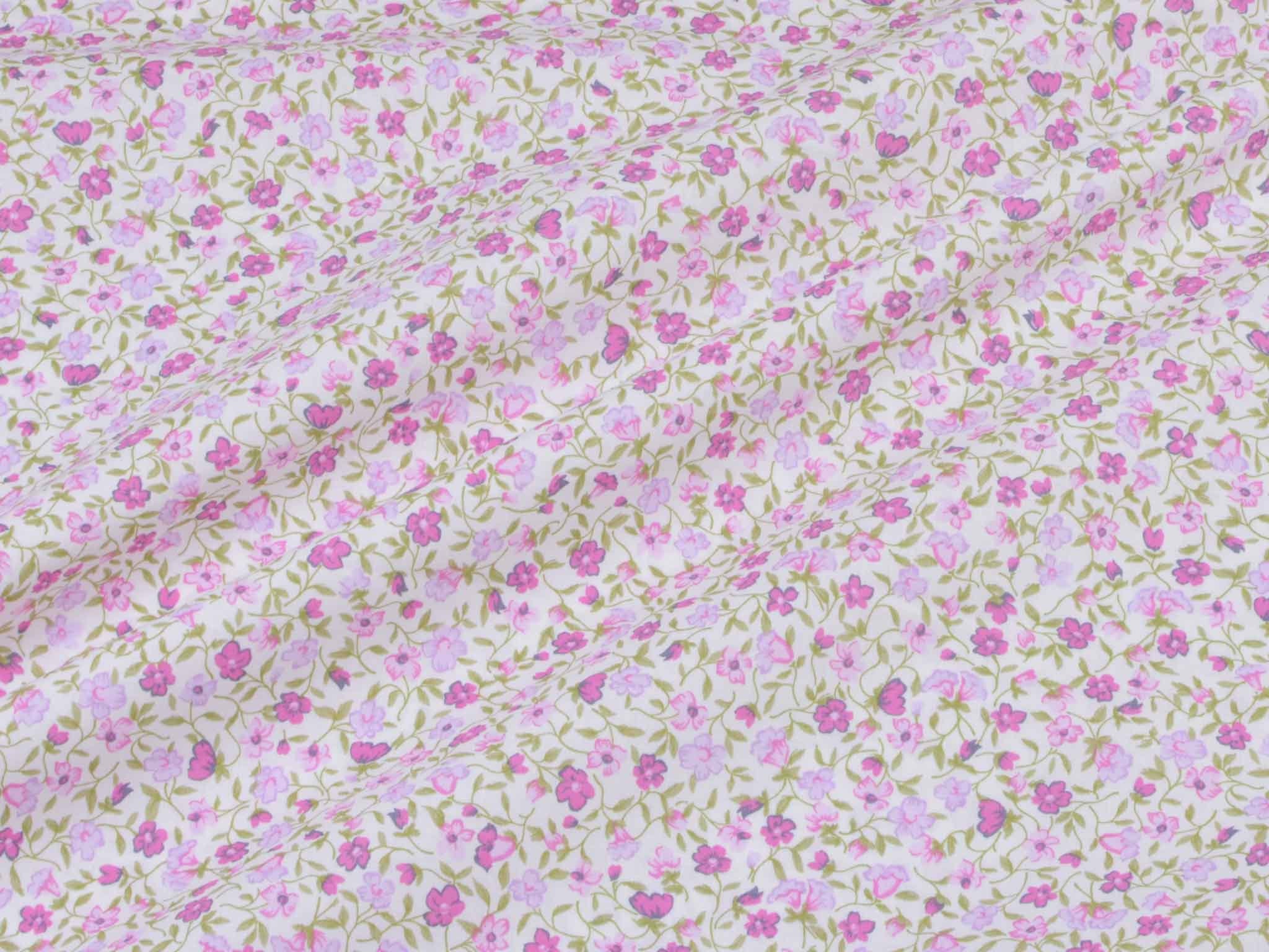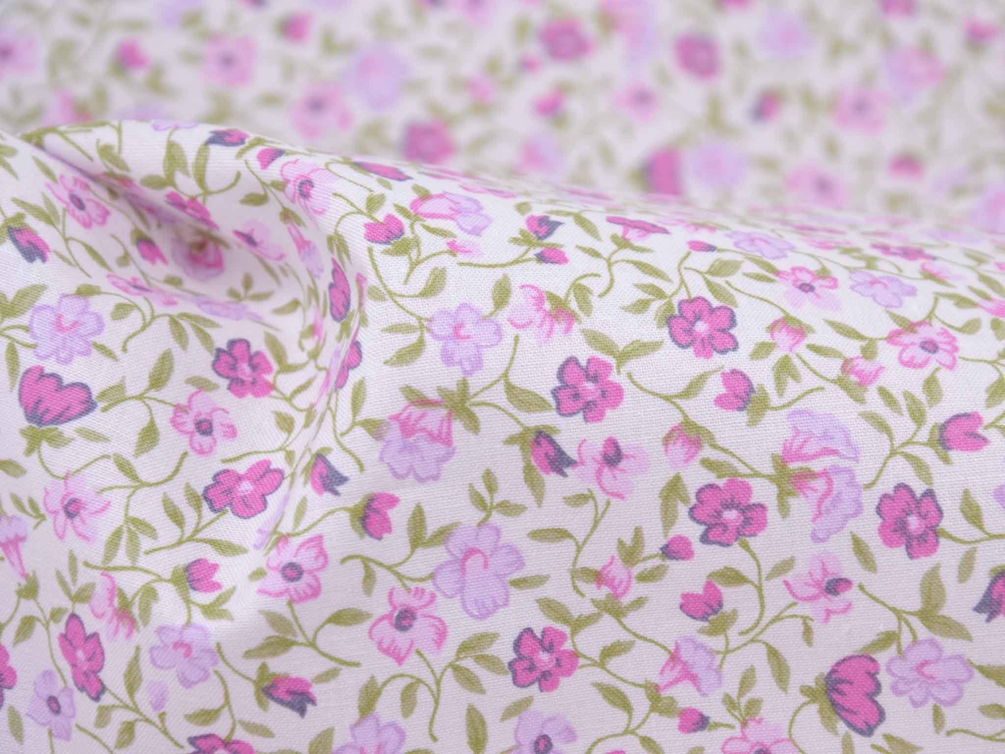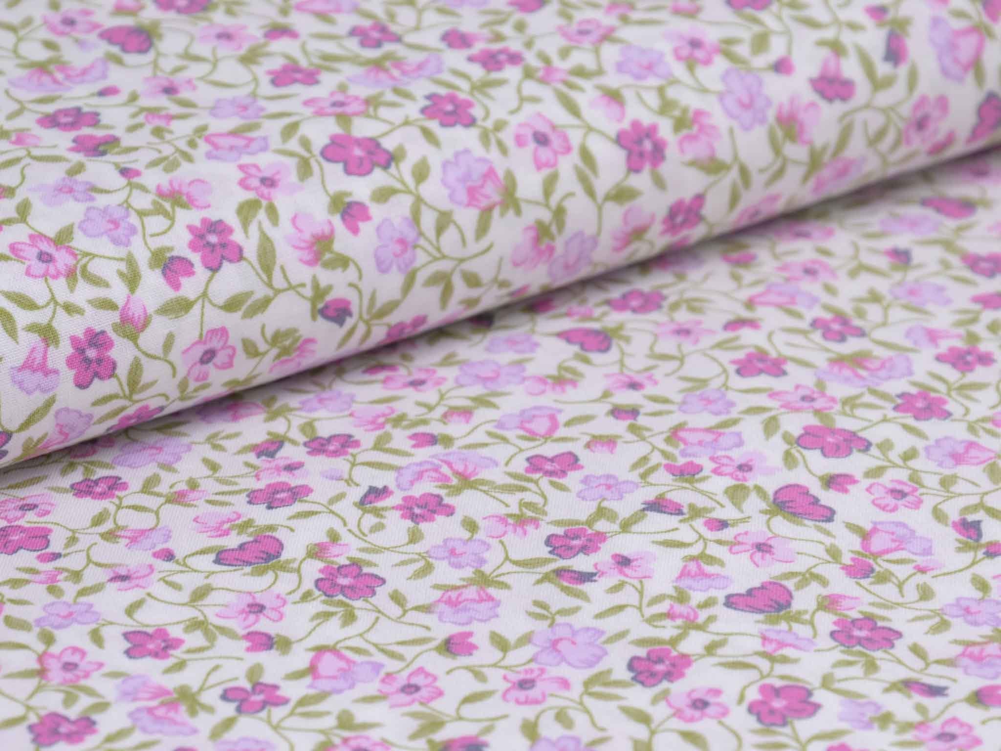 Sehr hochwertiger Webstoff aus Baumwolle von Westfalenstoffe. Der Druckstoff ist weiß mit kleinen rosa und lila Blümchen. Er ist glatt und matt. Nähe daraus Blusen, Kleider, Röcke, Kissen, Taschen und vieles mehr. Der Stoff ist made in Germany.