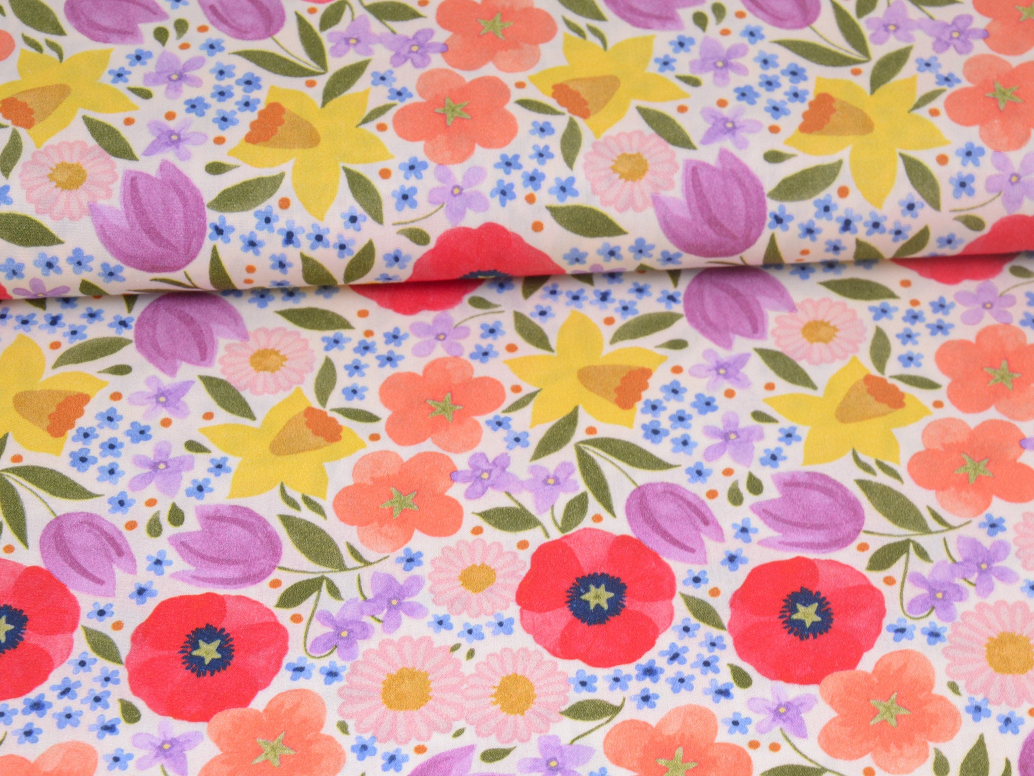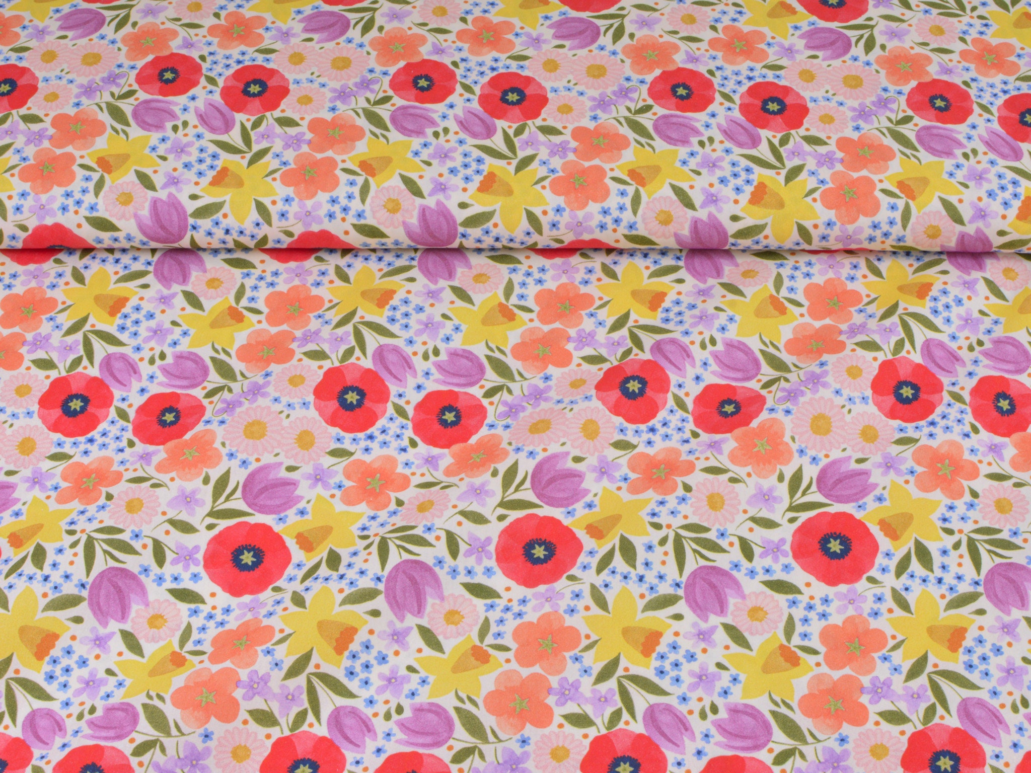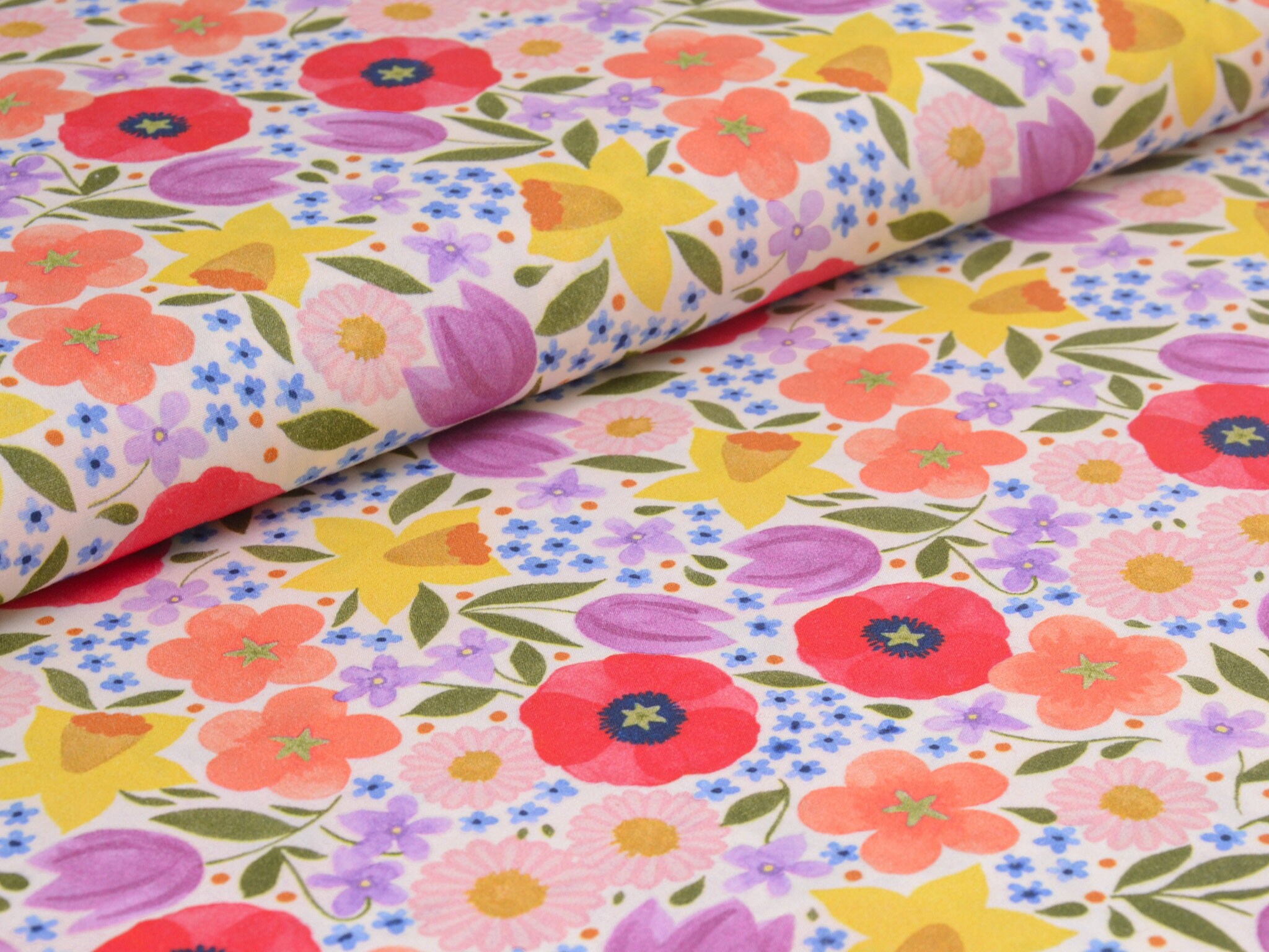 Baumwollstoff aus der Serie Emilie von Hilco. Die glatte, dünne Baumwolle aus der Emilie-Oster-Collection ist creme-weiß mit bunten Blumen. Alle Stoff der Emilie-Collection lassen sich wunderbar miteinander kombinieren. Nähe daraus Deko für Ostern, nutze den Stoff zum Patchworken, nähe Kissen, Utensilos und so vieles mehr.