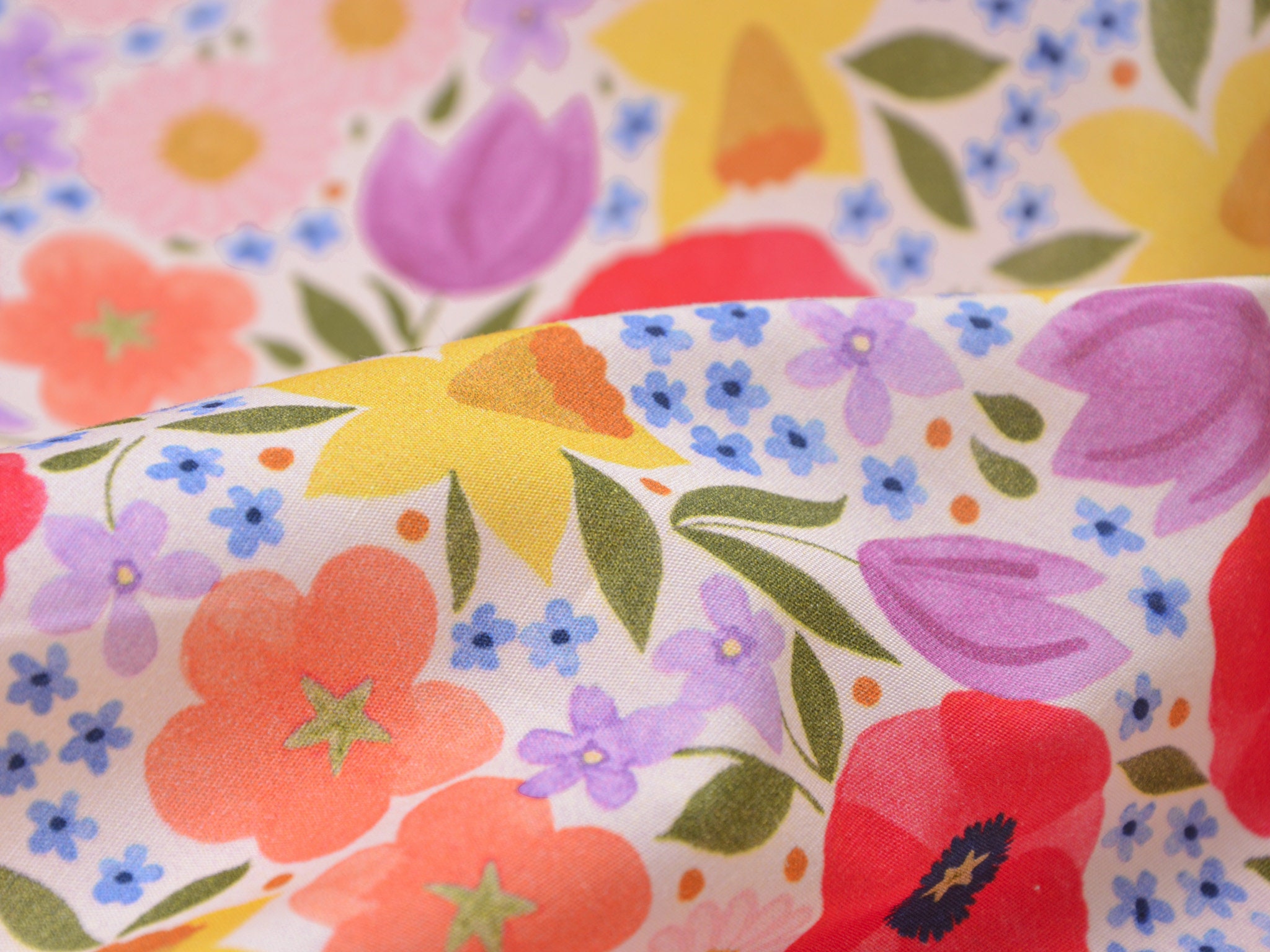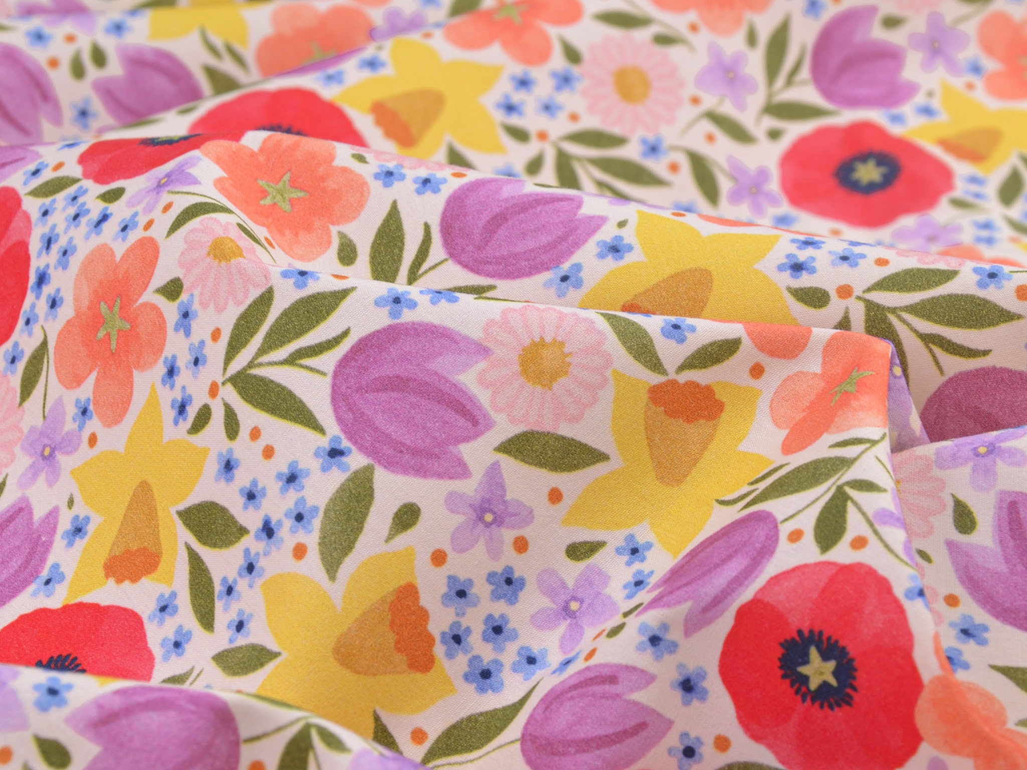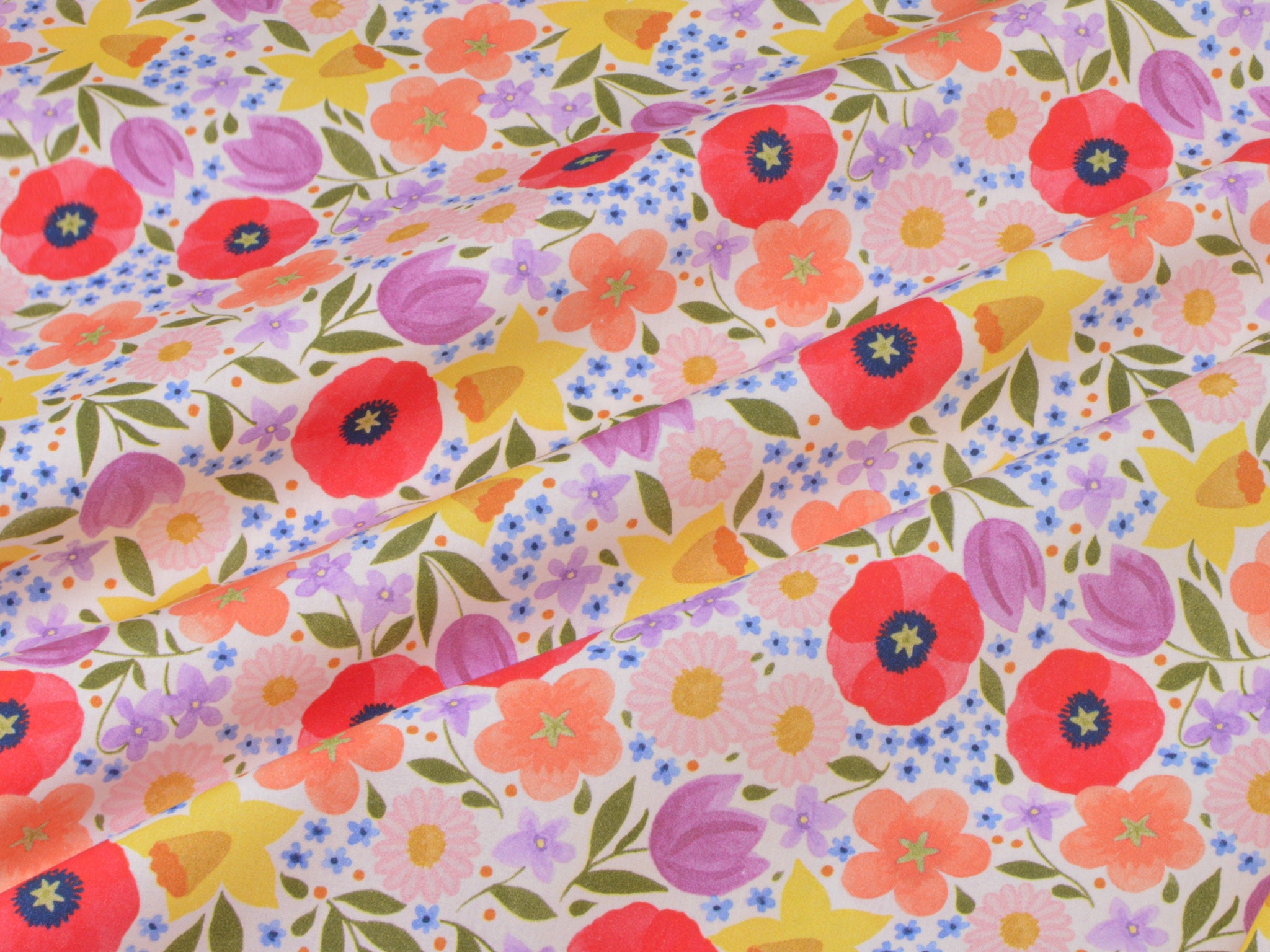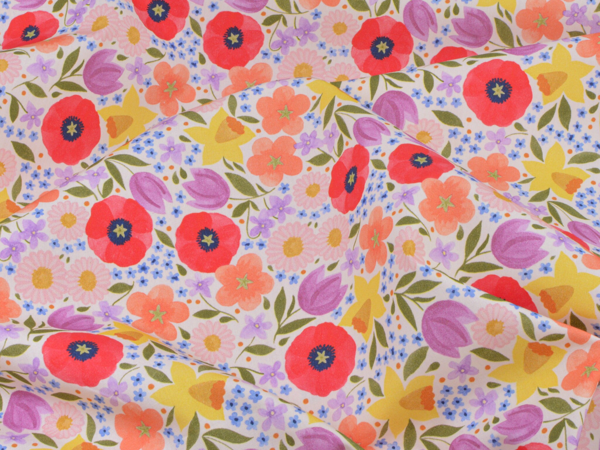 Baumwollstoff aus der Serie Emilie von Hilco. Die glatte, dünne Baumwolle aus der Emilie-Oster-Collection ist creme-weiß mit bunten Blumen. Alle Stoff der Emilie-Collection lassen sich wunderbar miteinander kombinieren. Nähe daraus Deko für Ostern, nutze den Stoff zum Patchworken, nähe Kissen, Utensilos und so vieles mehr.