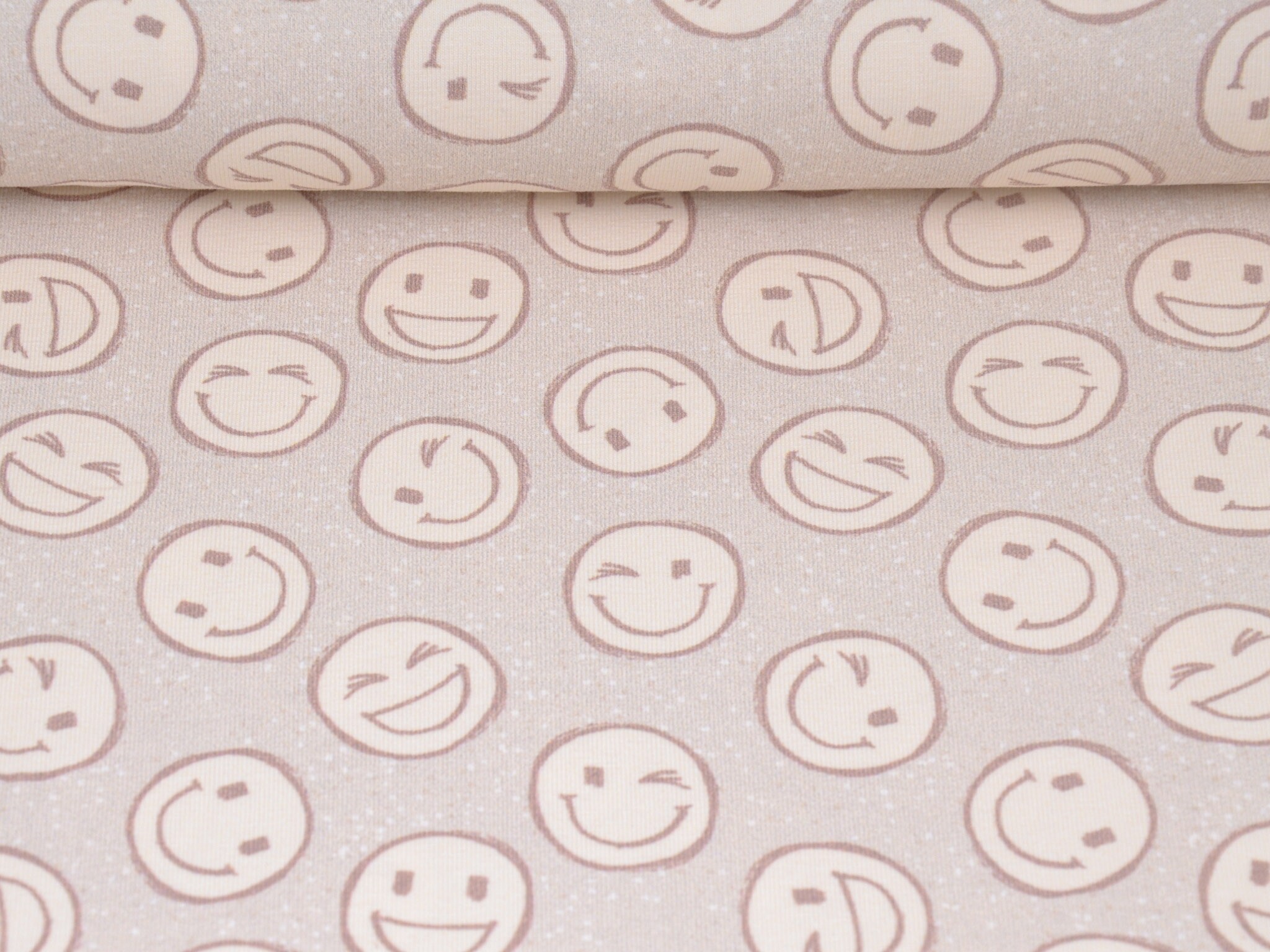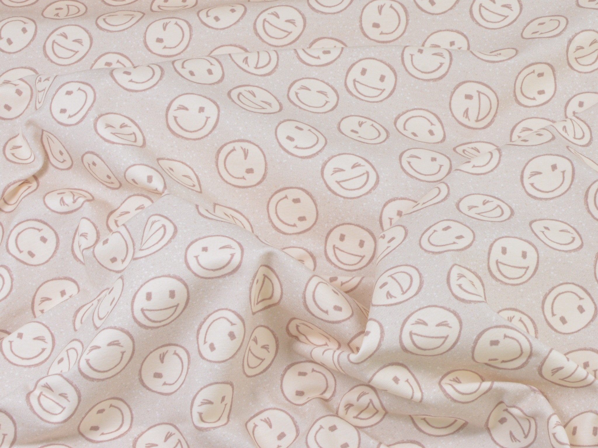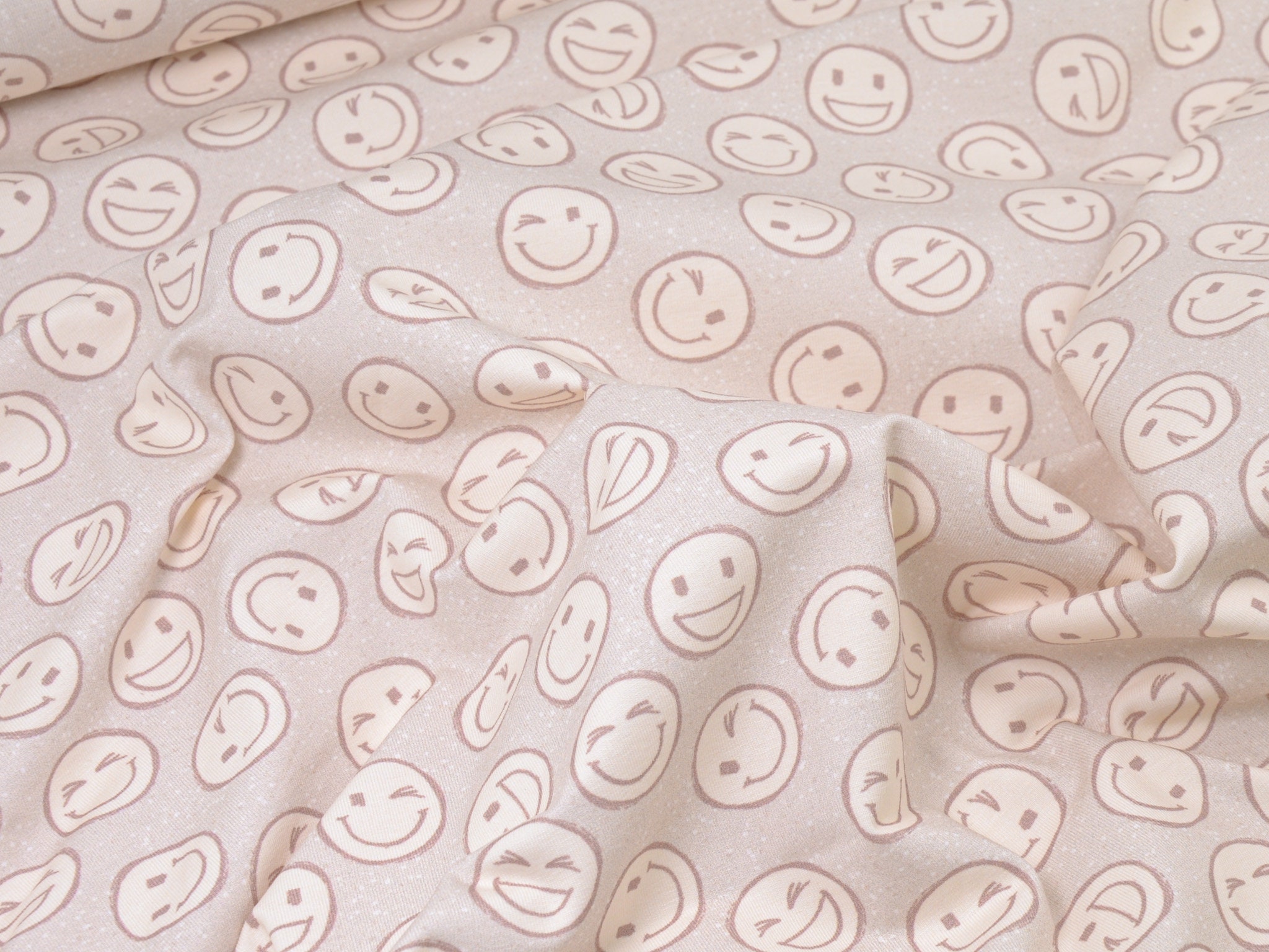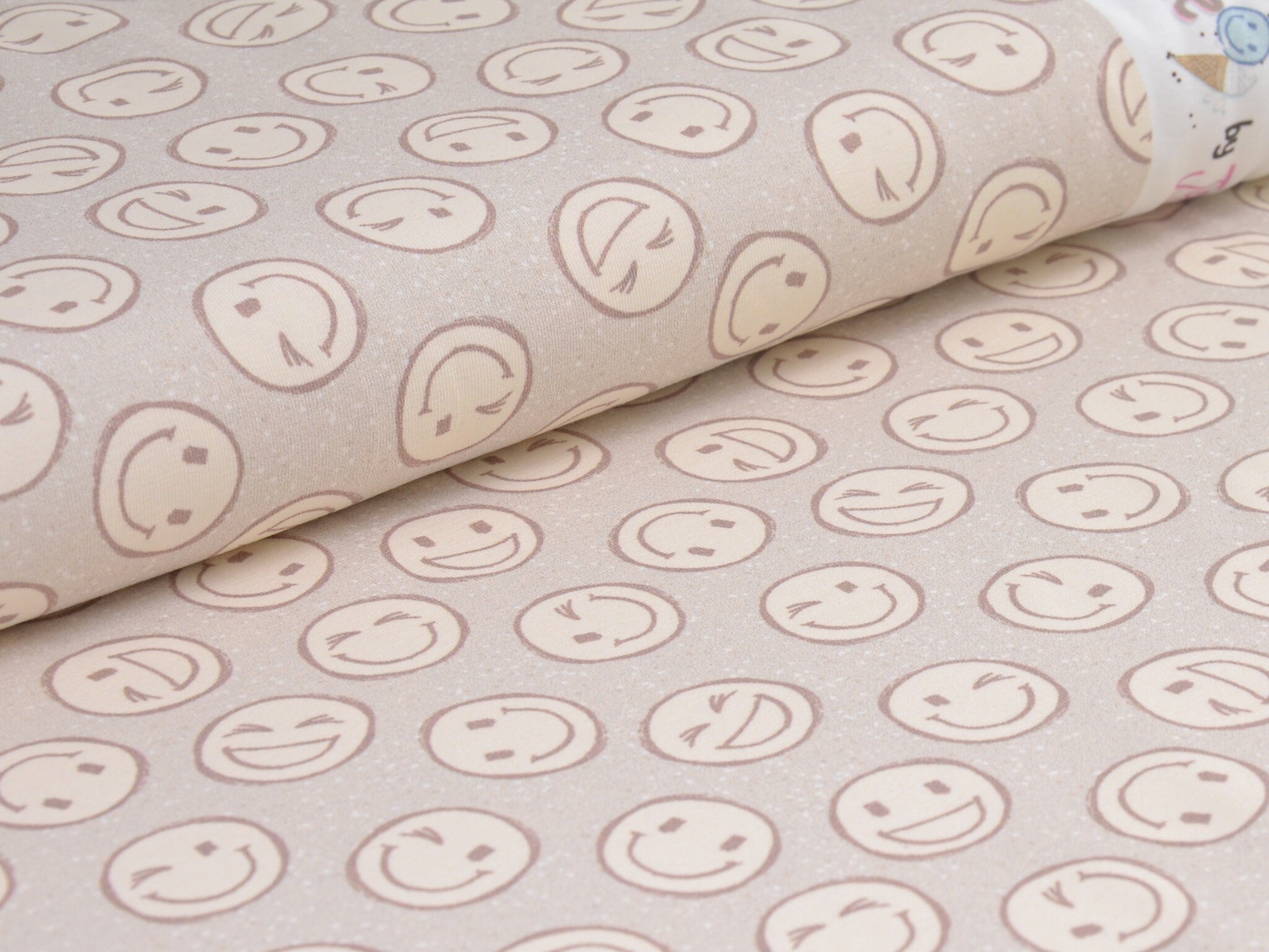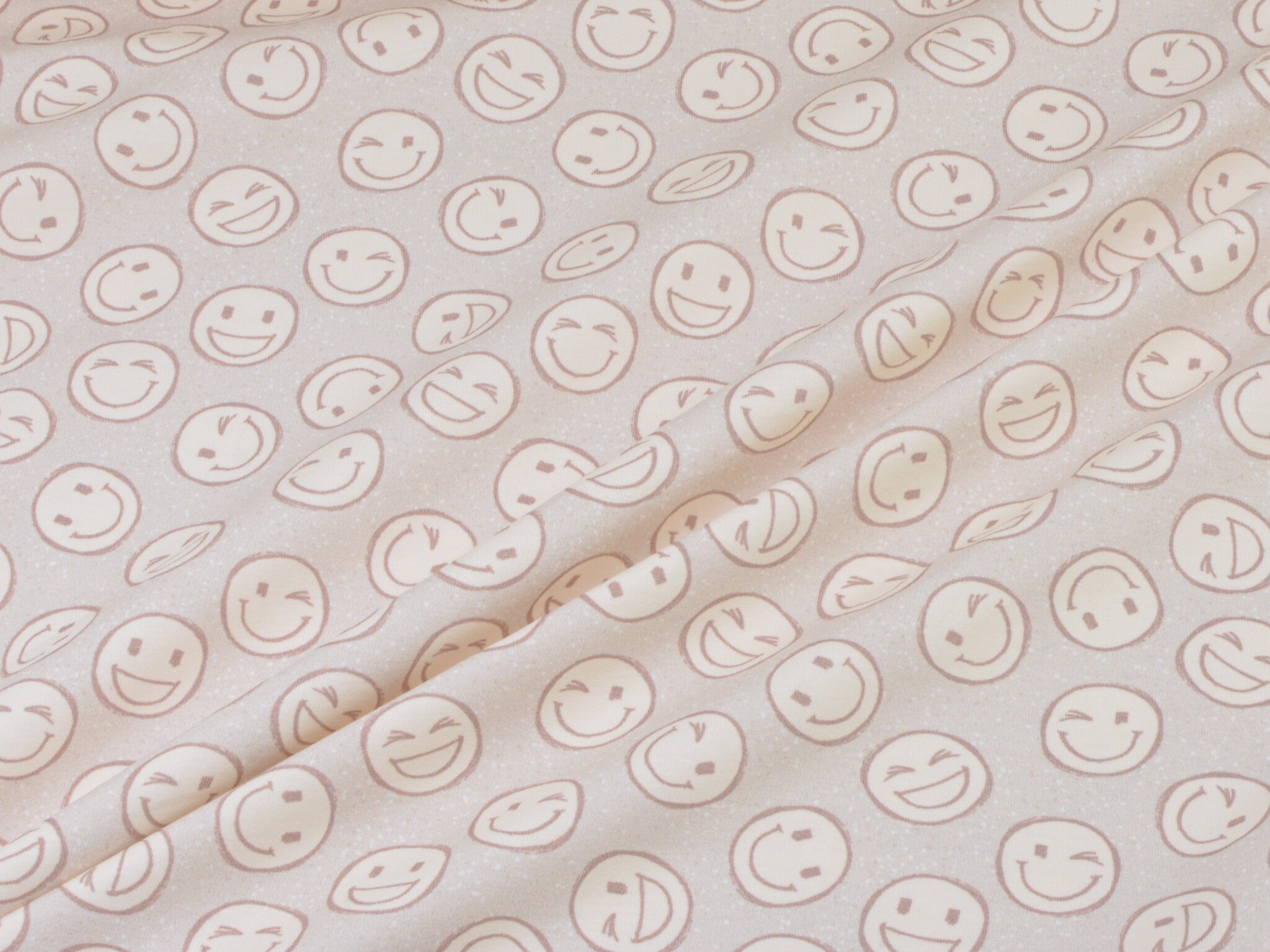 Hochwertiger Baumwolljersey von Hilco. Der Jersey ist beige mit Smilies. Er ist glatt und dünn. Nähe daraus T-Shirts, Langarmshirts, Body, Pumphosen und vieles mehr.