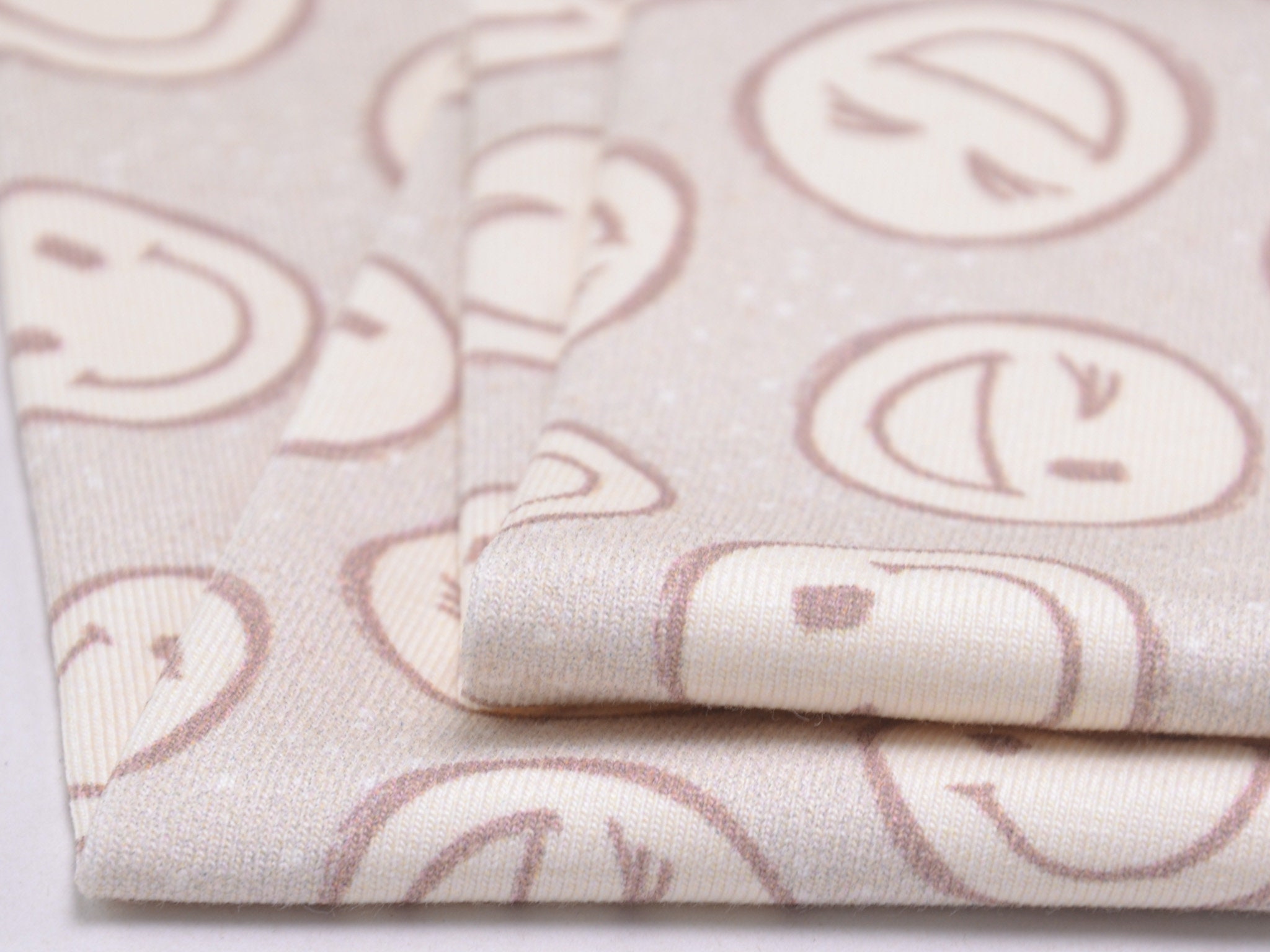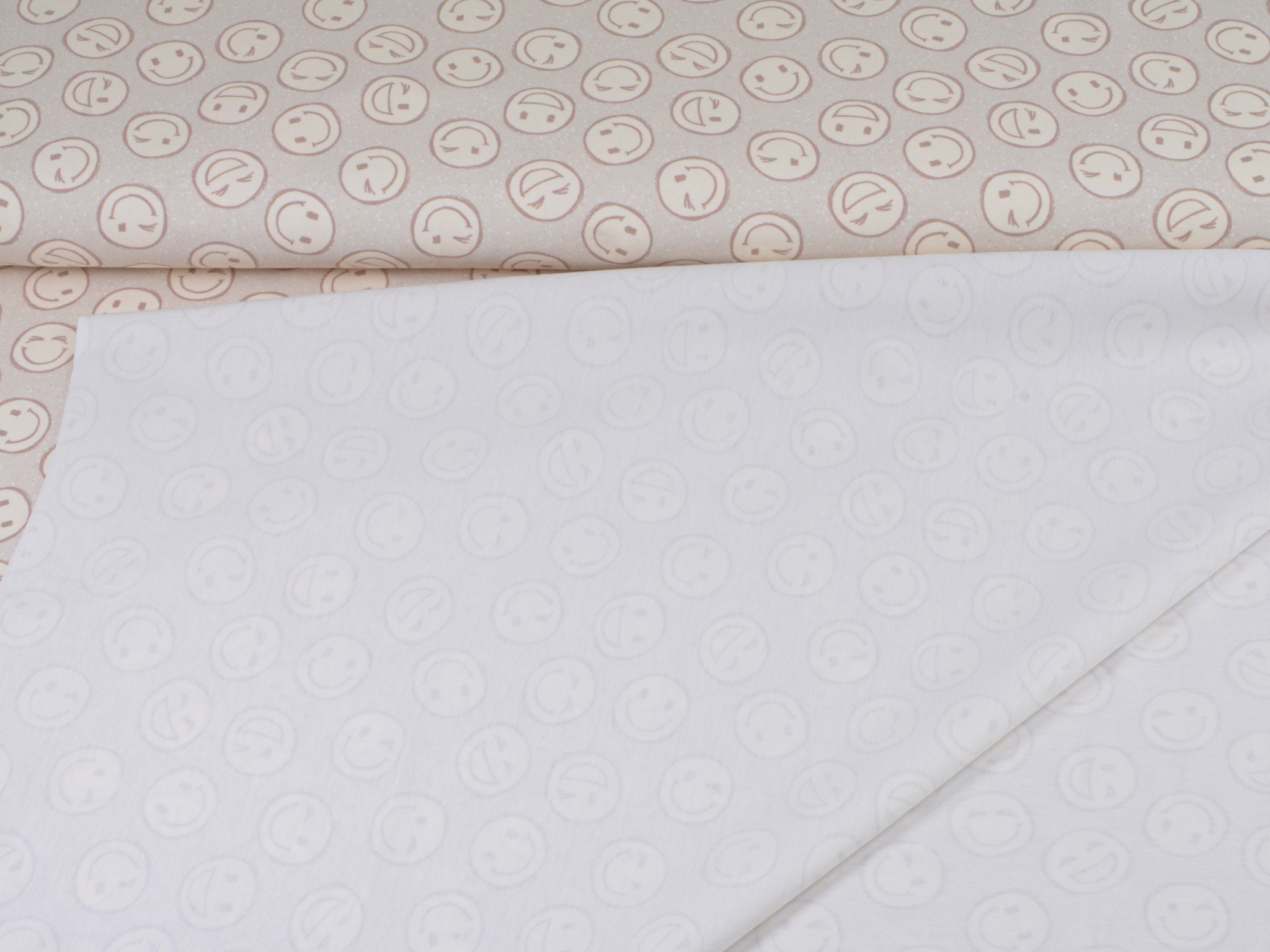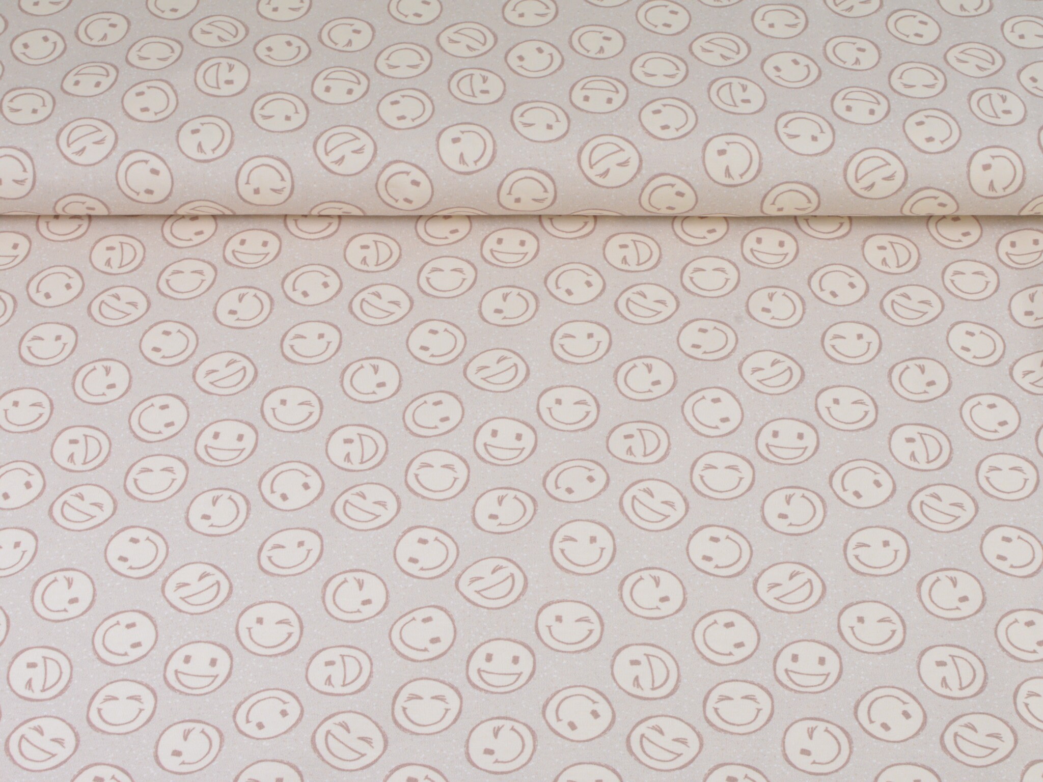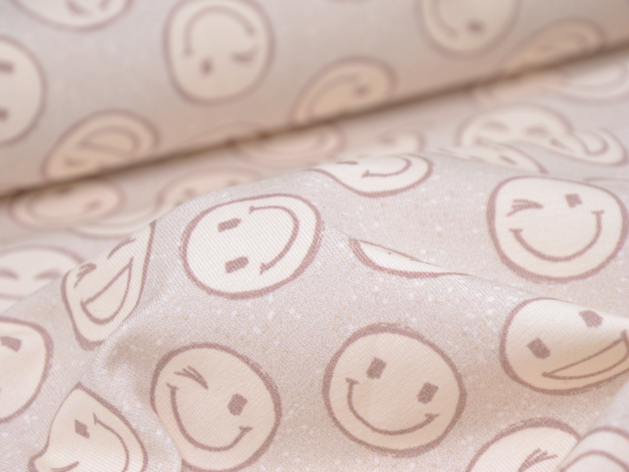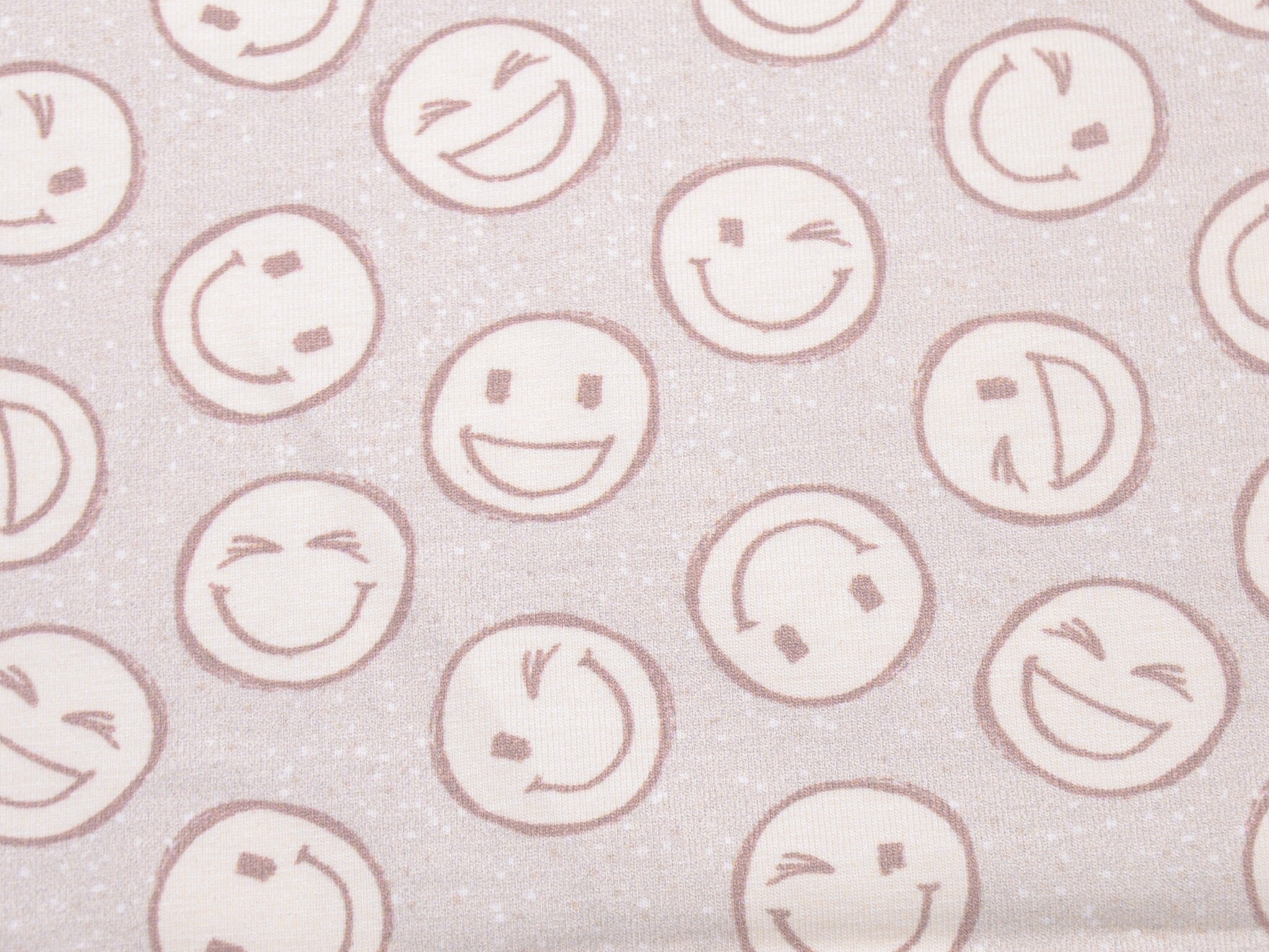 Hochwertiger Baumwolljersey von Hilco. Der Jersey ist beige mit Smilies. Er ist glatt und dünn. Nähe daraus T-Shirts, Langarmshirts, Body, Pumphosen und vieles mehr.