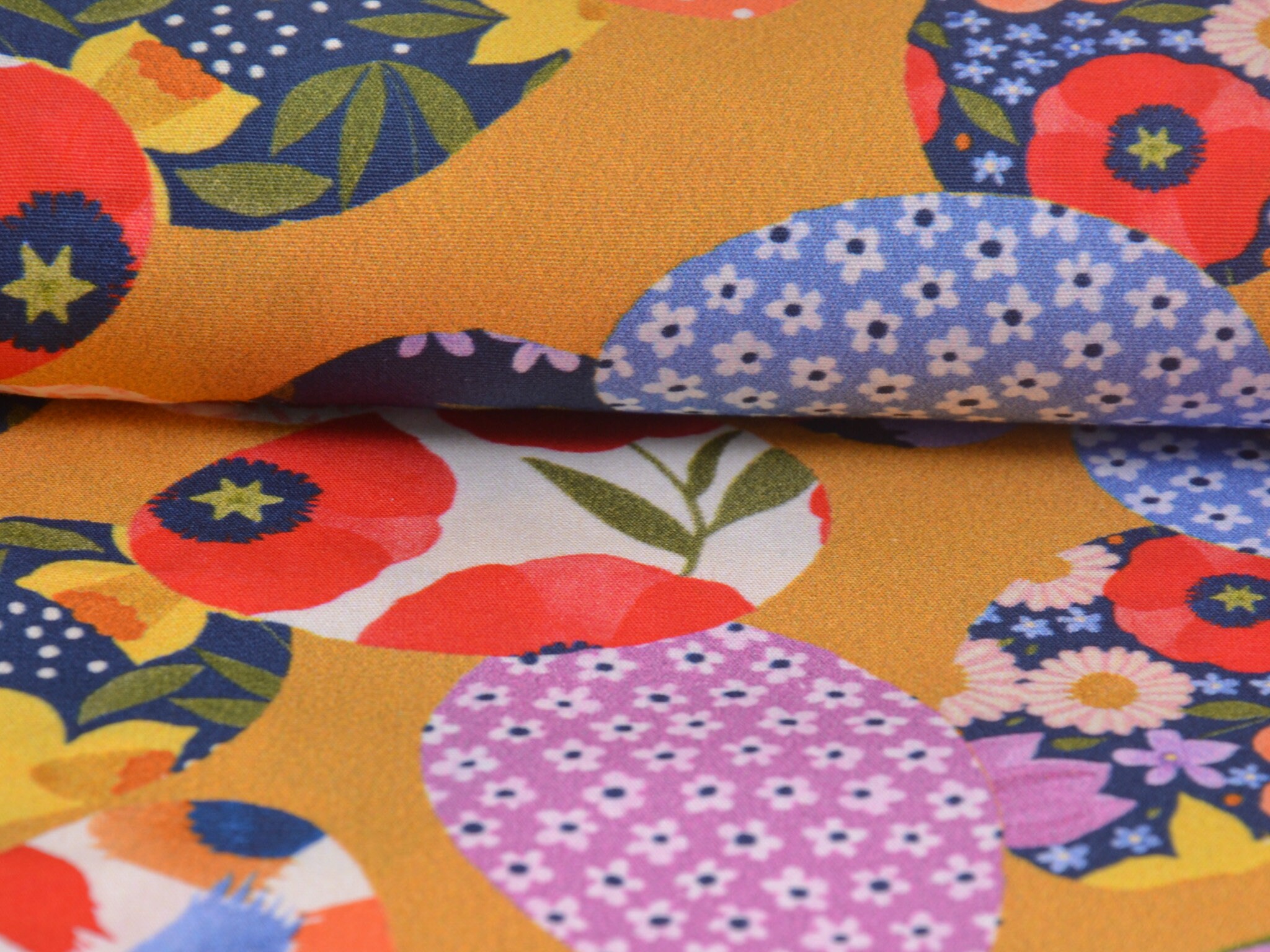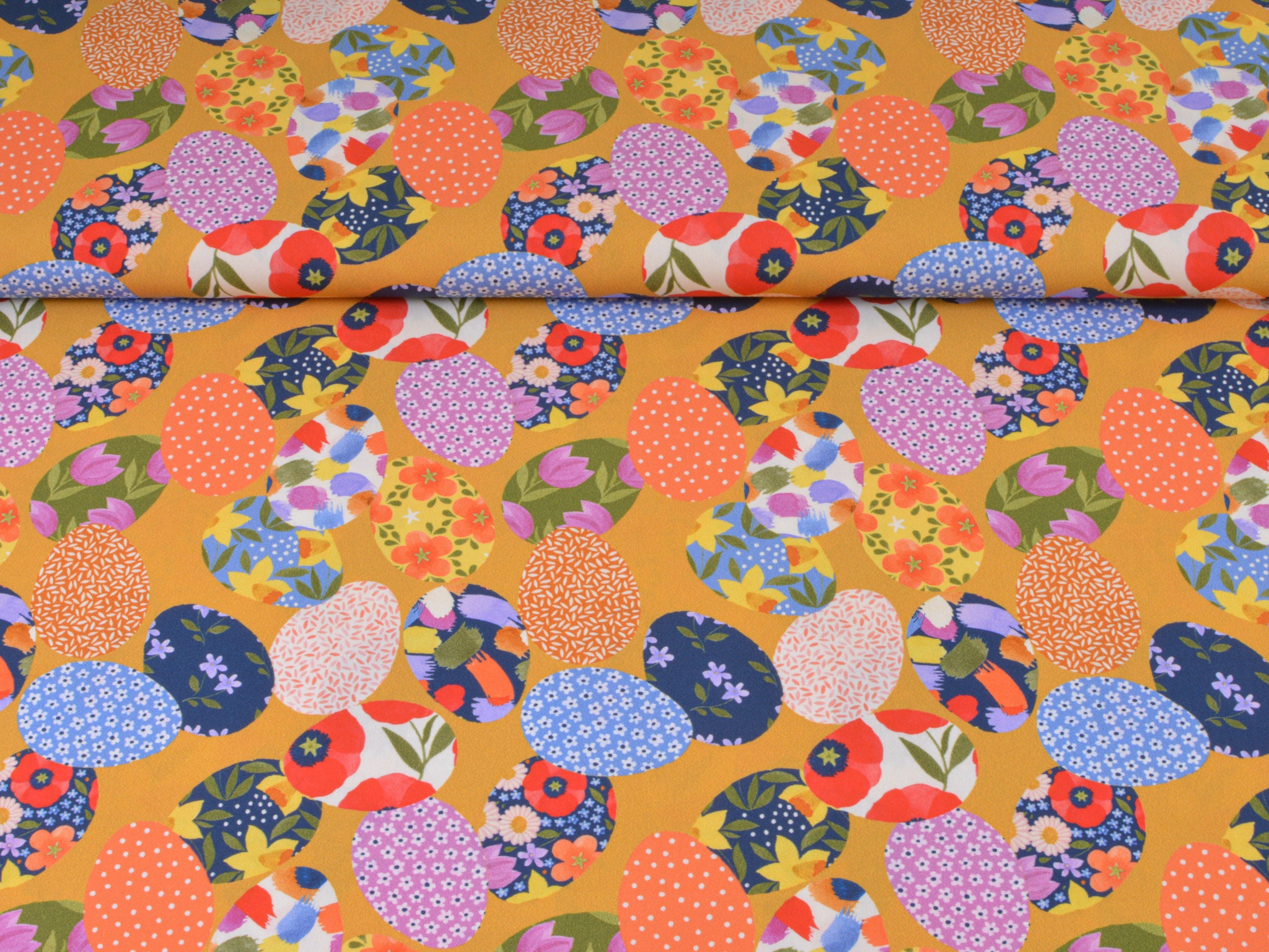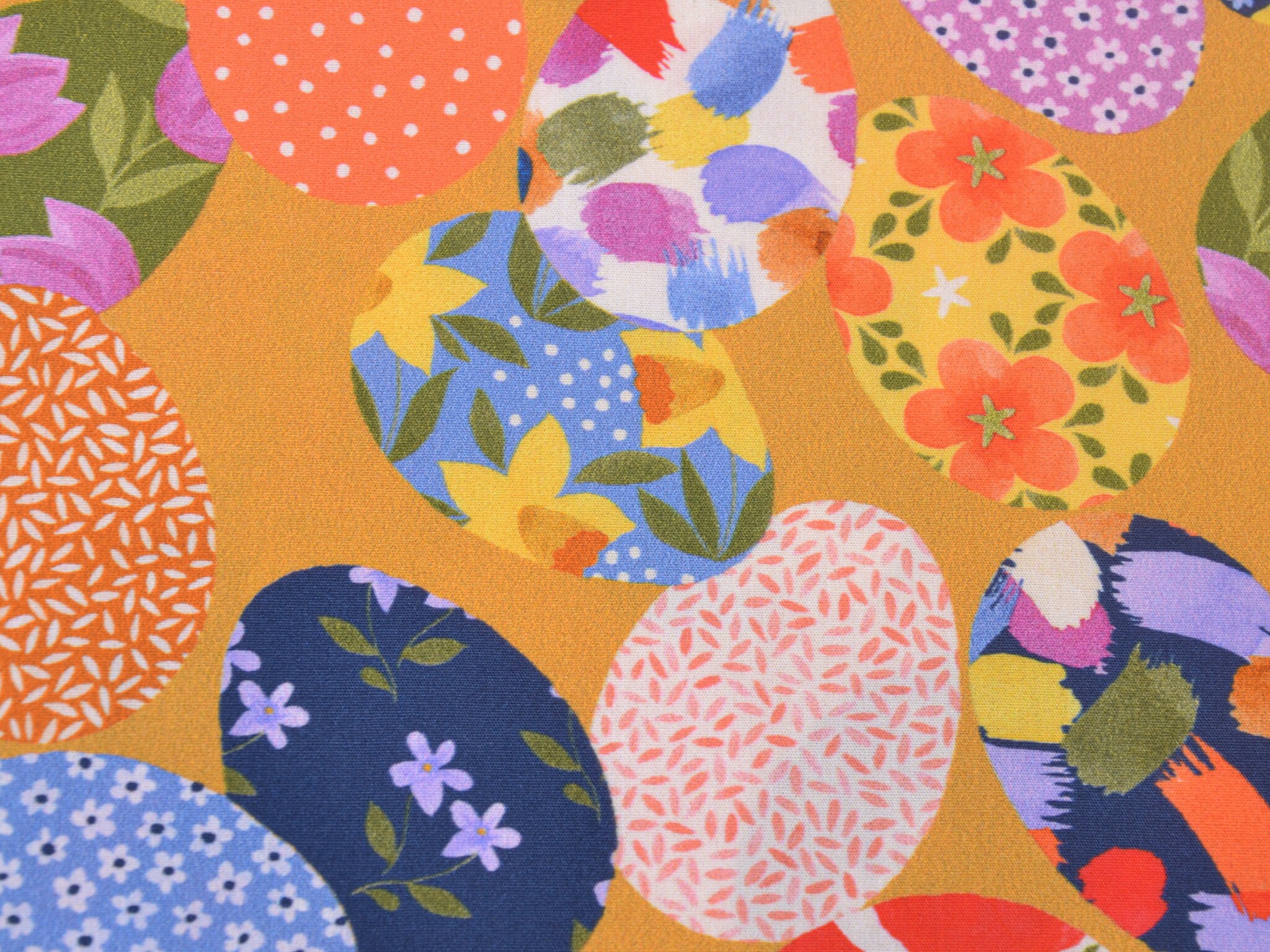 Baumwollstoff aus der Serie Emilie von Hilco. Die glatte, dünne Baumwolle aus der Emilie-Oster-Collection ist gelb mit bunten Ostereiern. Alle Stoff der Emilie-Collection lassen sich wunderbar miteinander kombinieren. Nähe daraus Deko für Ostern, nutze den Stoff zum Patchworken, nähe Kissen, Utensilos und so vieles mehr.