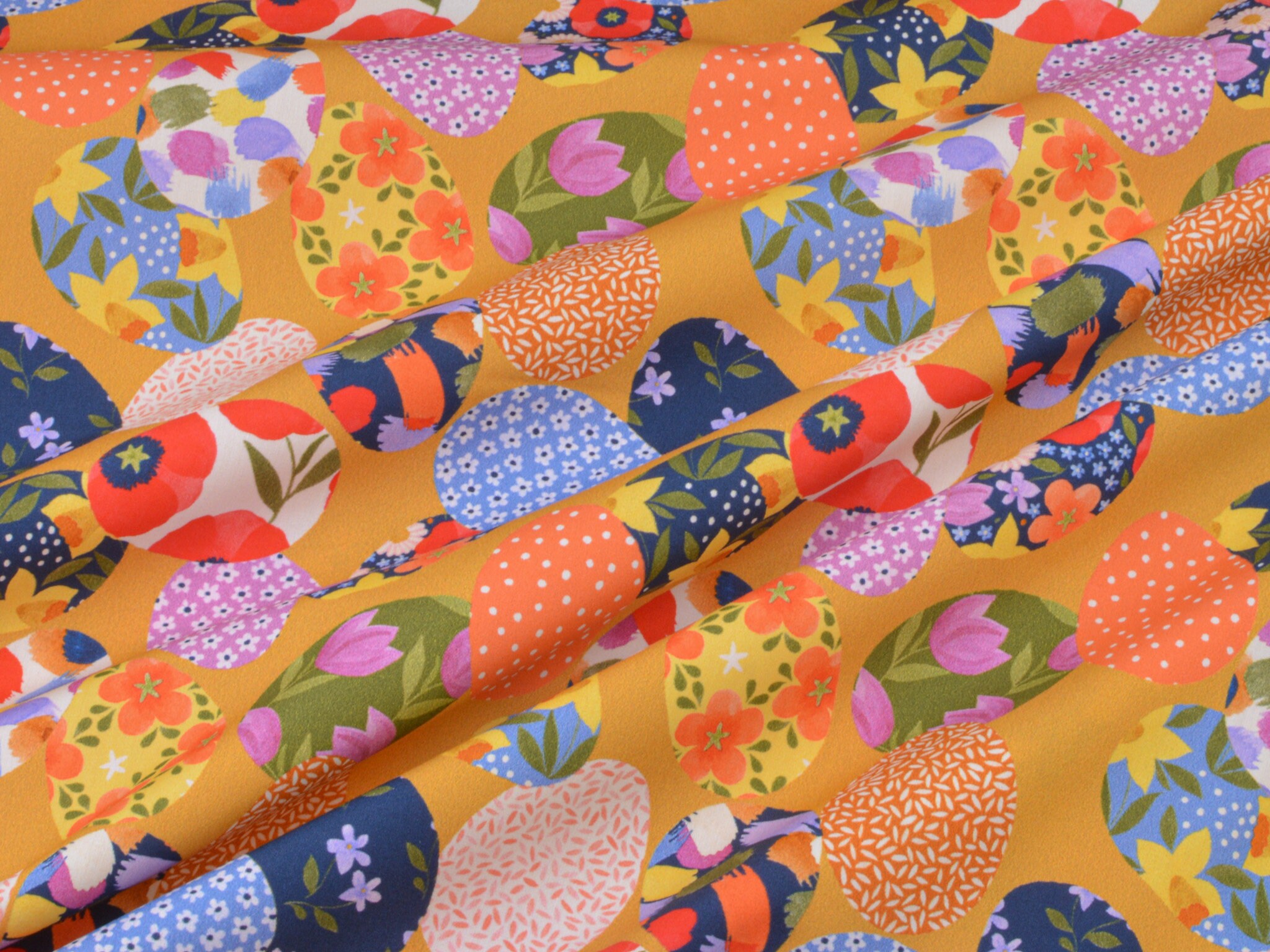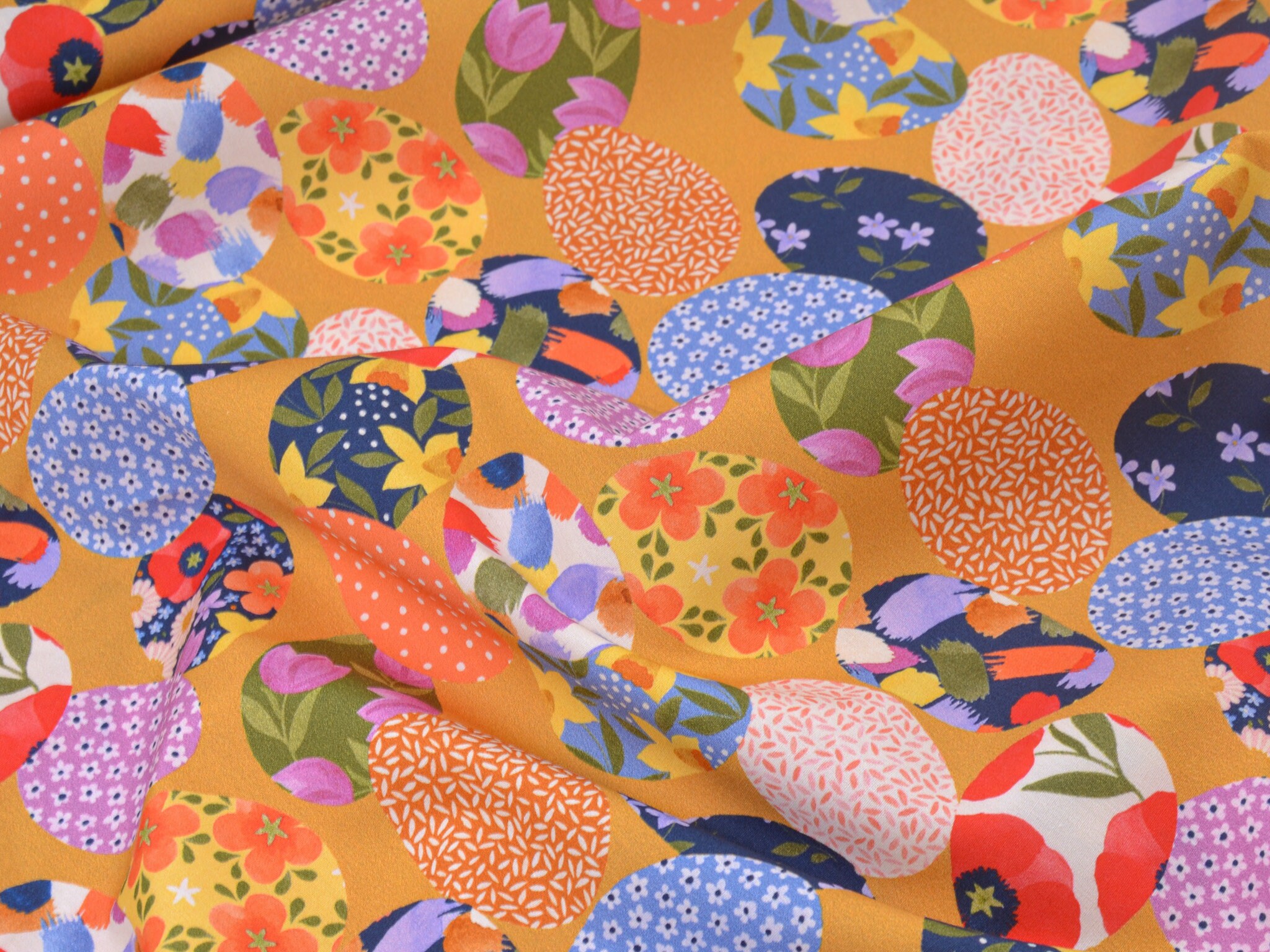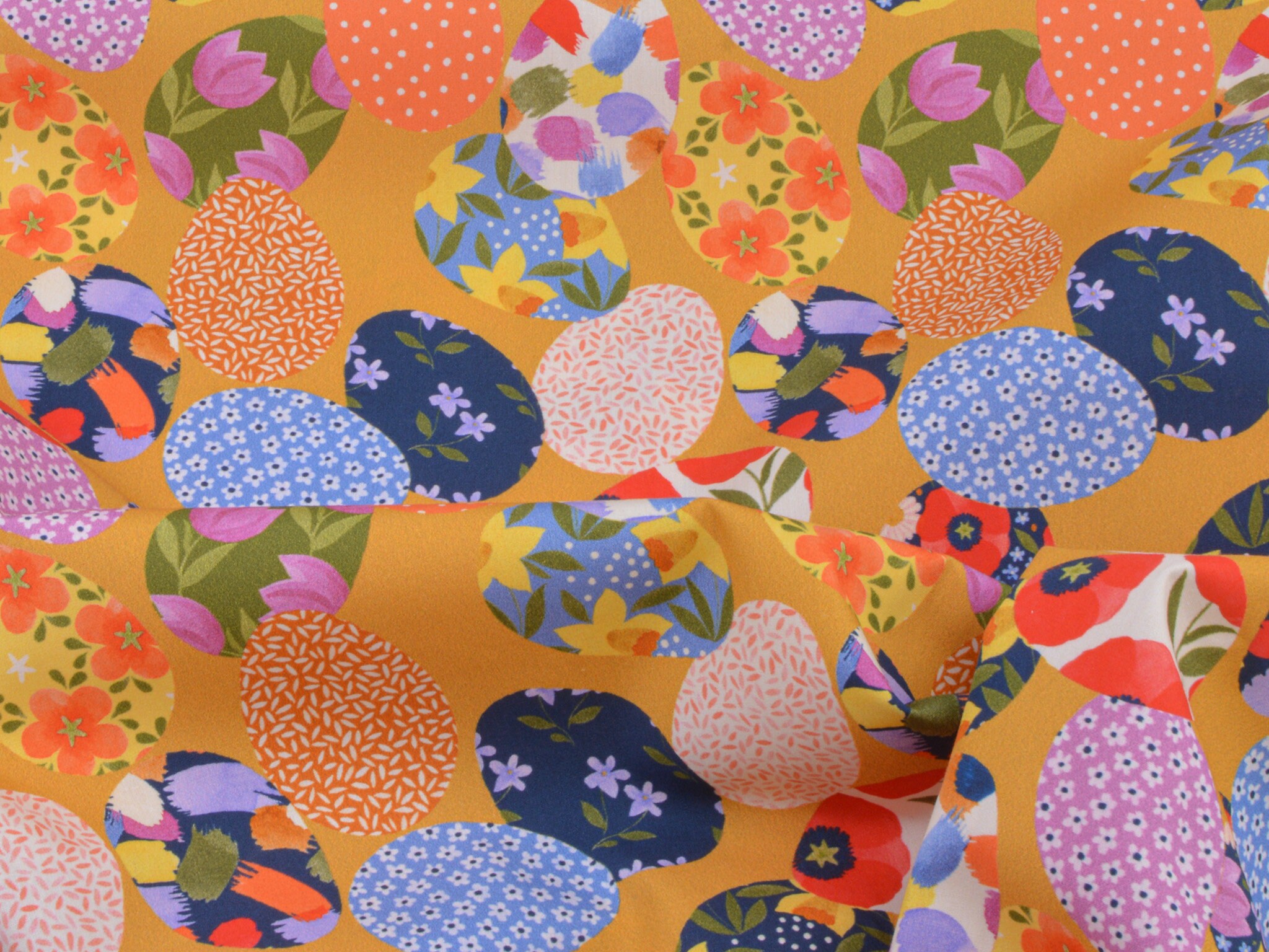 Baumwollstoff aus der Serie Emilie von Hilco. Die glatte, dünne Baumwolle aus der Emilie-Oster-Collection ist gelb mit bunten Ostereiern. Alle Stoff der Emilie-Collection lassen sich wunderbar miteinander kombinieren. Nähe daraus Deko für Ostern, nutze den Stoff zum Patchworken, nähe Kissen, Utensilos und so vieles mehr.