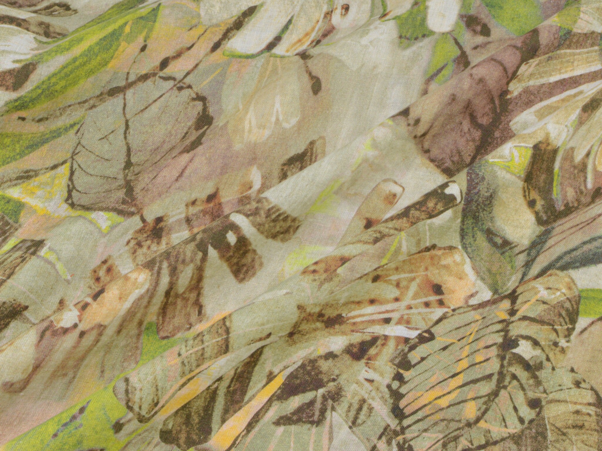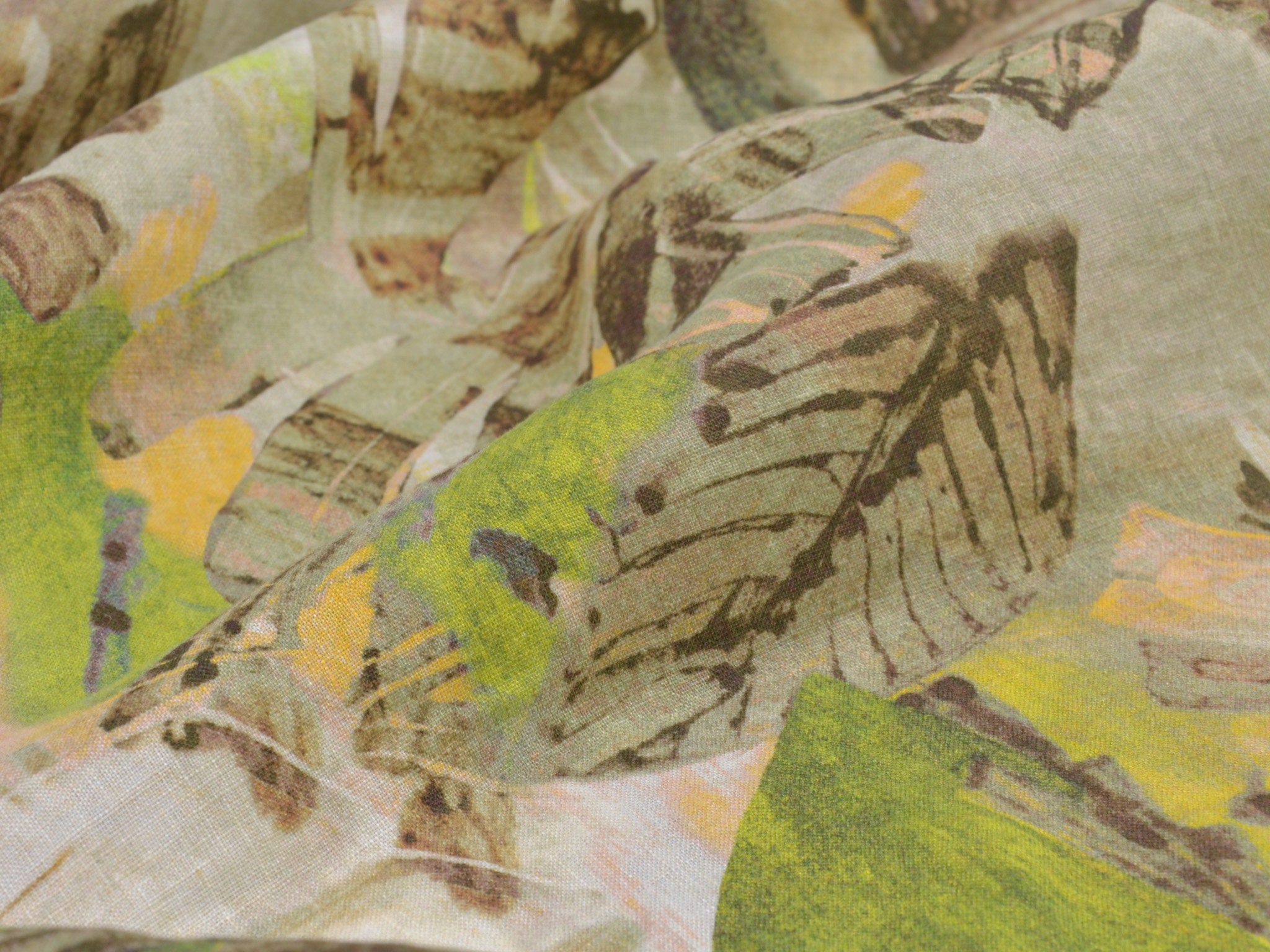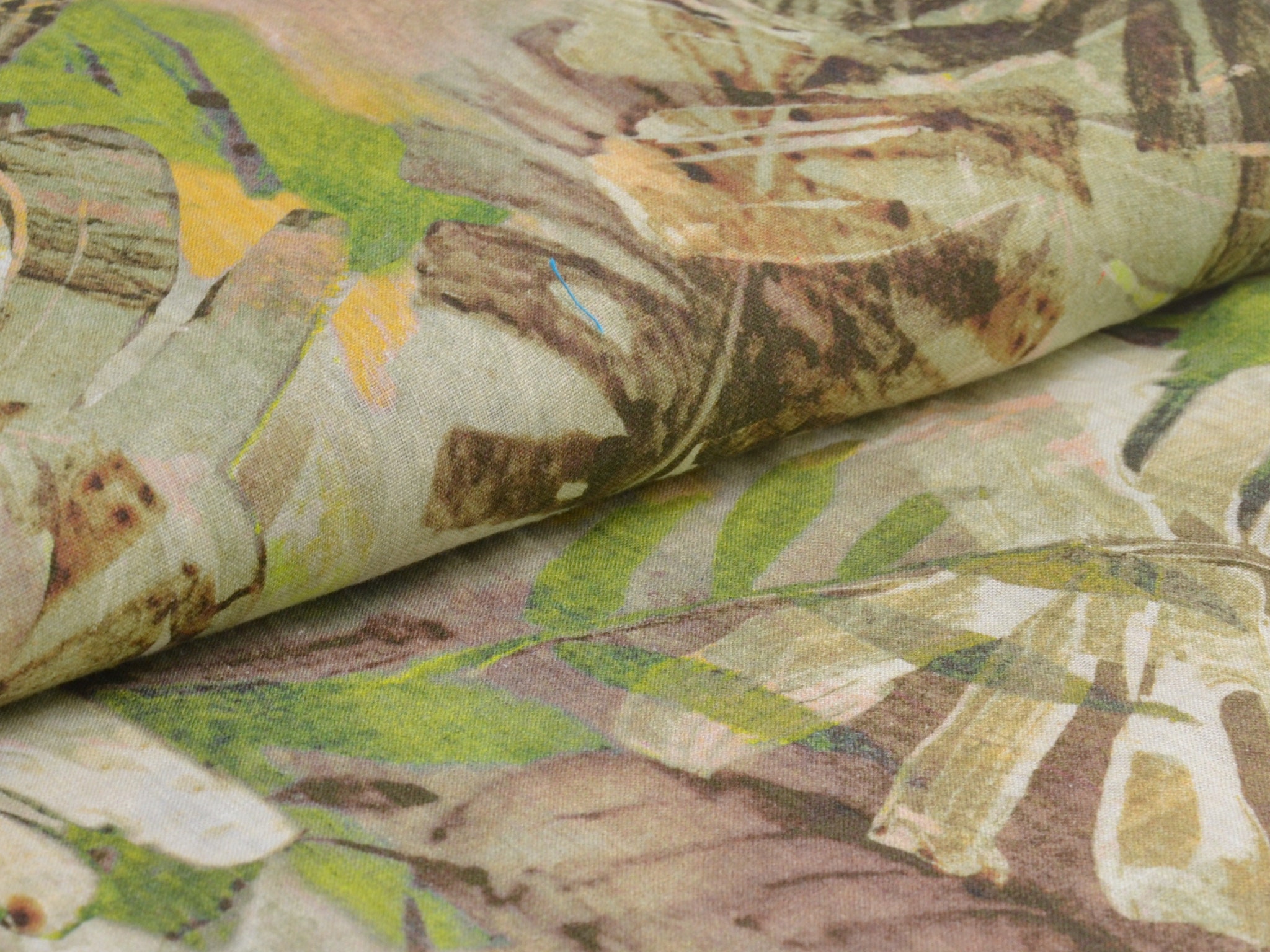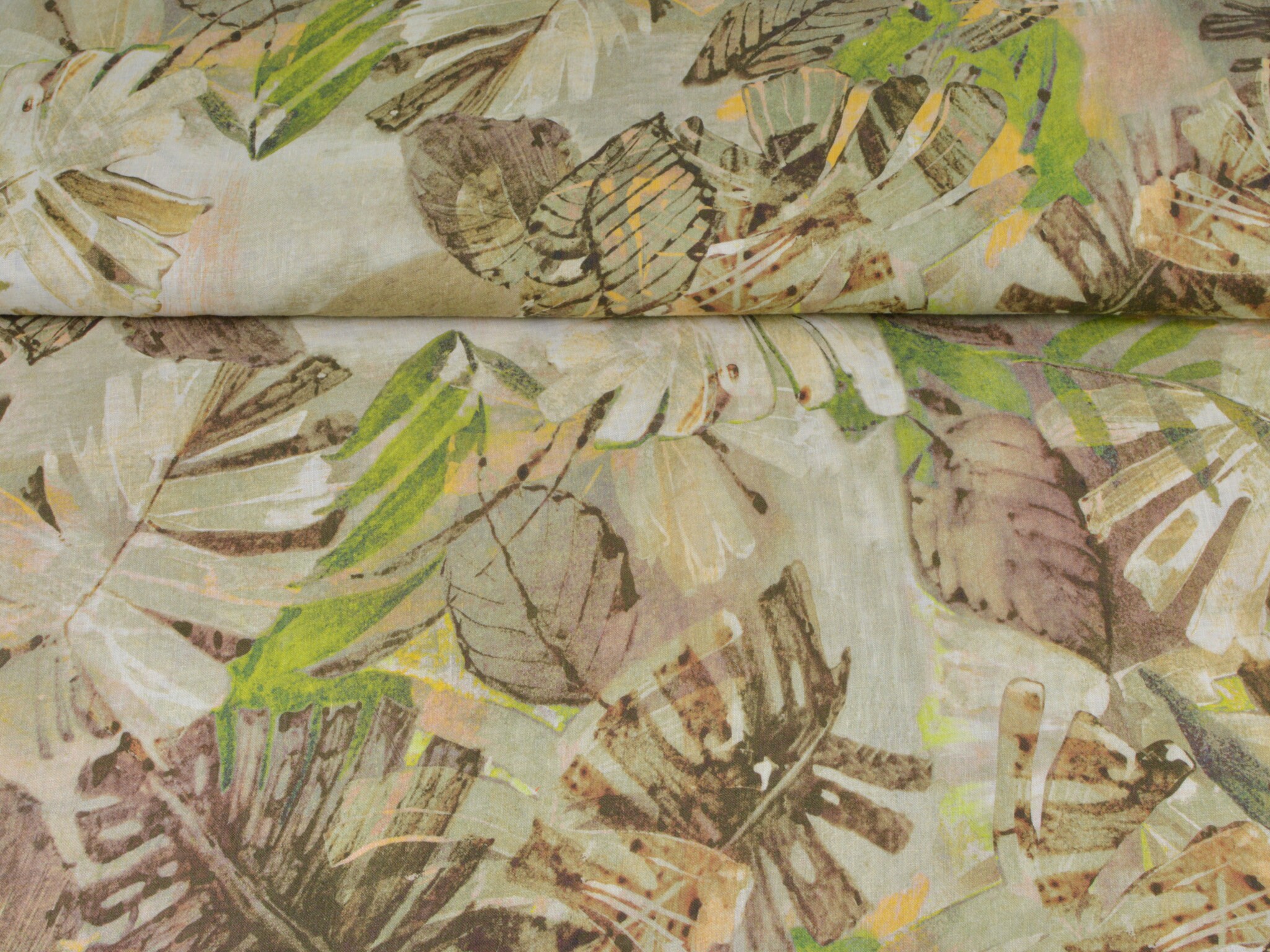 Hochwertiger Webstoff aus 100% Leinen von Hilco. Der Stoff ist grün, braun gemustert mit großen Blättern. Er ist leicht und fühlt sich weich an. Nähe dir daraus Blusen, Kleider, Röcke, Sommerhosen und vieles mehr.