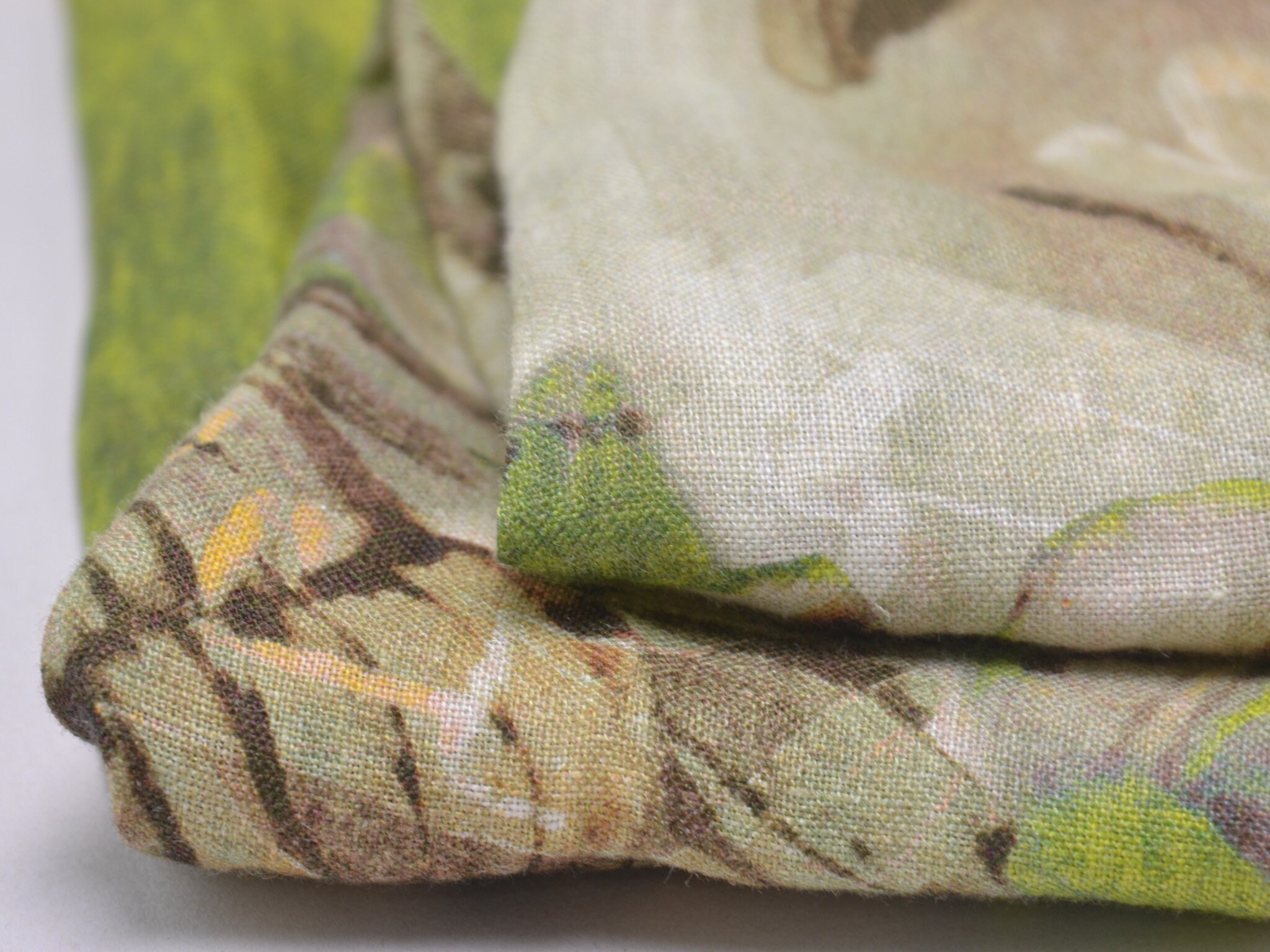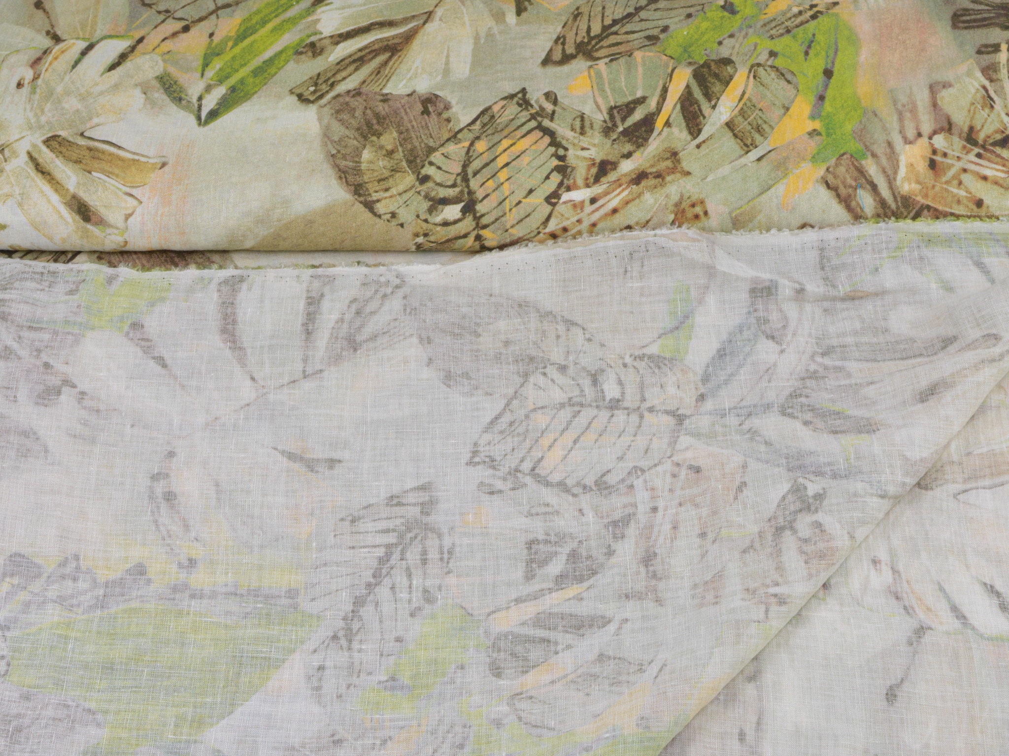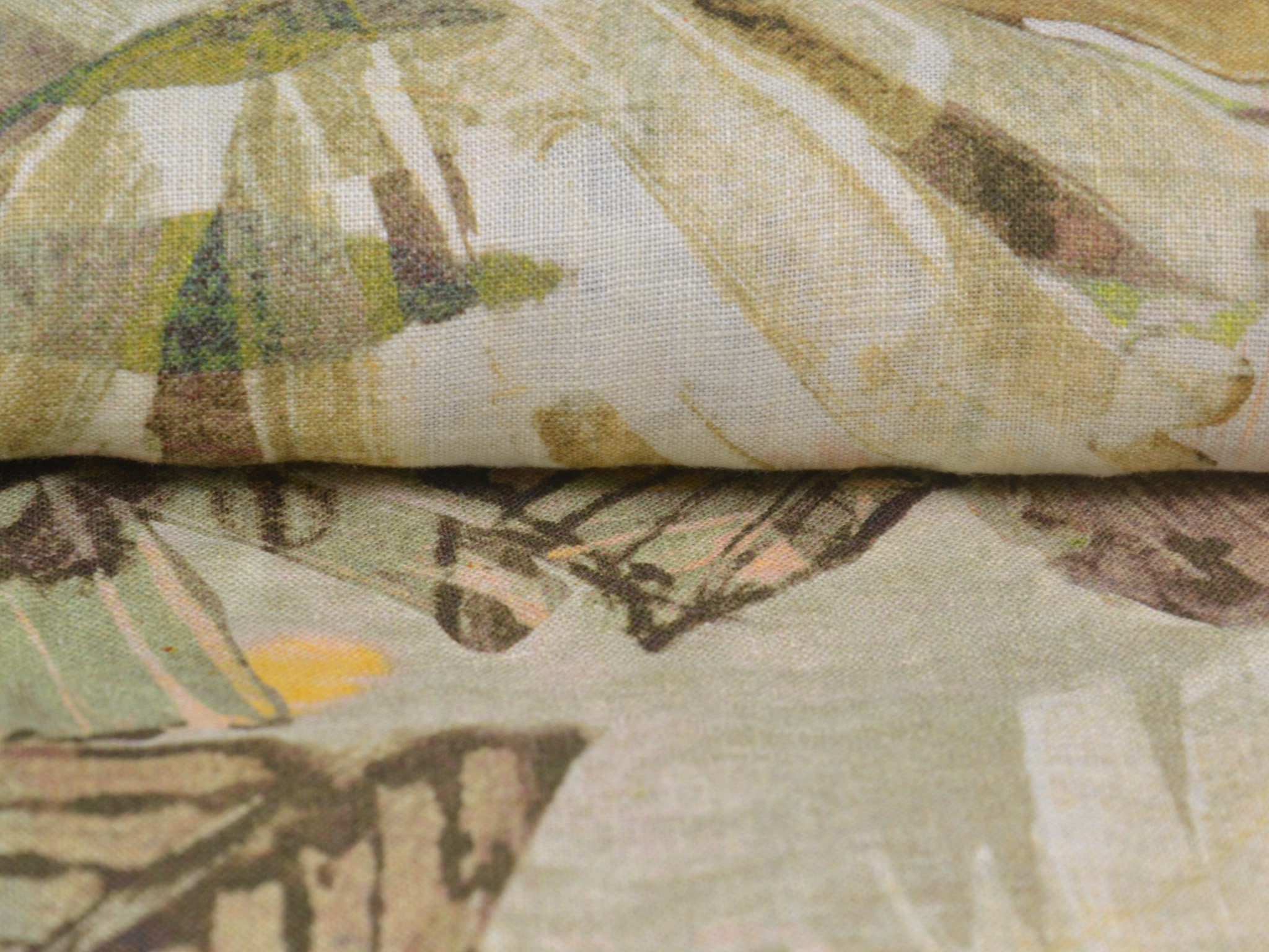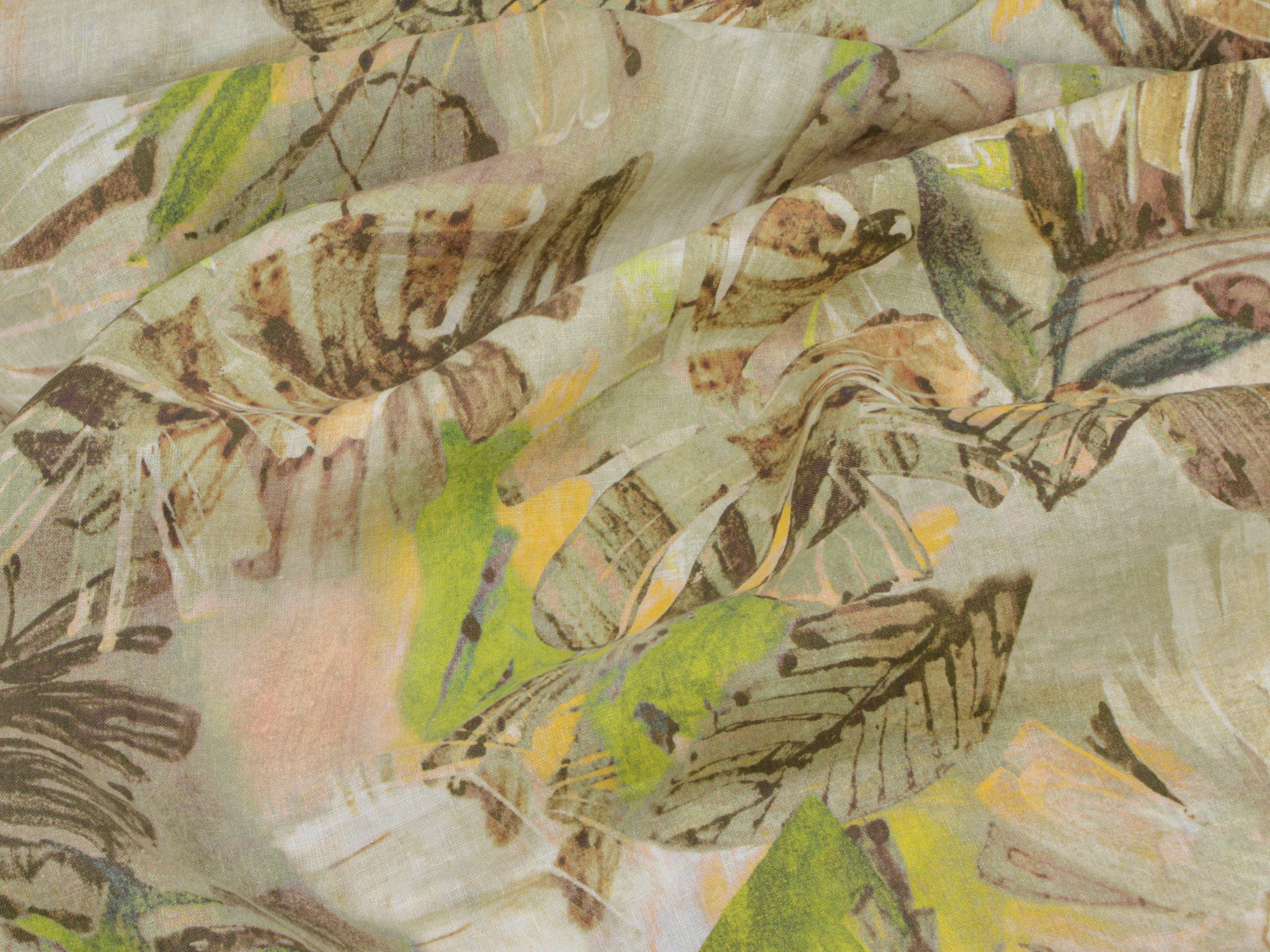 Hochwertiger Webstoff aus 100% Leinen von Hilco. Der Stoff ist grün, braun gemustert mit großen Blättern. Er ist leicht und fühlt sich weich an. Nähe dir daraus Blusen, Kleider, Röcke, Sommerhosen und vieles mehr.