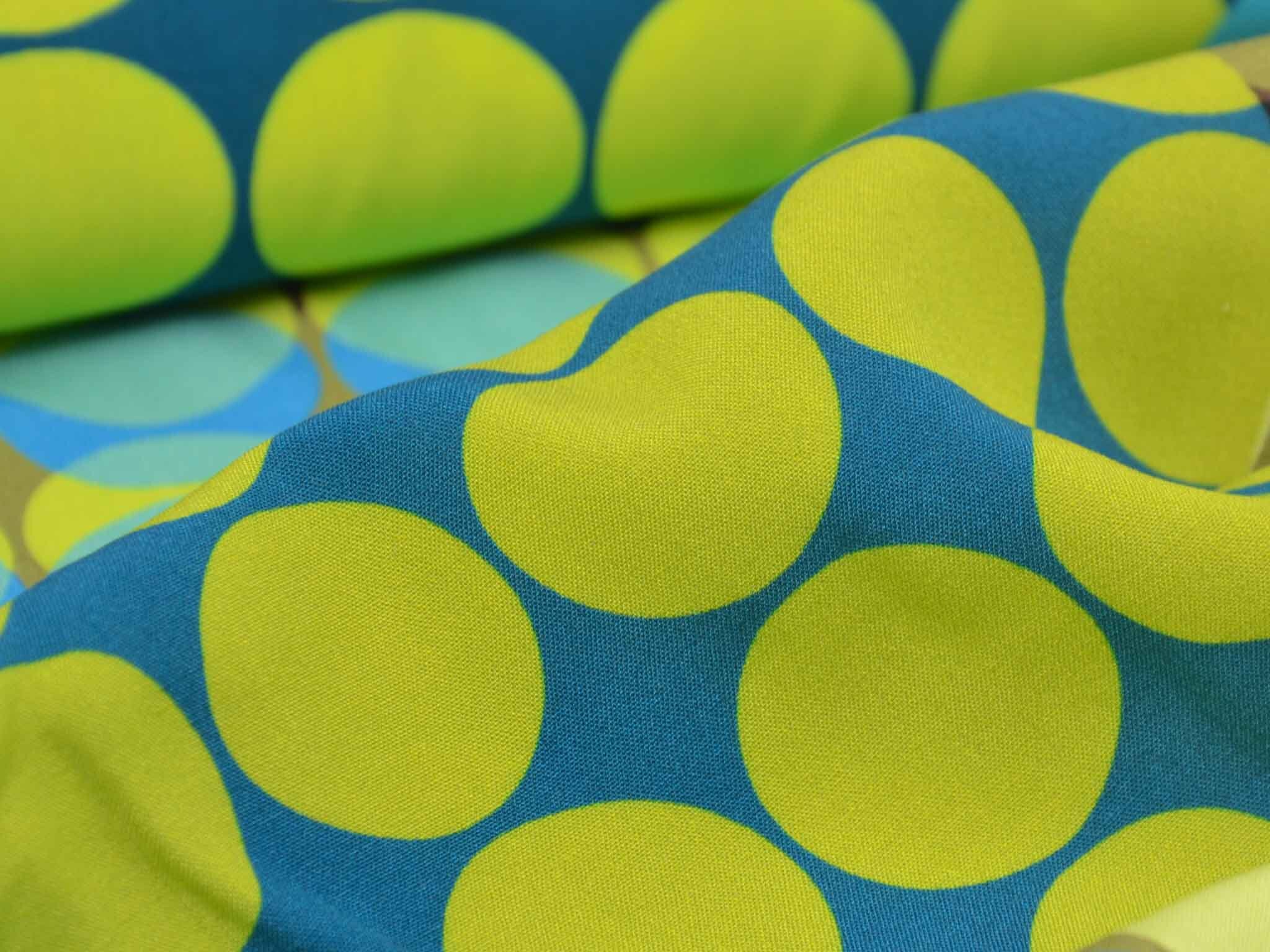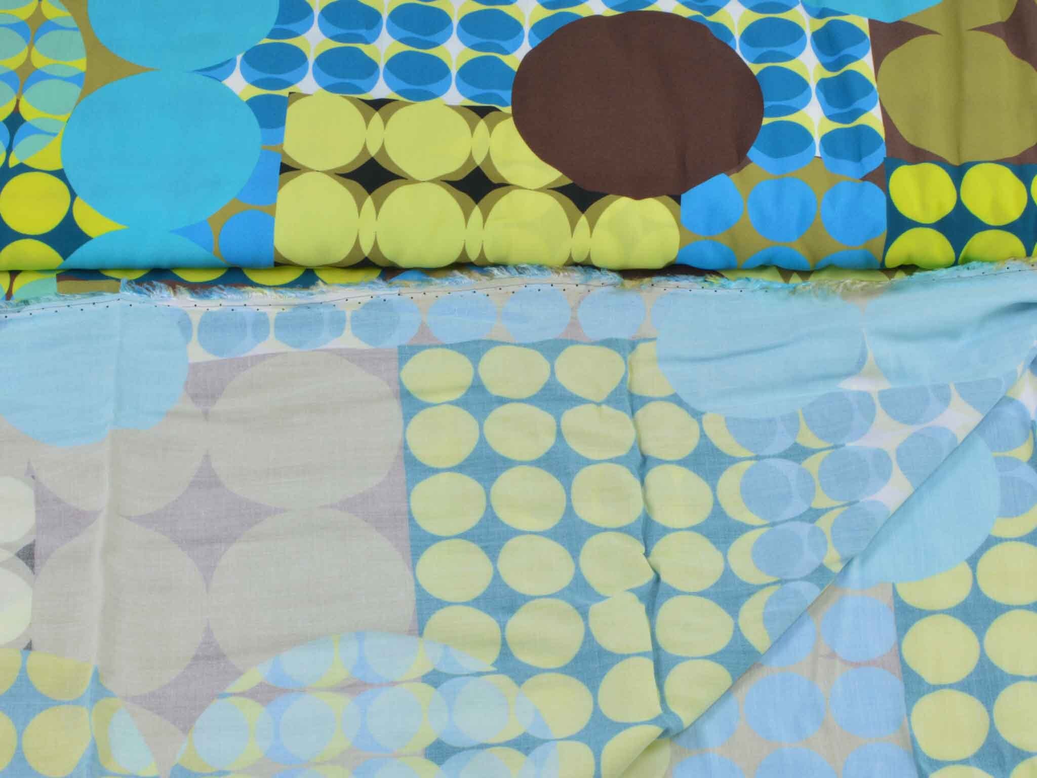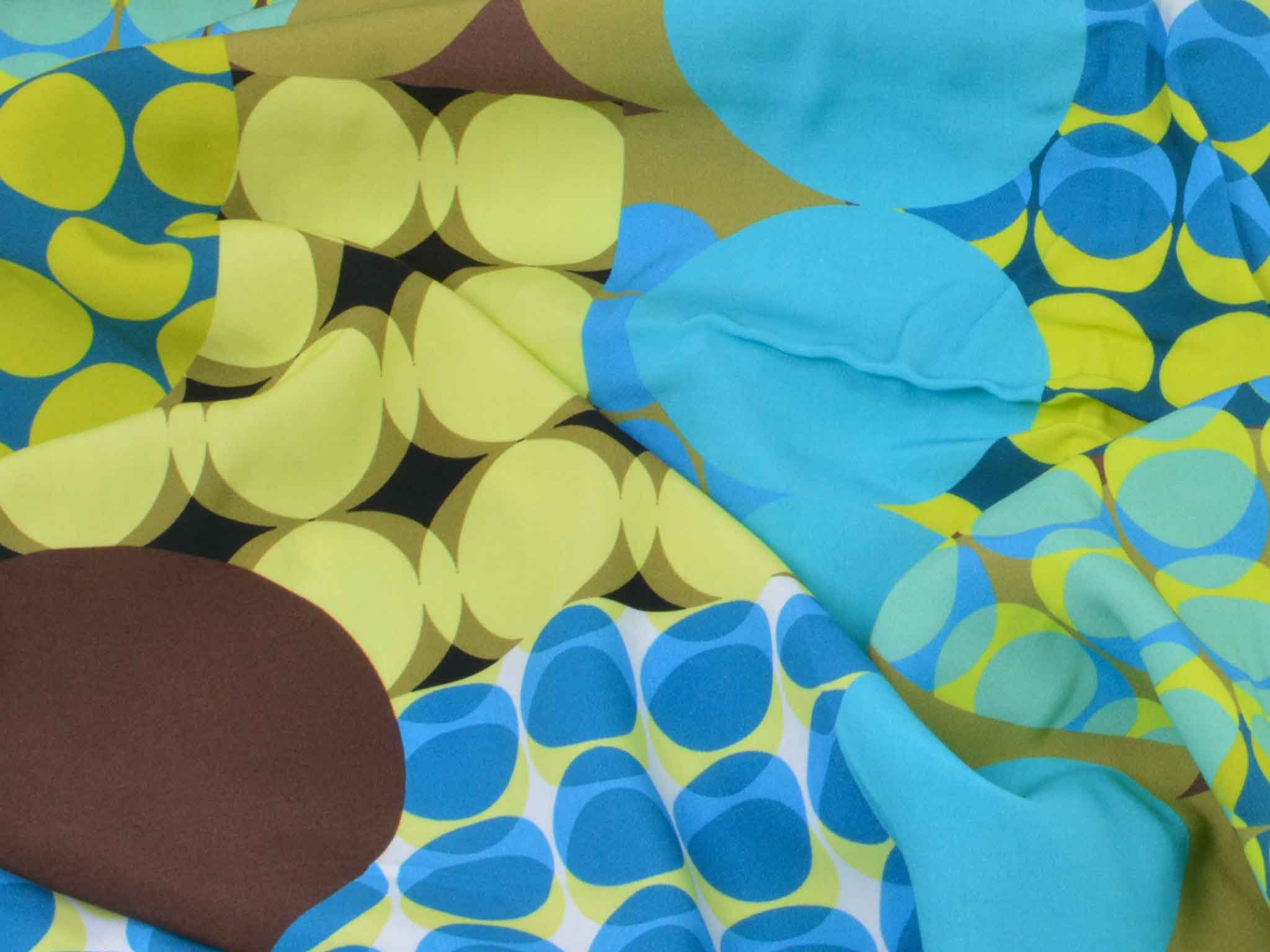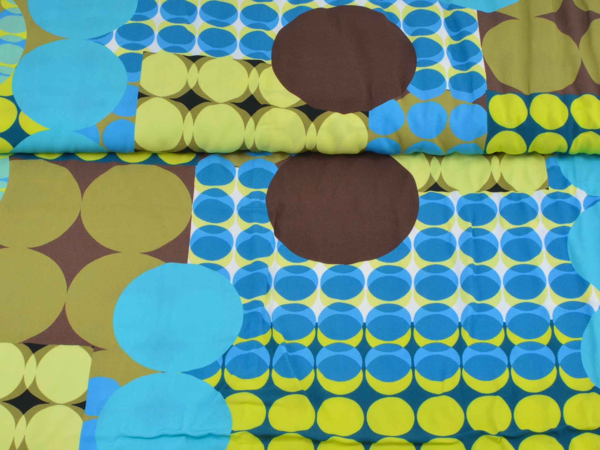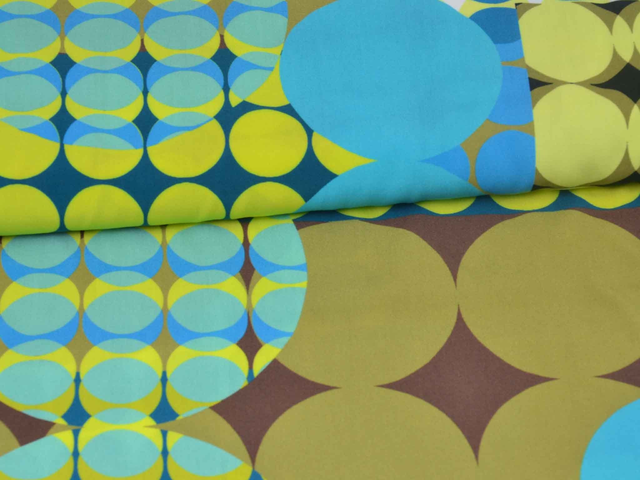 Hochwertige Webware aus dem Hause Hilco. Die Retro-Viskose mit verschiedenen Kreisen in blau, braun und grün eignet sich wunderbar zum Nähen von Blusen, Kleidern, fließenden Röcken und Hosen und vielem mehr. Der Stoff ist dünn und fällt fließend.