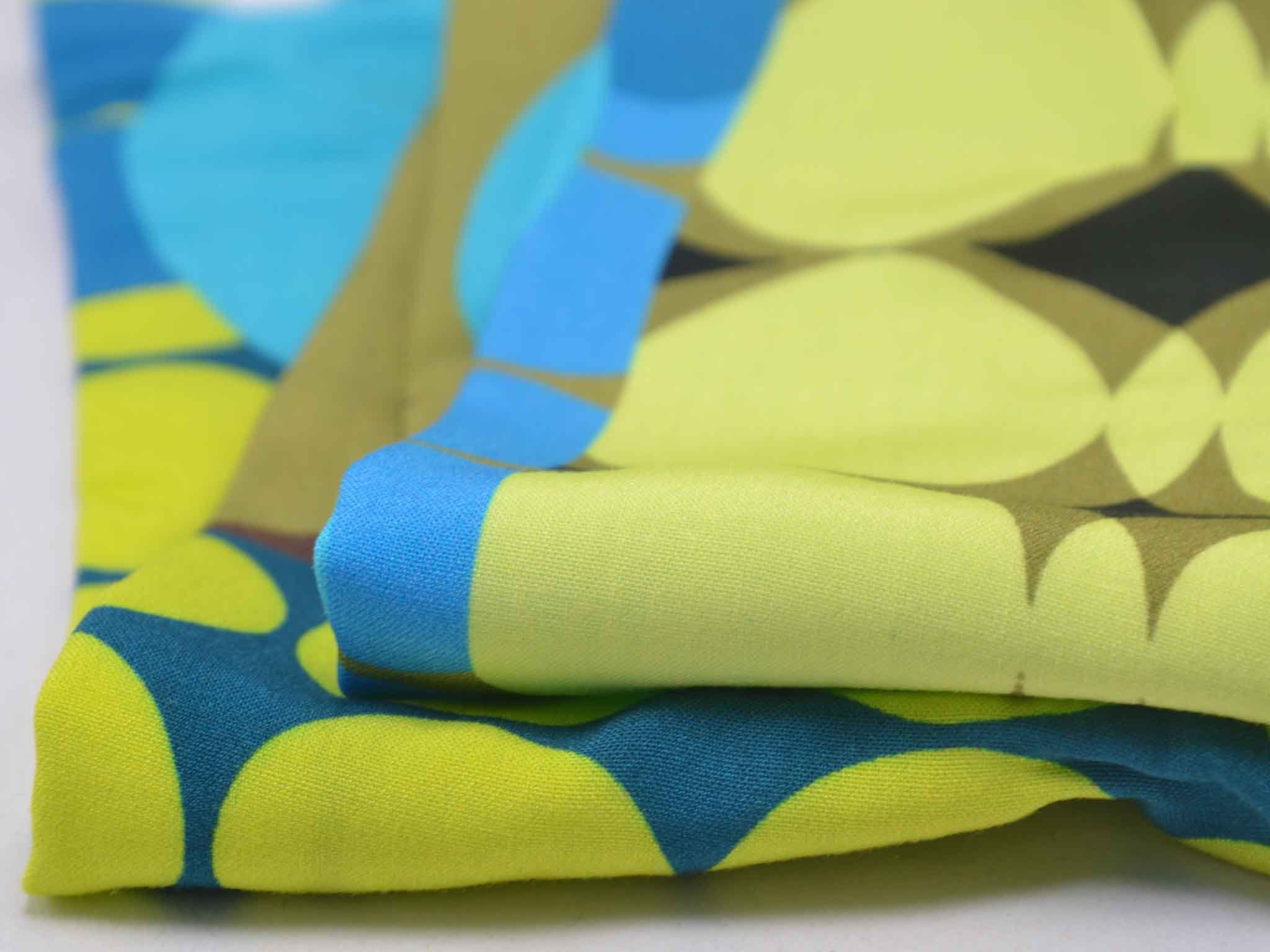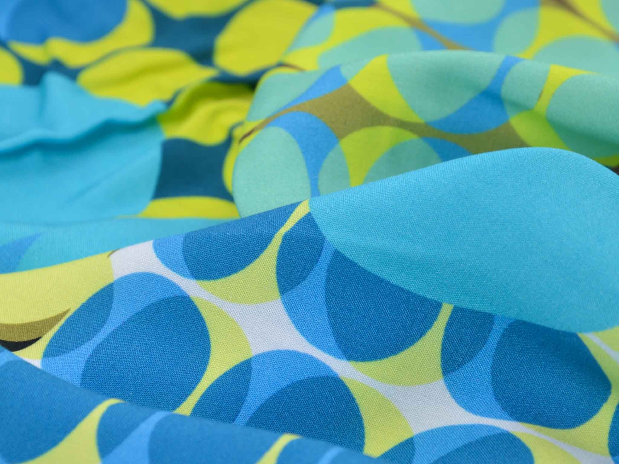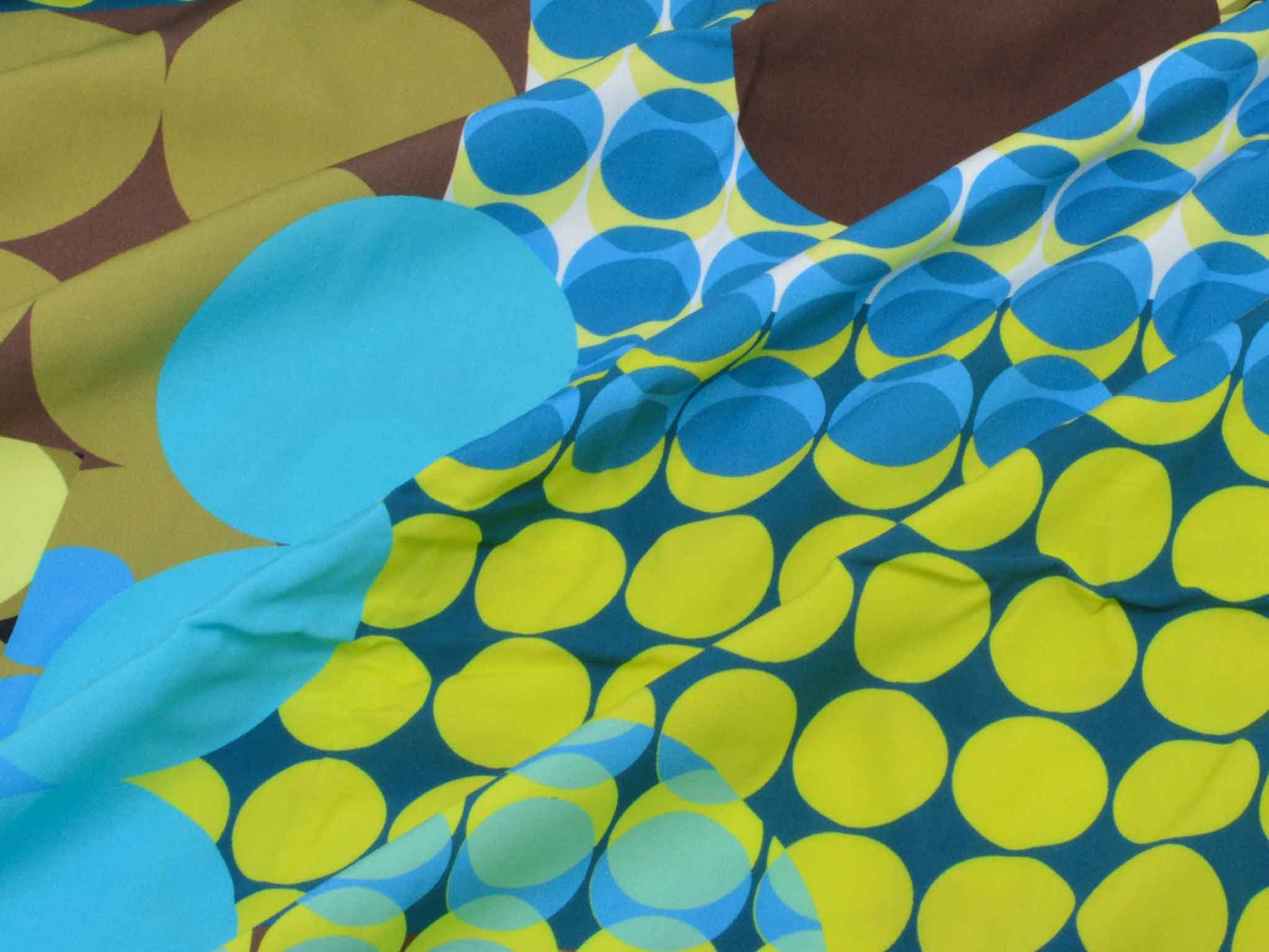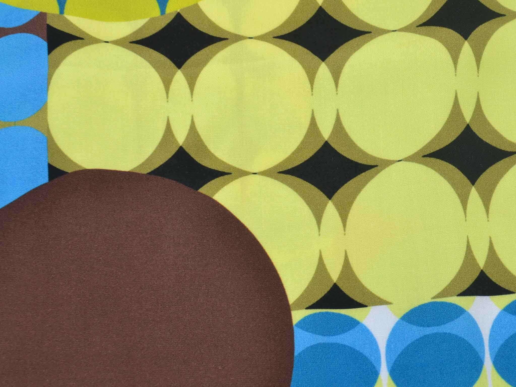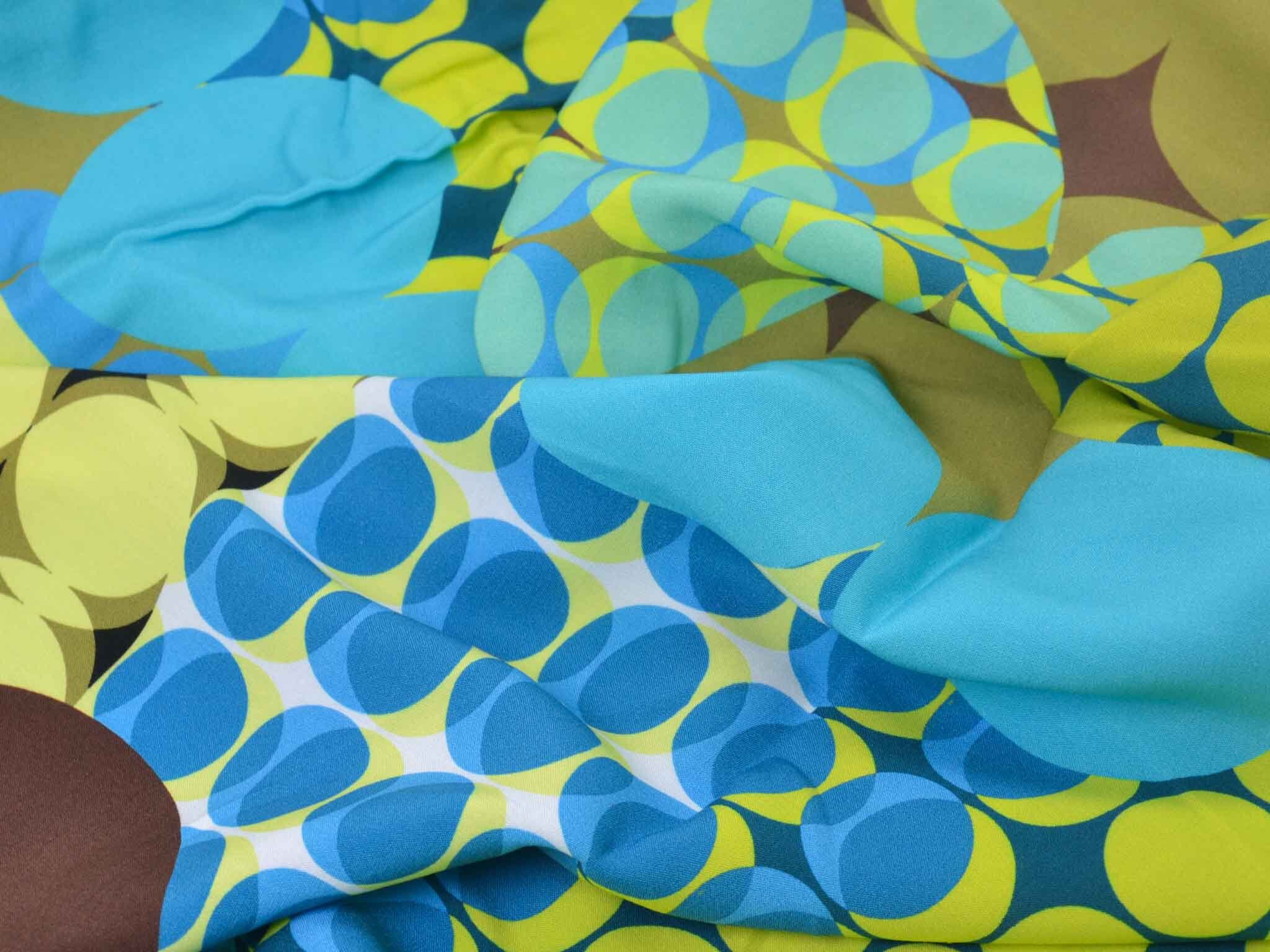 Hochwertige Webware aus dem Hause Hilco. Die Retro-Viskose mit verschiedenen Kreisen in blau, braun und grün eignet sich wunderbar zum Nähen von Blusen, Kleidern, fließenden Röcken und Hosen und vielem mehr. Der Stoff ist dünn und fällt fließend.