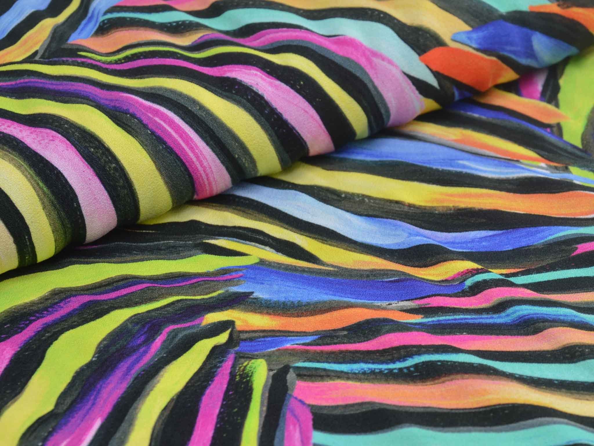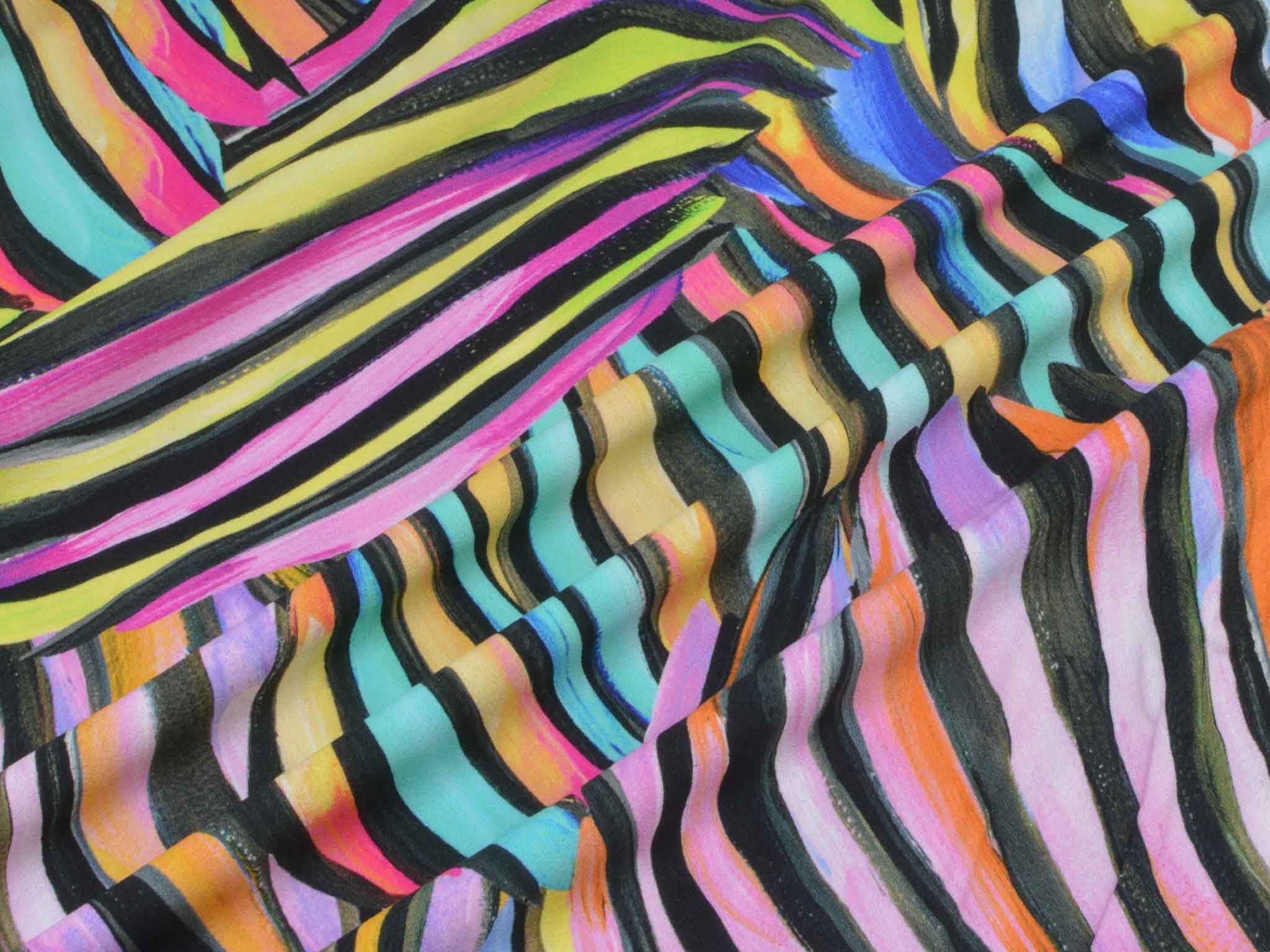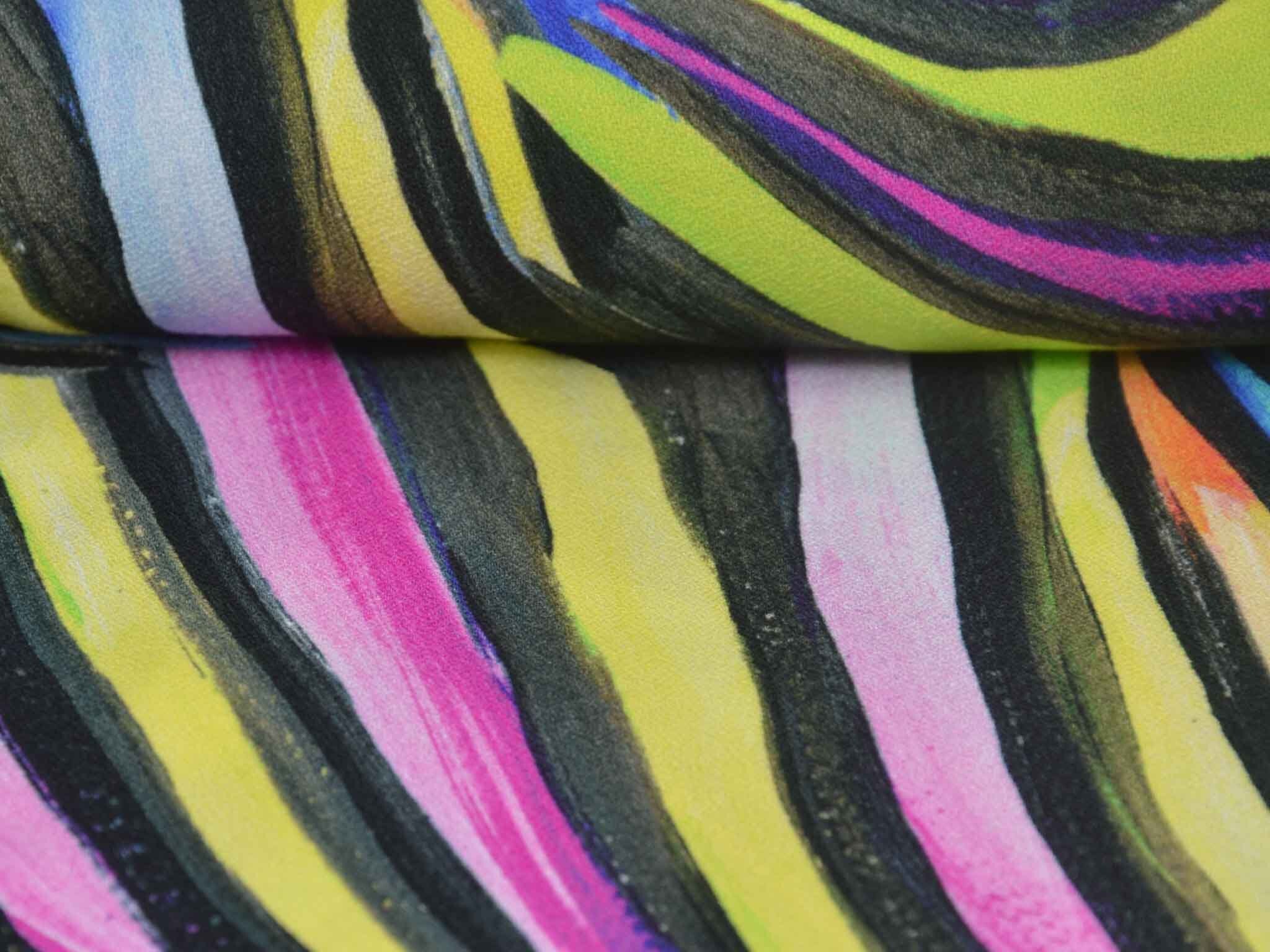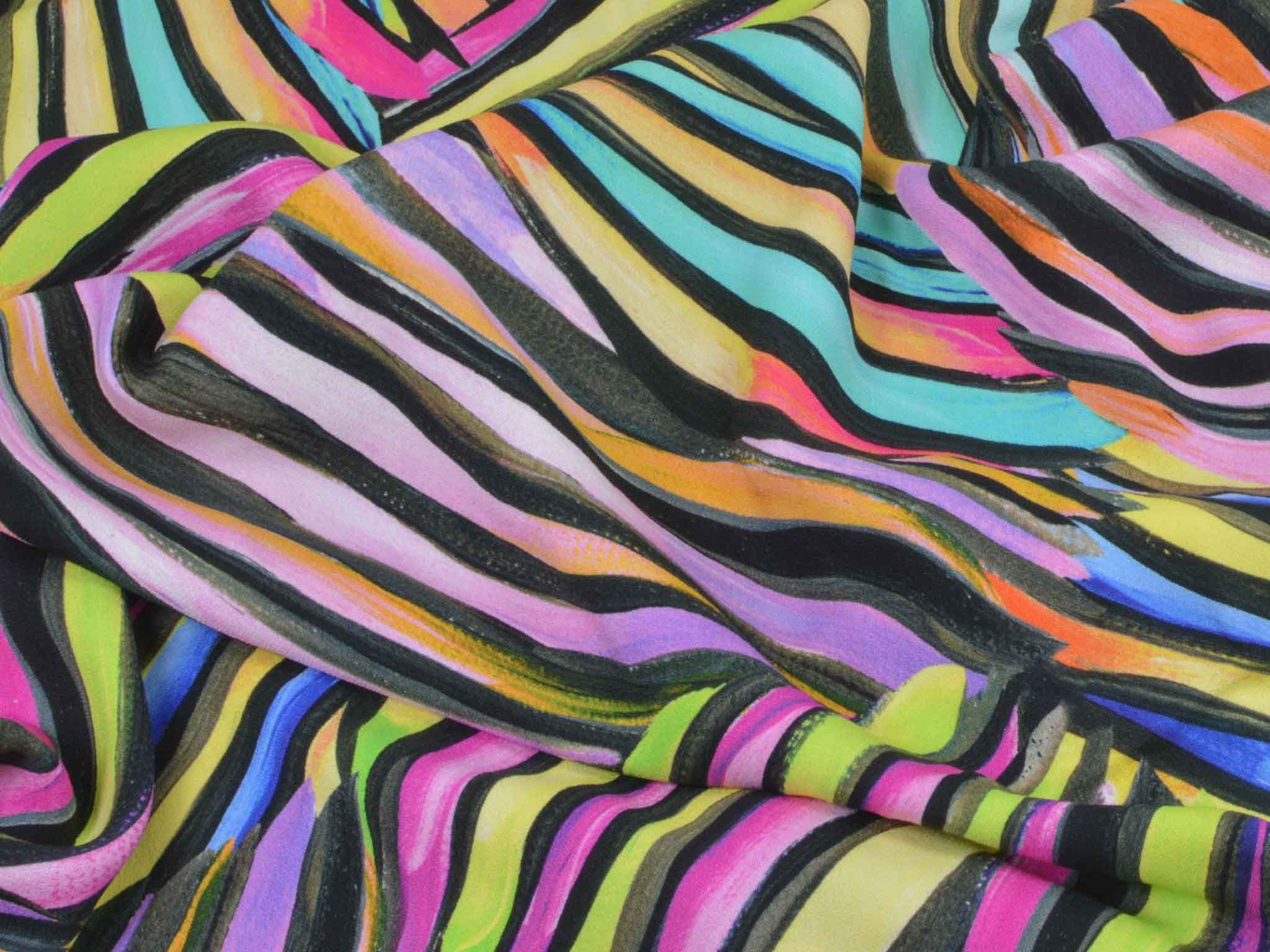 Hochwertige Webware aus dem Hause Hilco. Die Viskose mit bunten Zebrastreifen eignet sich wunderbar zum Nähen von Blusen, Kleidern, fließenden Röcken und Hosen und vielem mehr. Der Stoff ist dünn und fällt fließend.