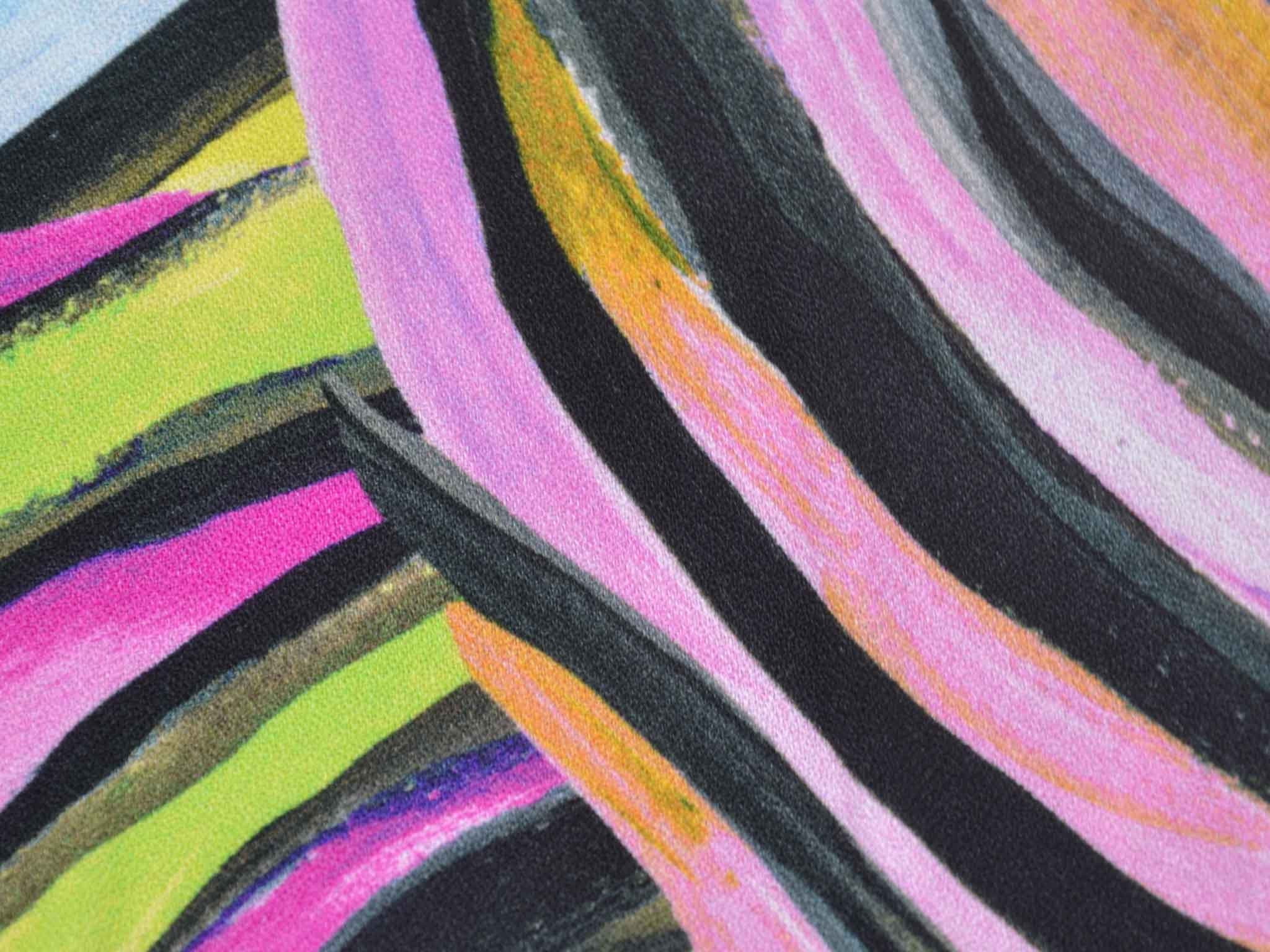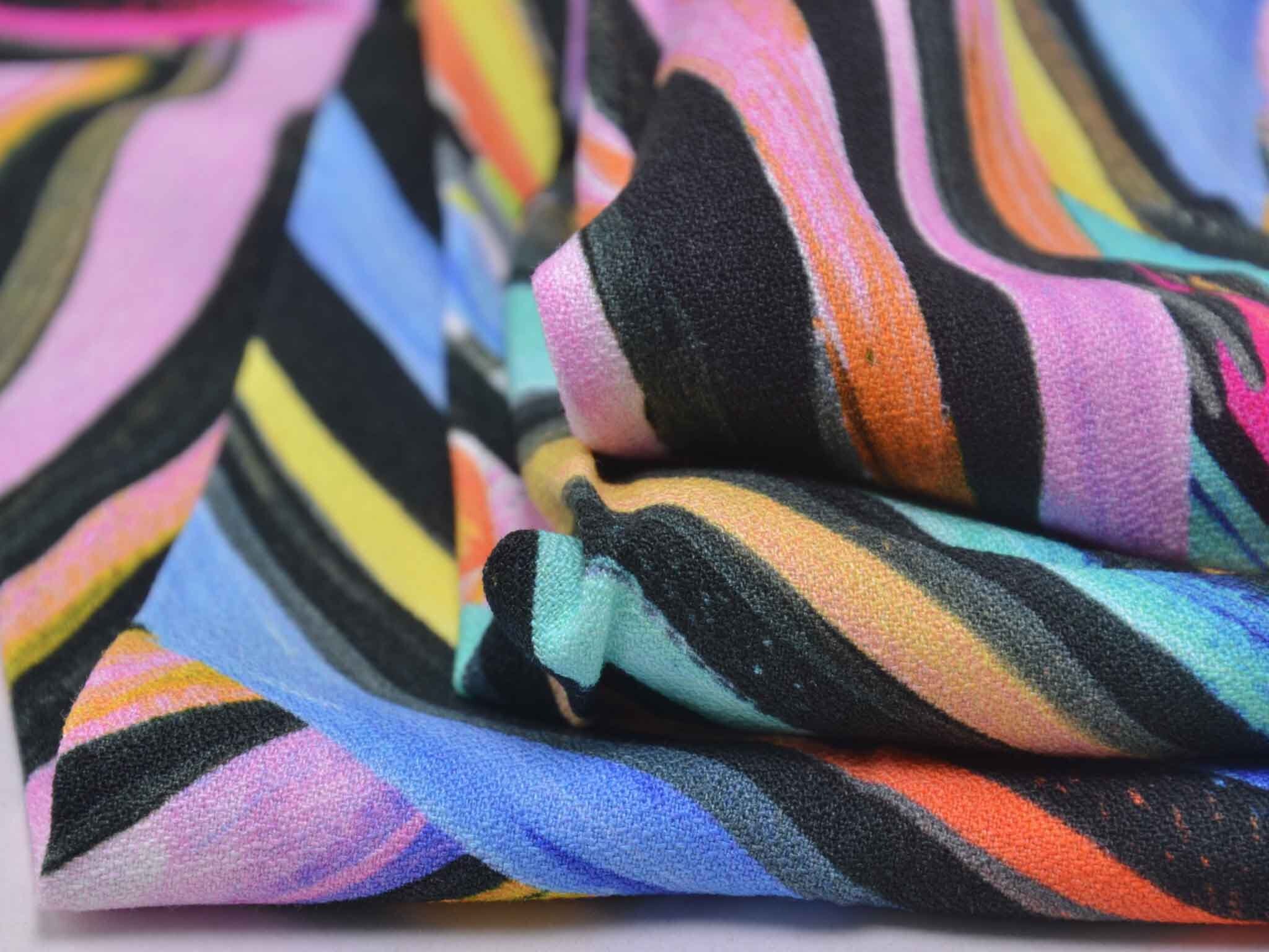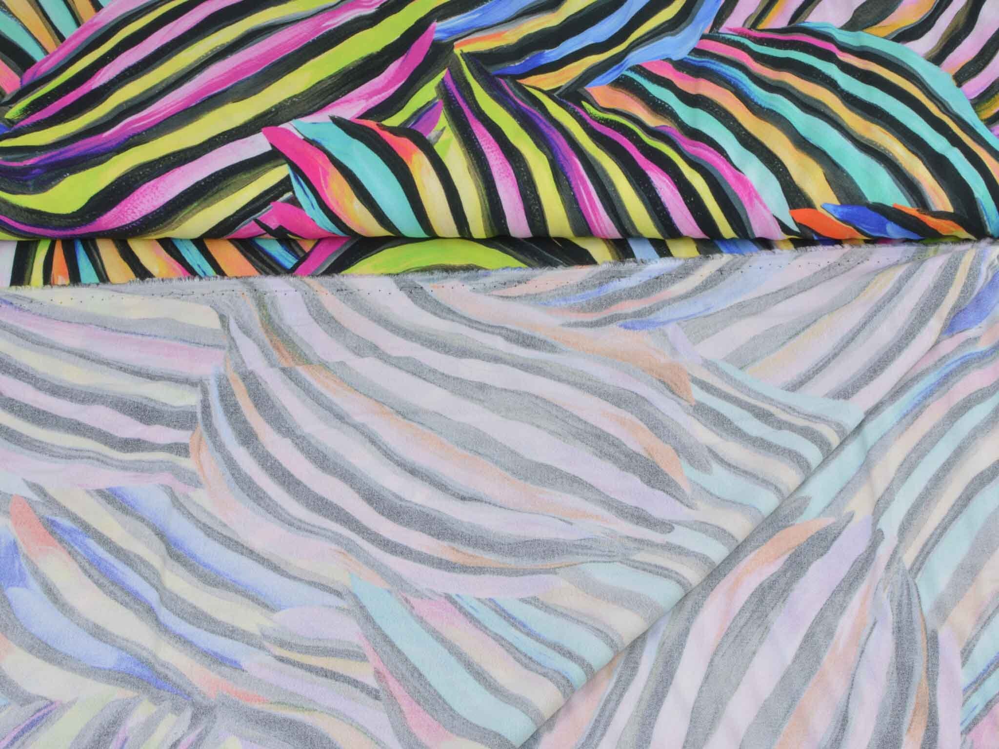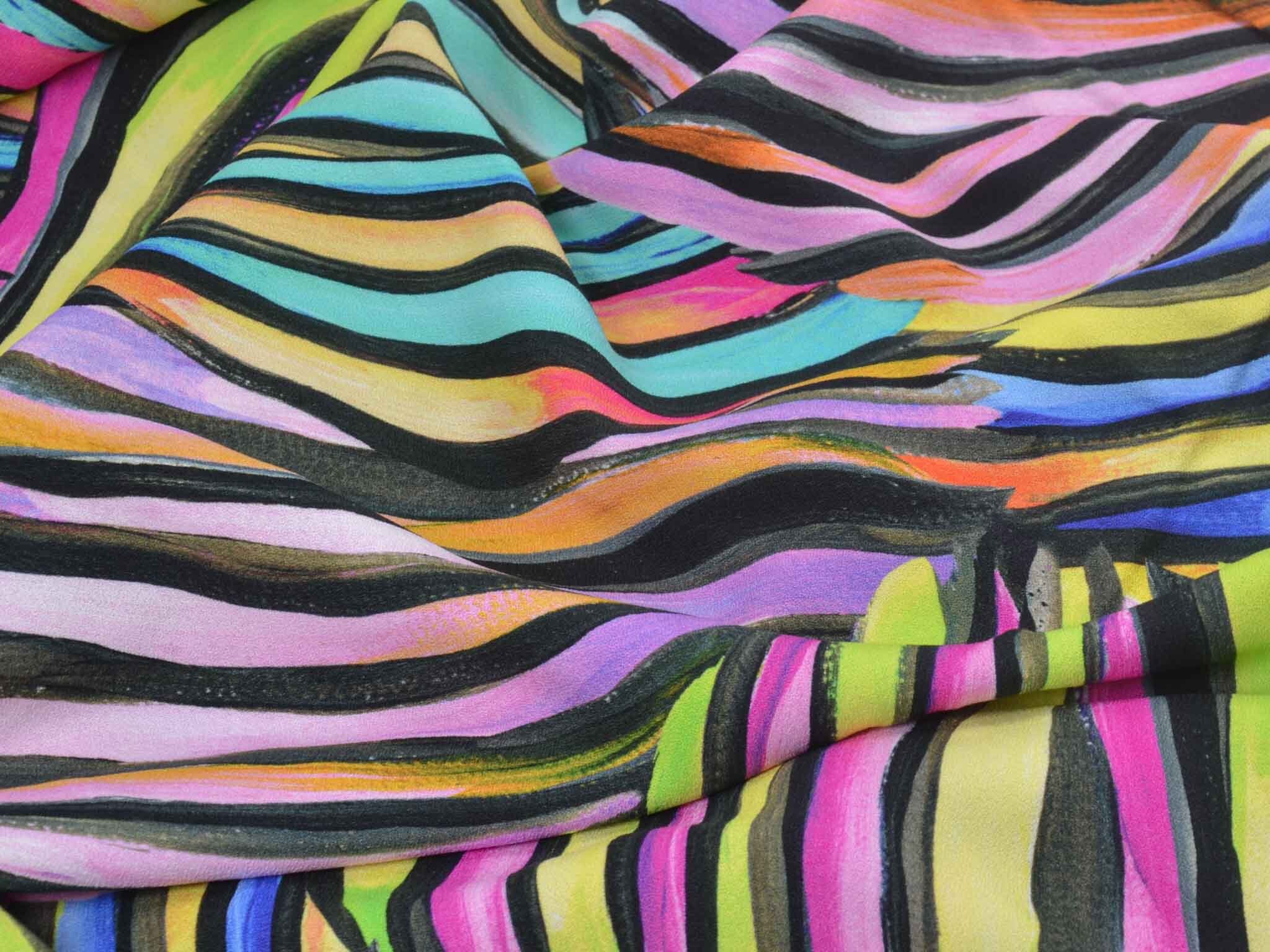 Hochwertige Webware aus dem Hause Hilco. Die Viskose mit bunten Zebrastreifen eignet sich wunderbar zum Nähen von Blusen, Kleidern, fließenden Röcken und Hosen und vielem mehr. Der Stoff ist dünn und fällt fließend.