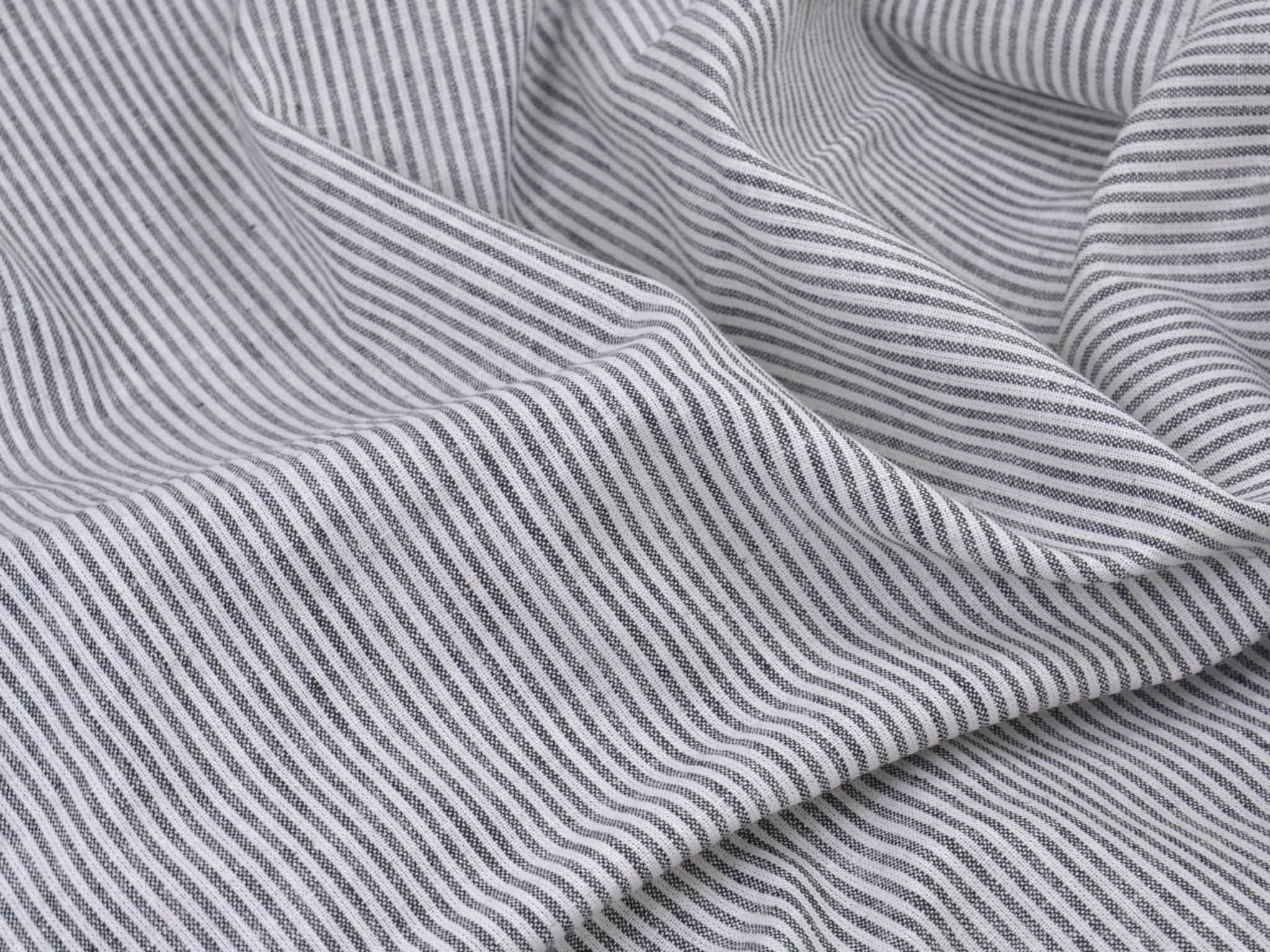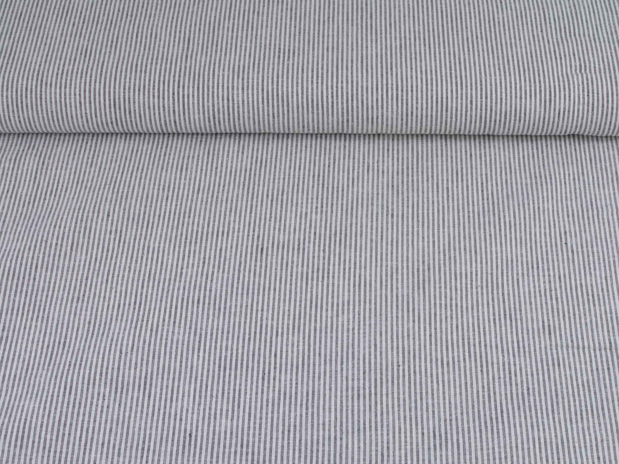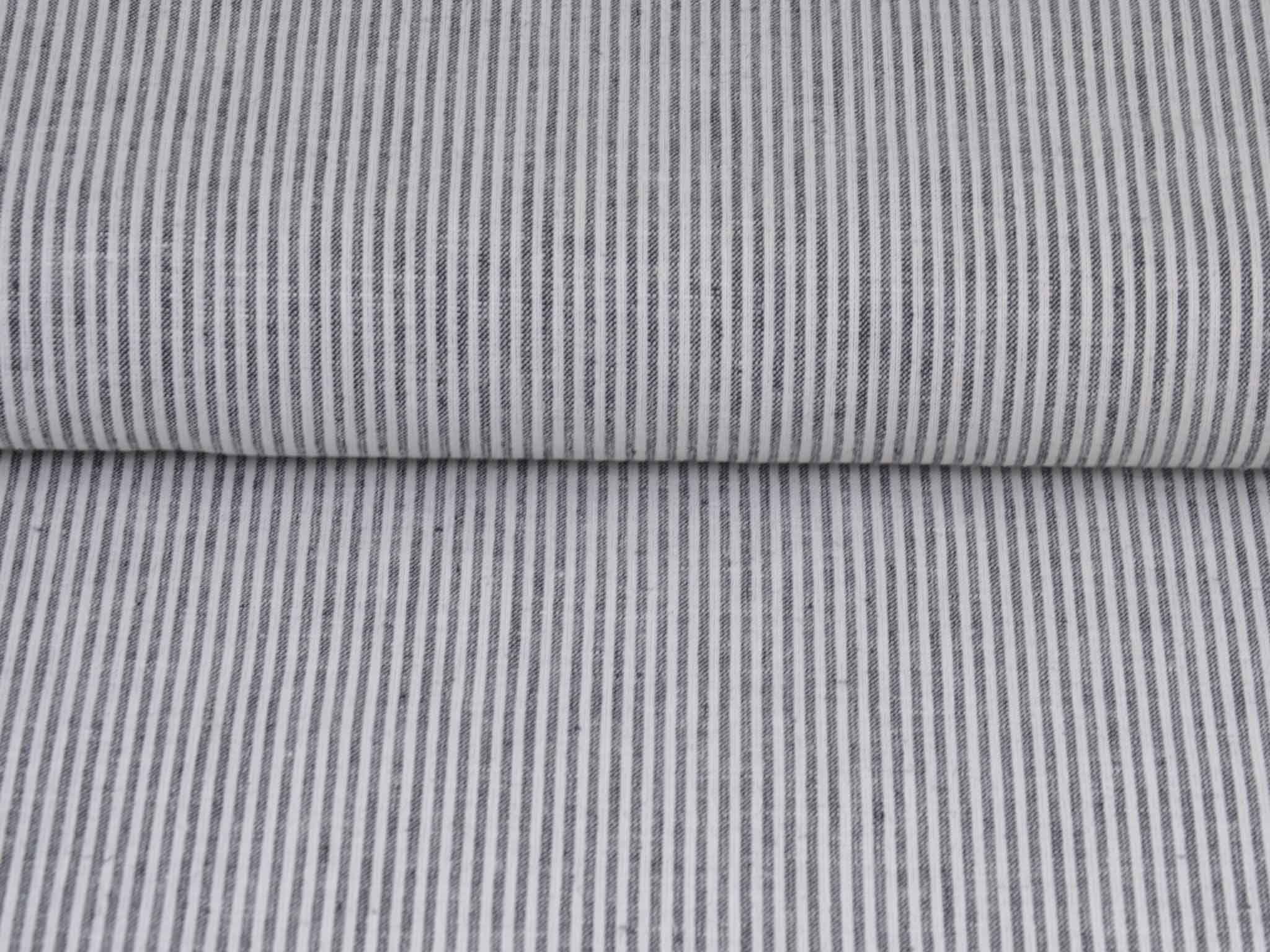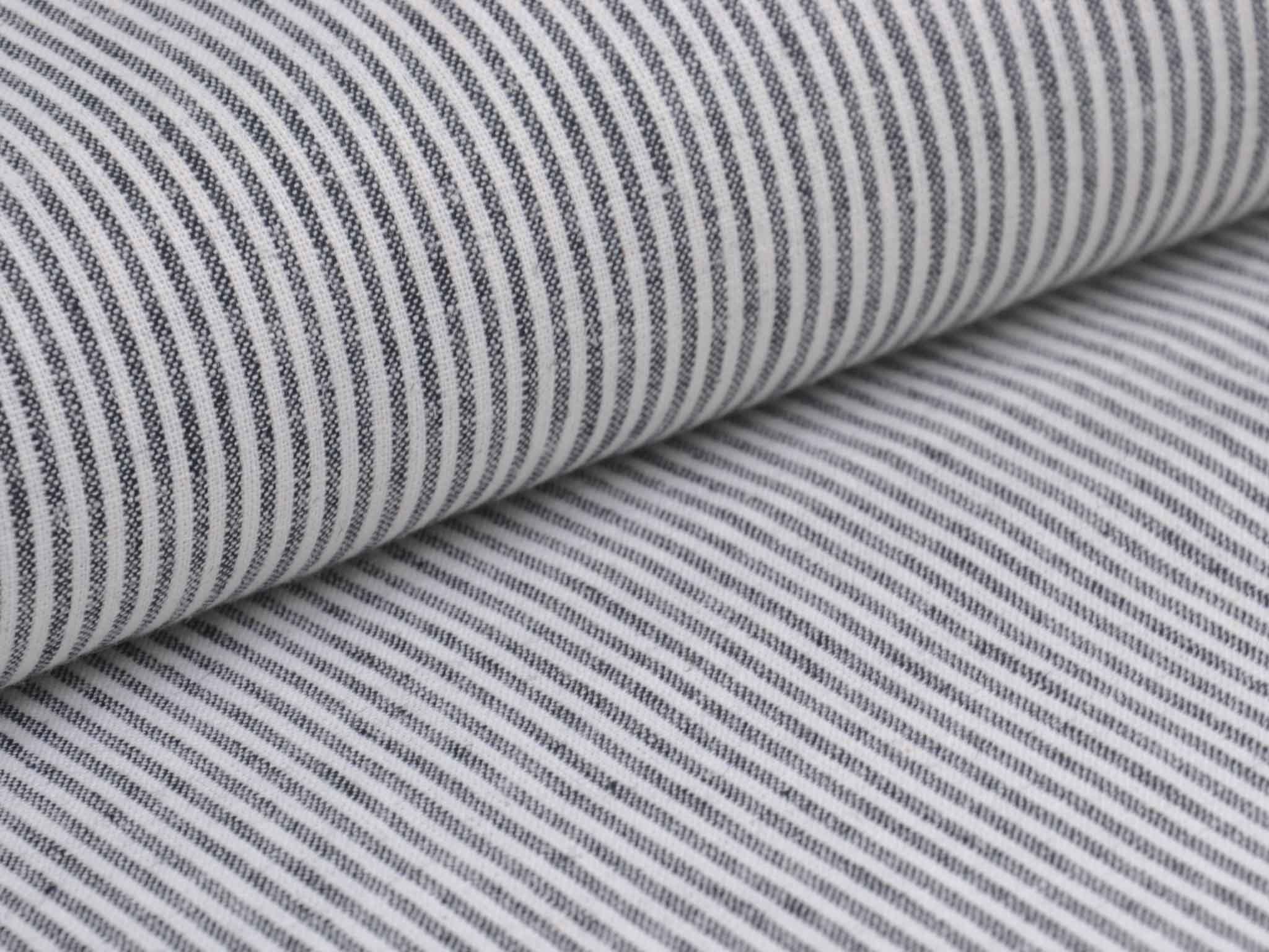 Grau-weiß gestreifter Leinenstoff mit Baumwolle. Der Stoff fühlt sich glatt an und hat eine typische Leinenstruktur. Die Streifen sind fein und ca. 2 mm breit. Er eignet sich super für Hosen, Kleider, Röcke und vieles mehr.