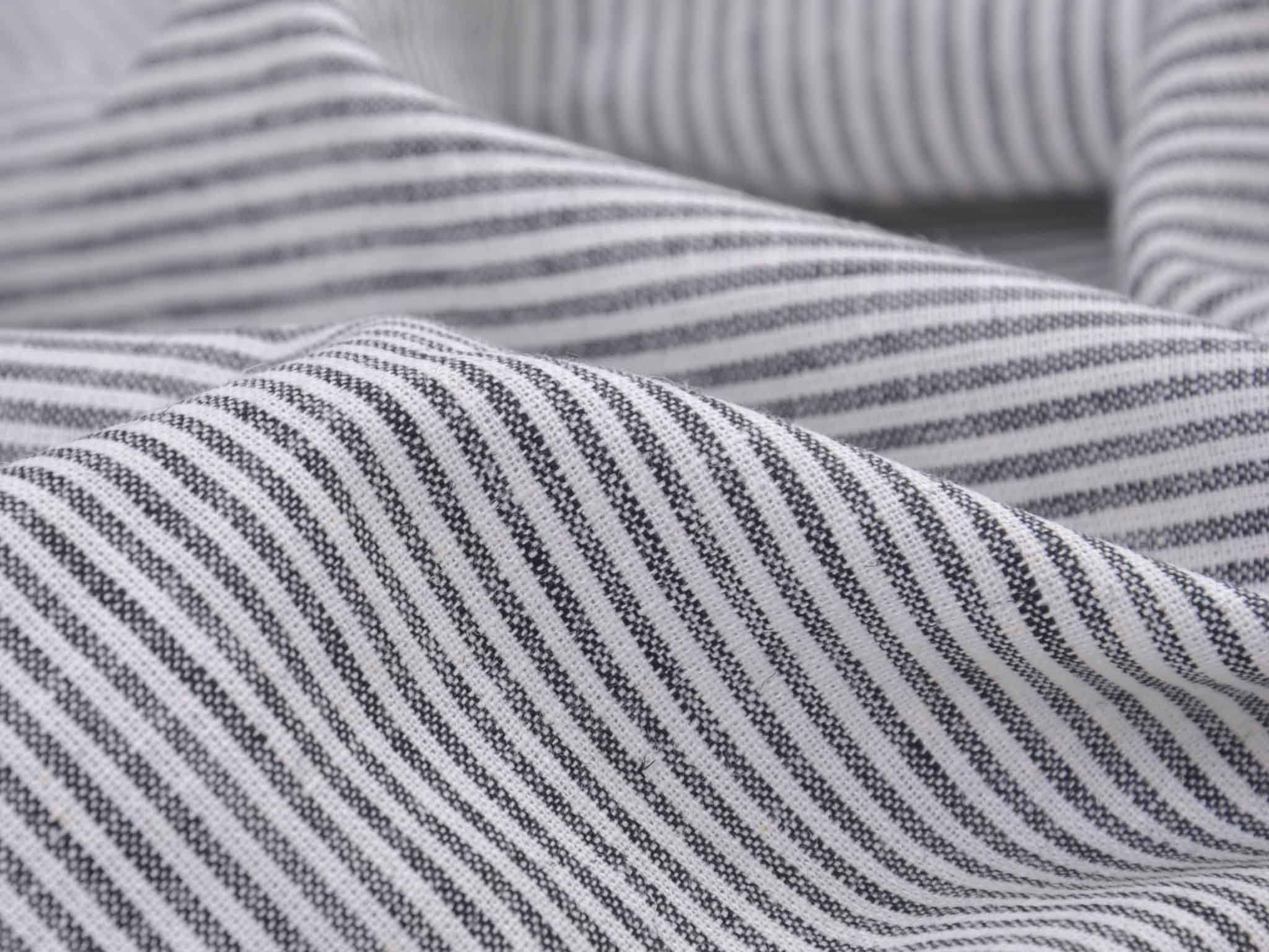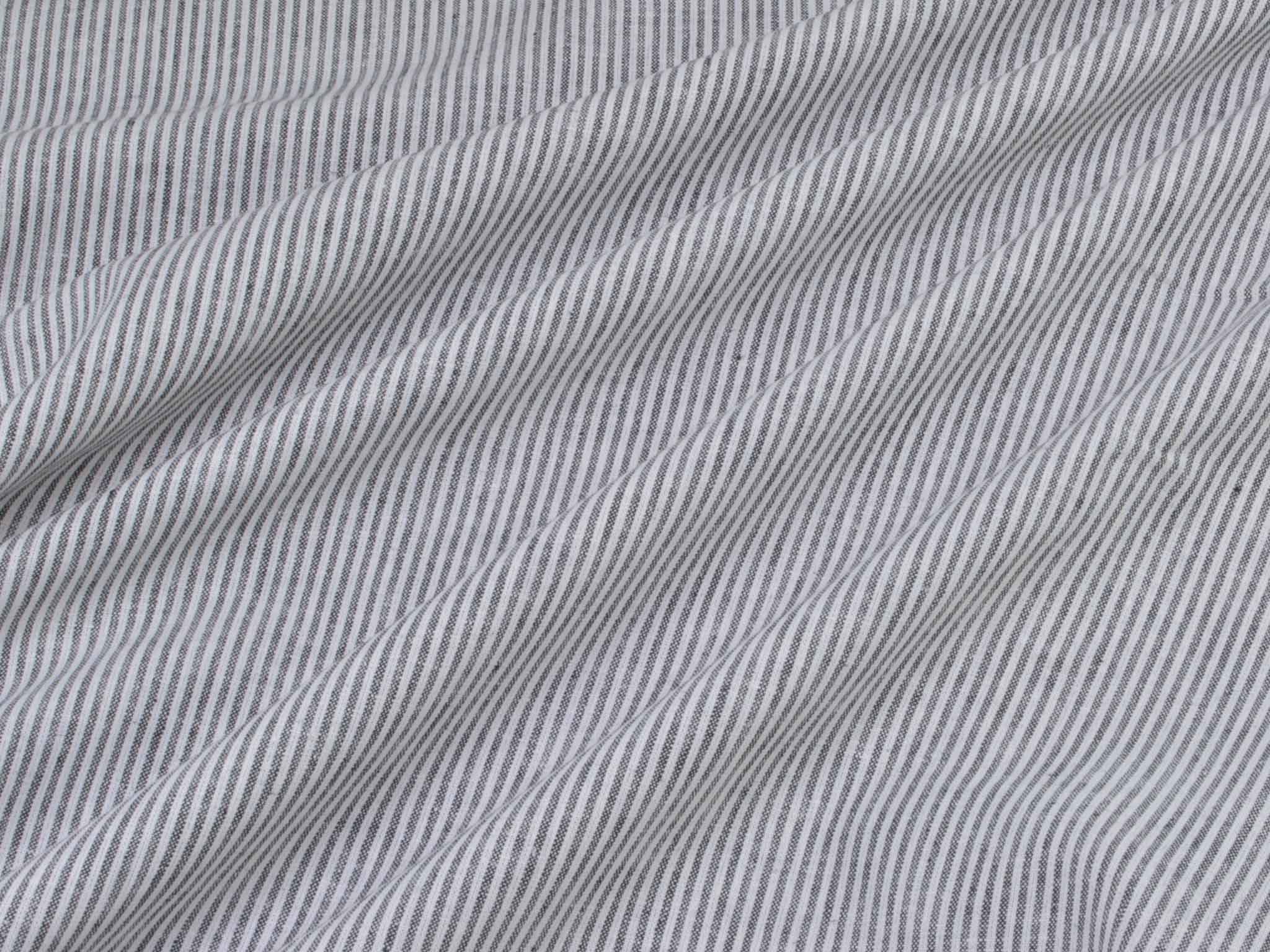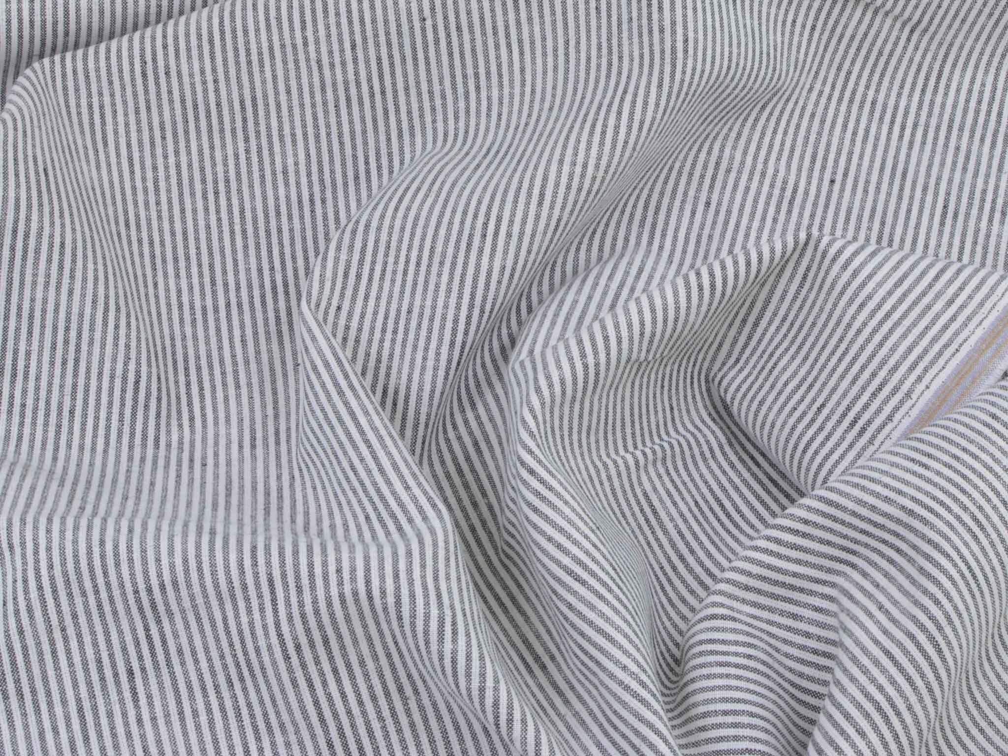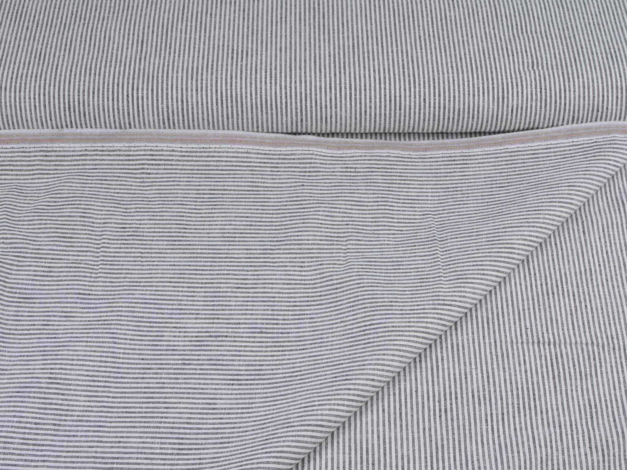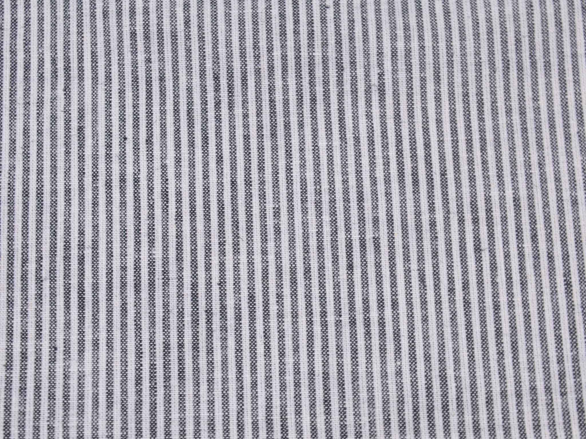Grau-weiß gestreifter Leinenstoff mit Baumwolle. Der Stoff fühlt sich glatt an und hat eine typische Leinenstruktur. Die Streifen sind fein und ca. 2 mm breit. Er eignet sich super für Hosen, Kleider, Röcke und vieles mehr.