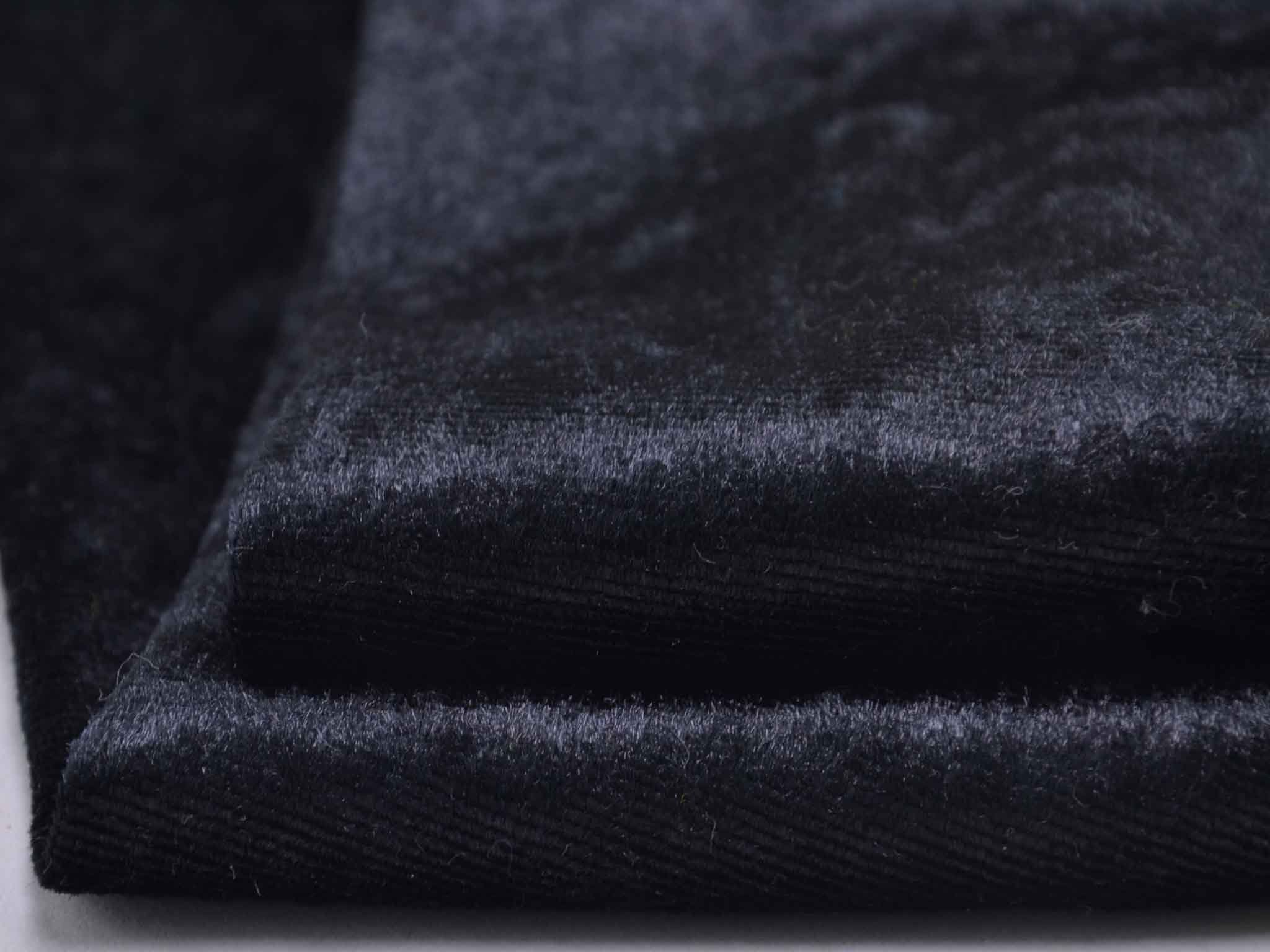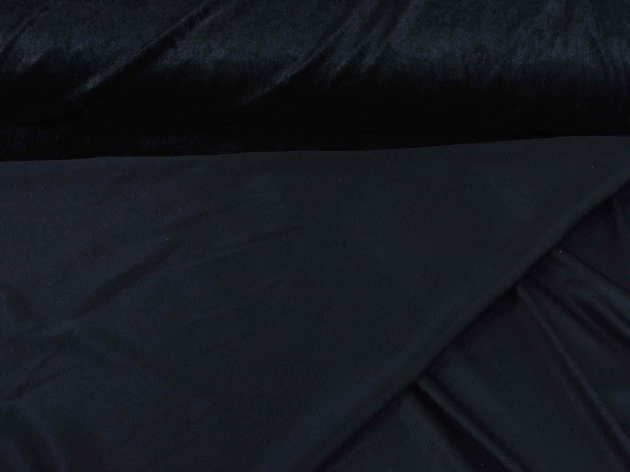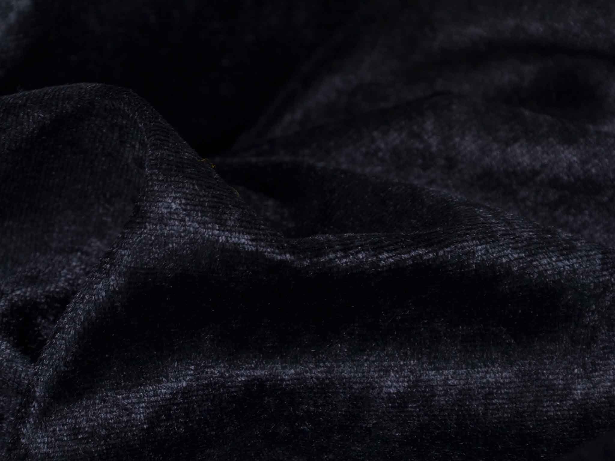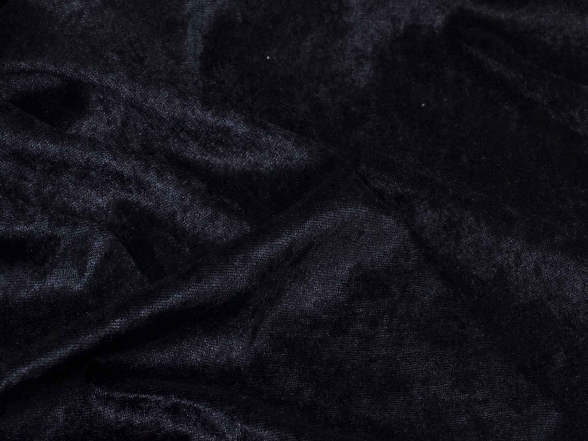 Stretchy, glossy panne velvet in solid black. The fabric feels soft and has a flowing drape. It's suitable for sewing costumes and decoration.