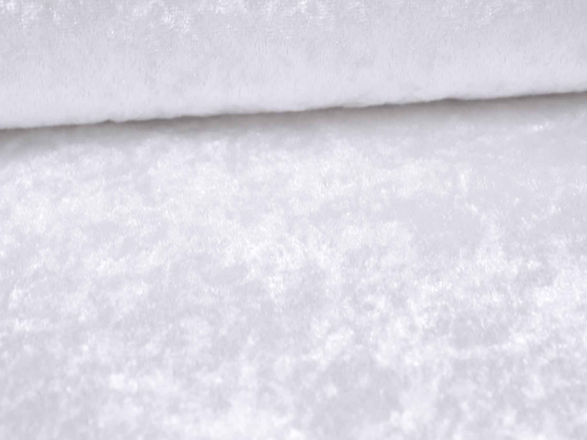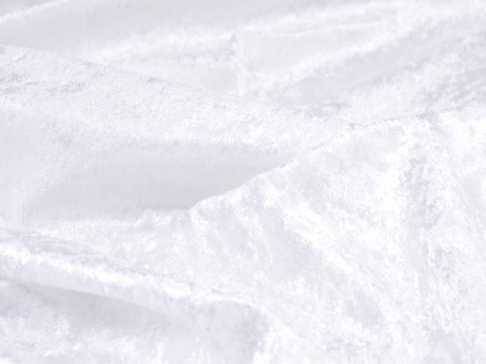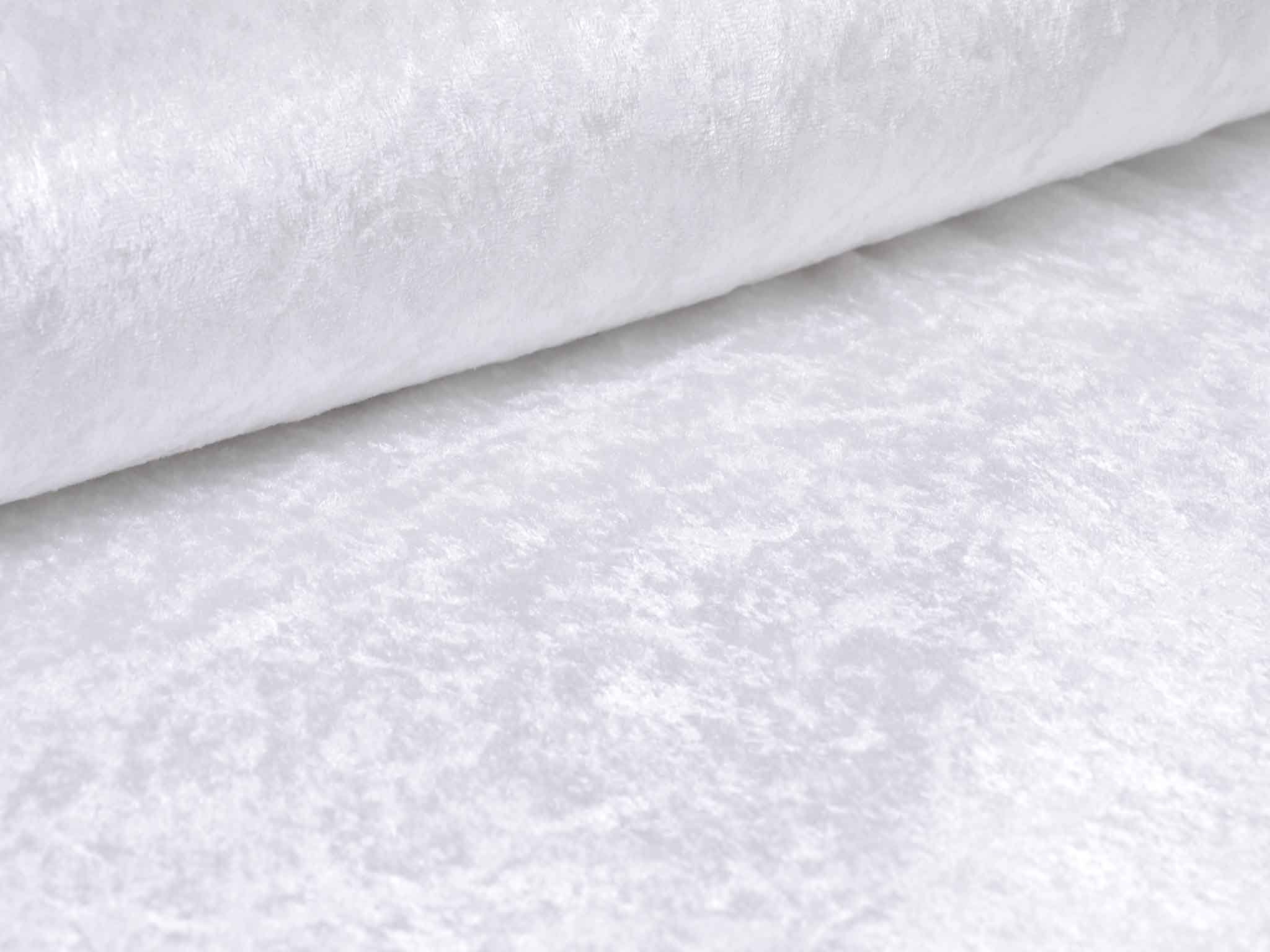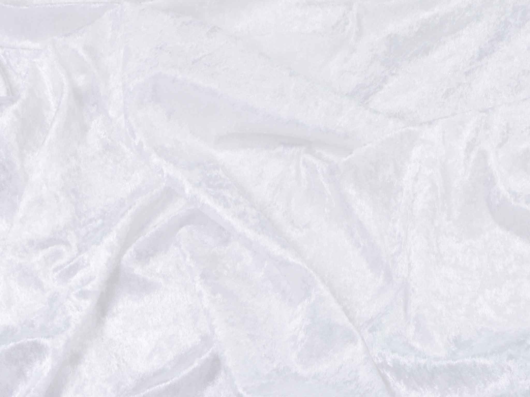 Elastischer, glänzender Pannesamt in uni weiß. Der Stoff fühlt sich weich an und hat einen fließenden Fall. Er eignet sich zum Nähen von Kostümen und zur Dekoration.