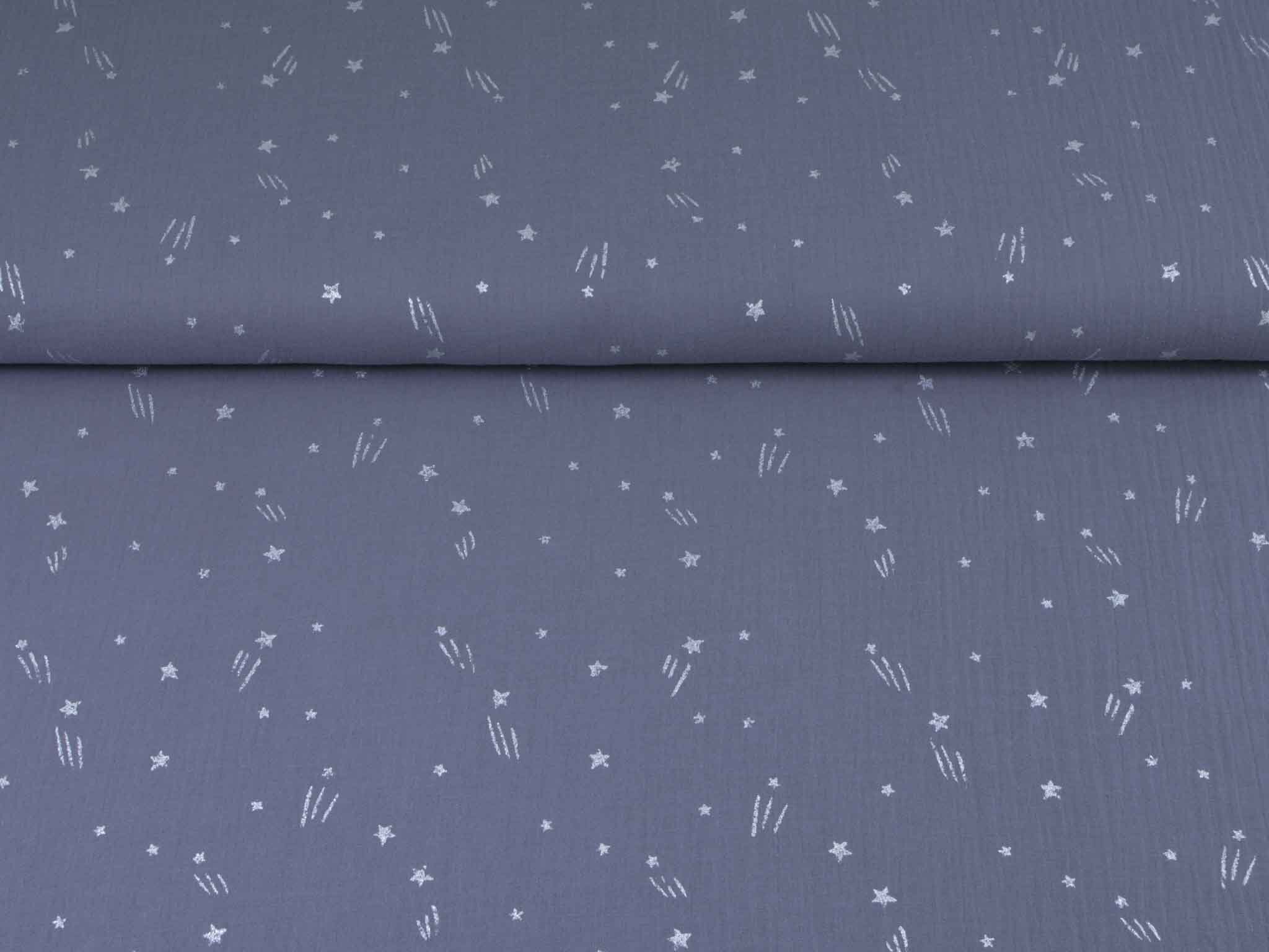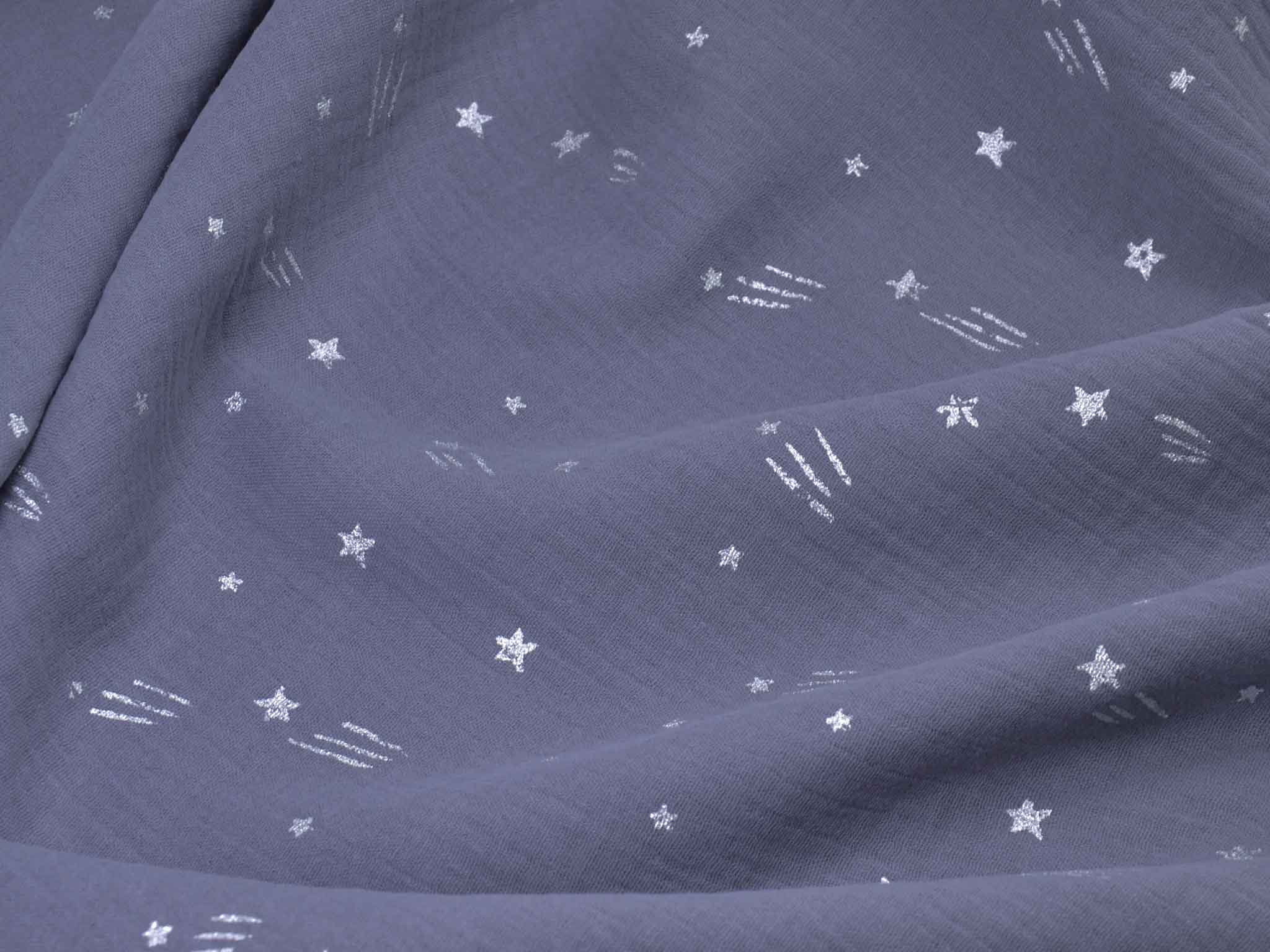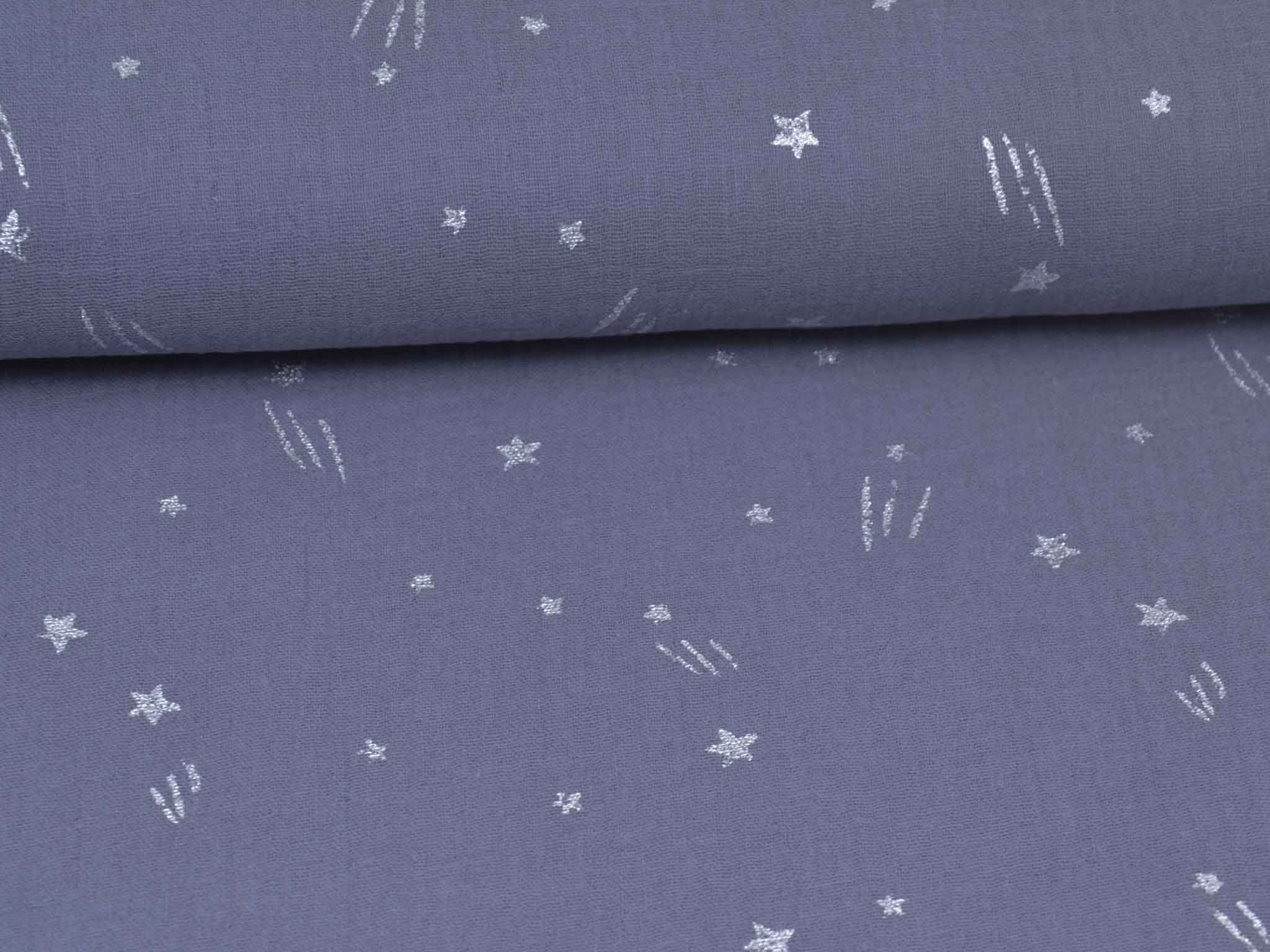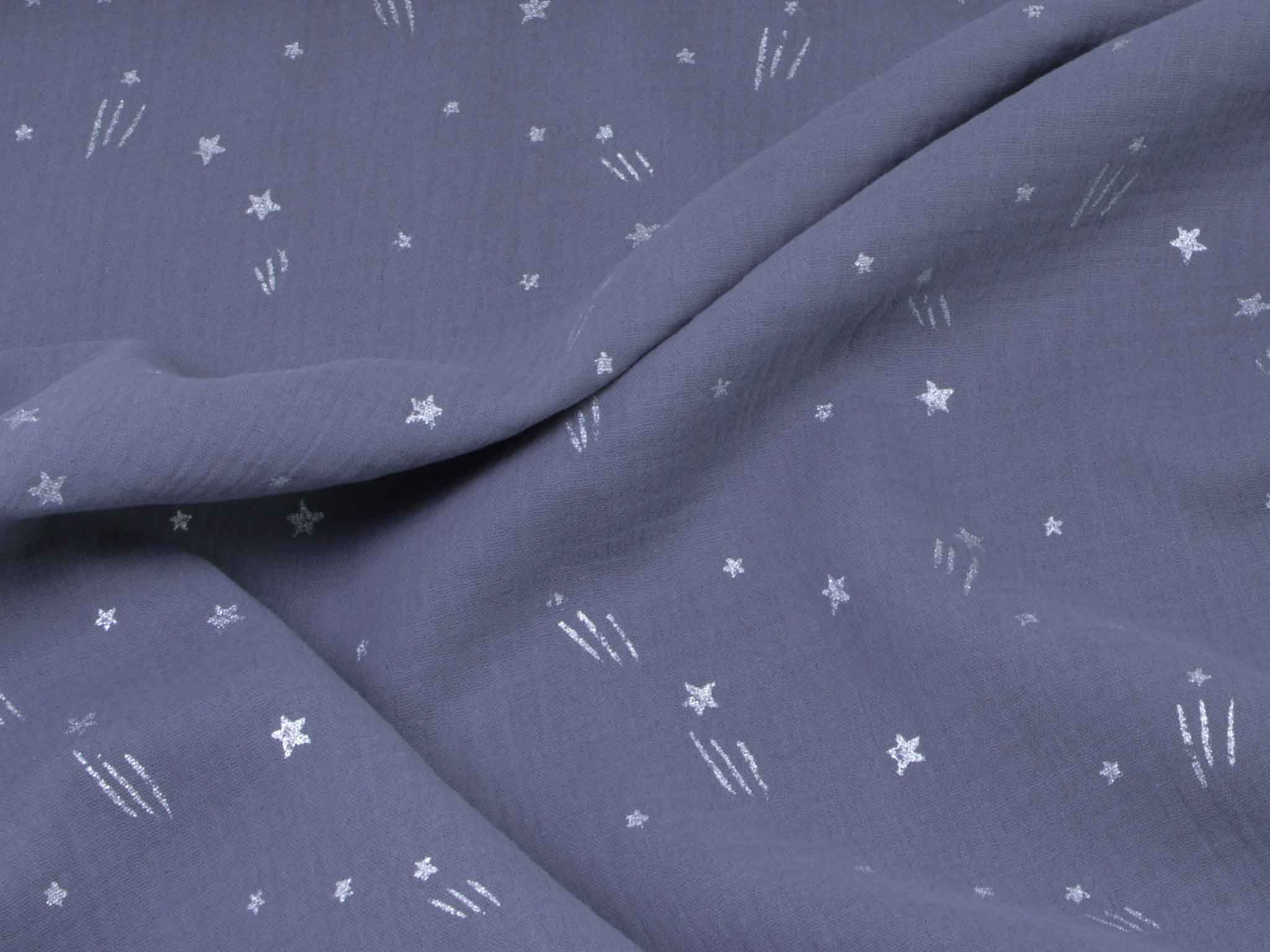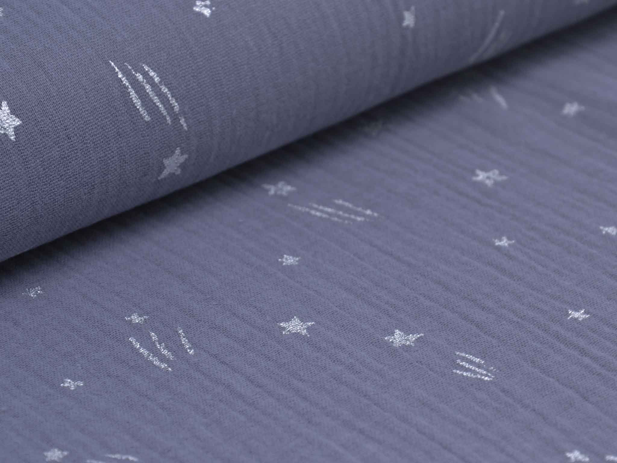 Musselin aus Baumwolle von Katia. Der Musselin ist grau mit silber Sternen und Sternschnuppen. Der Stoff ist dünn, fühlt sich sehr weich an und hat einen weichen Fall. Nähe dir daraus Kleider, Röcke, Hosen, Blusen, Kissen, Decken und vieles mehr.