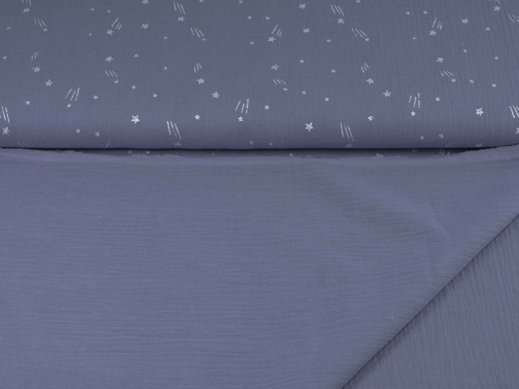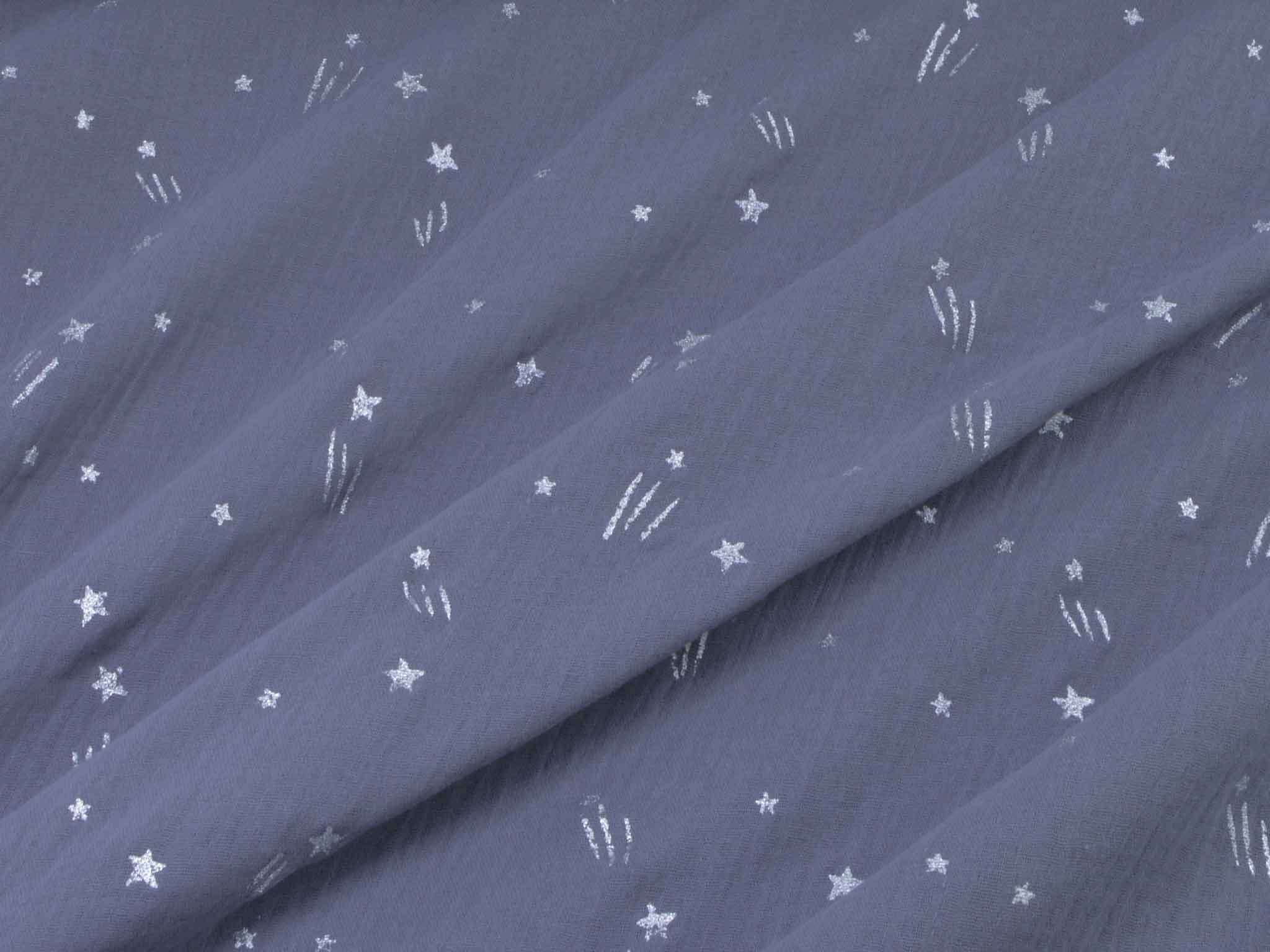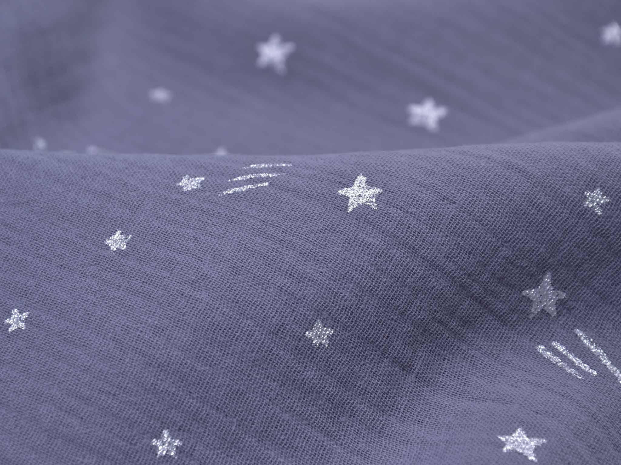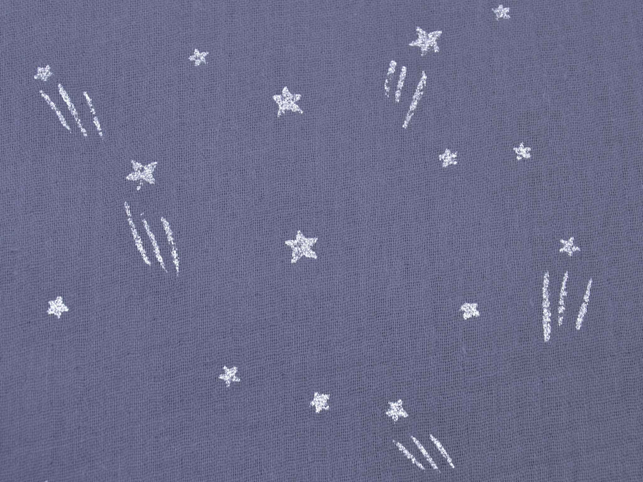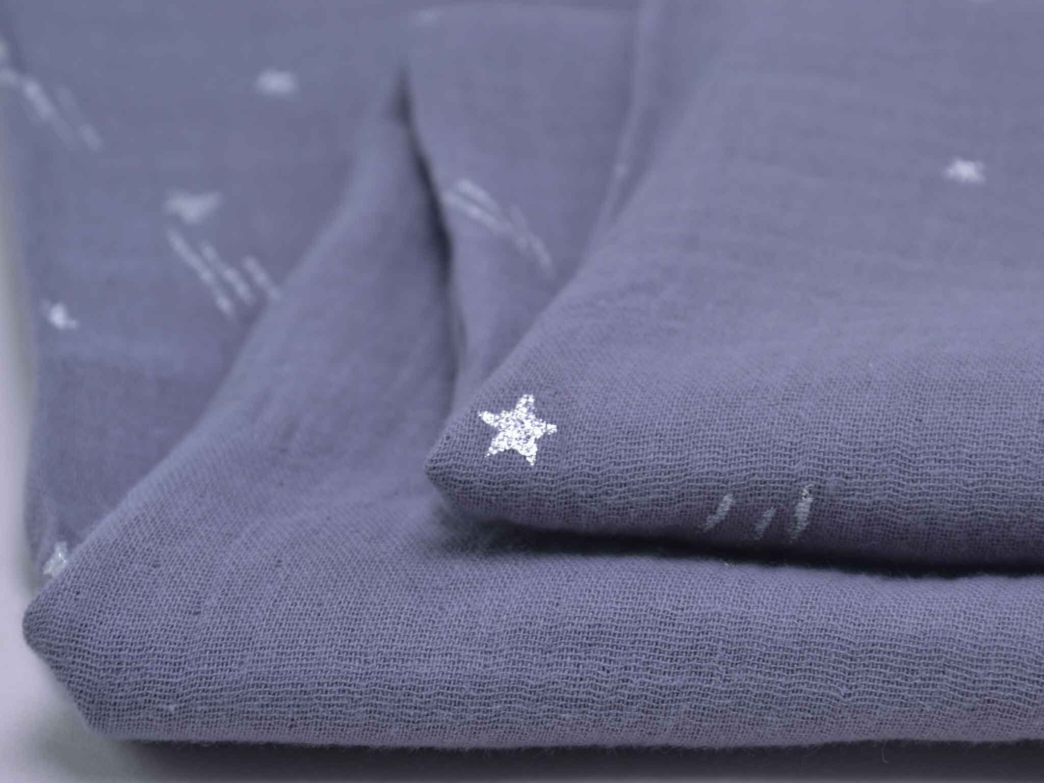 Musselin aus Baumwolle von Katia. Der Musselin ist grau mit silber Sternen und Sternschnuppen. Der Stoff ist dünn, fühlt sich sehr weich an und hat einen weichen Fall. Nähe dir daraus Kleider, Röcke, Hosen, Blusen, Kissen, Decken und vieles mehr.