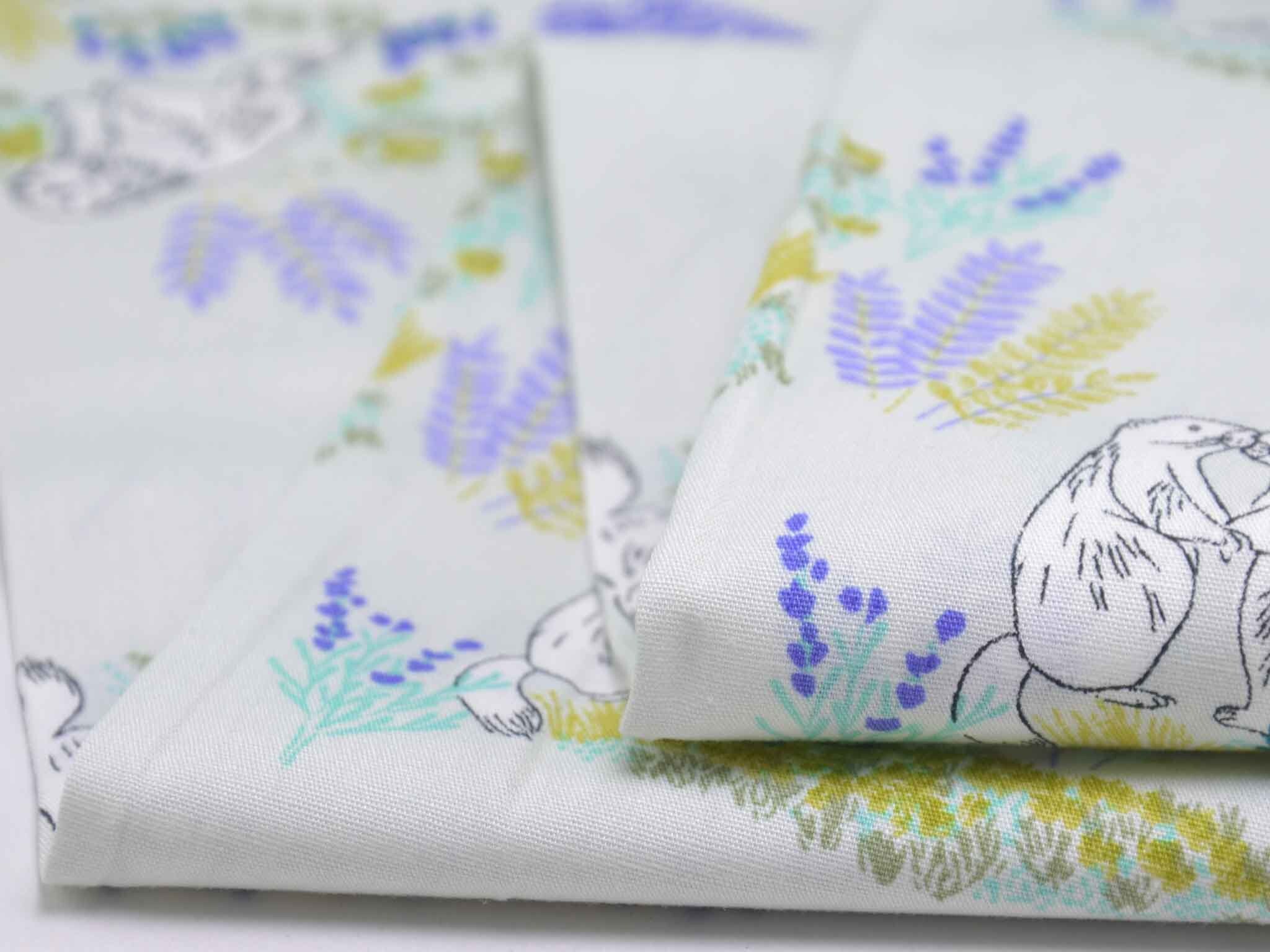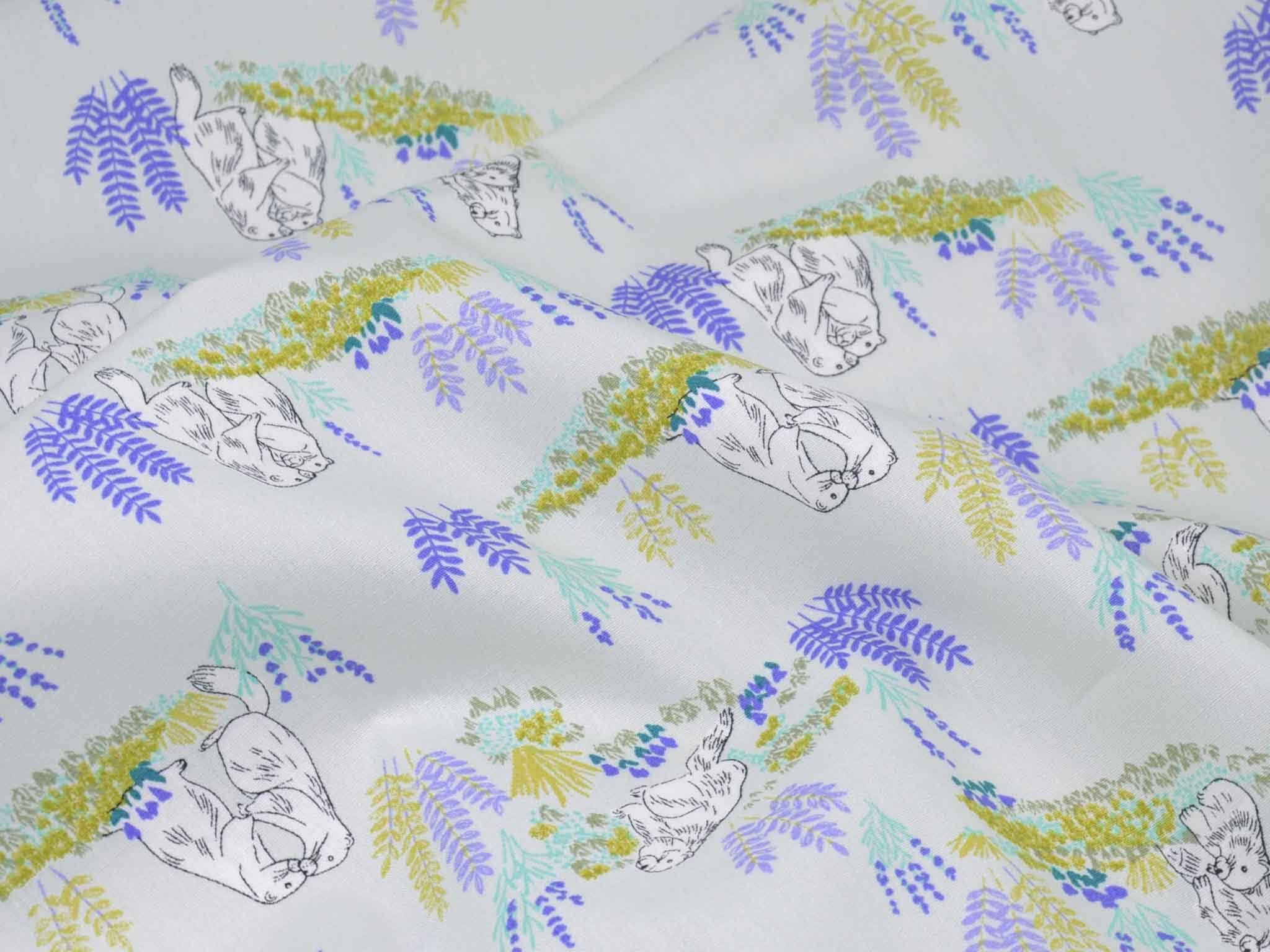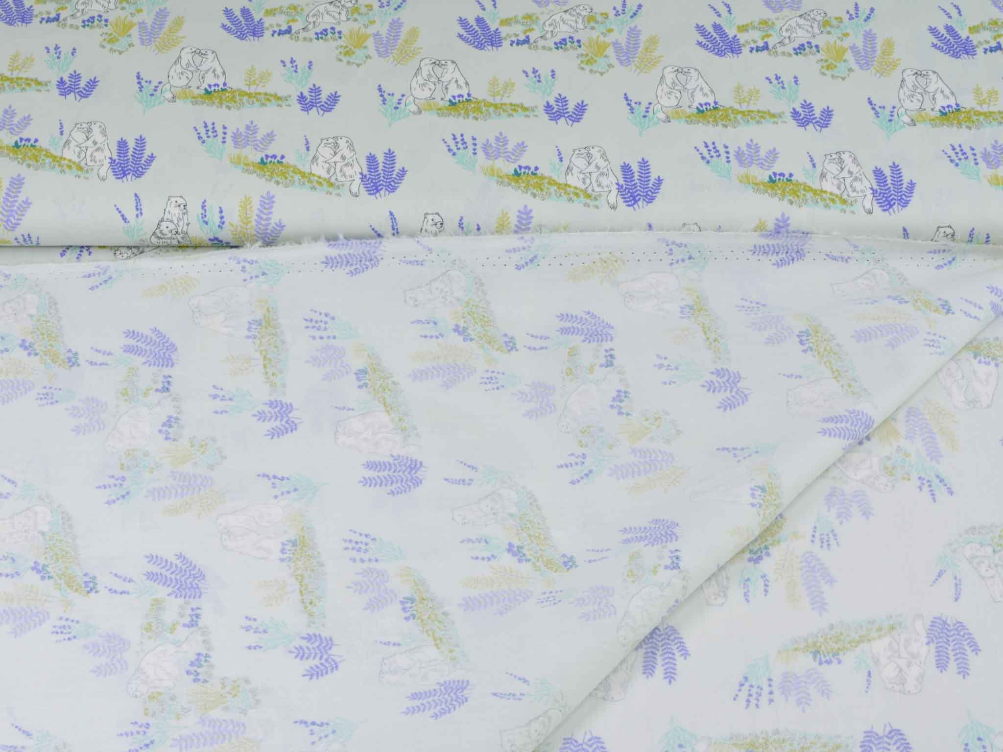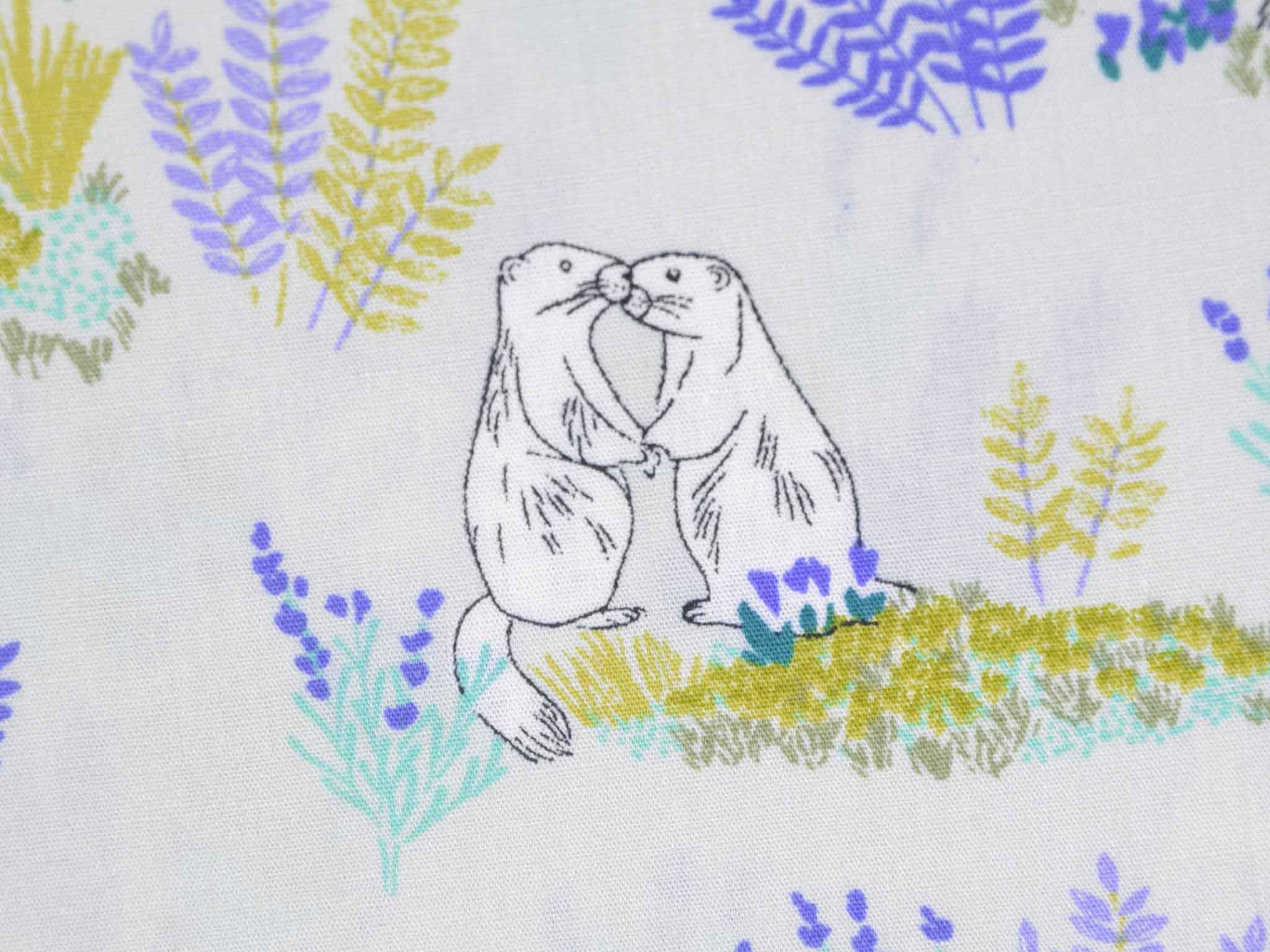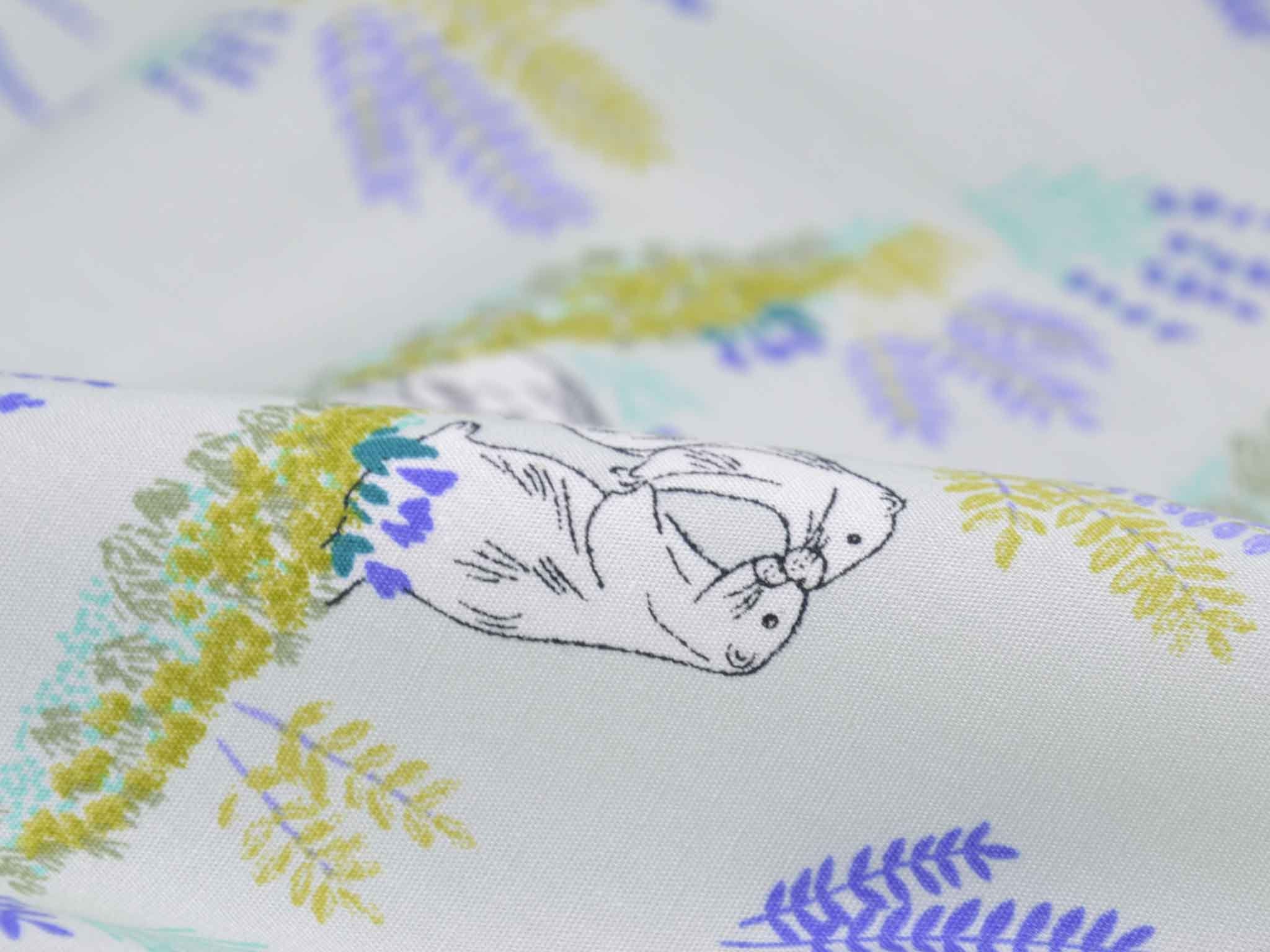 High-quality cotton poplin. The fabric features marmots and lavender. It's smooth and matte. Sew dresses, skirts, and shirts with this poplin. The fabric is also suitable for sewing pillows, utensil holders, bags, and much more.