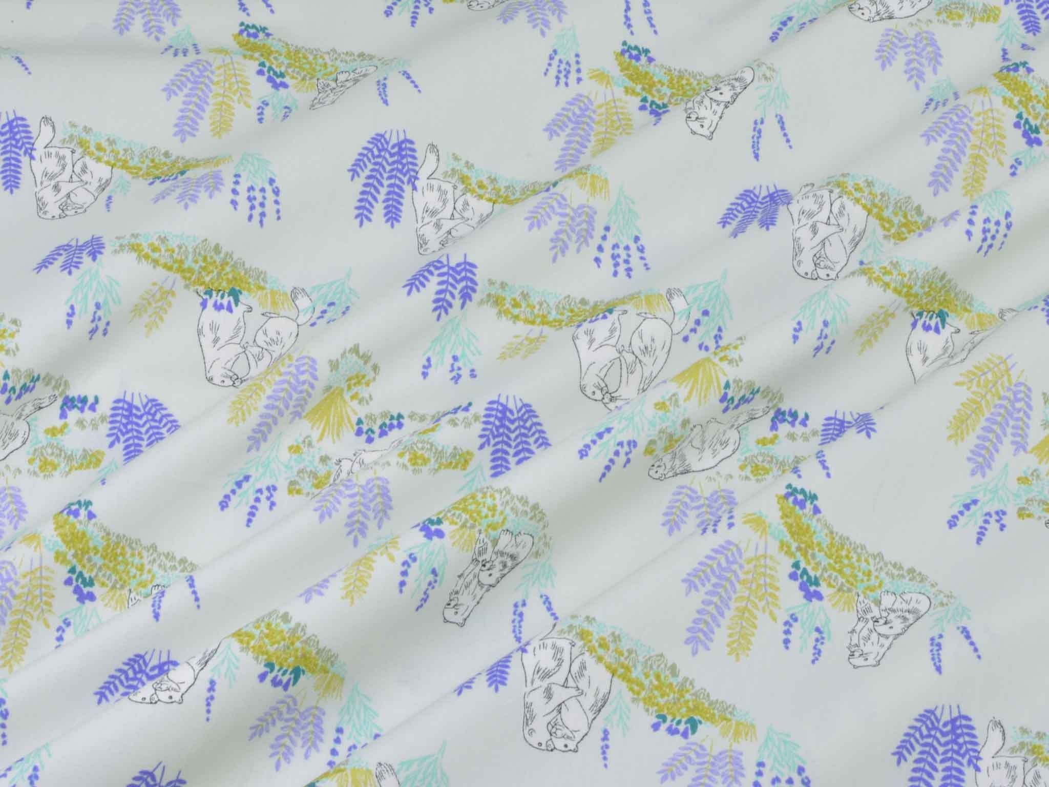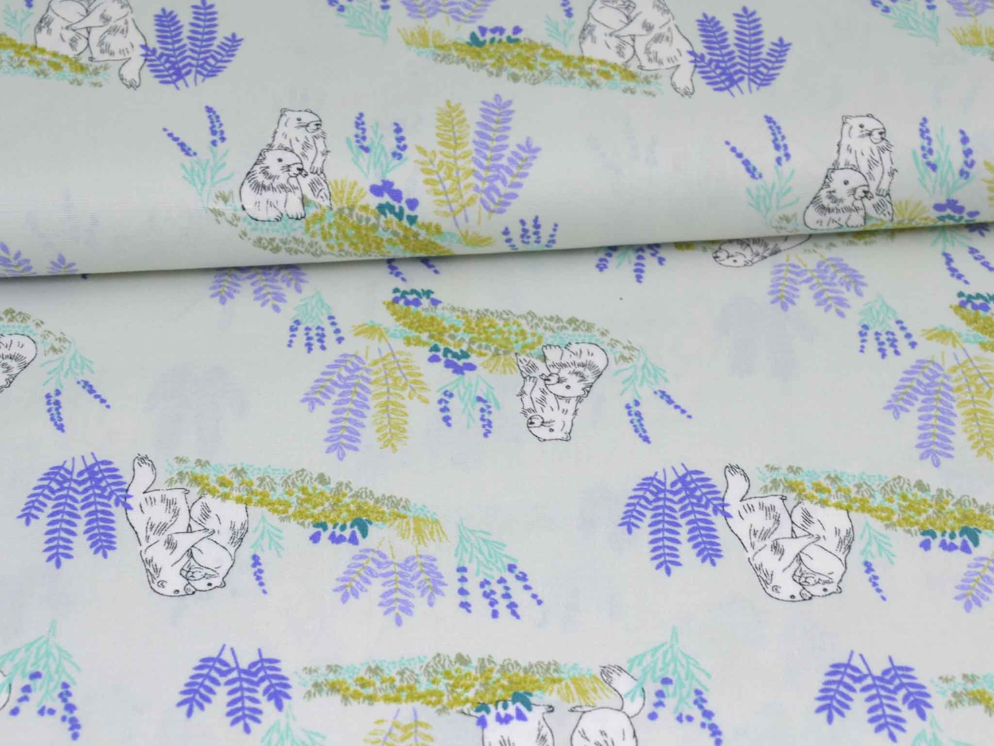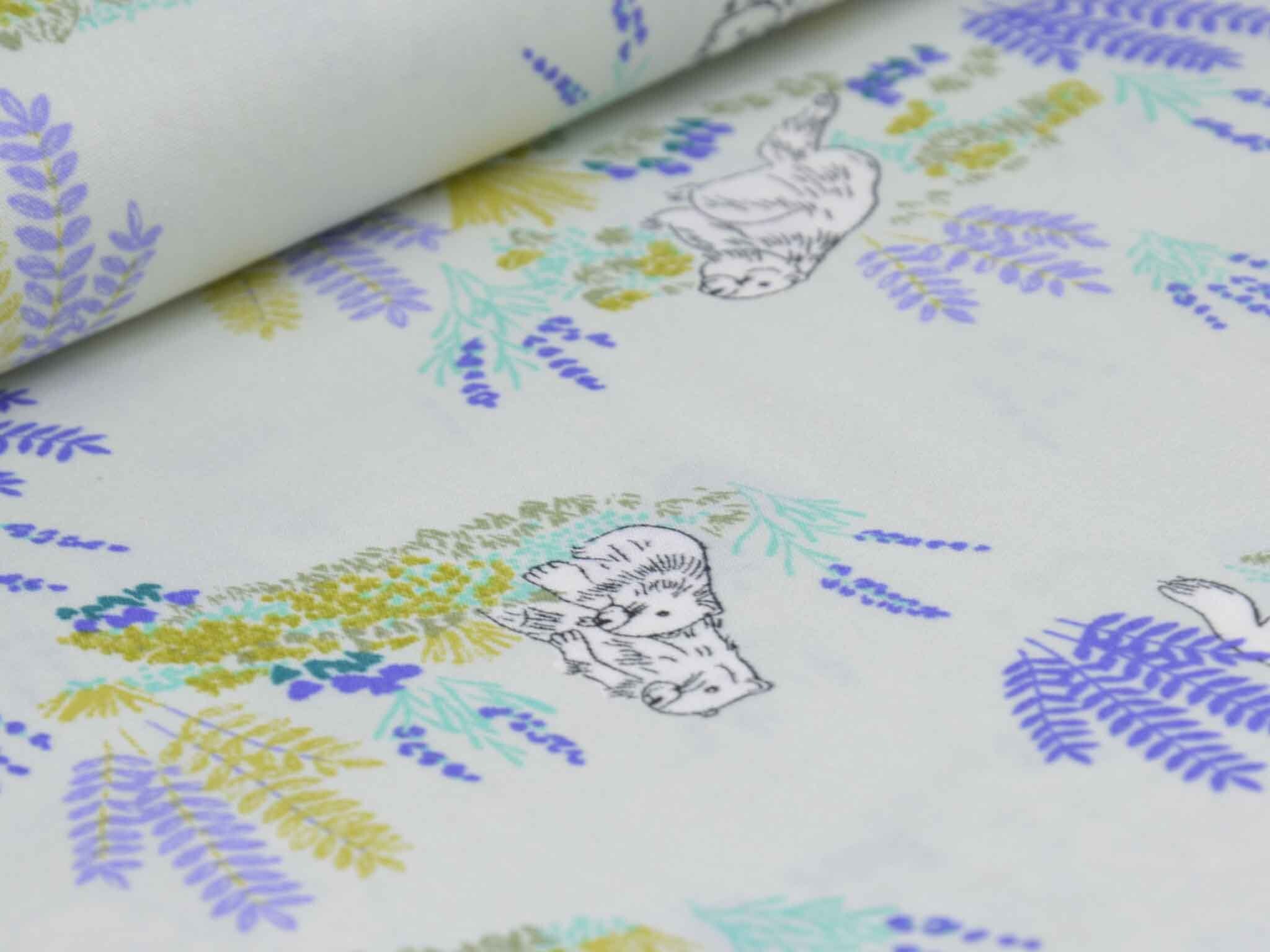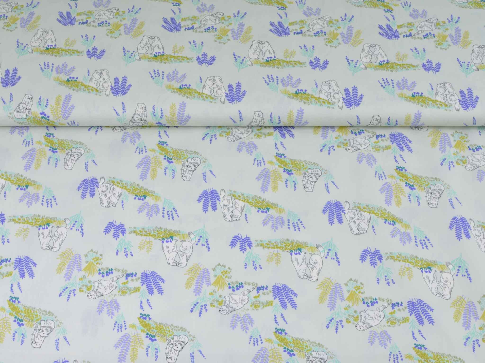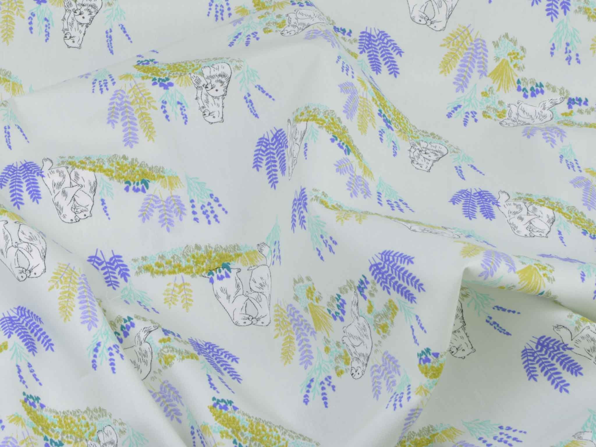 High-quality cotton poplin. The fabric features marmots and lavender. It's smooth and matte. Sew dresses, skirts, and shirts with this poplin. The fabric is also suitable for sewing pillows, utensil holders, bags, and much more.