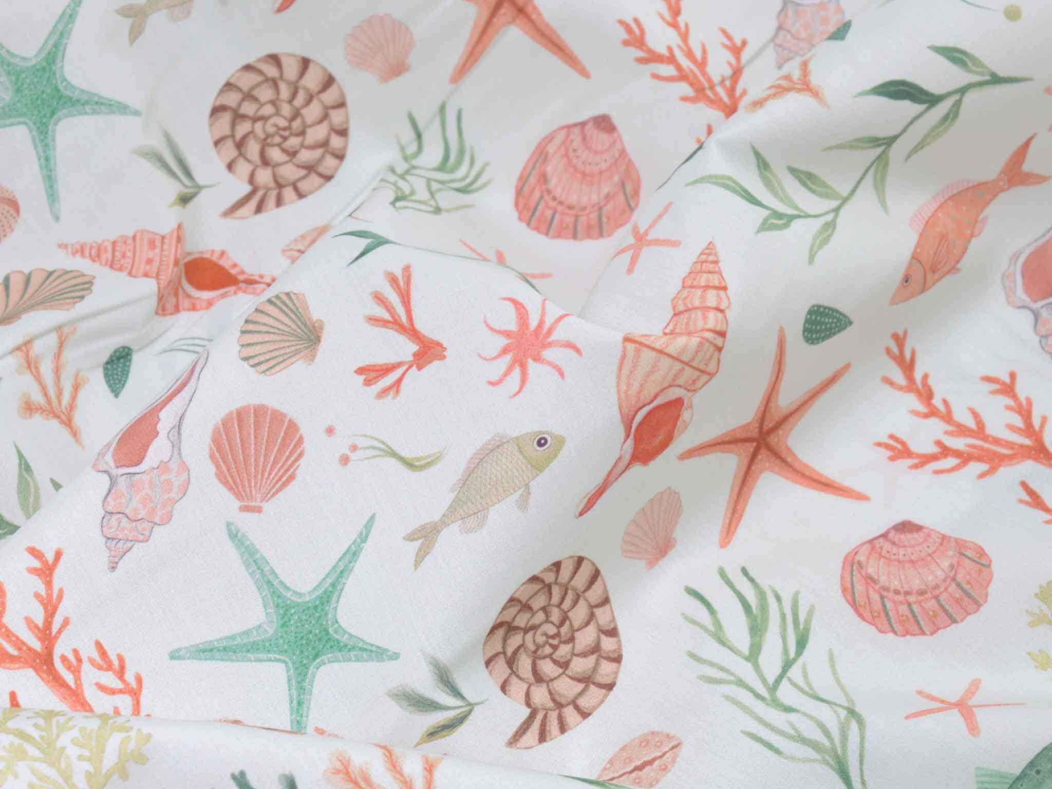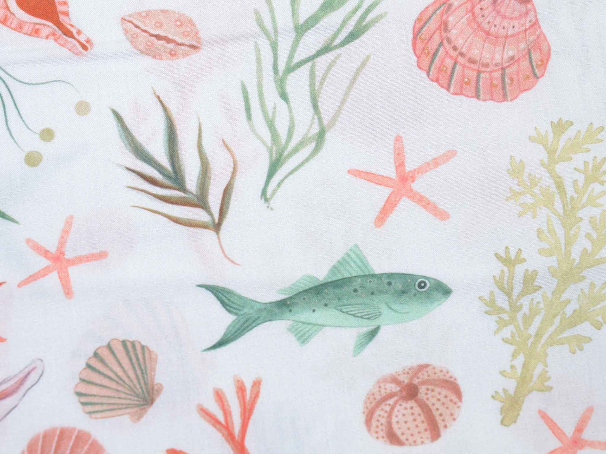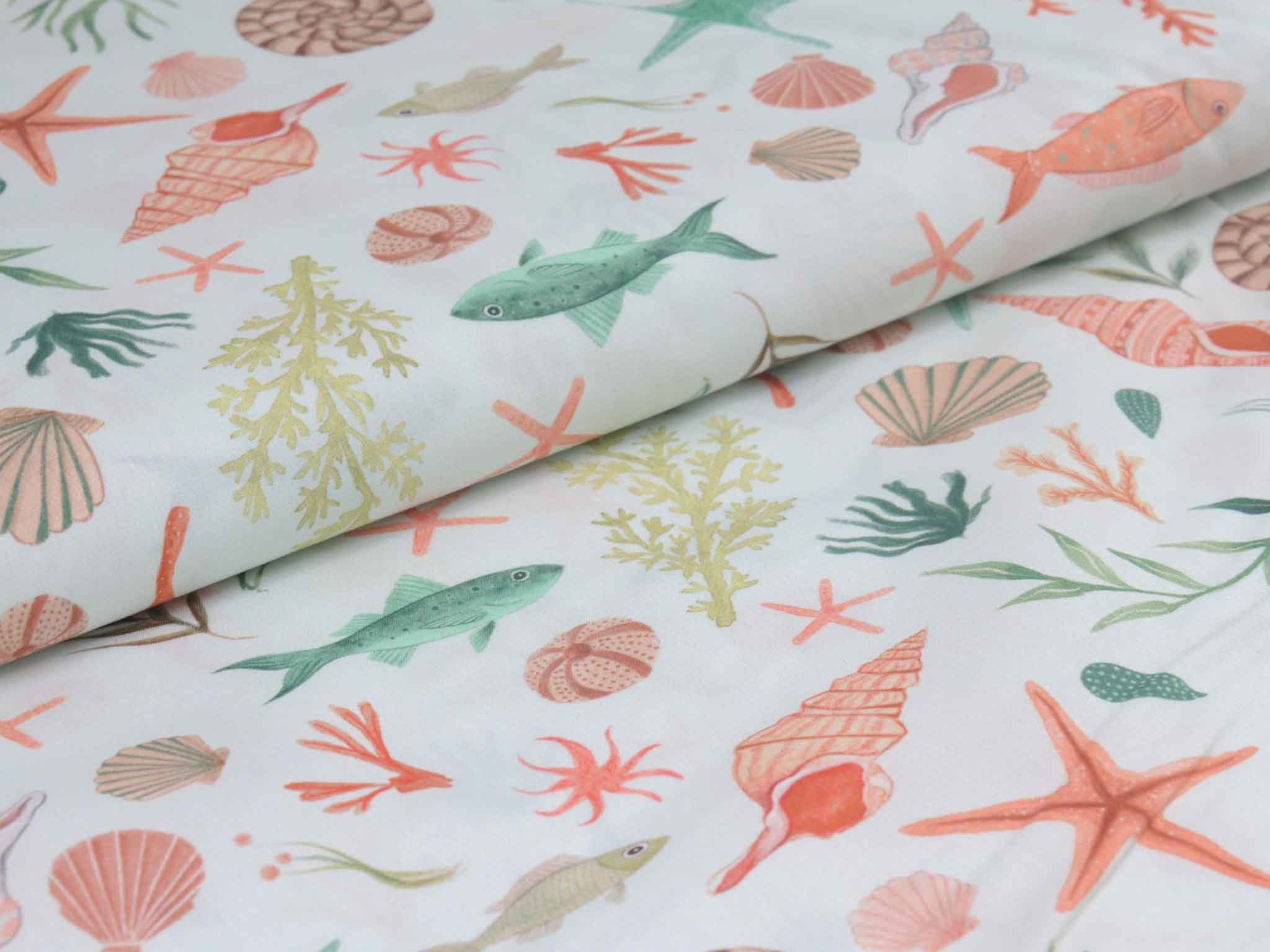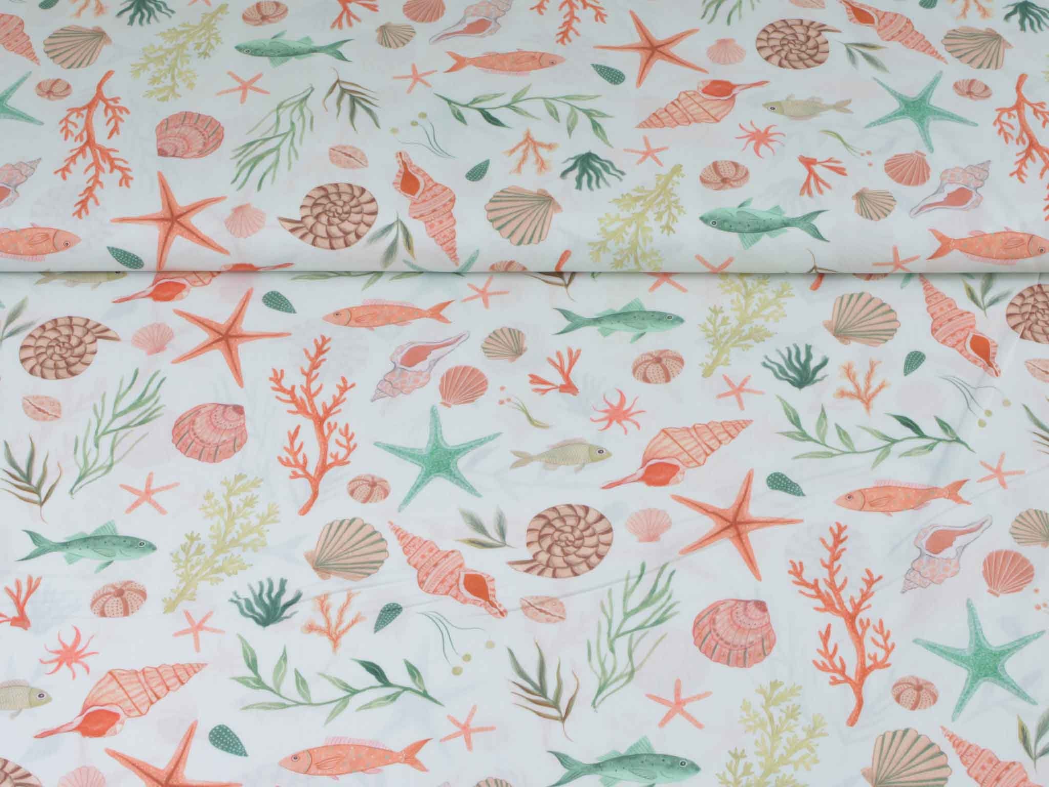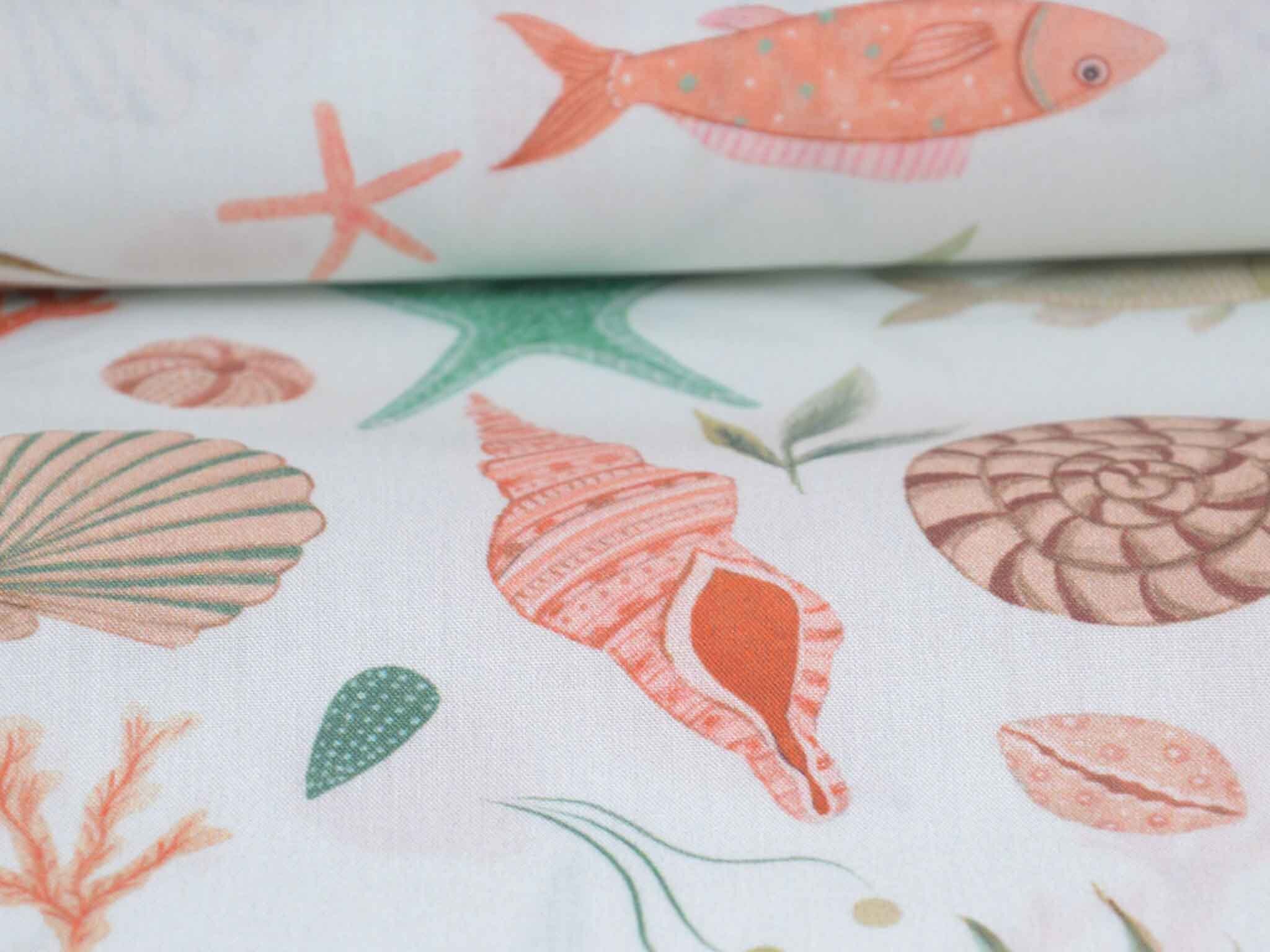 Hochwertiger Baumwoll-Popeline. Der maritime Stoff zeigt Muscheln und Fische. Er ist glatt und matt. Nähe dir aus dem Popeline Kleider, Röcke und Hemden. Der Stoff eignet sich auch zum Nähen von Kissen, Utensilos, Taschen und vielem mehr.