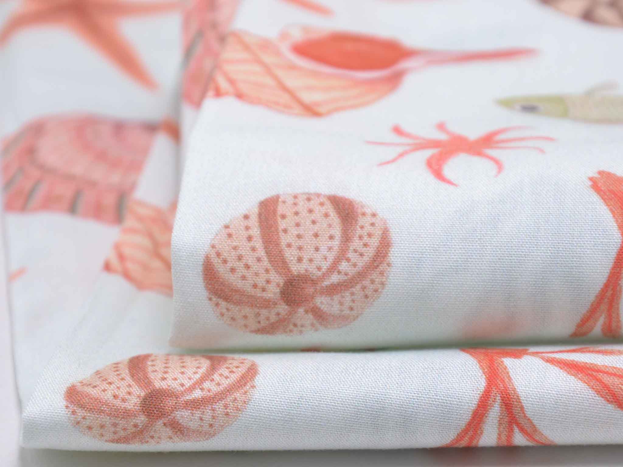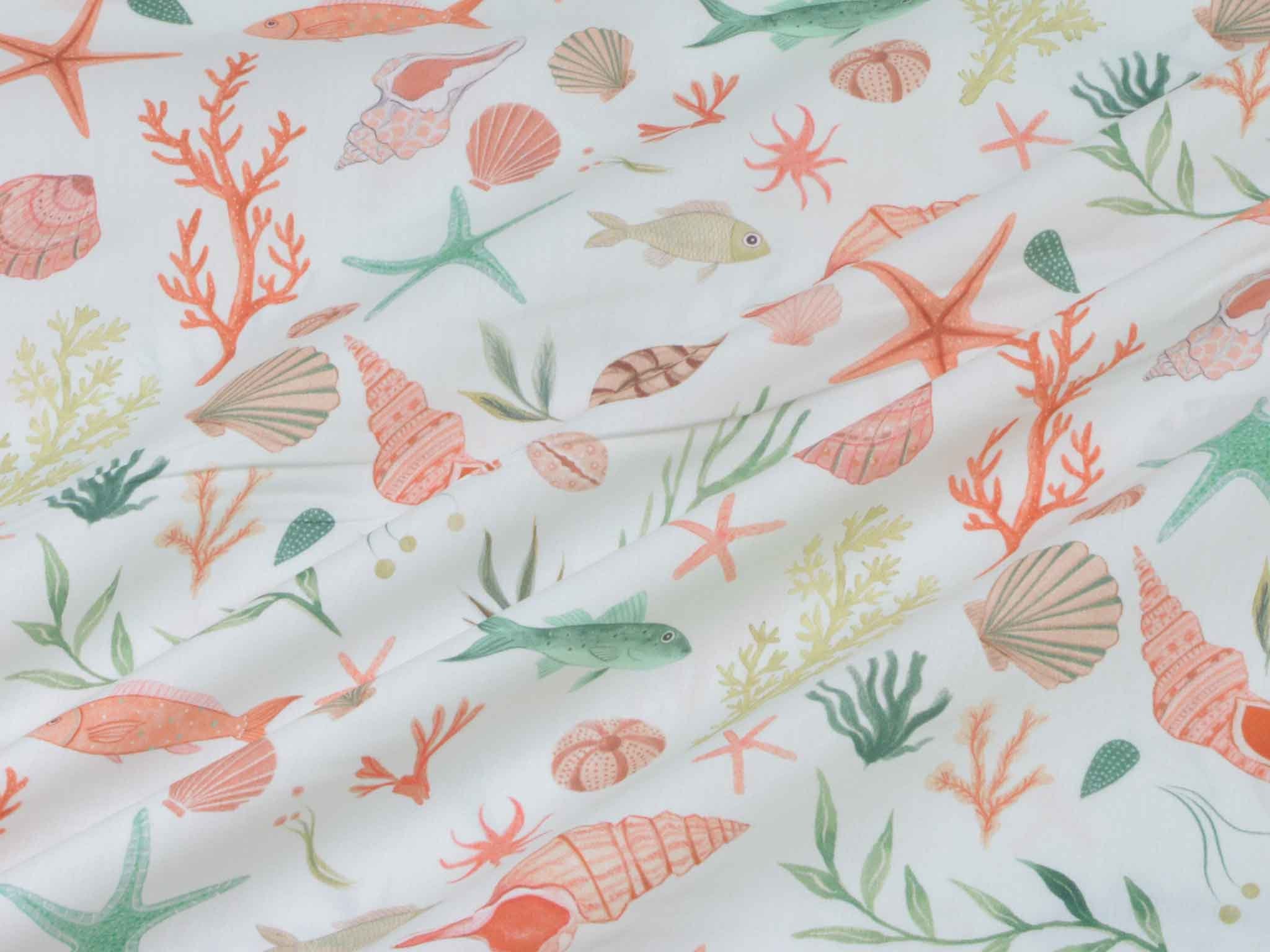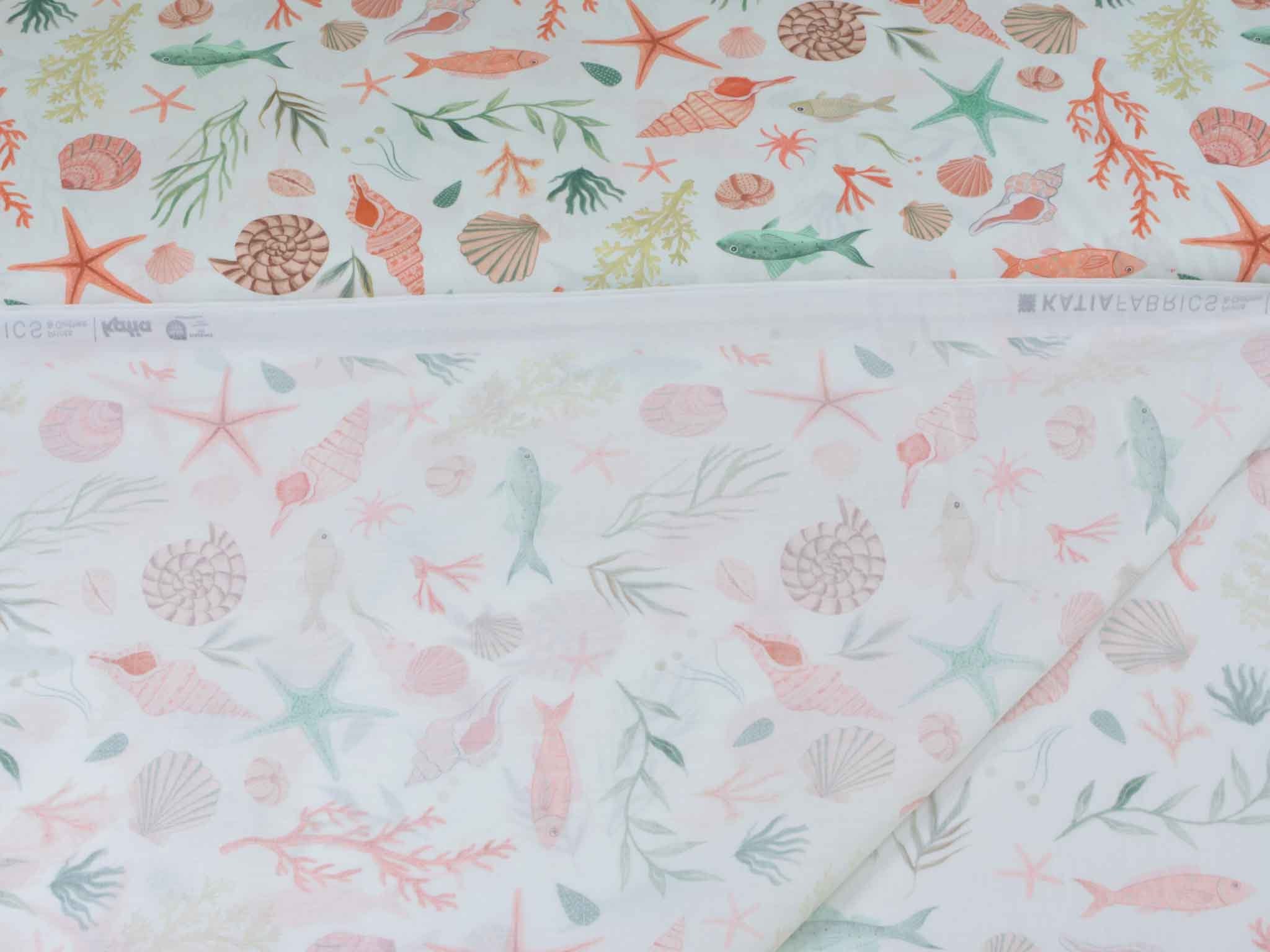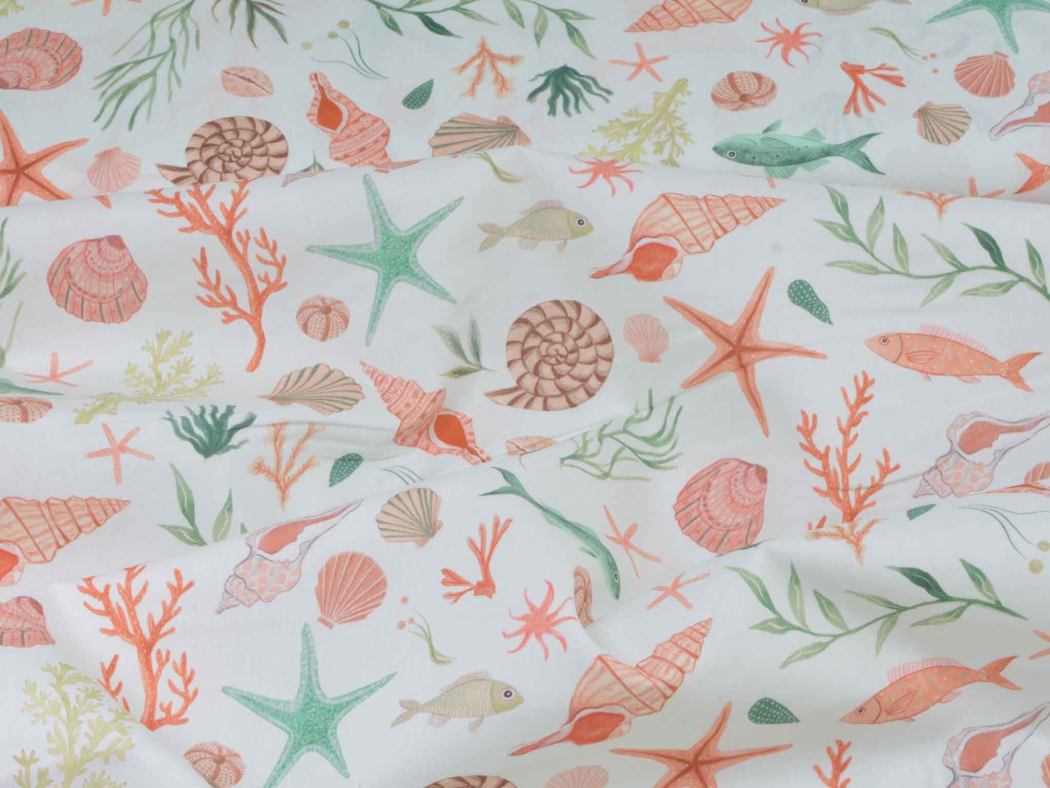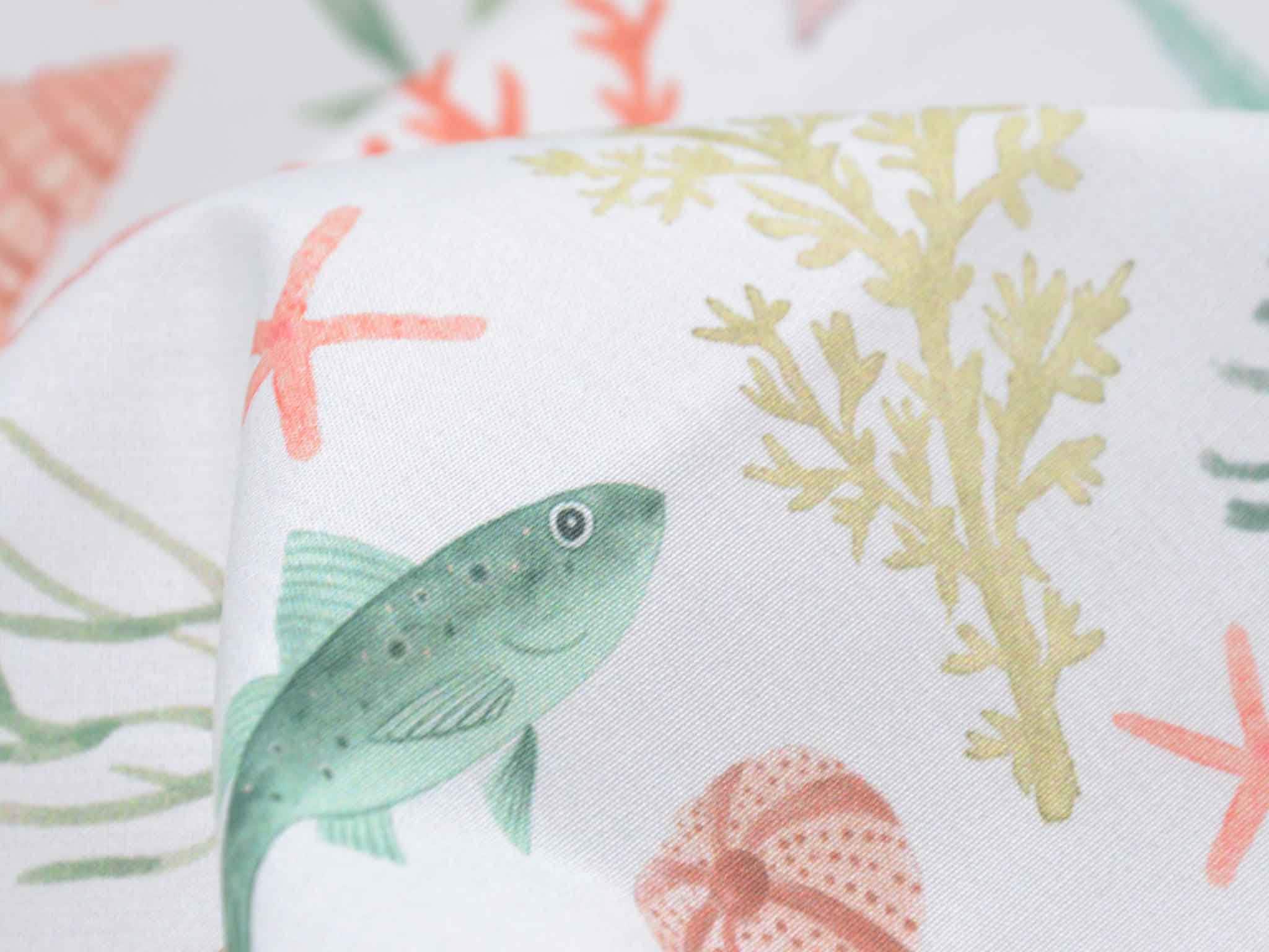 Hochwertiger Baumwoll-Popeline. Der maritime Stoff zeigt Muscheln und Fische. Er ist glatt und matt. Nähe dir aus dem Popeline Kleider, Röcke und Hemden. Der Stoff eignet sich auch zum Nähen von Kissen, Utensilos, Taschen und vielem mehr.