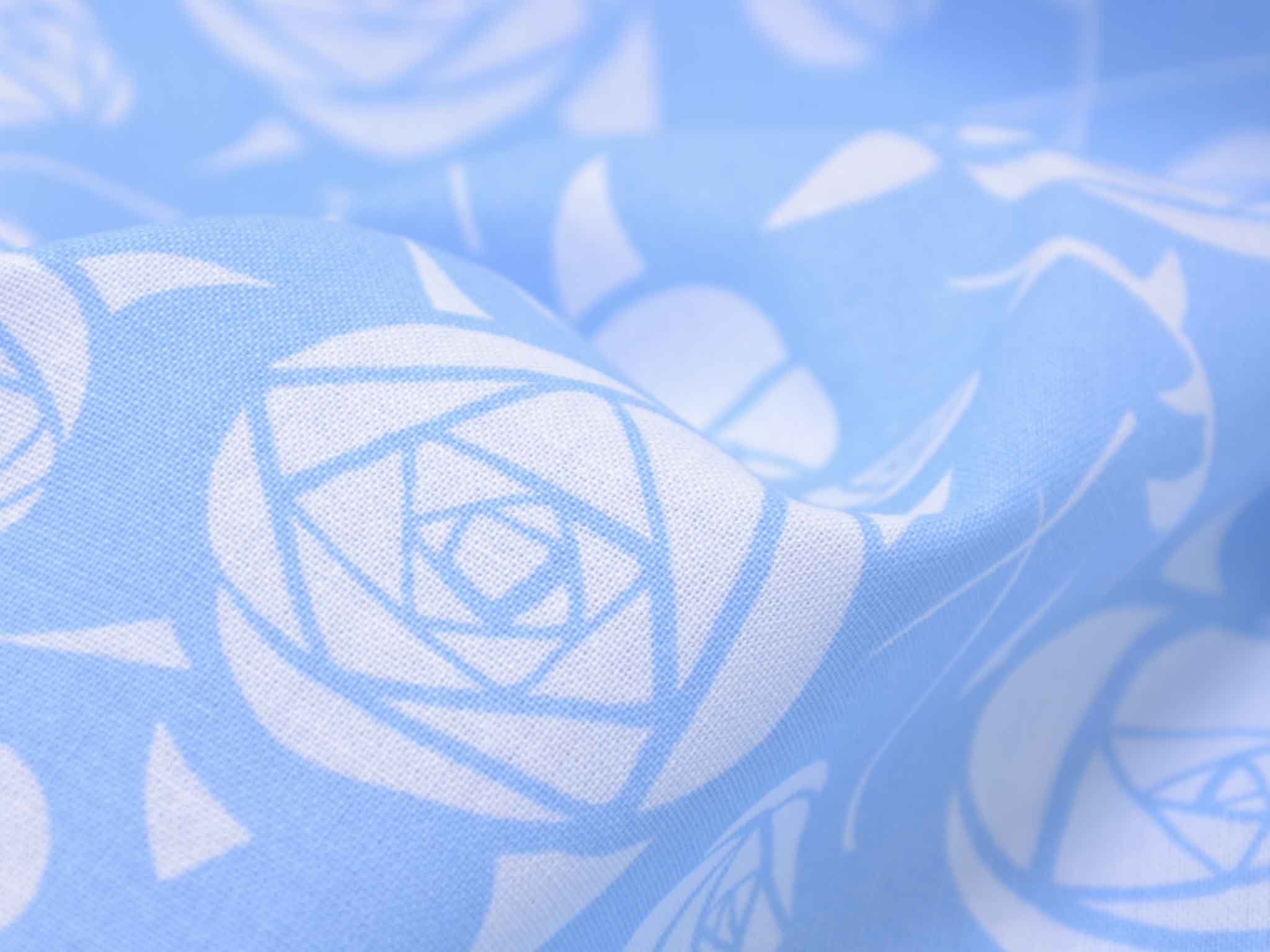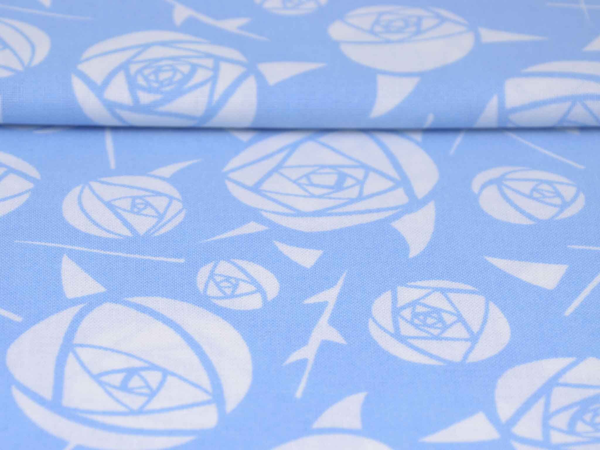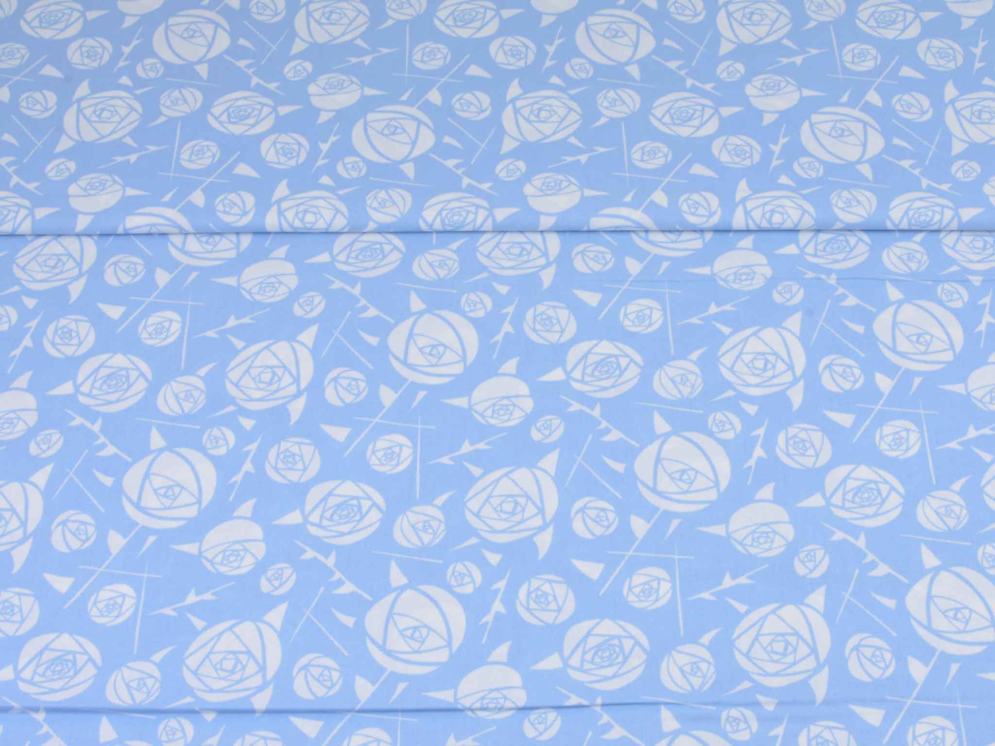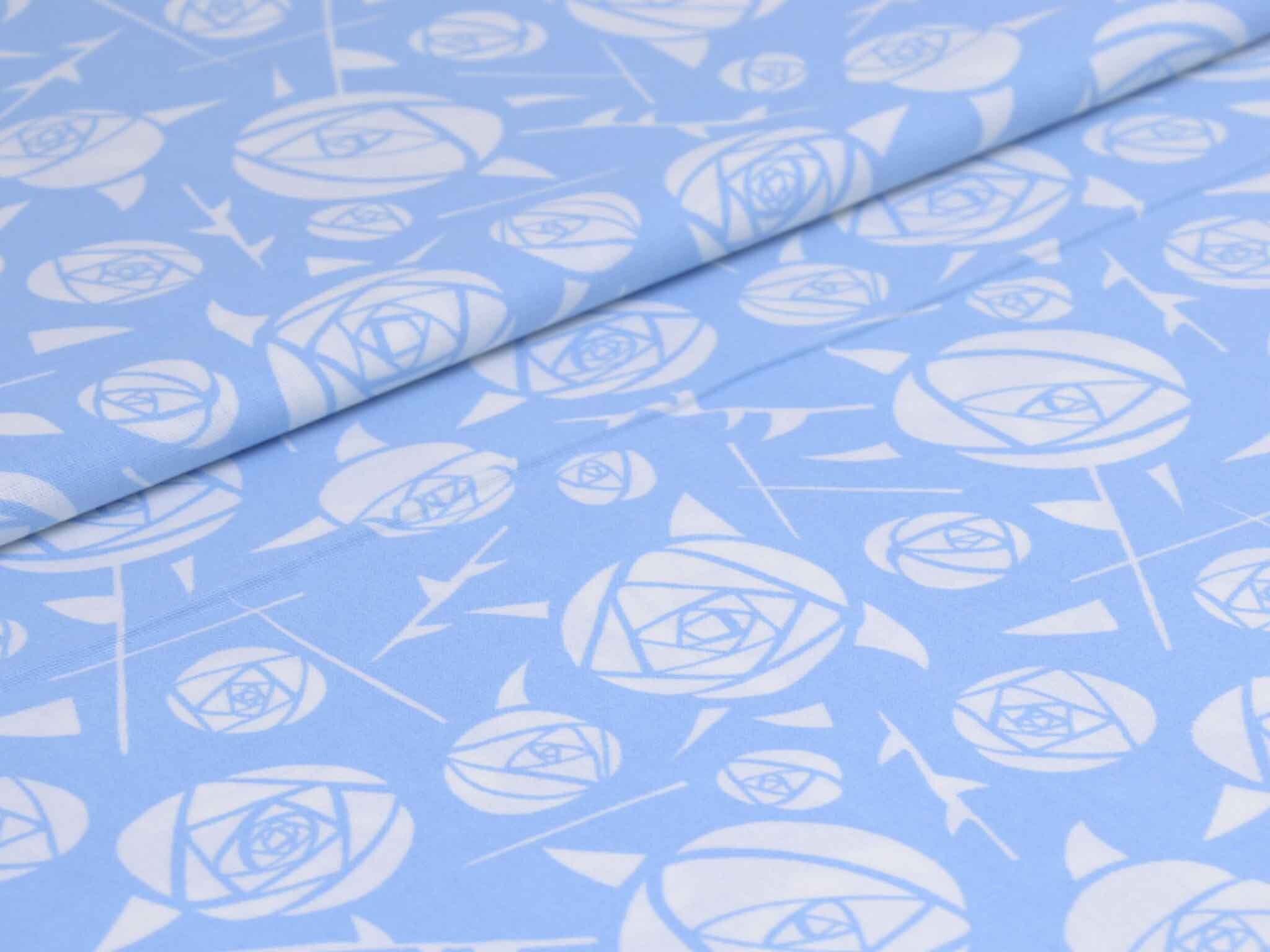 Sehr hochwertiger Webstoff aus Baumwolle von Westfalenstoffe. Der Stoff ist hellblau mit weißen Rosen. Er ist glatt und matt. Nähe daraus Blusen, Kleider, Röcke, Kissen, Taschen und vieles mehr. Der Stoff ist made in Germany.