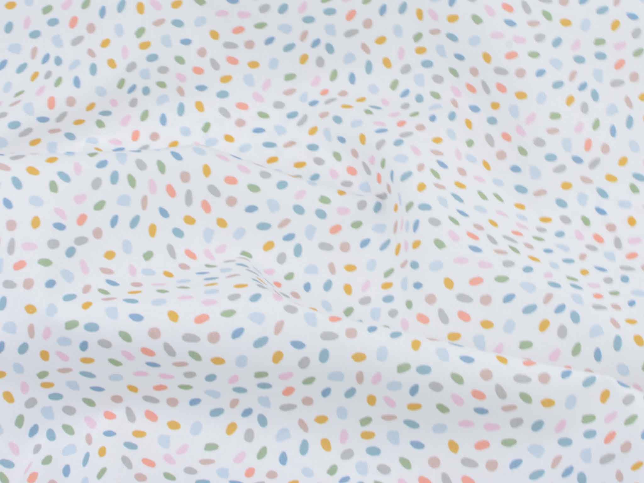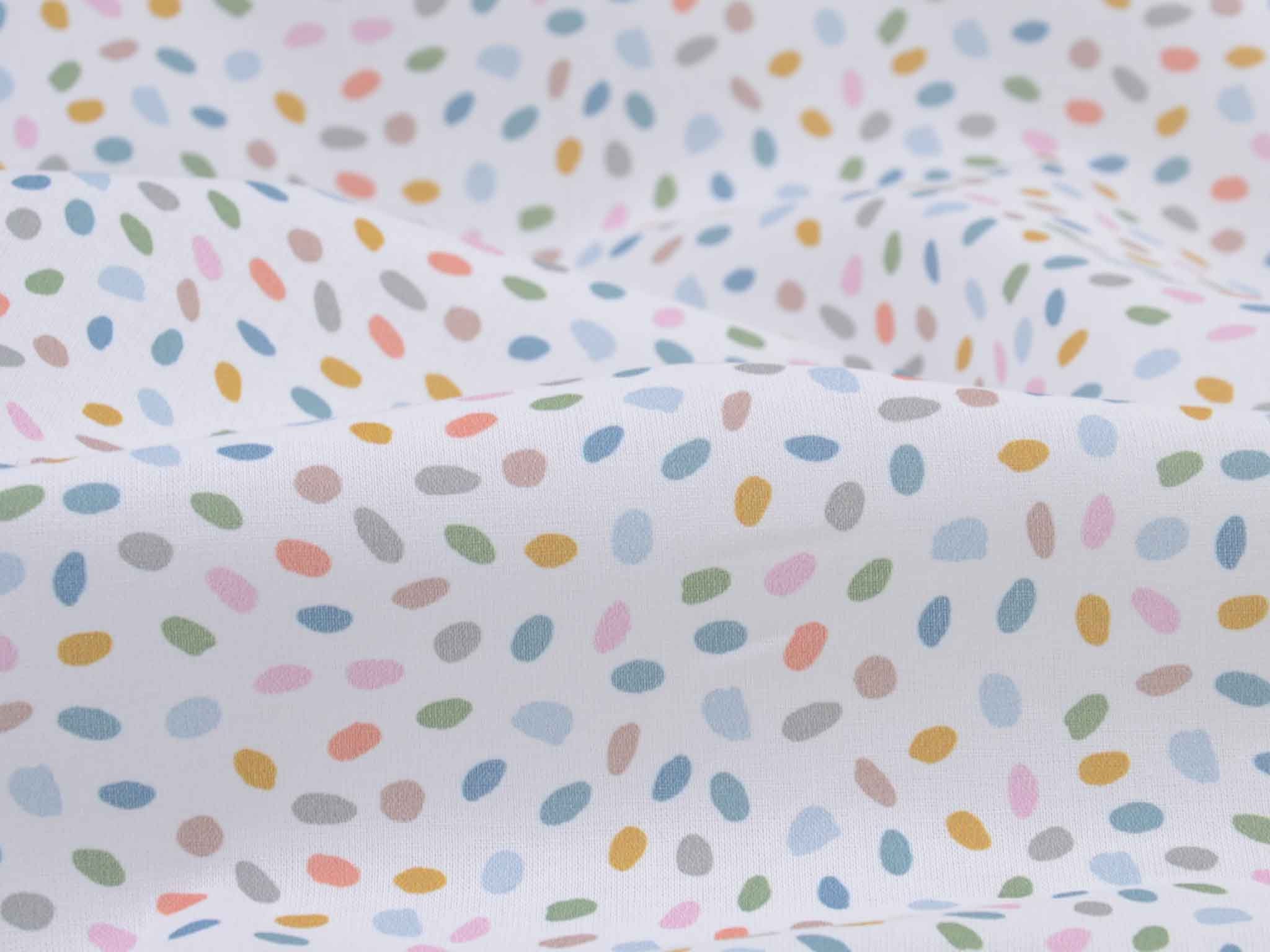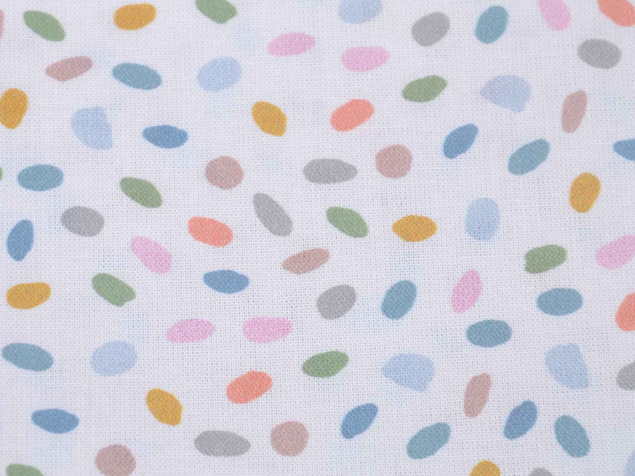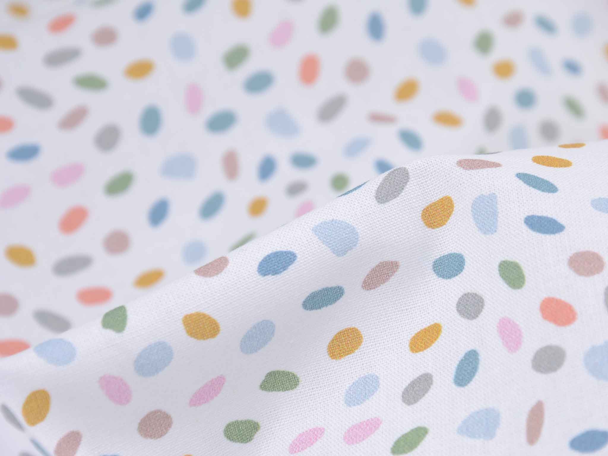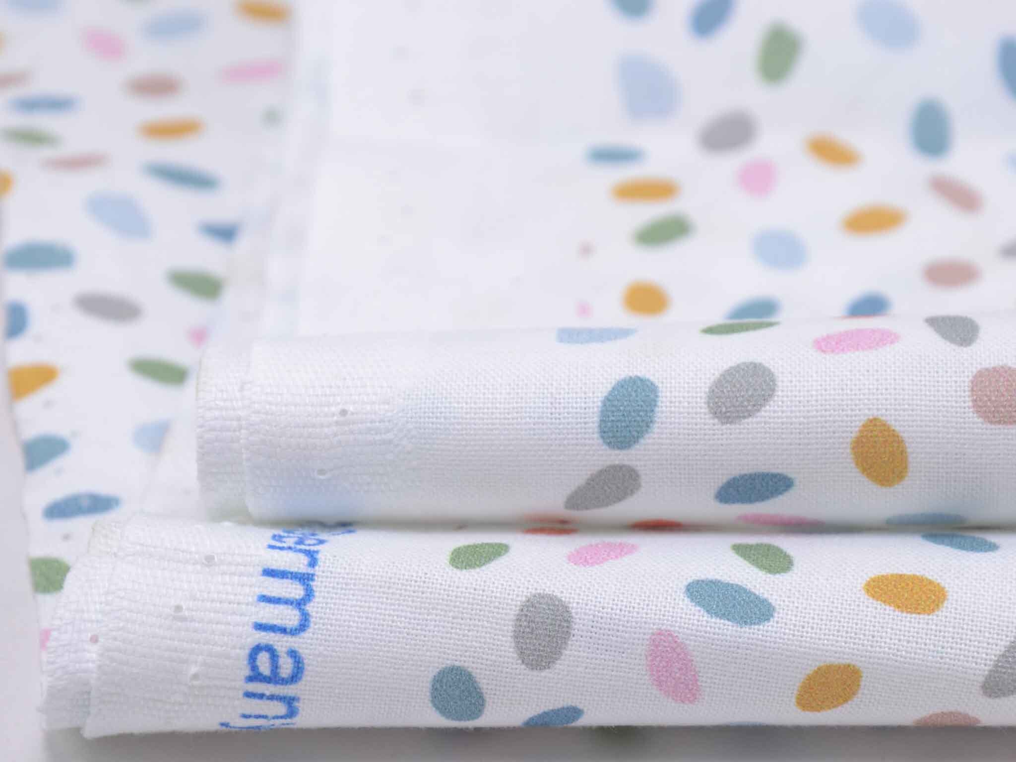 Sehr hochwertiger Webstoff aus Baumwolle von Westfalenstoffe. Der Digitaldruckstoff ist weiß mit kleinen, bunten Eiern / Punkten. Er ist glatt und matt. Nähe daraus Blusen, Kleider, Röcke, Kissen, Taschen und vieles mehr. Der Stoff ist made in Germany.