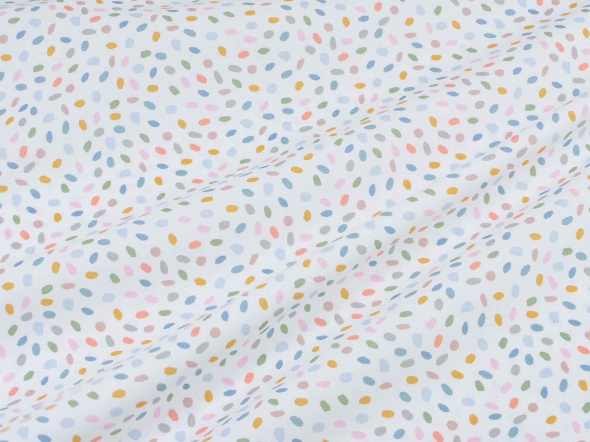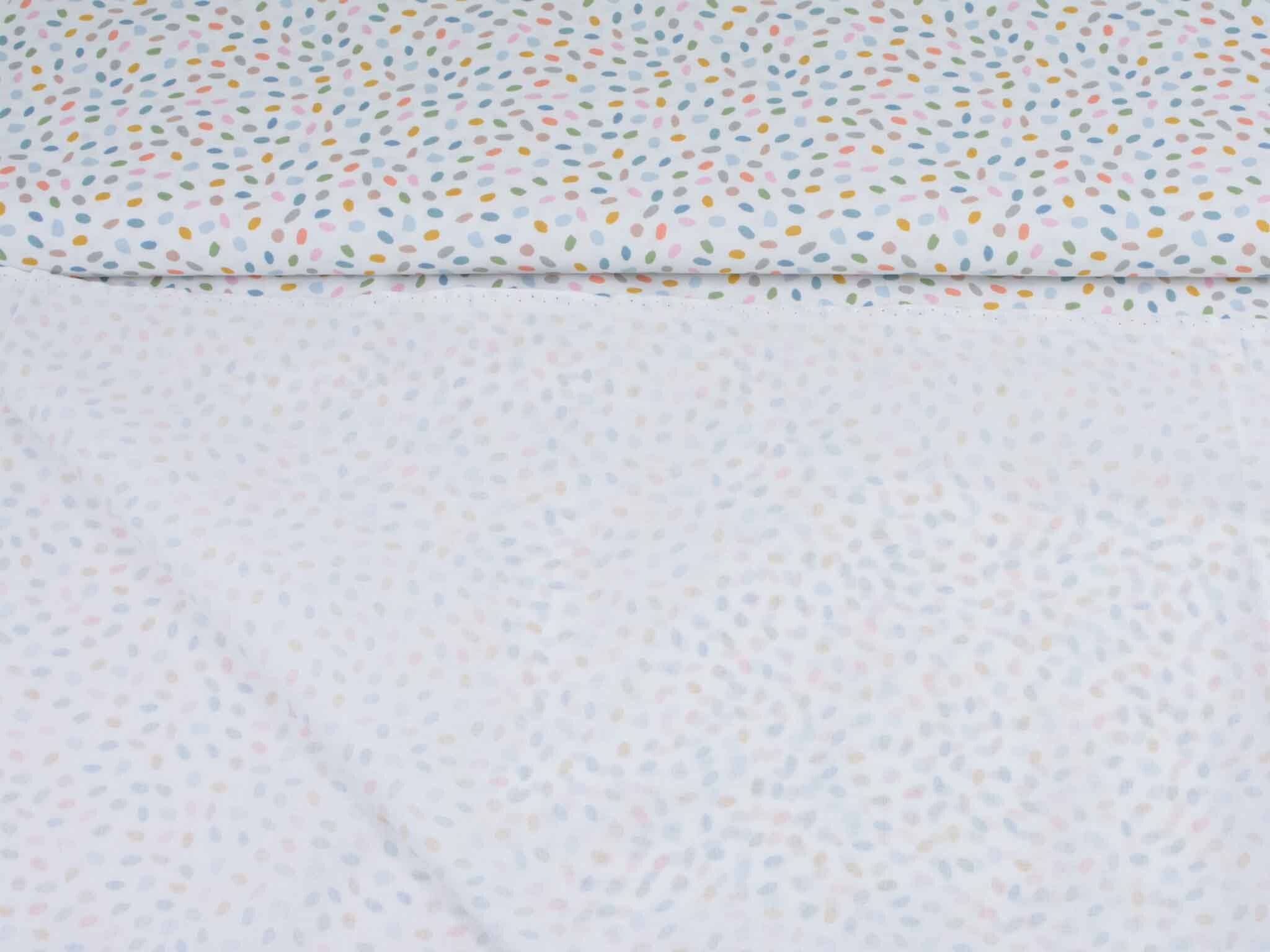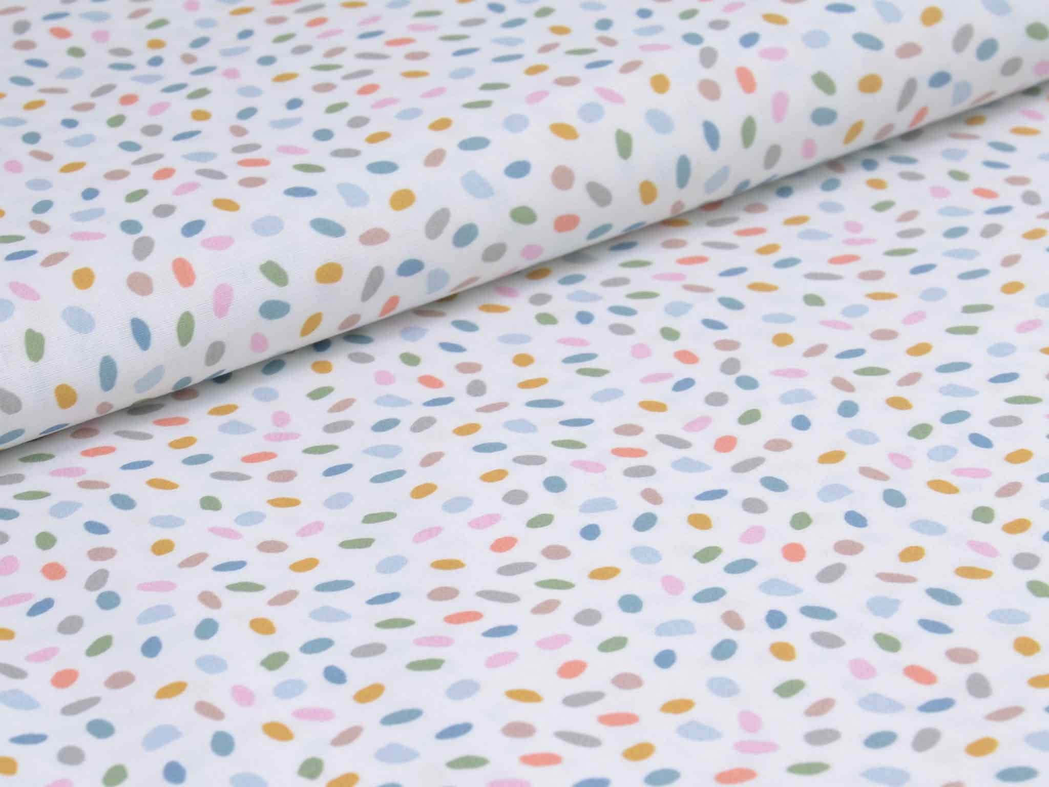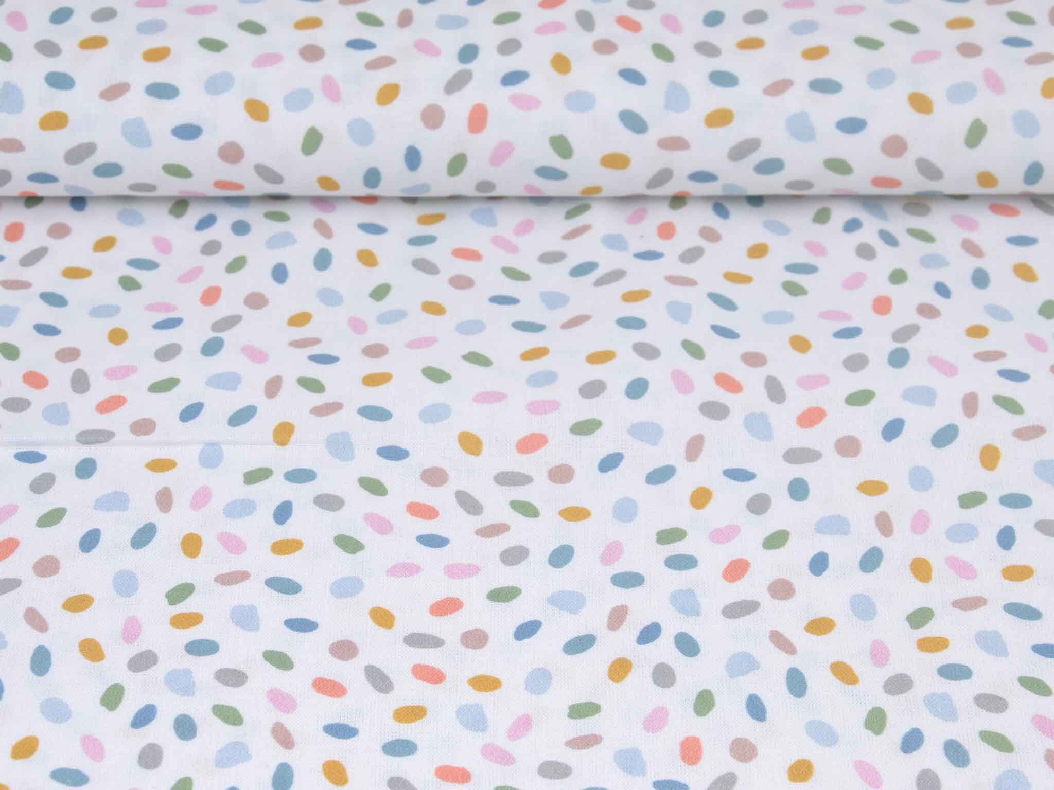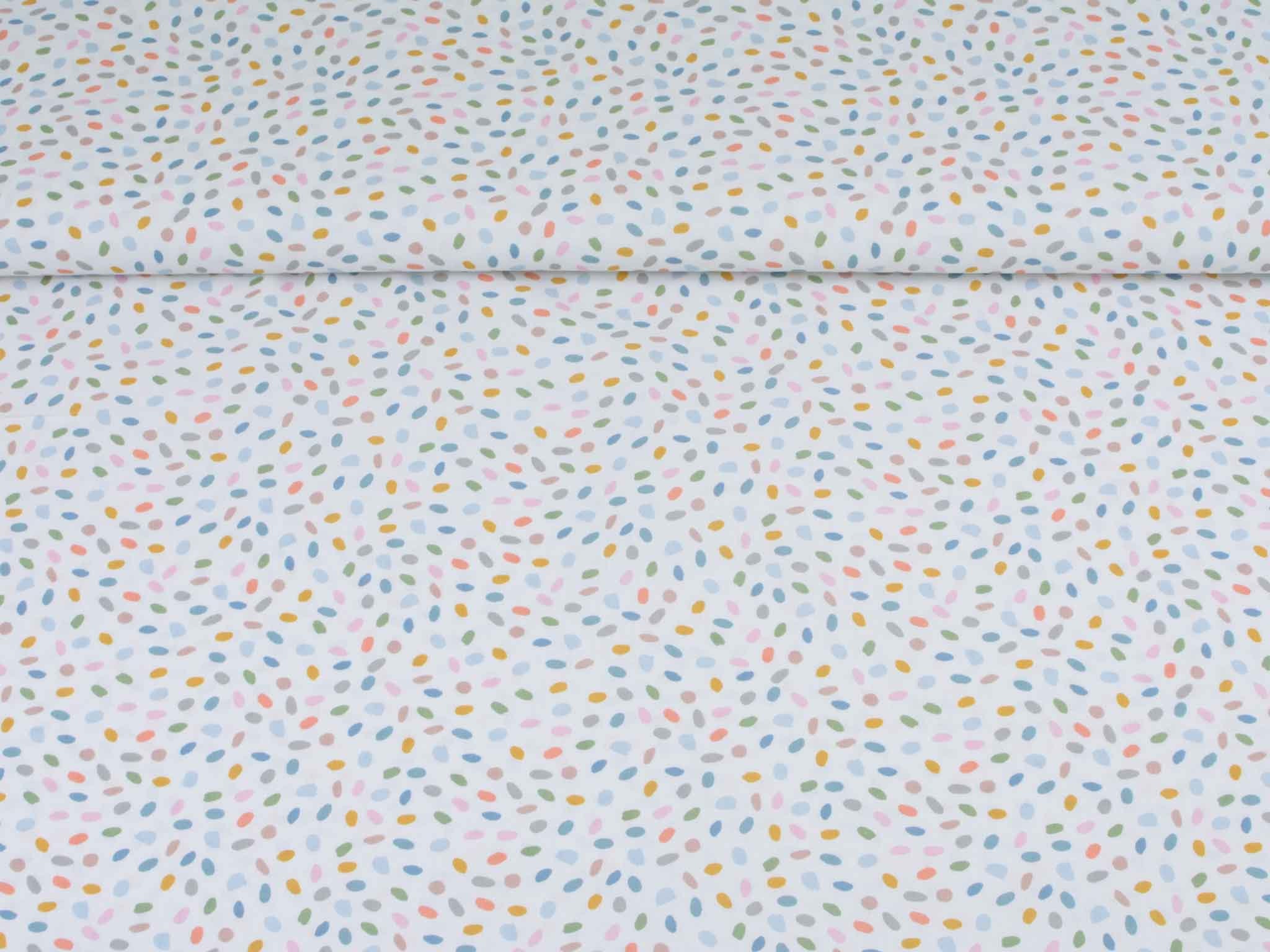 Sehr hochwertiger Webstoff aus Baumwolle von Westfalenstoffe. Der Digitaldruckstoff ist weiß mit kleinen, bunten Eiern / Punkten. Er ist glatt und matt. Nähe daraus Blusen, Kleider, Röcke, Kissen, Taschen und vieles mehr. Der Stoff ist made in Germany.