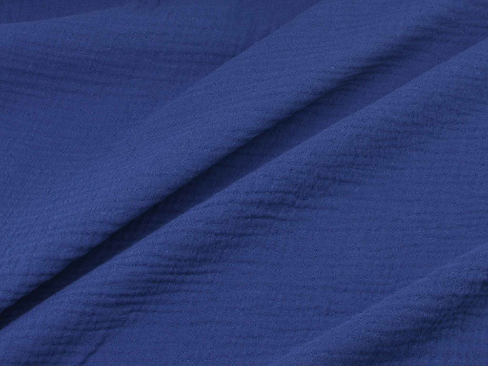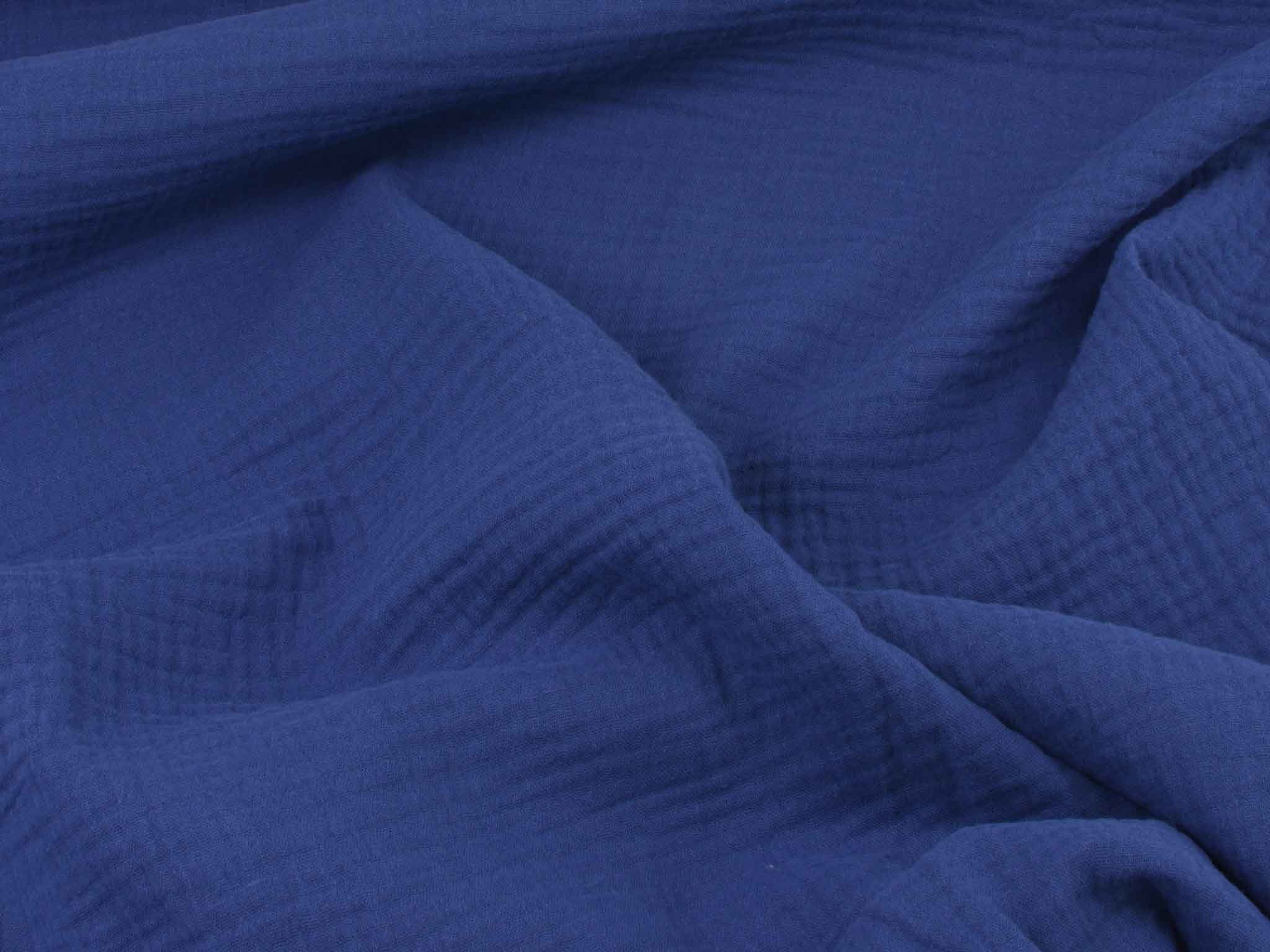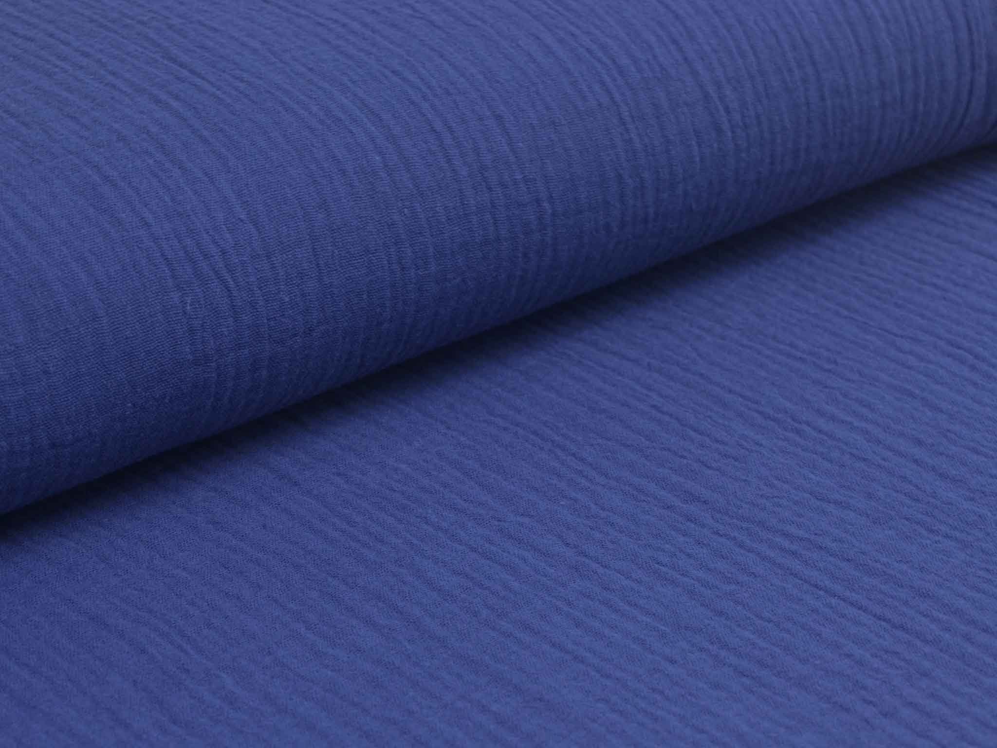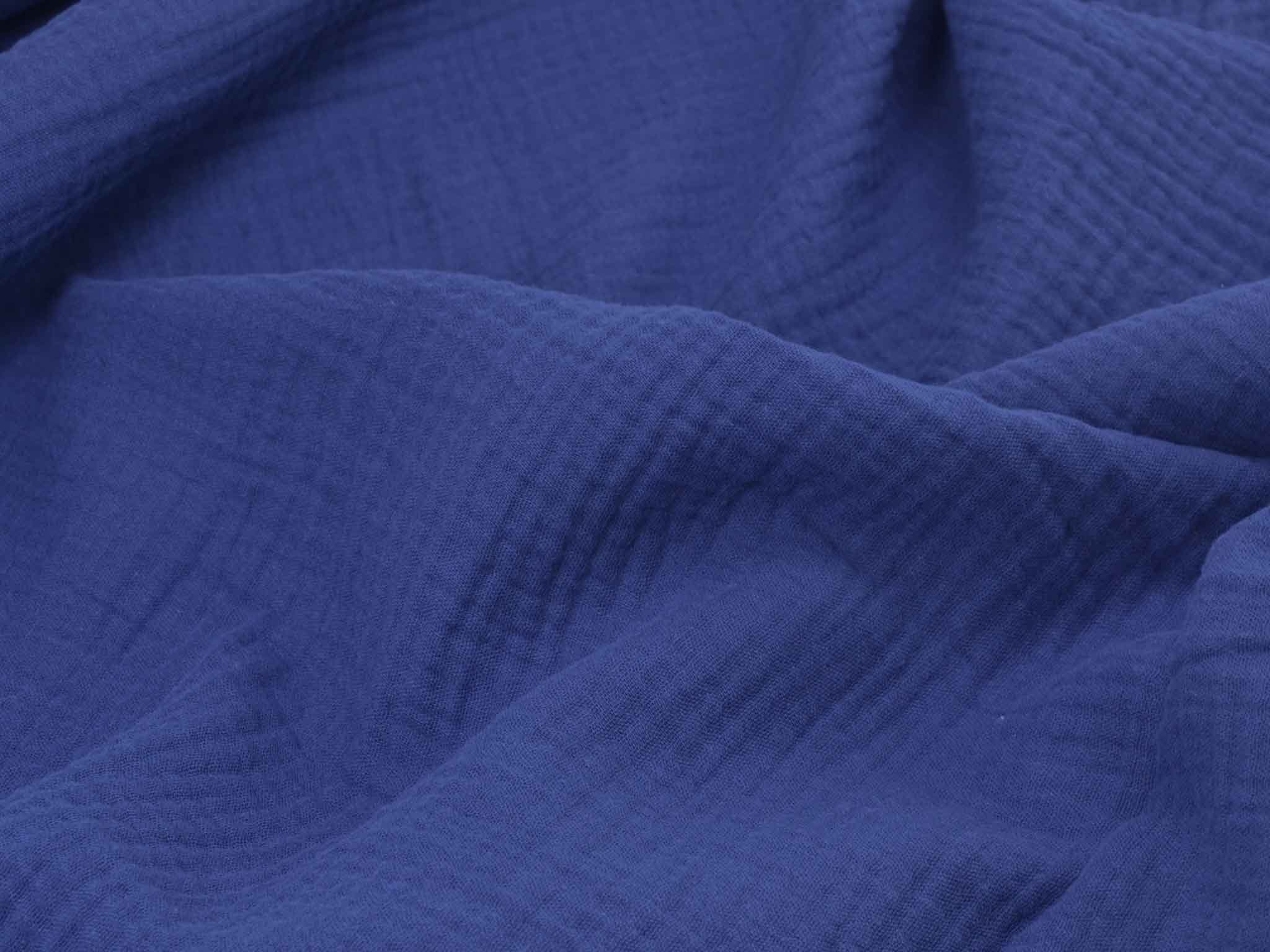 Hochwertiger Musselin aus Baumwolle. Der zweilagige Stoff in einfarbig dunkelblau. Musselin hat einen weichen Fall und fühlt sich auf der Haut gut an. Du kannst Musseline wunderbar miteinander kombinieren. Nähe dir zum Beispiel Blusen, Kleider, Röcke, Kissen, Tagesdecken, Tücher und so so vieles mehr.