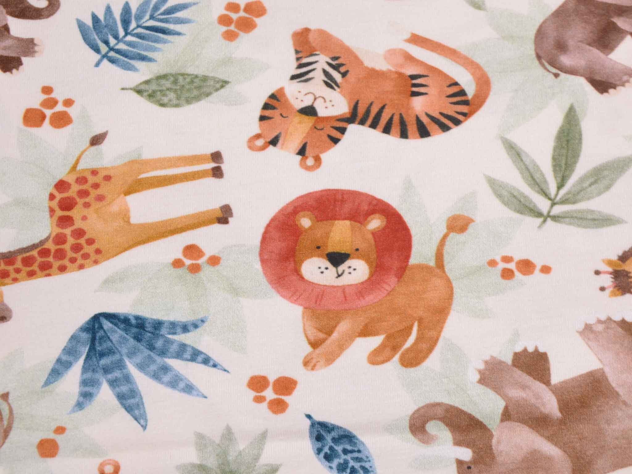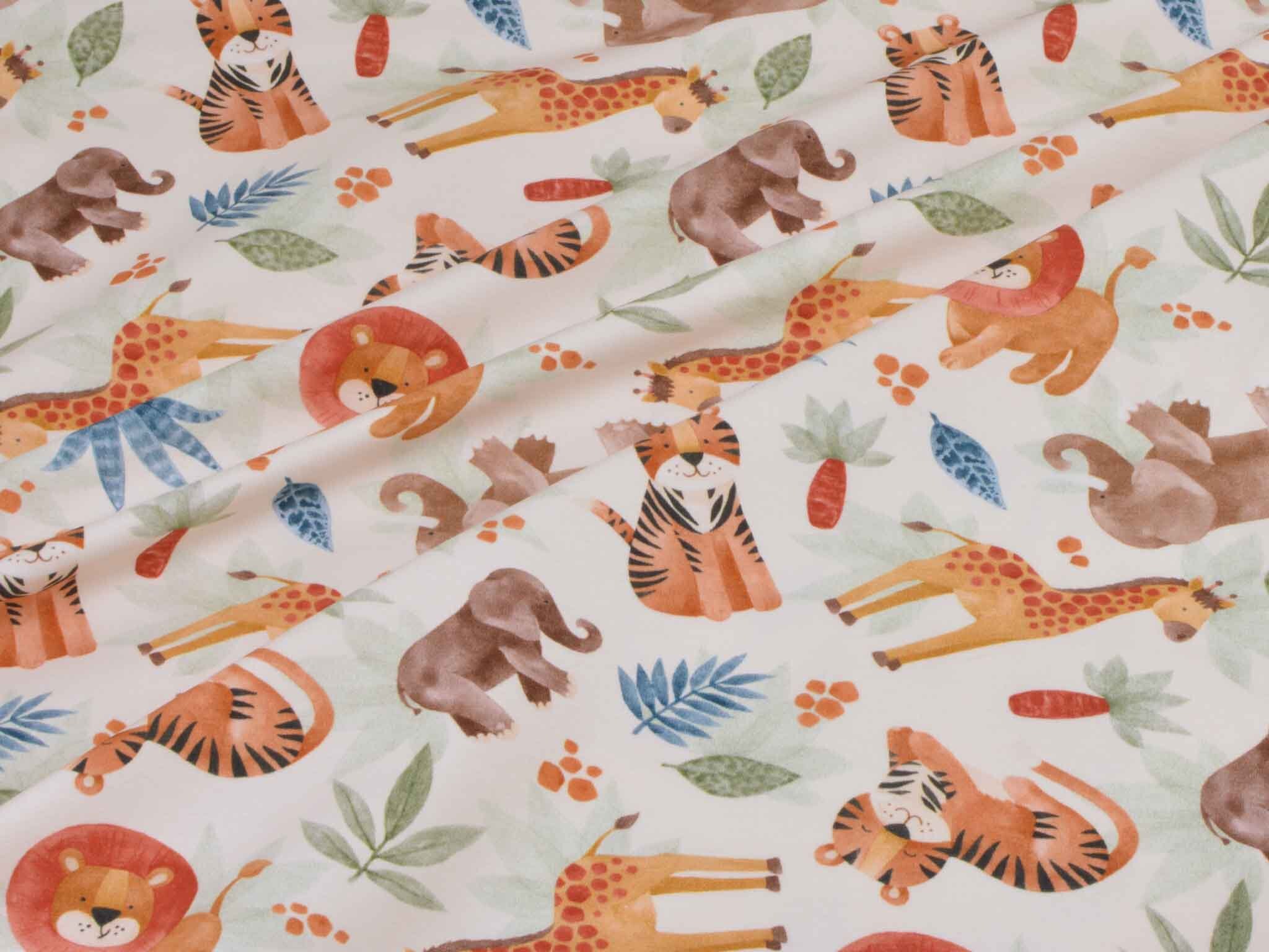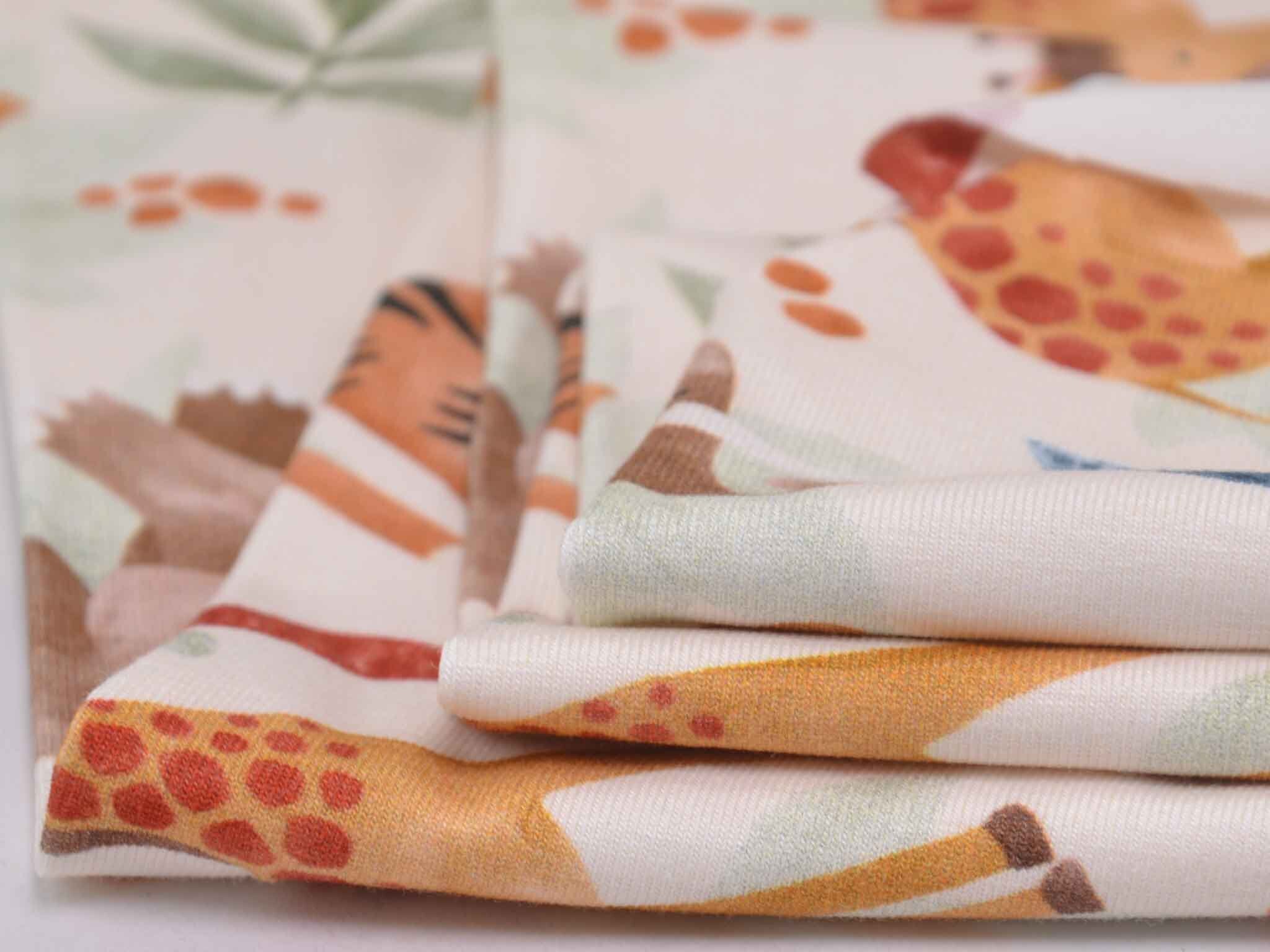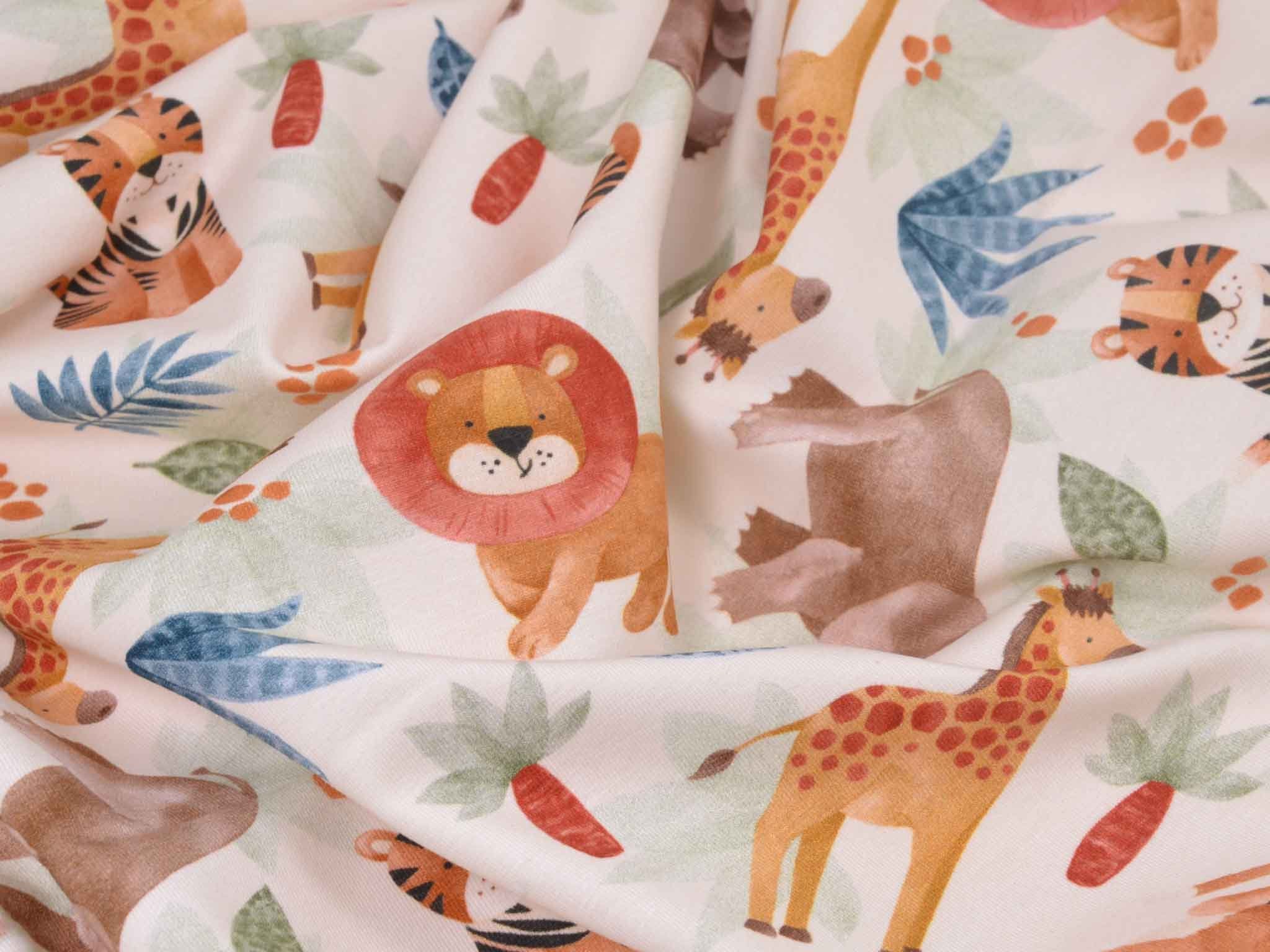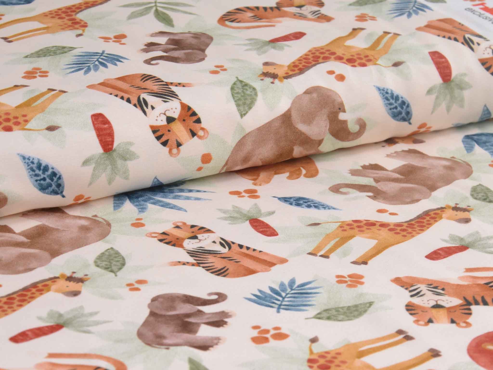 High-quality jersey from Hilco. This cotton jersey with safari animals is perfect for sewing T-shirts, dresses, bloomers, and much more. Each giraffe measures approximately 10.5 cm tall. The fabric is smooth, matte, and stretchy.