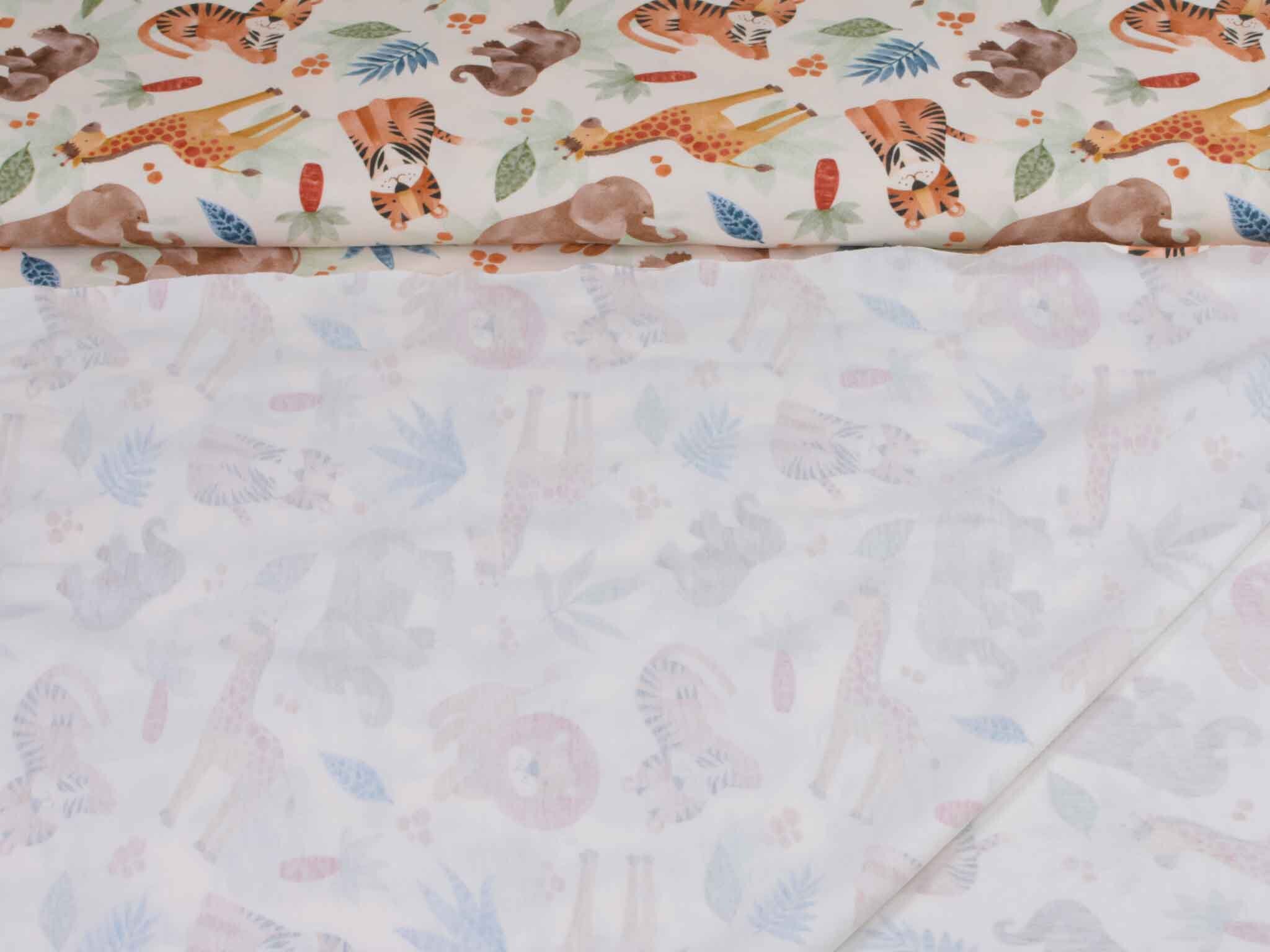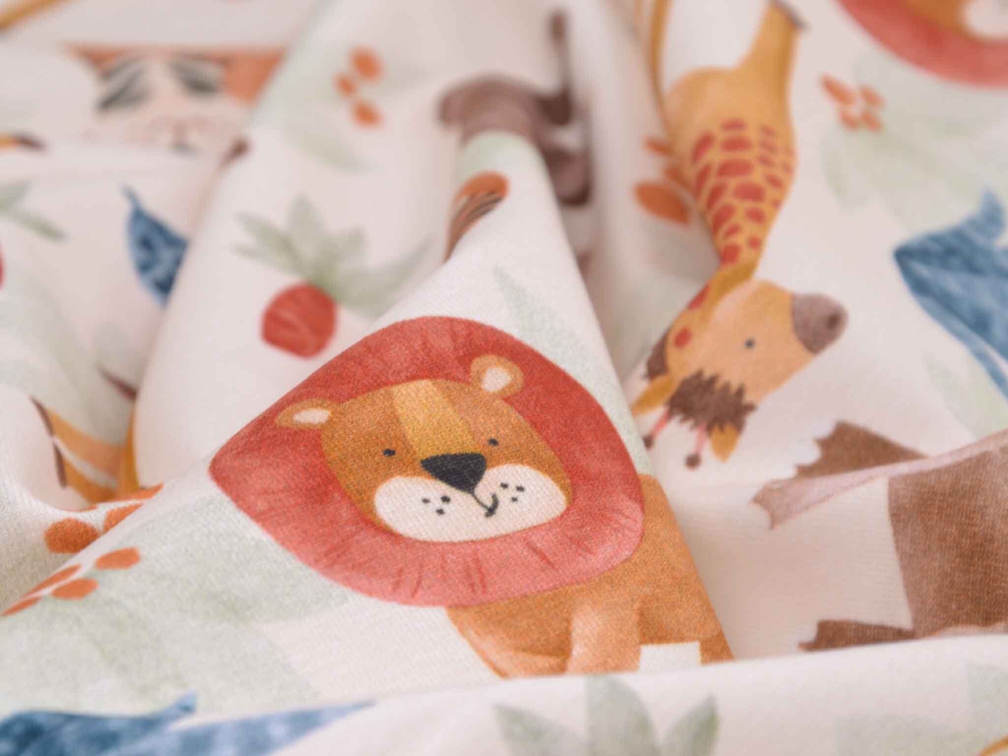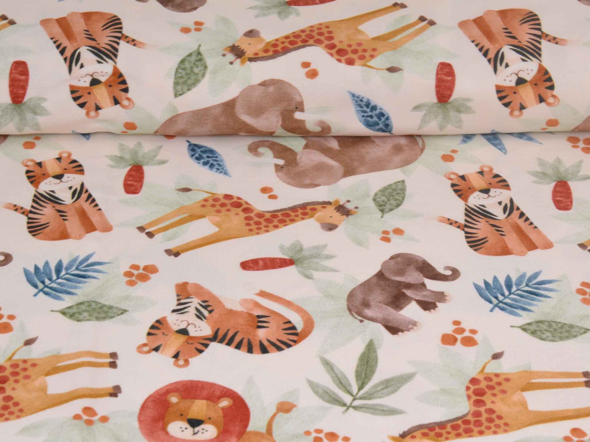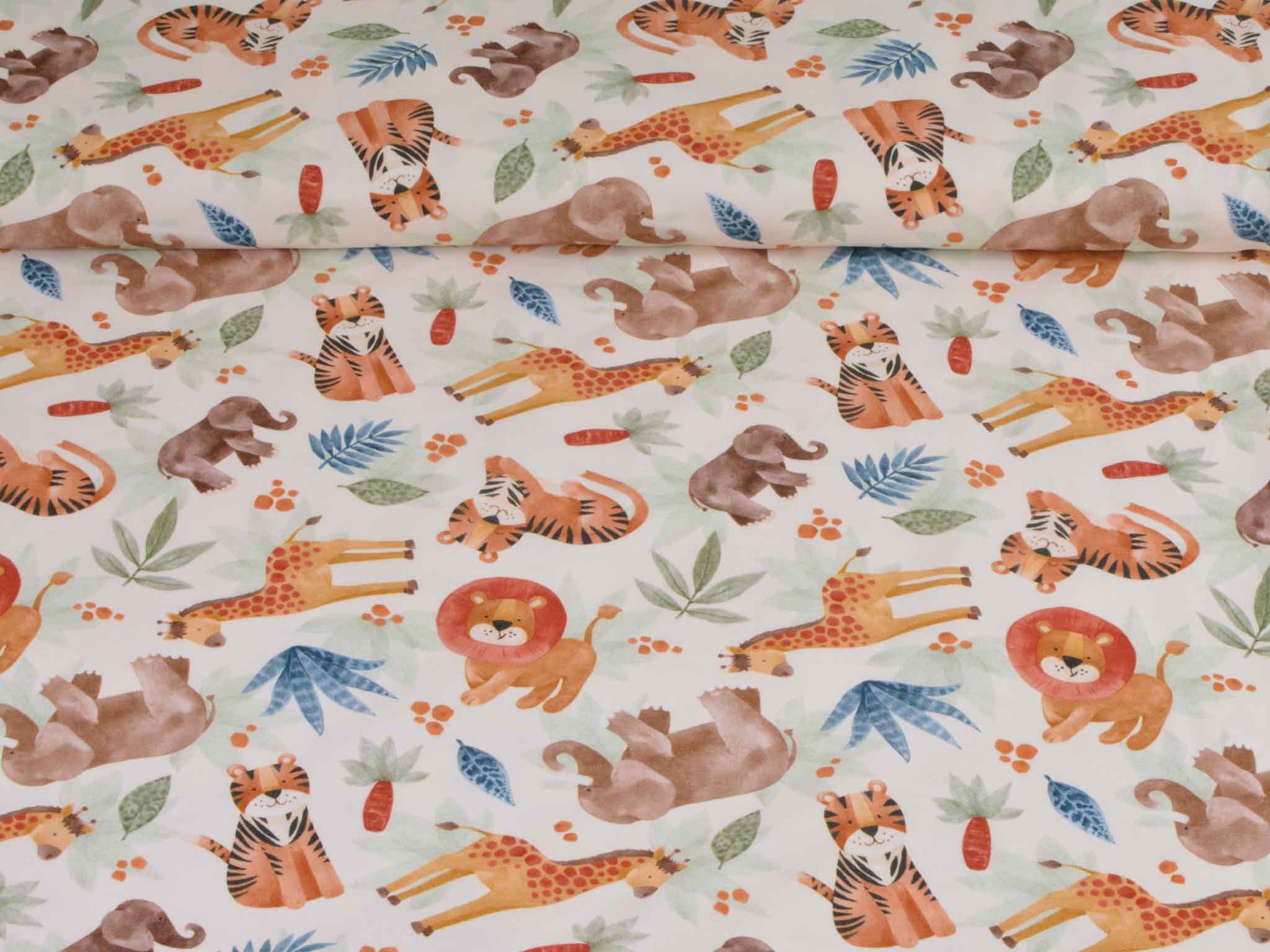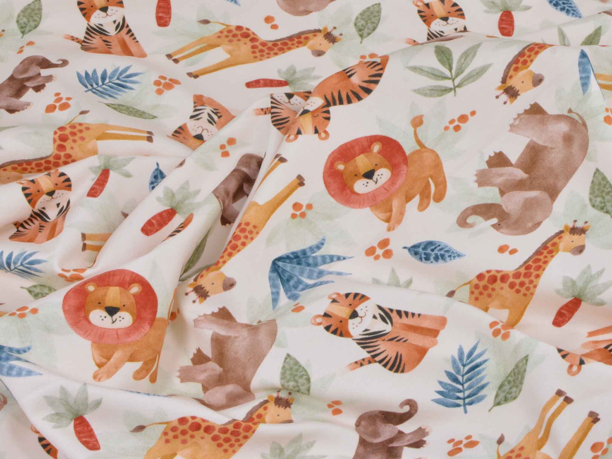 High-quality jersey from Hilco. This cotton jersey with safari animals is perfect for sewing T-shirts, dresses, bloomers, and much more. Each giraffe measures approximately 10.5 cm tall. The fabric is smooth, matte, and stretchy.