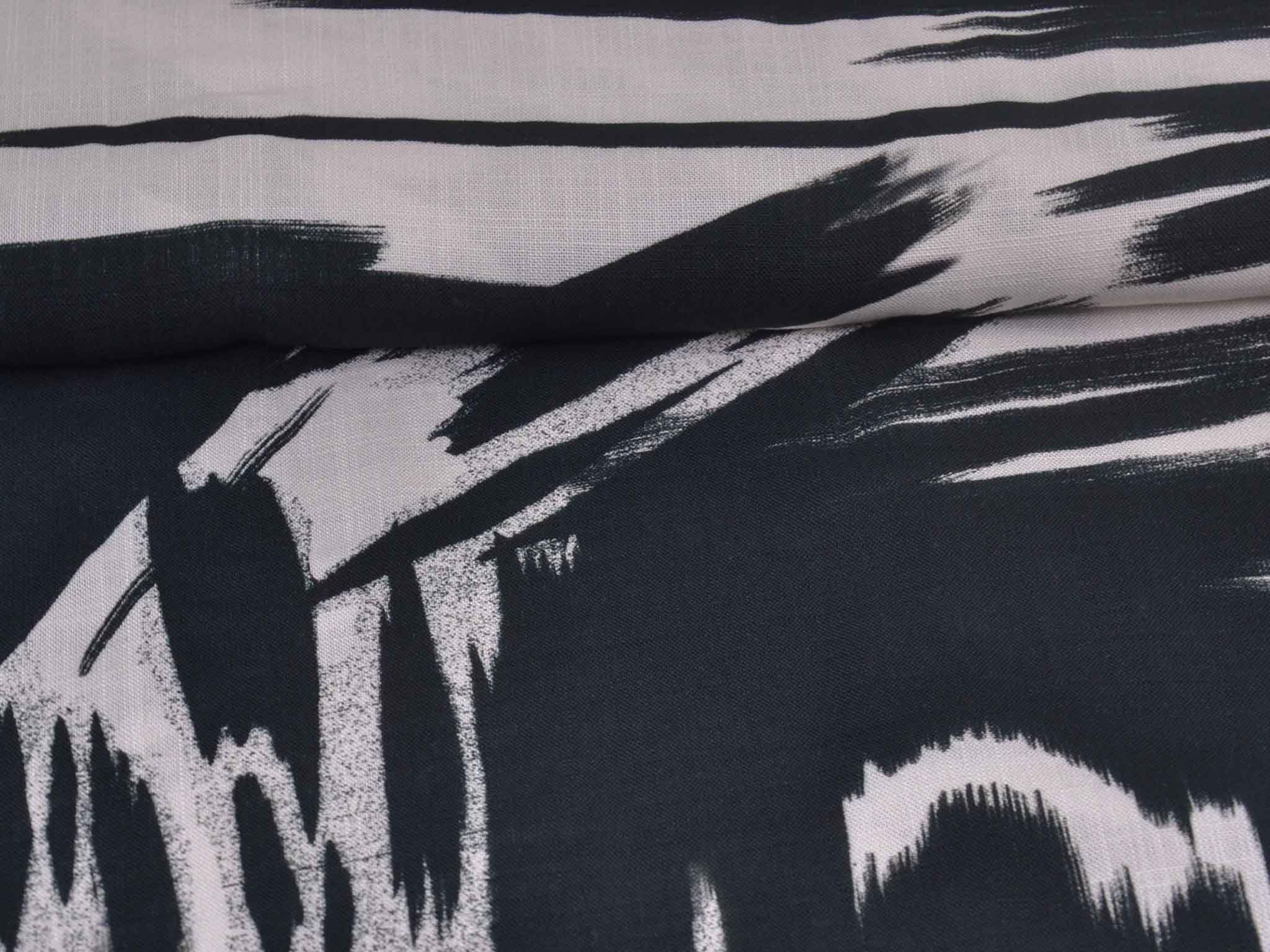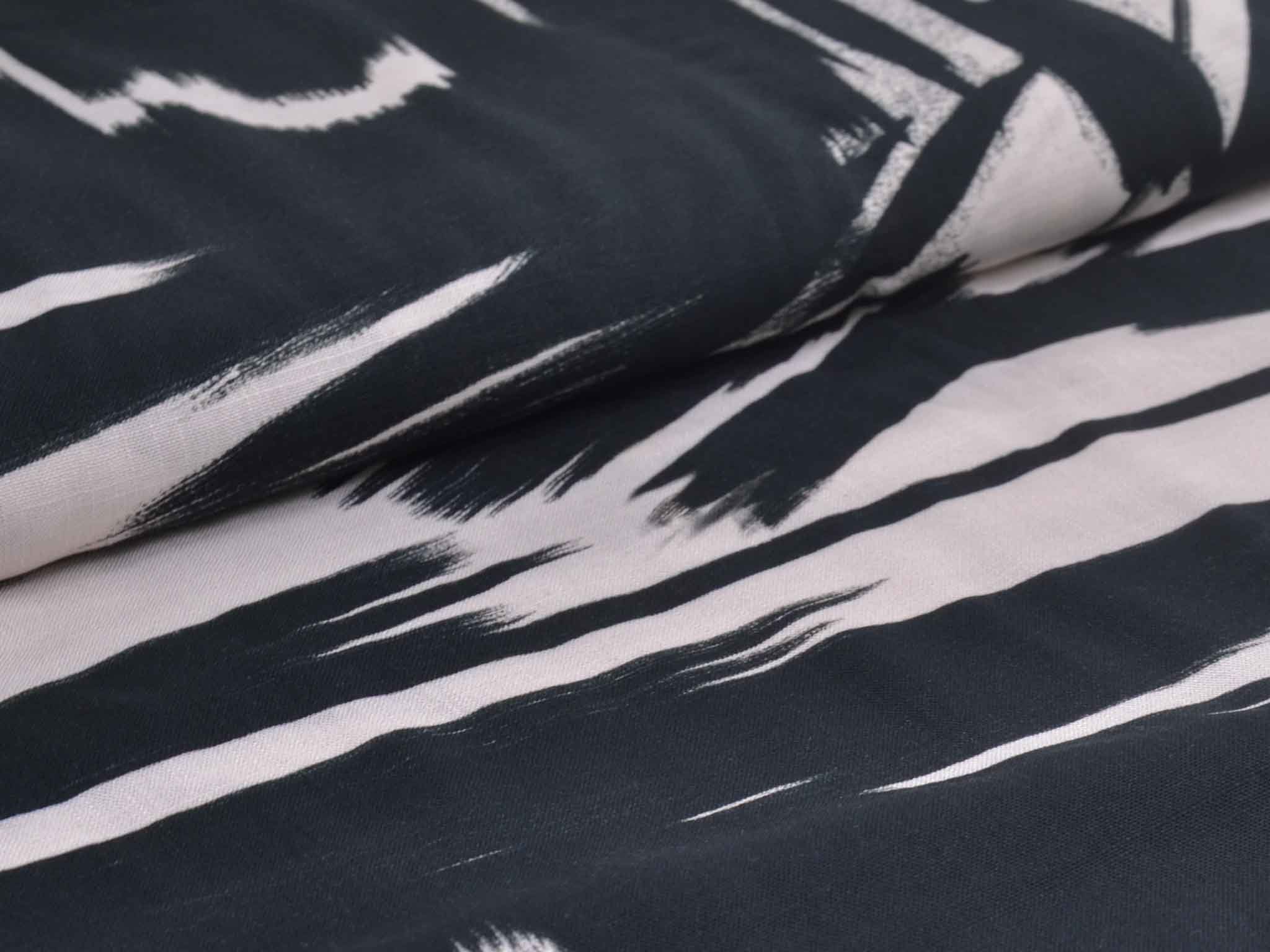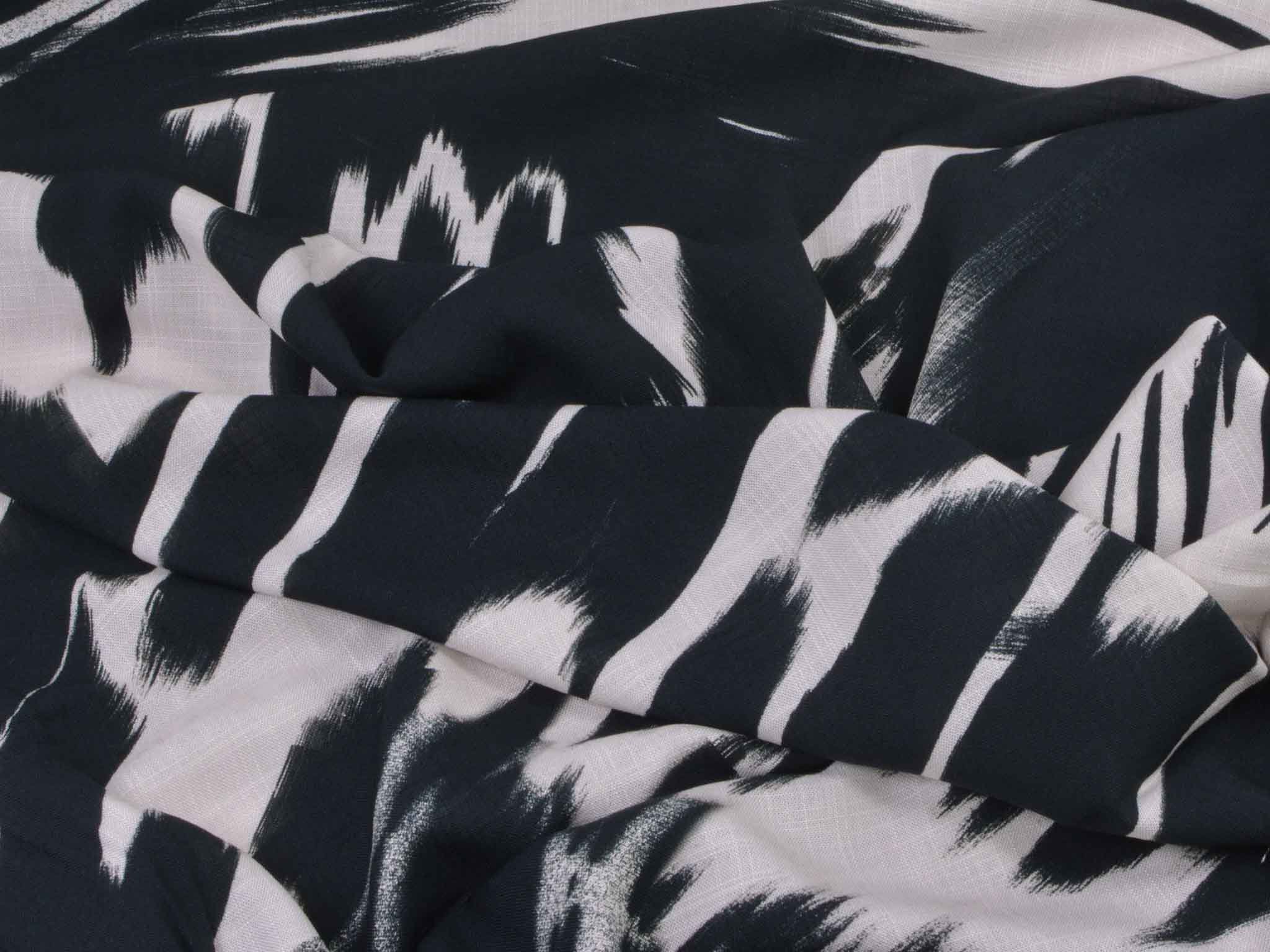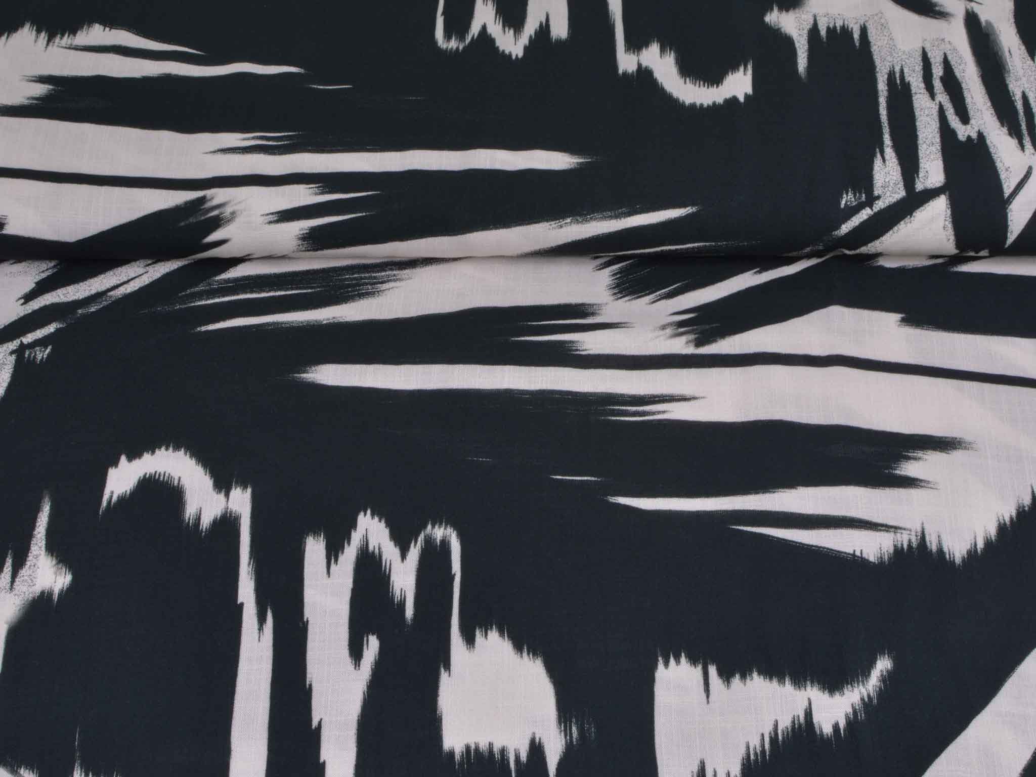 Hochwertige Webware aus dem Hause Hilco. Die Viskose mit schwarzen und creme-weißen Pinselstrichen eignet sich wunderbar zum Nähen von Blusen, Kleidern, fließenden Röcken und Hosen und vielem mehr. Der Stoff ist dünn und fällt fließend.