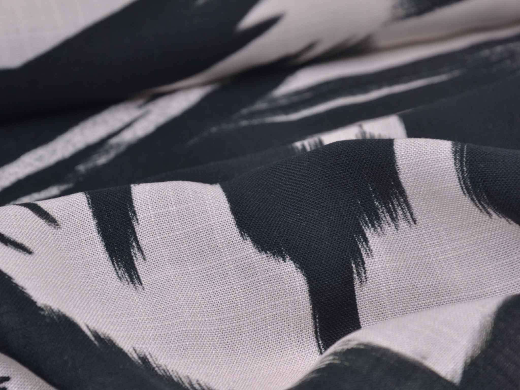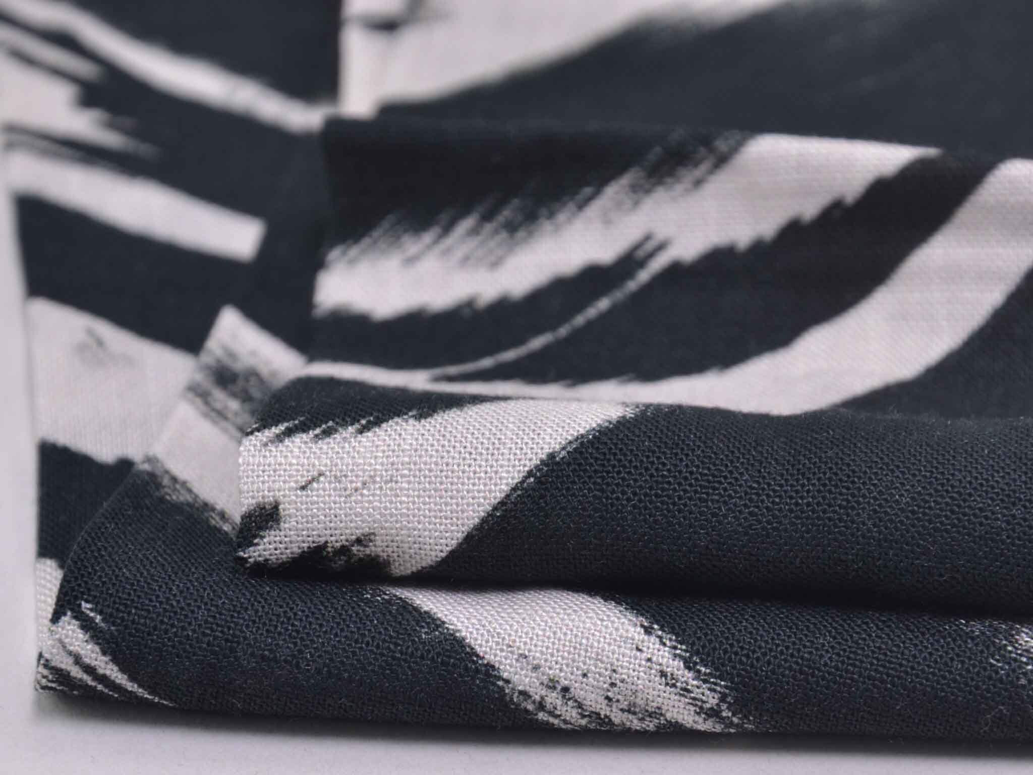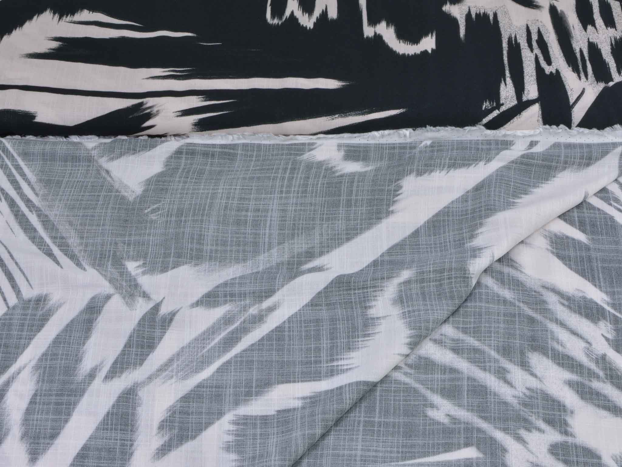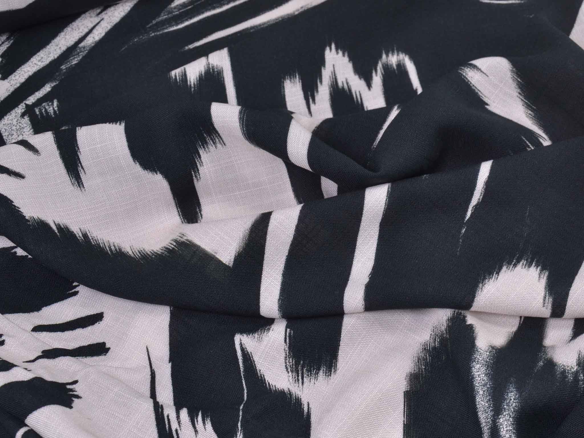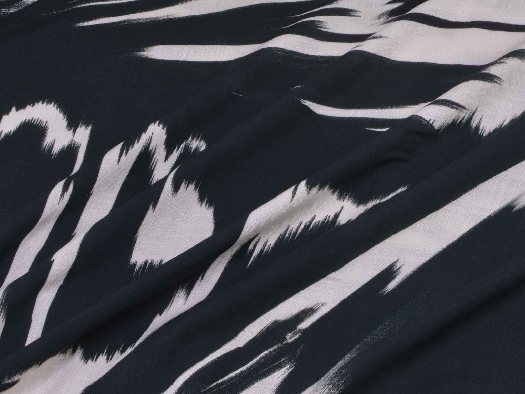 Hochwertige Webware aus dem Hause Hilco. Die Viskose mit schwarzen und creme-weißen Pinselstrichen eignet sich wunderbar zum Nähen von Blusen, Kleidern, fließenden Röcken und Hosen und vielem mehr. Der Stoff ist dünn und fällt fließend.