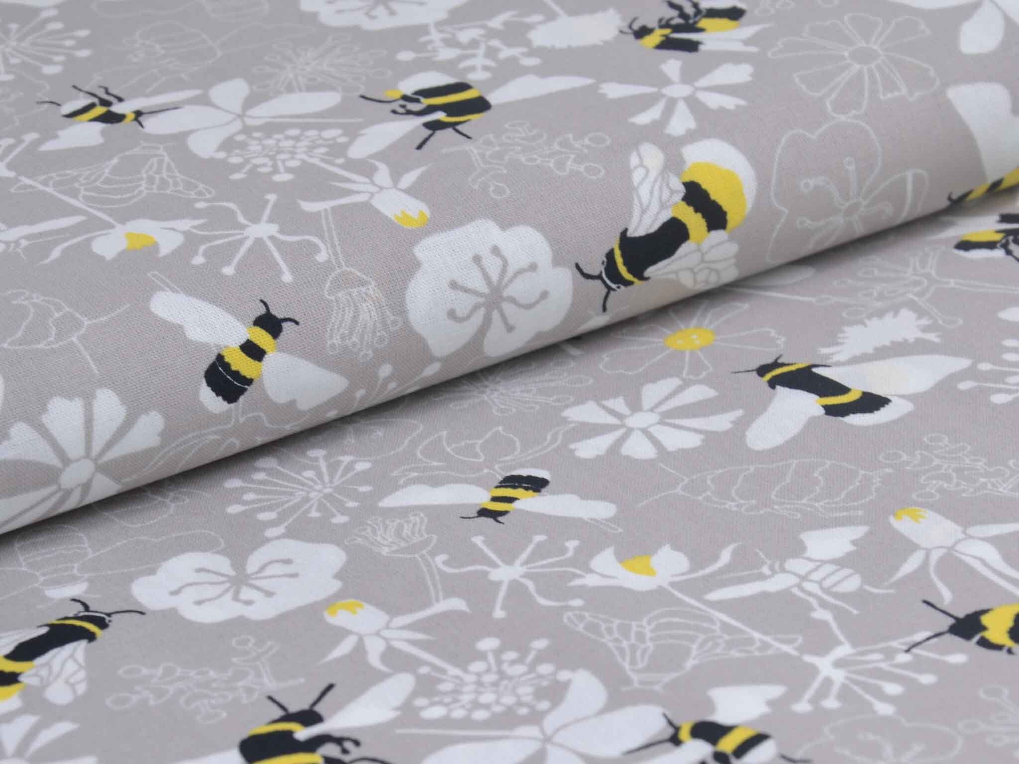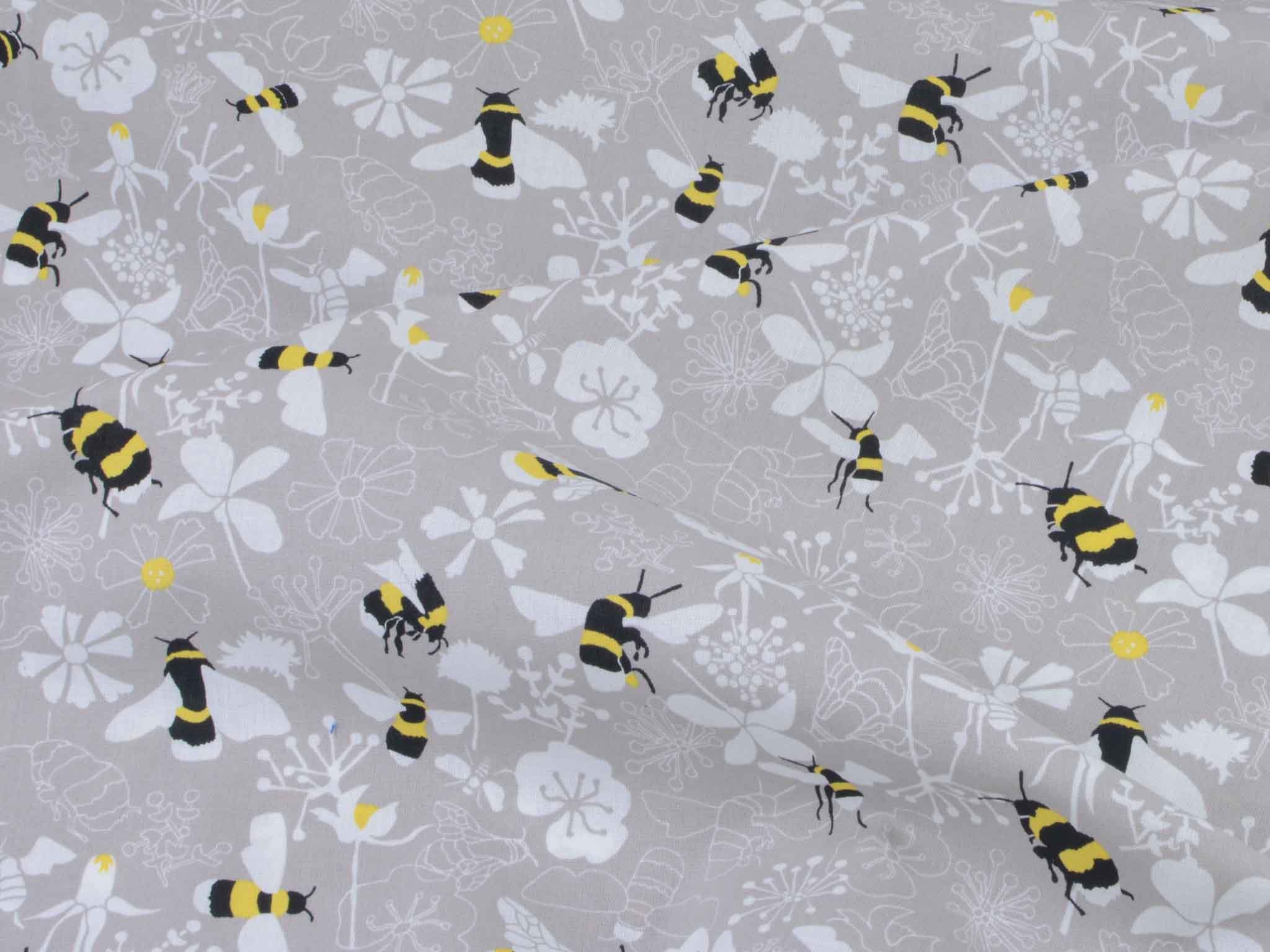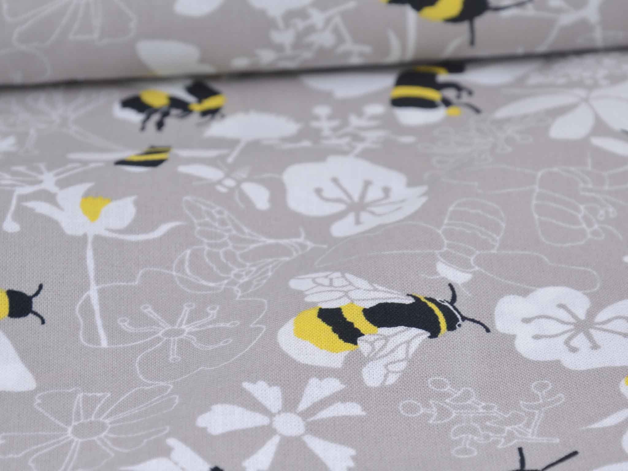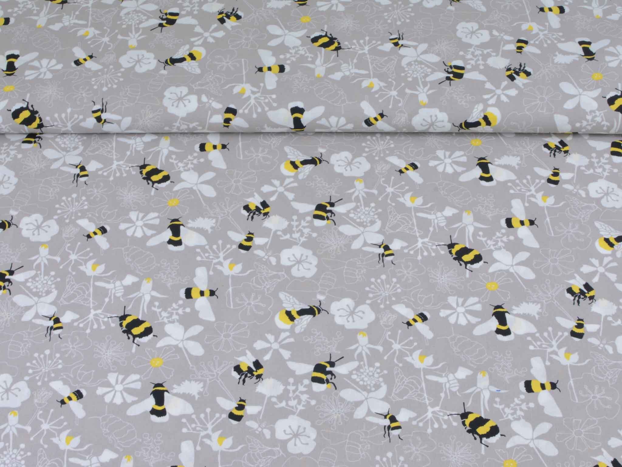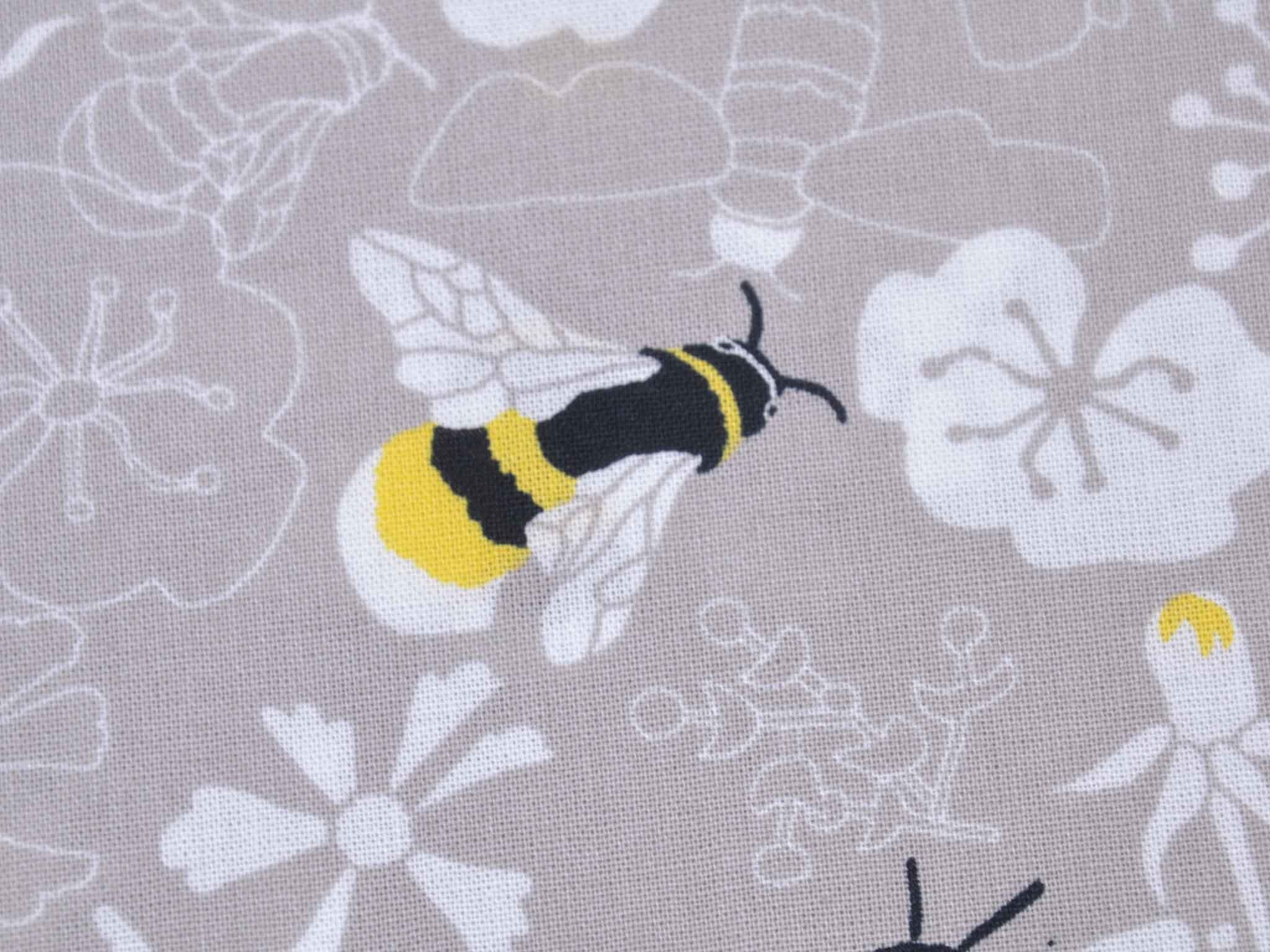 Very high-quality woven cotton fabric from the Kyoto series by Westfalenstoffe. The fabric is gray-beige with bumblebees and flowers; it's smooth and matte. Use it to sew dresses, skirts, pillows, bags, and much more. The fabric is made in Germany.