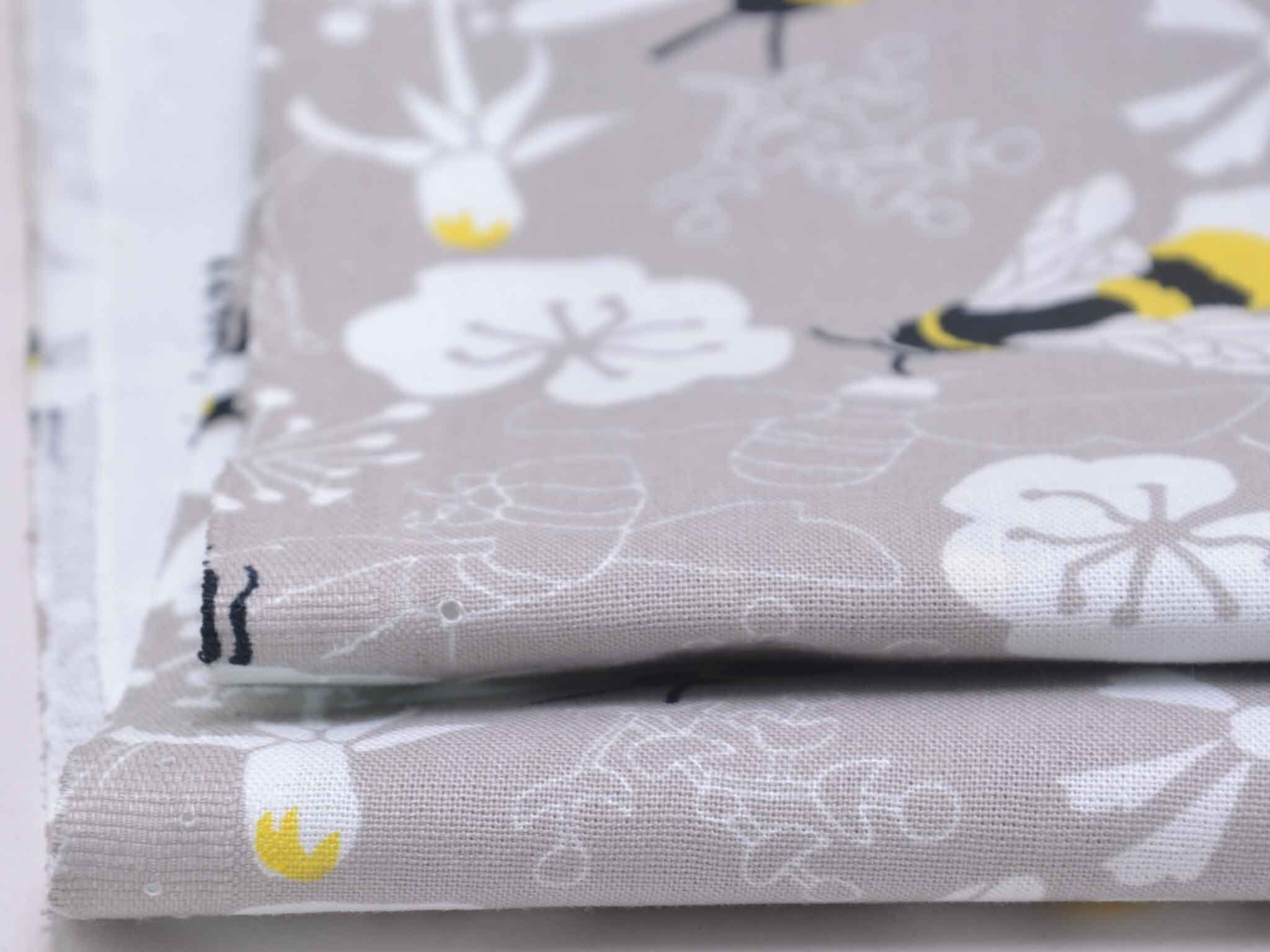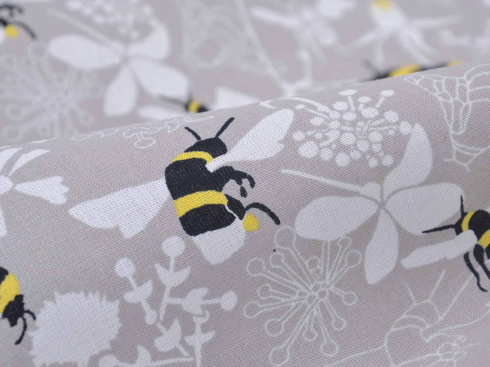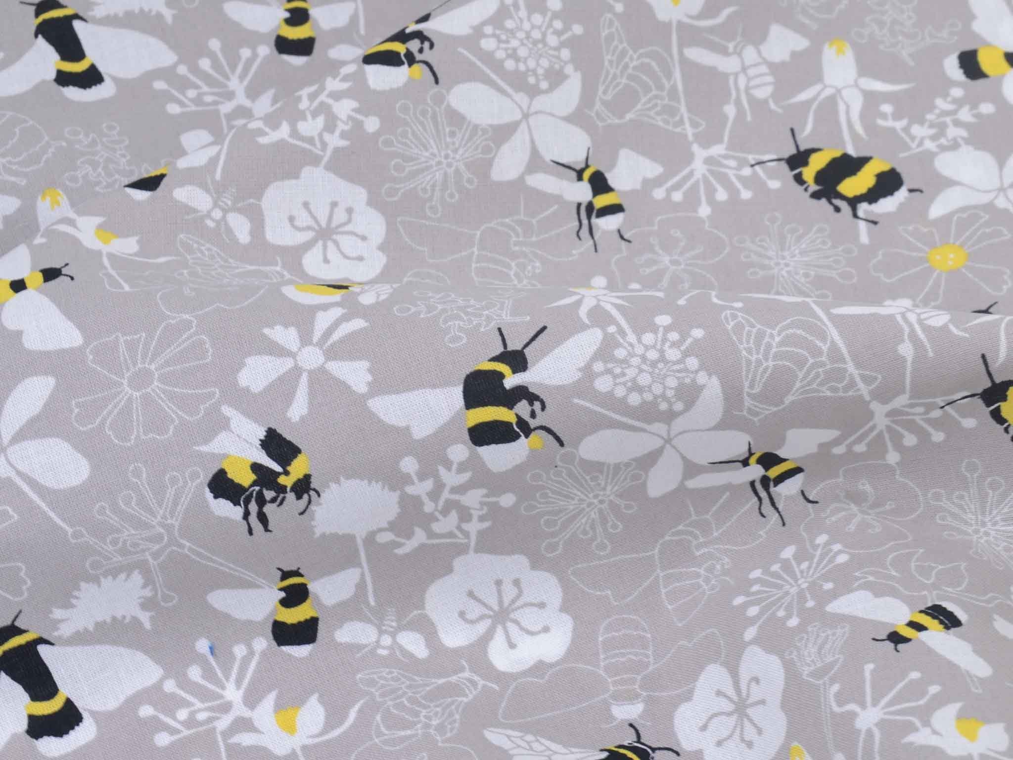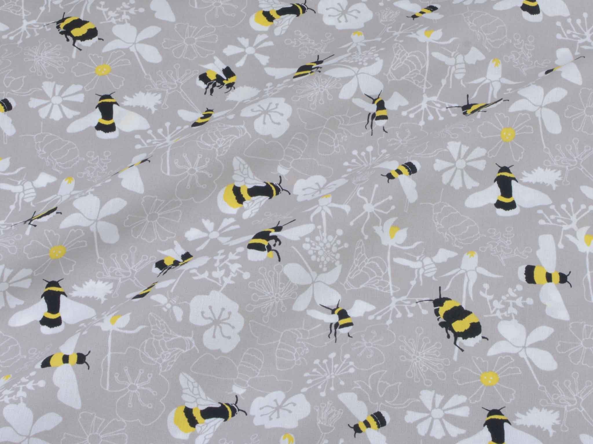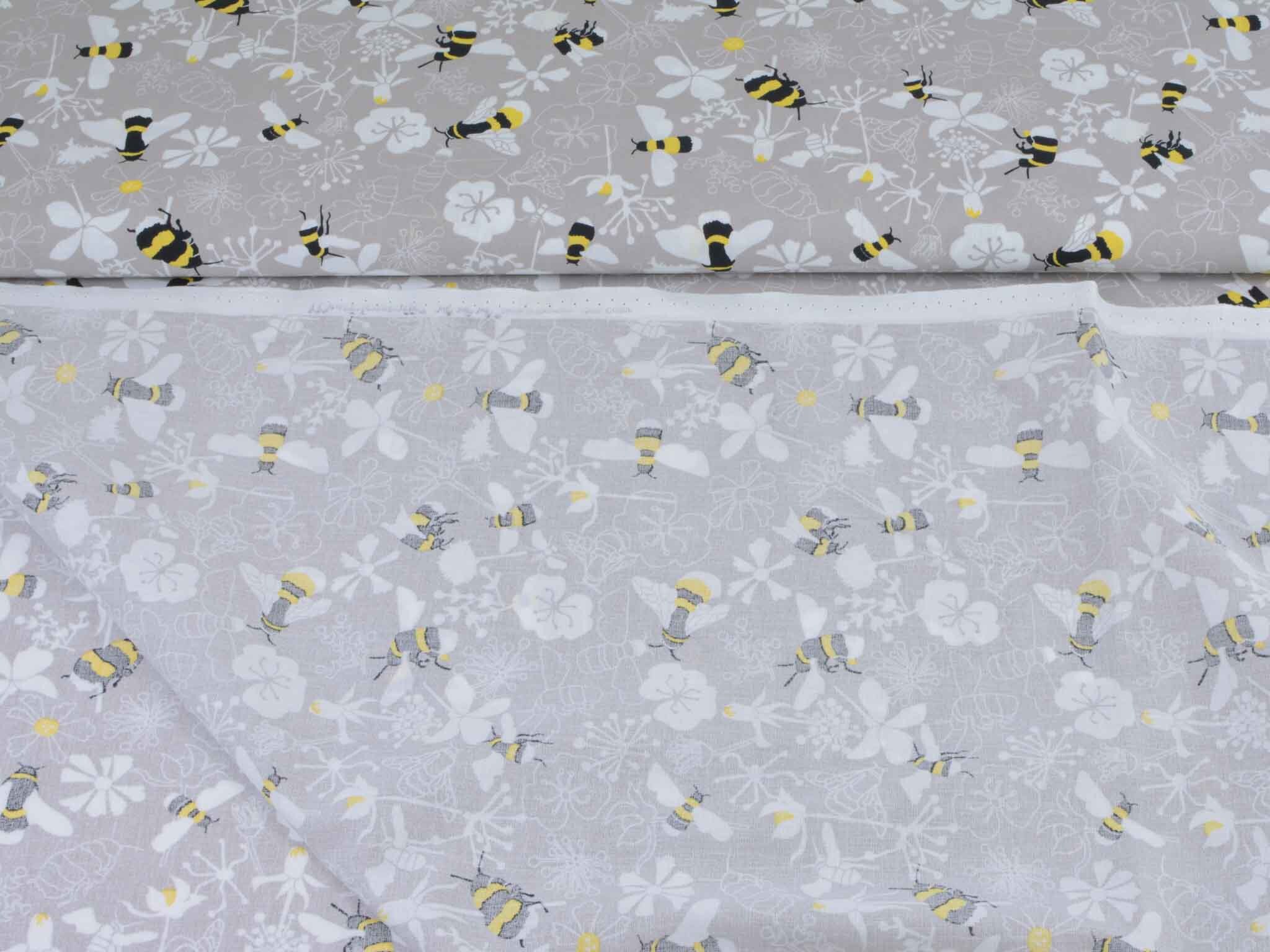 Very high-quality woven cotton fabric from the Kyoto series by Westfalenstoffe. The fabric is gray-beige with bumblebees and flowers; it's smooth and matte. Use it to sew dresses, skirts, pillows, bags, and much more. The fabric is made in Germany.