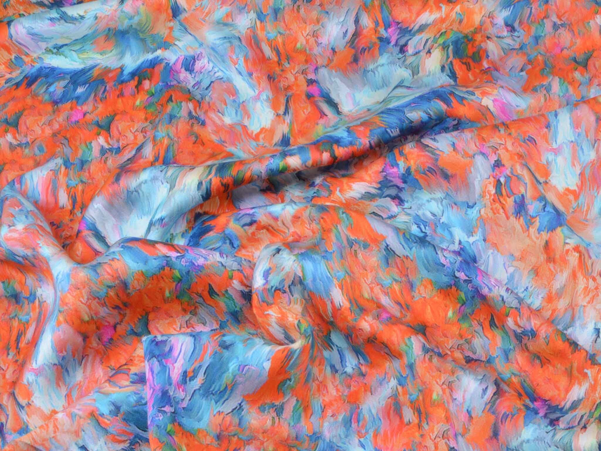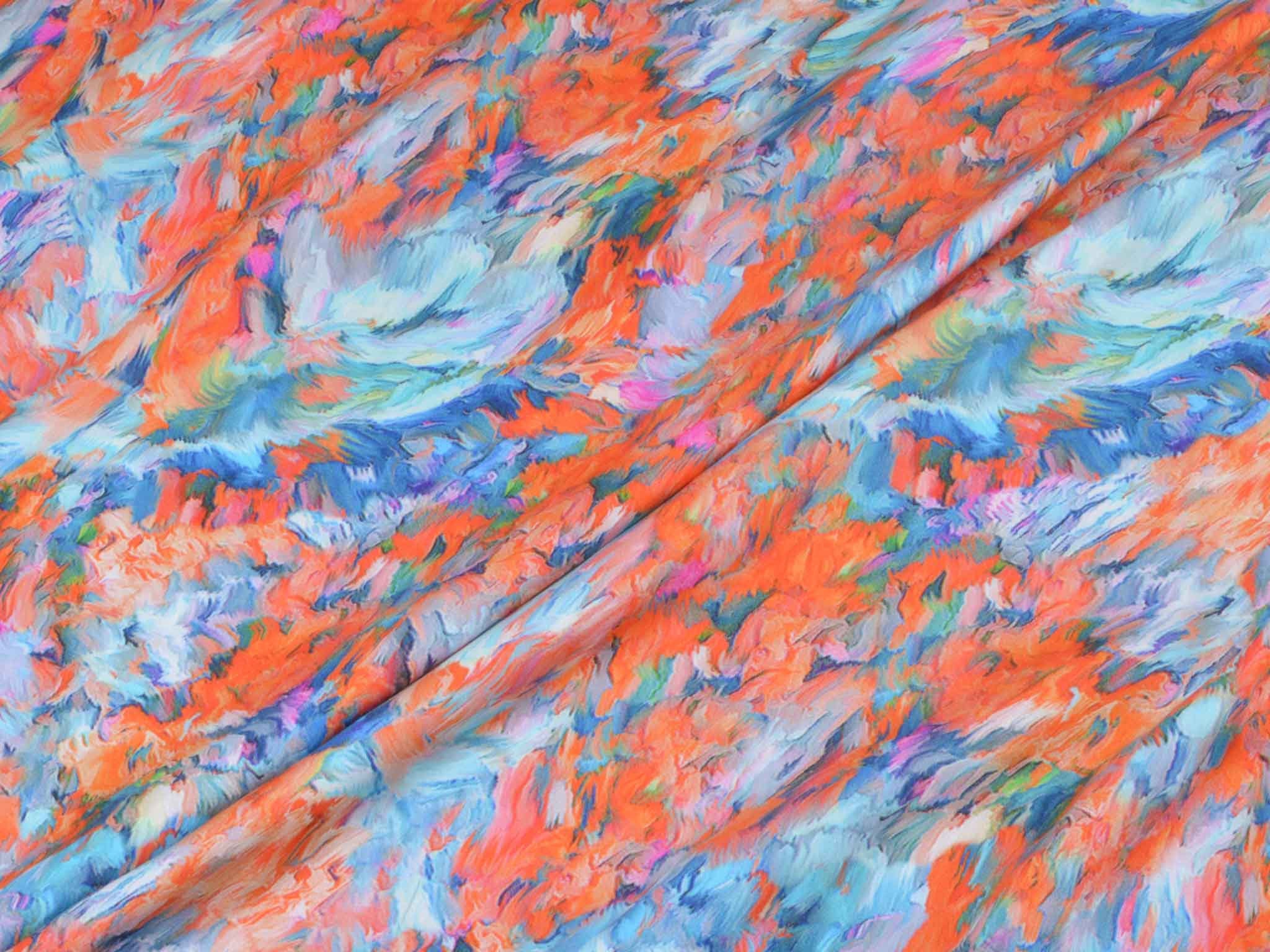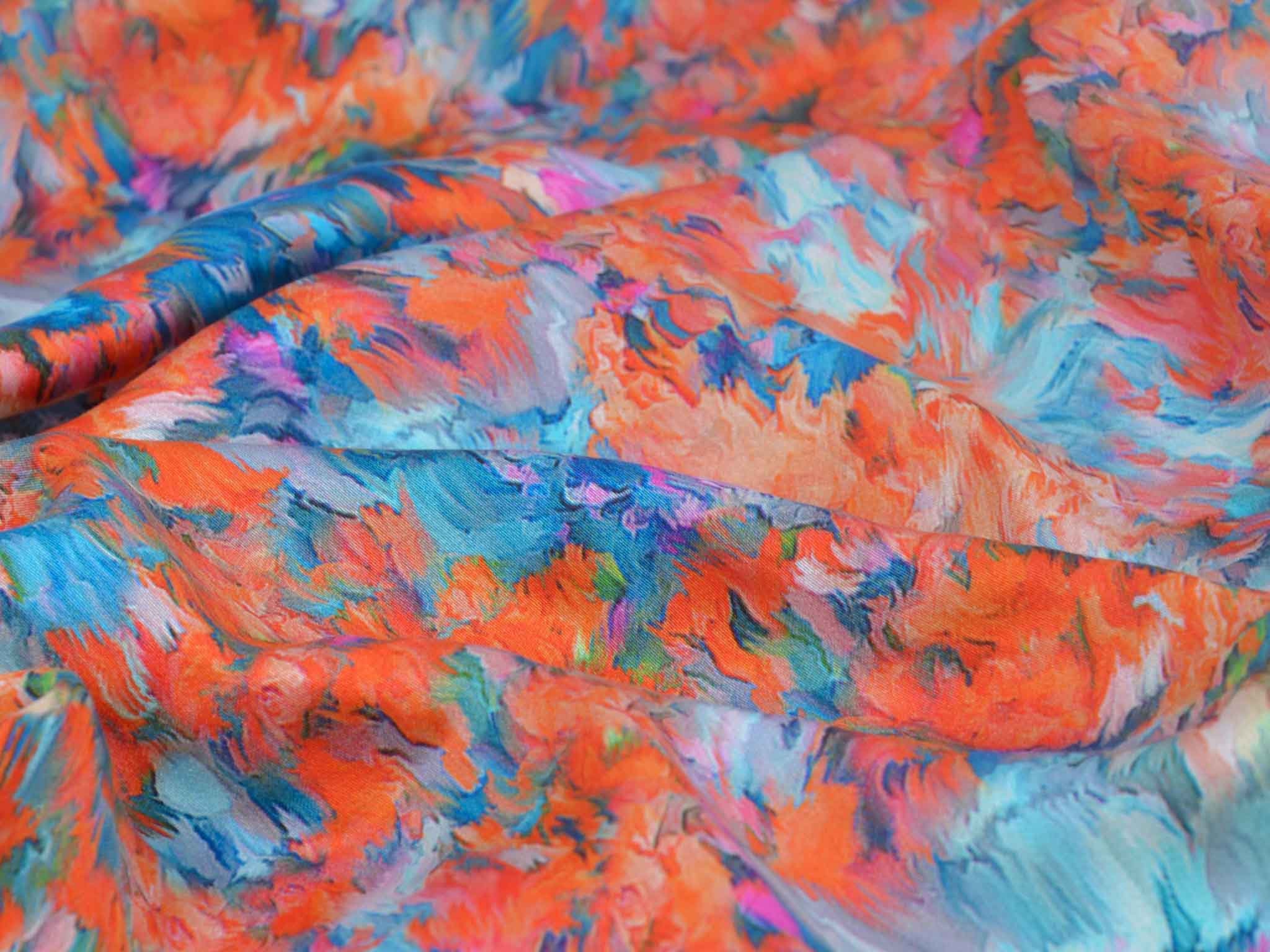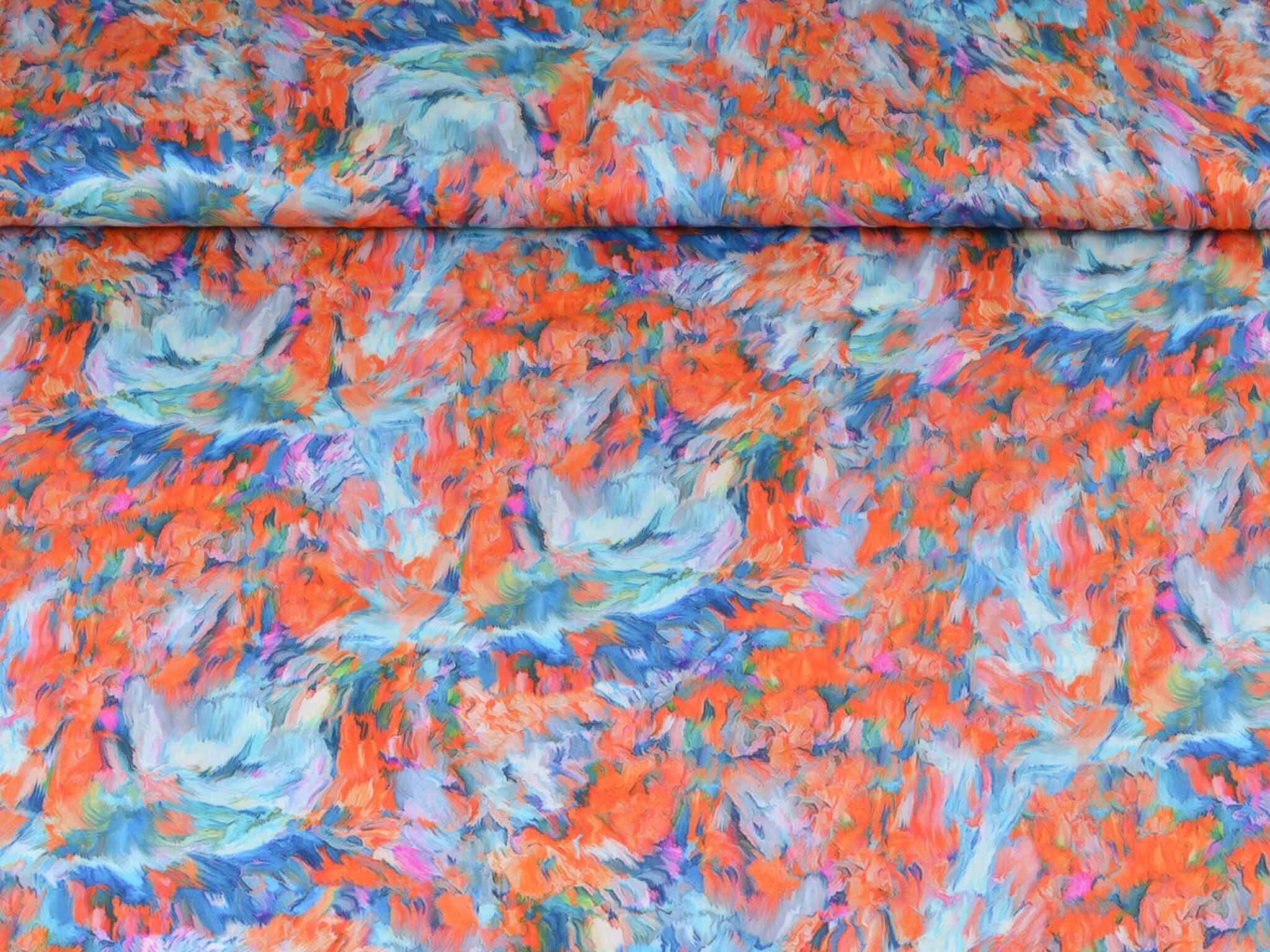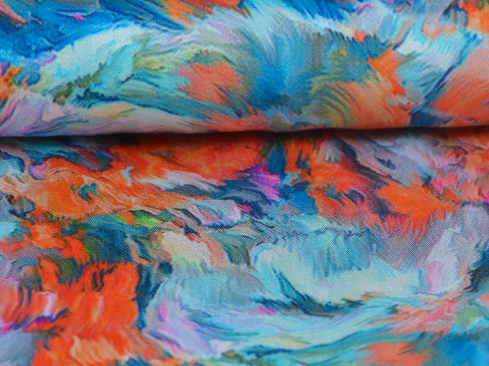 Dünner, leichter Satin-Webstoff aus Viskose mit buntem Art-Print. Der Stoff ist glatt, glänzend und hat einen schönen Fall. Nähe dir daraus tolle Sommerblusen, Kleider, Röcke, Hosen und so vieles mehr.