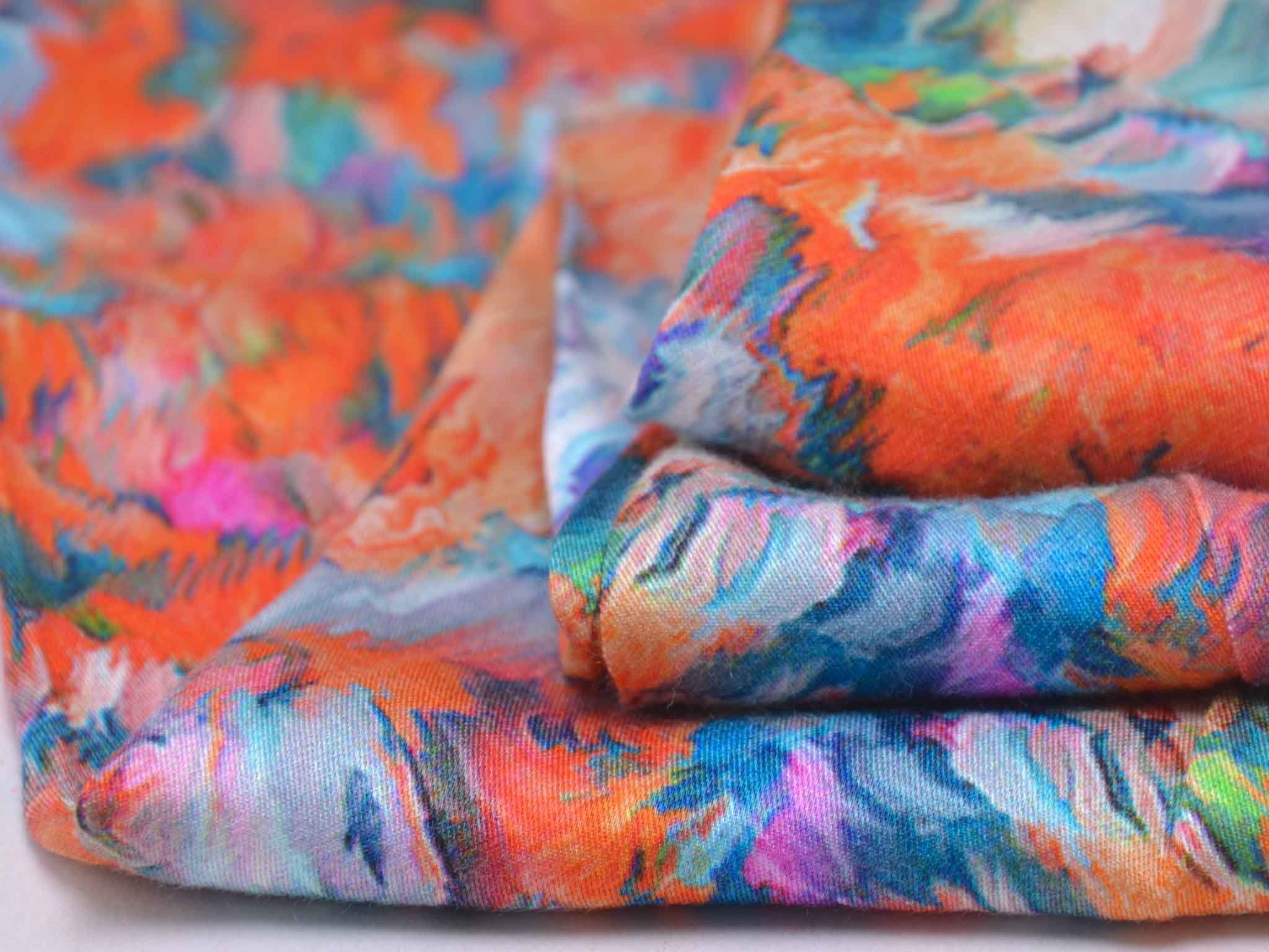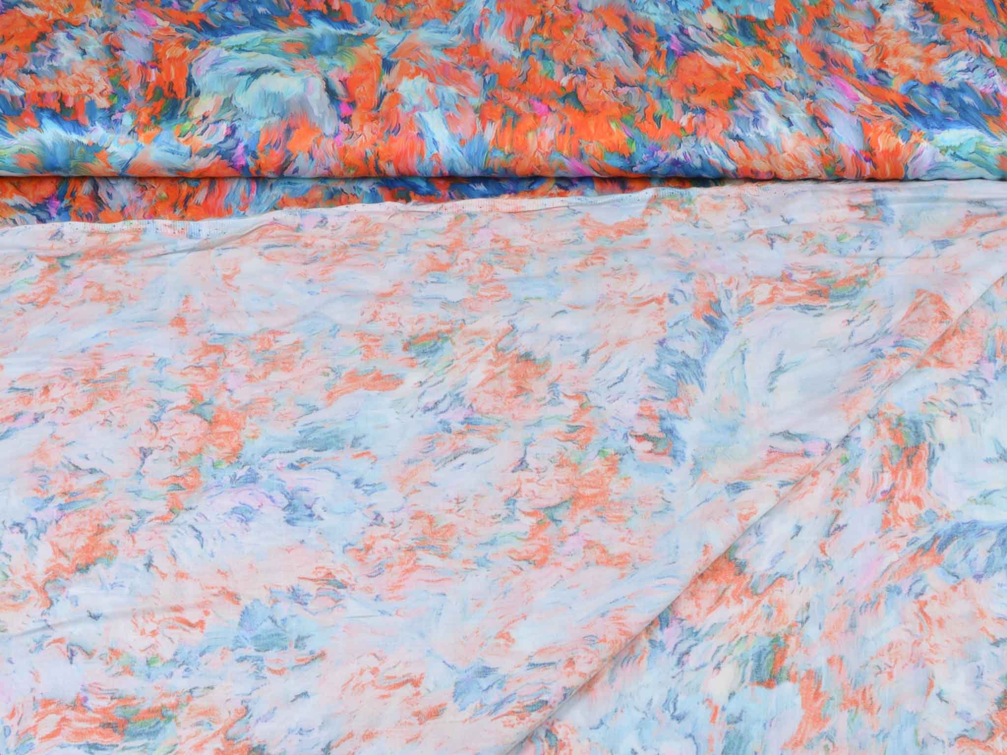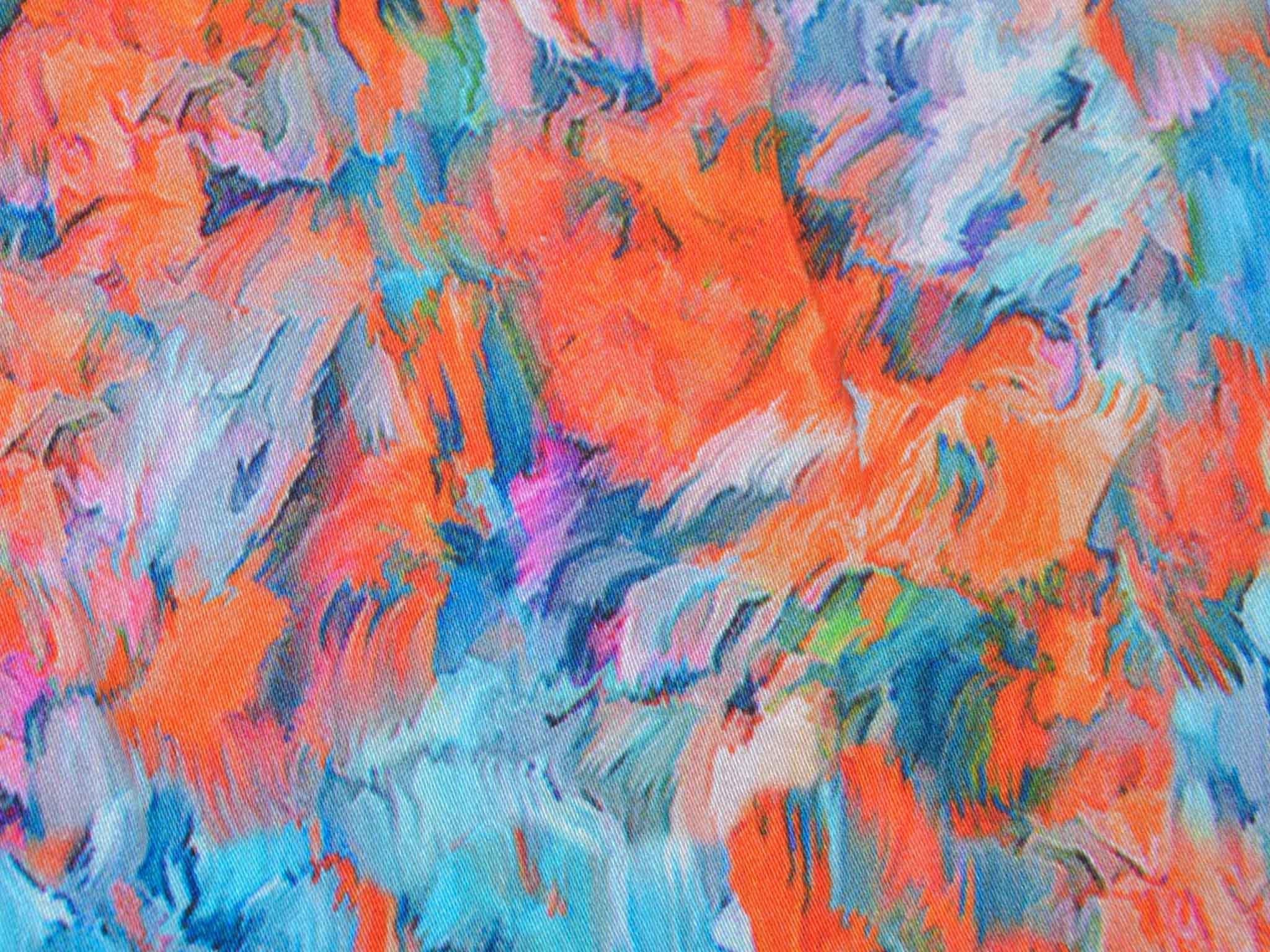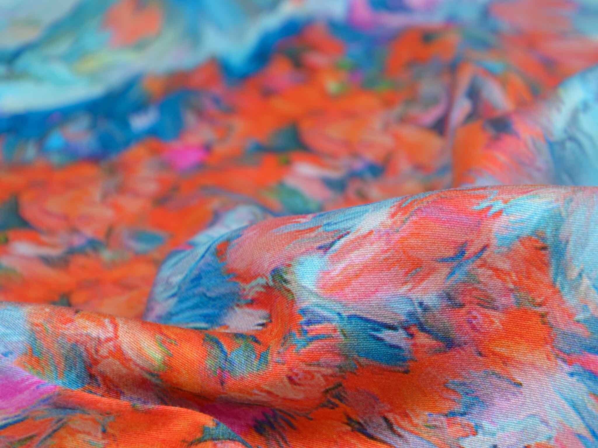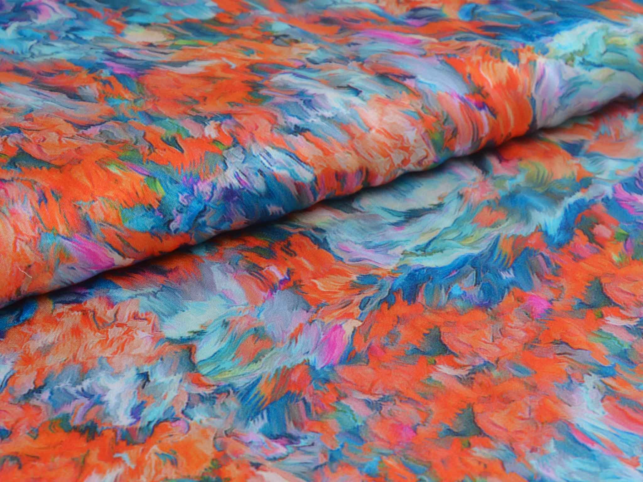 Dünner, leichter Satin-Webstoff aus Viskose mit buntem Art-Print. Der Stoff ist glatt, glänzend und hat einen schönen Fall. Nähe dir daraus tolle Sommerblusen, Kleider, Röcke, Hosen und so vieles mehr.