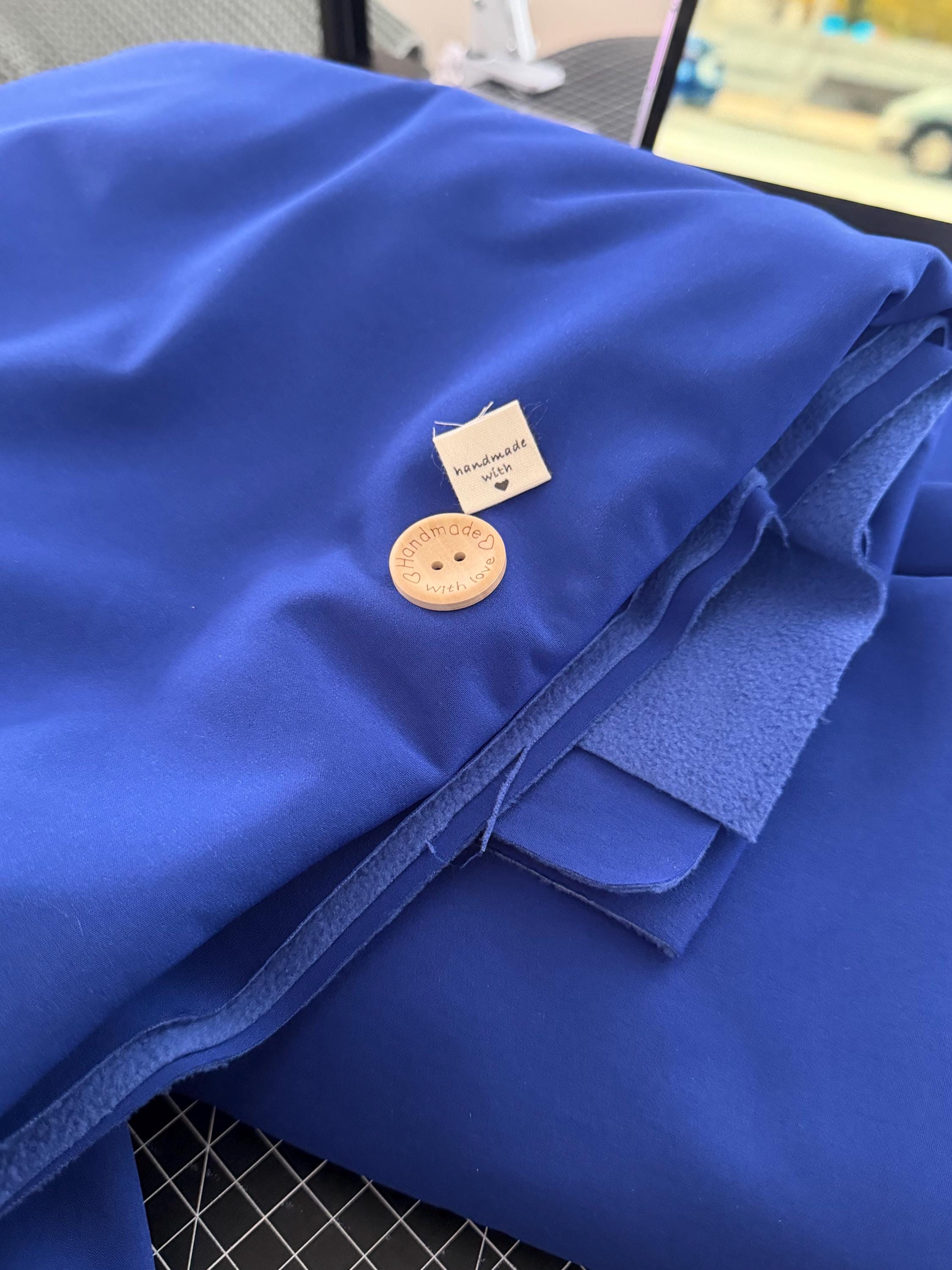 High-quality softshell fabric with a fleece backing in blue. The fabric is smooth and durable, with a soft reverse side. It is stretchy and water- and wind-resistant. This fabric is ideal for rain pants, children's jackets, softshell jackets, rain suits, and much more.