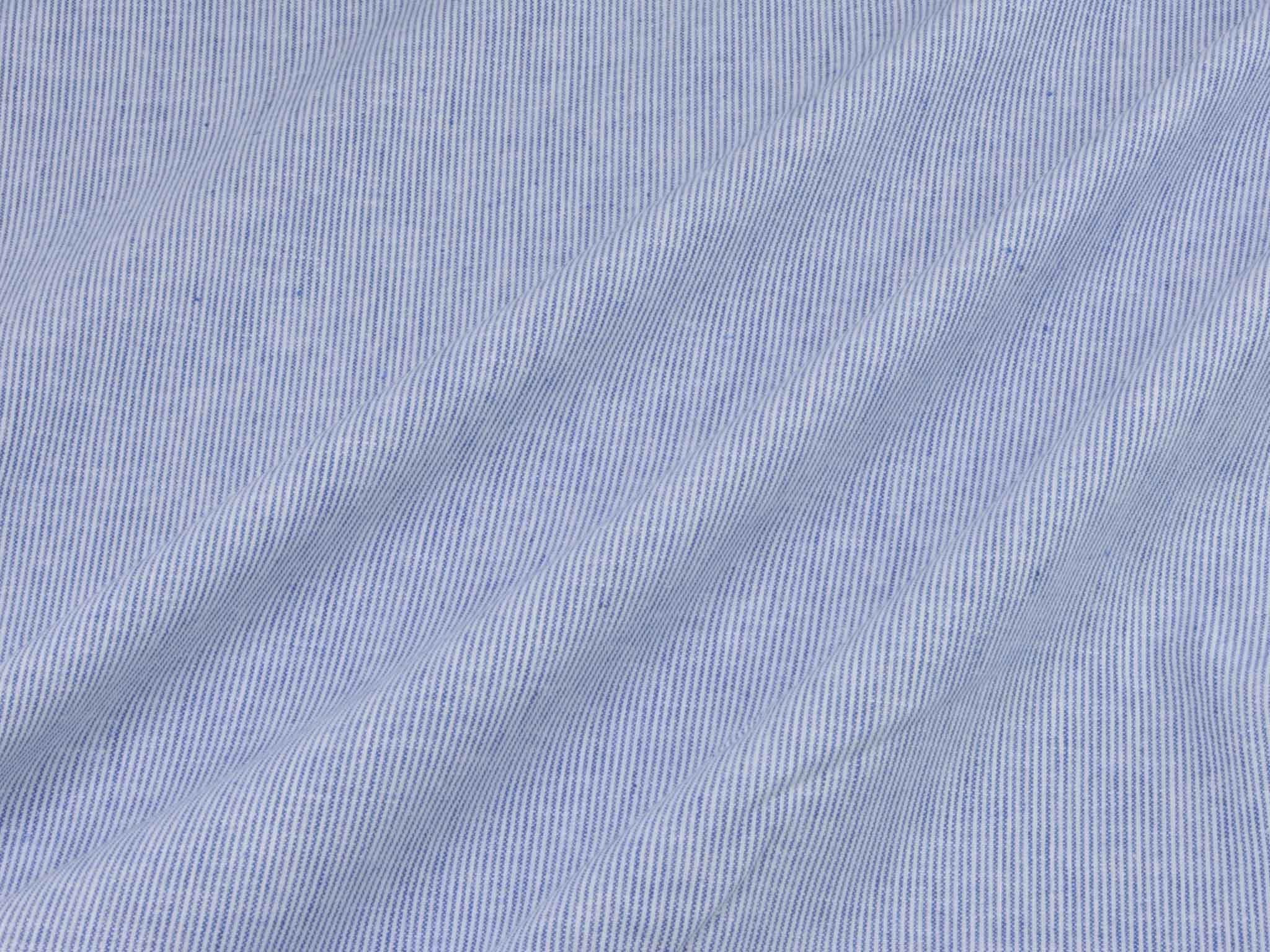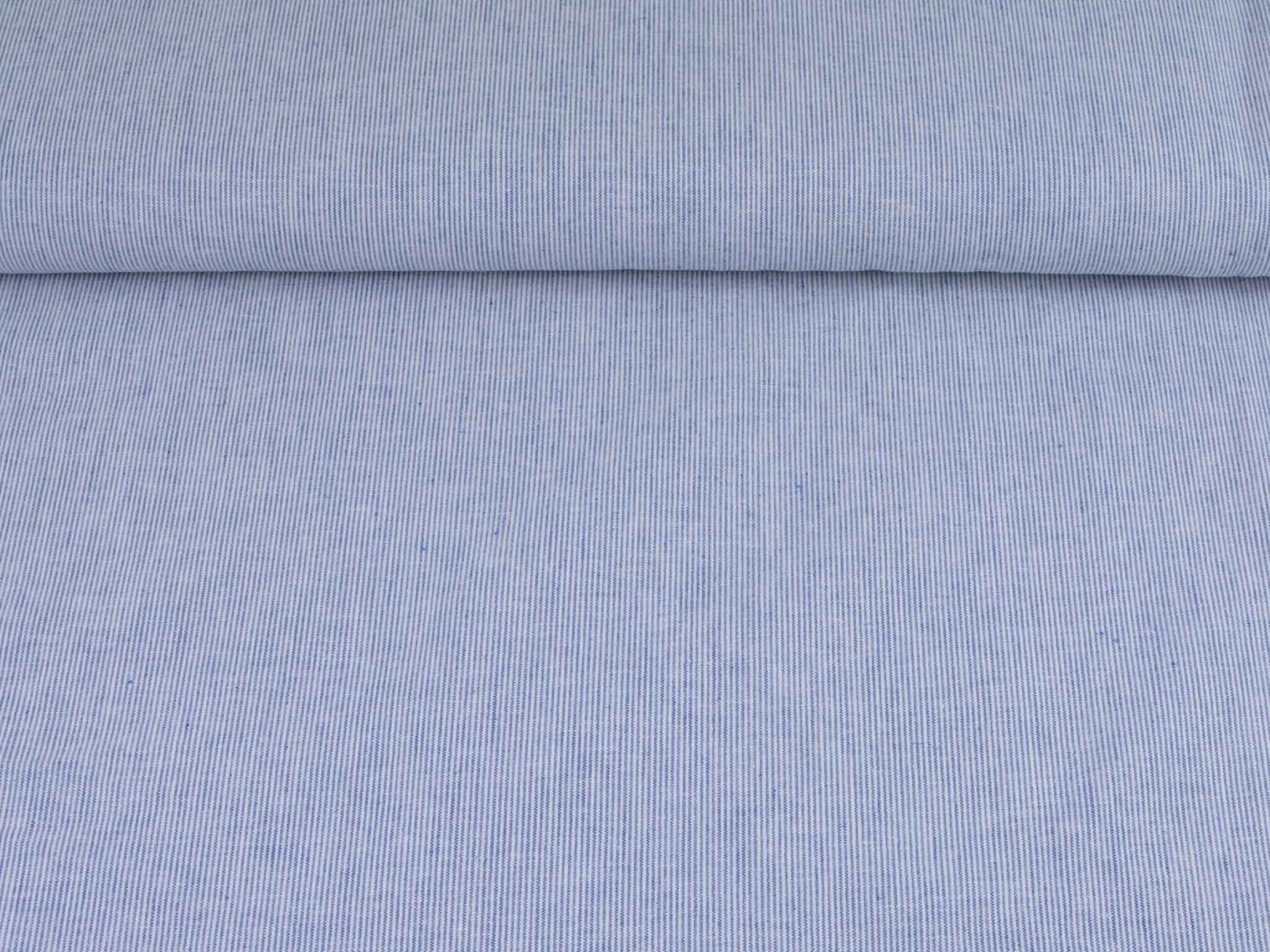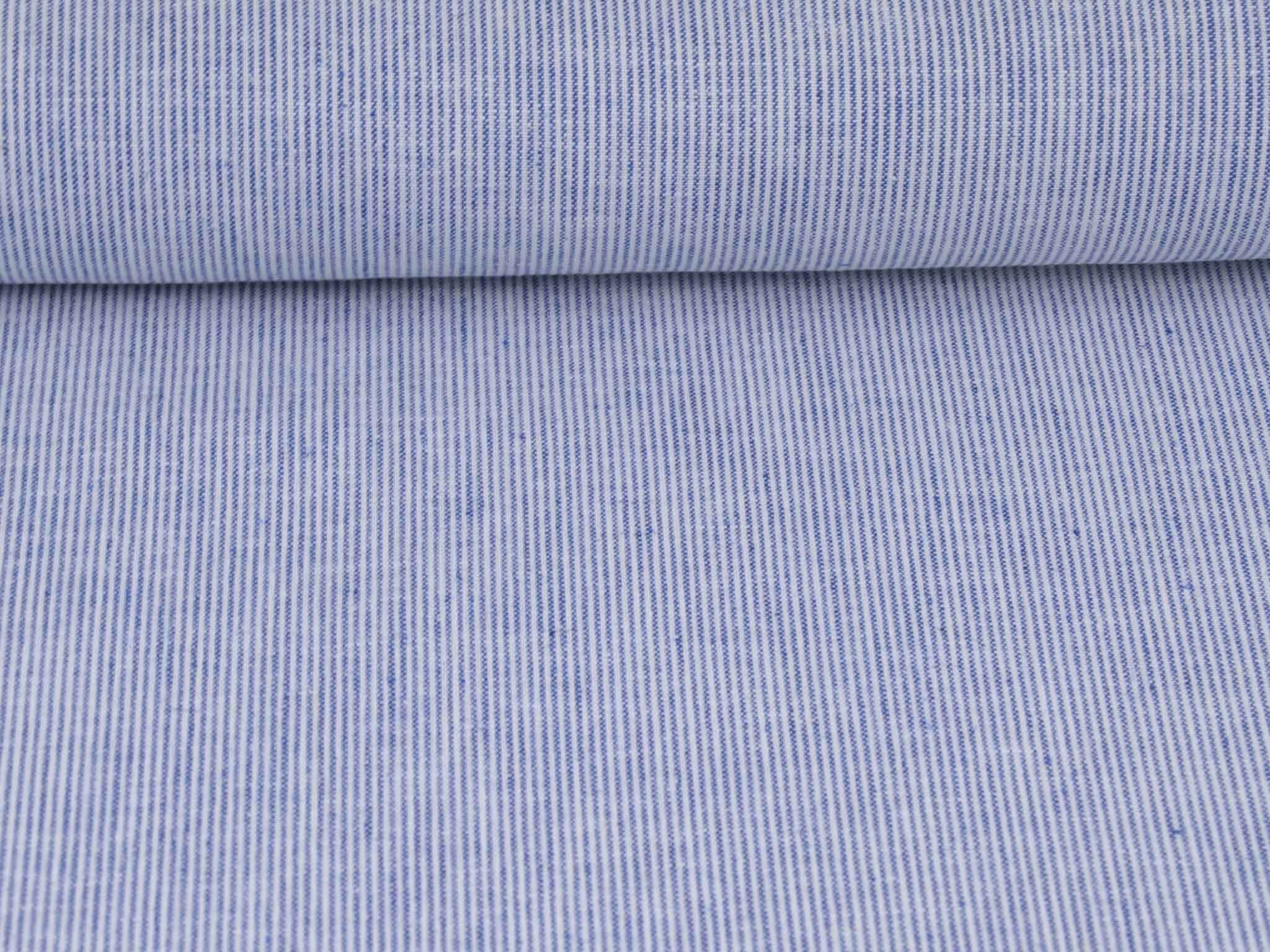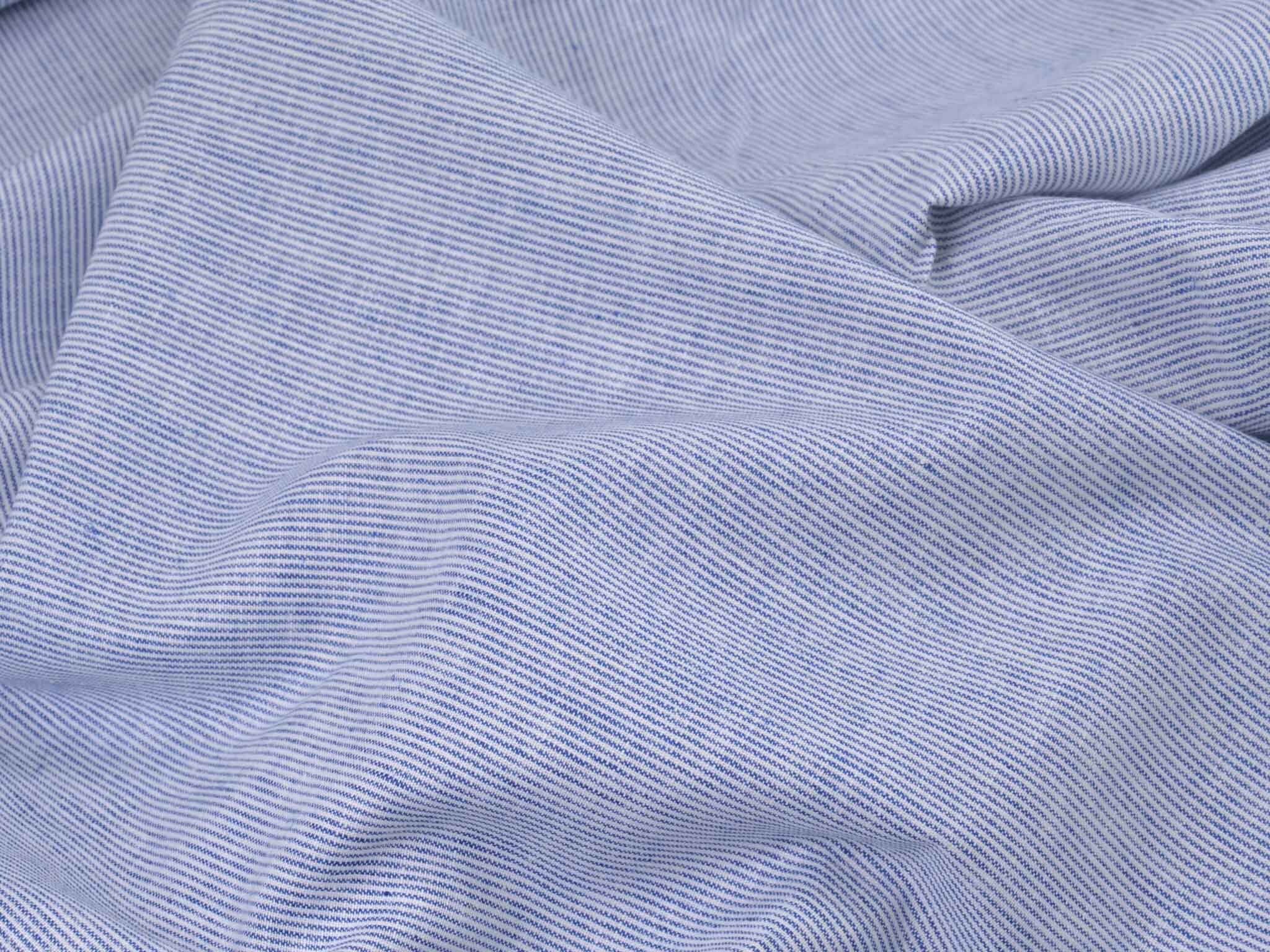 Blau-weiß gestreifter Leinenstoff mit Baumwolle. Der Stoff fühlt sich glatt an und hat eine typische Leinenstruktur. Die Streifen sind fein und ca. 1 mm breit. Er eignet sich super für Hosen, Kleider, Röcke und vieles mehr.