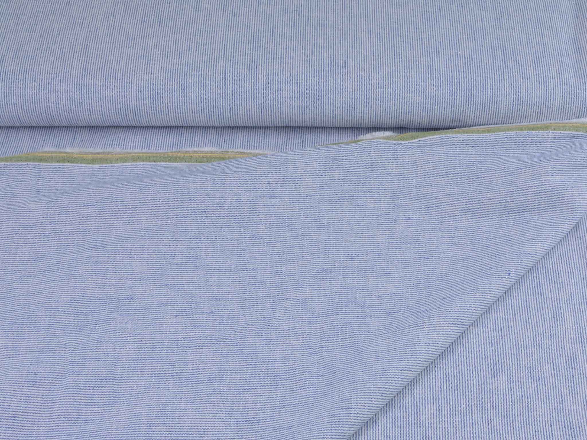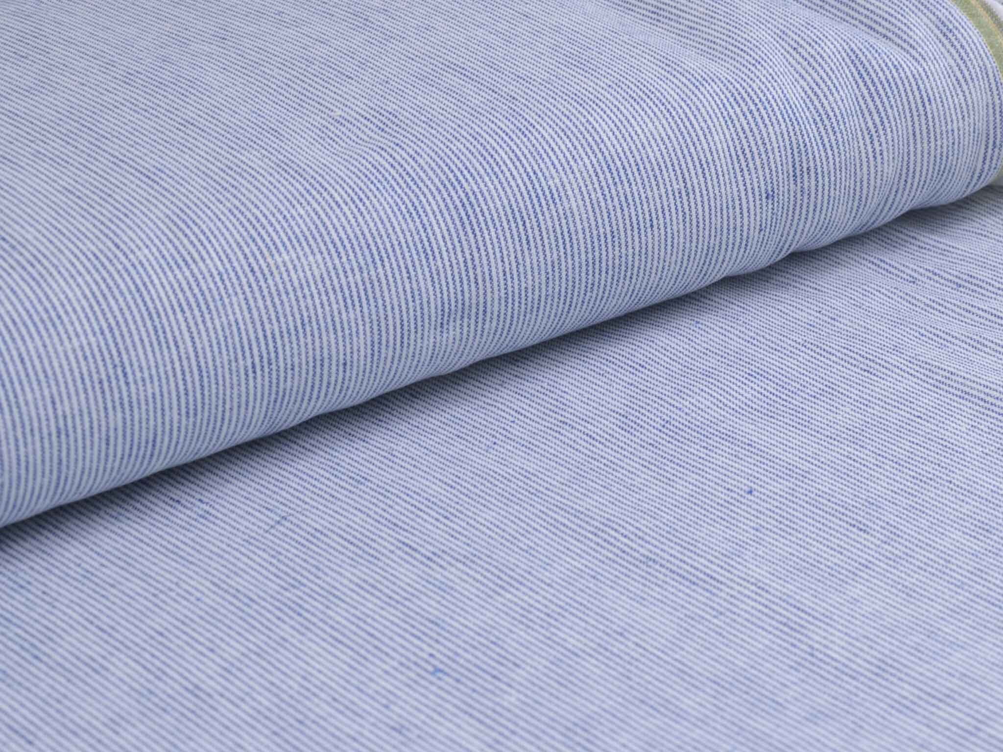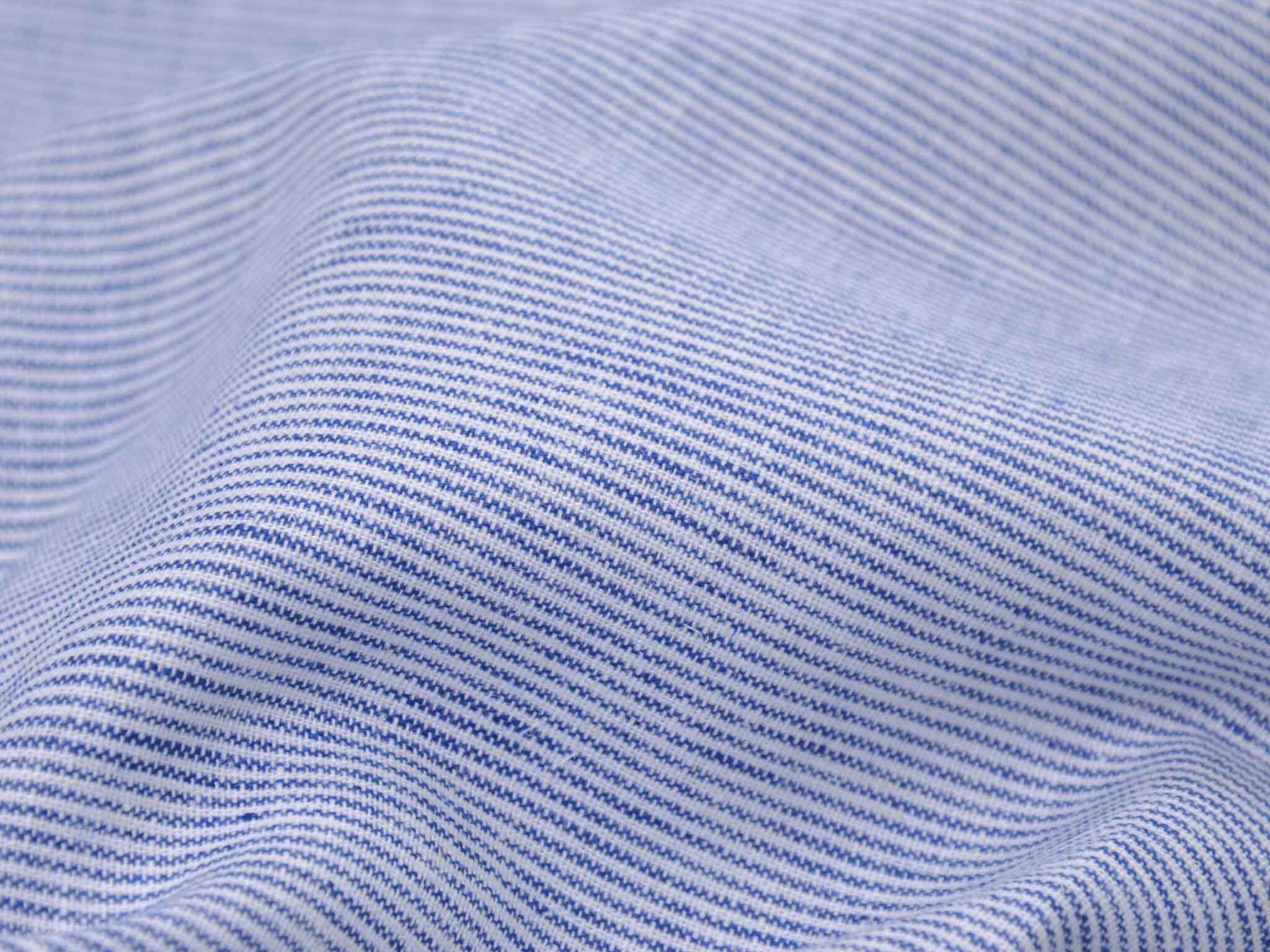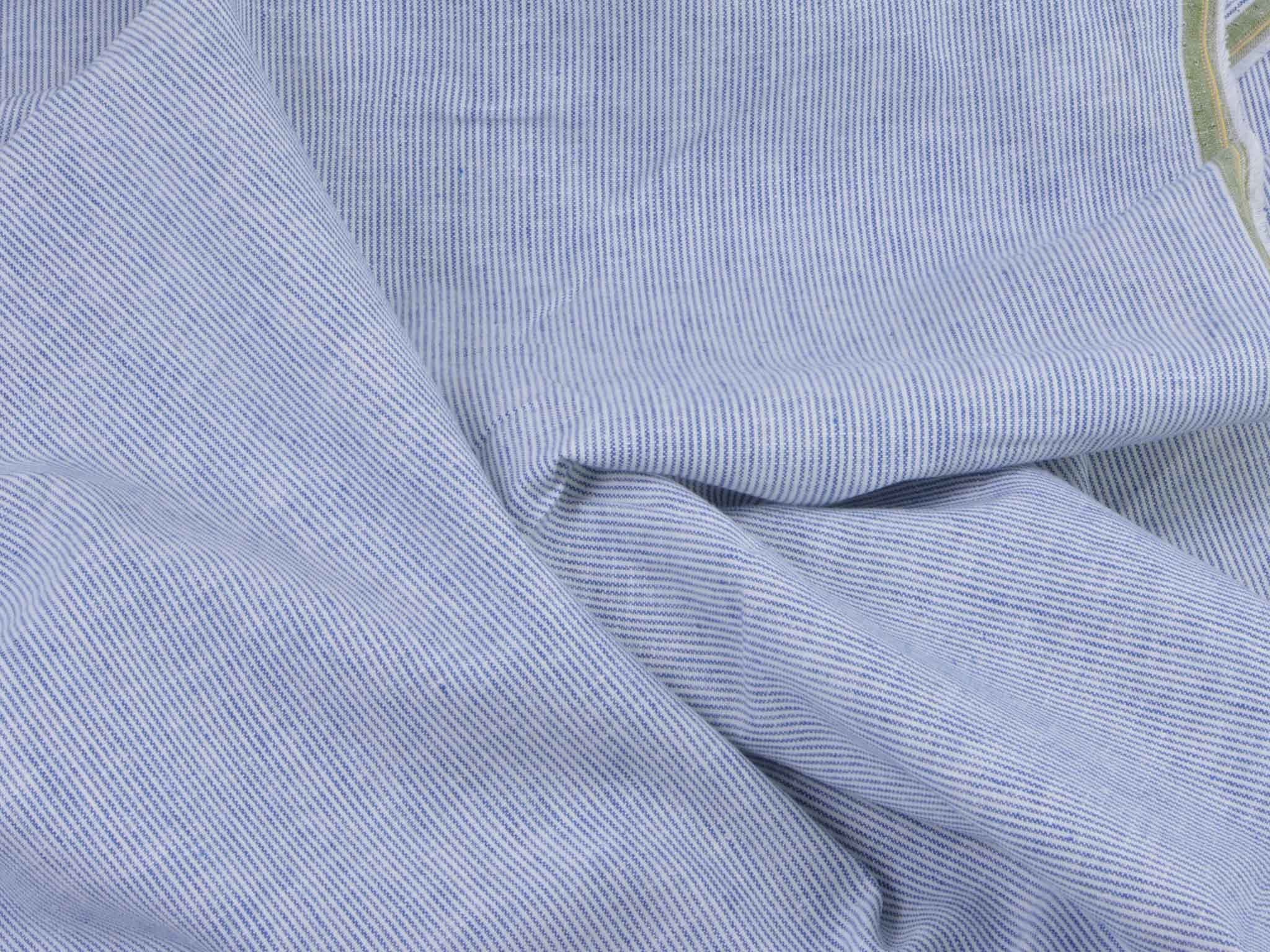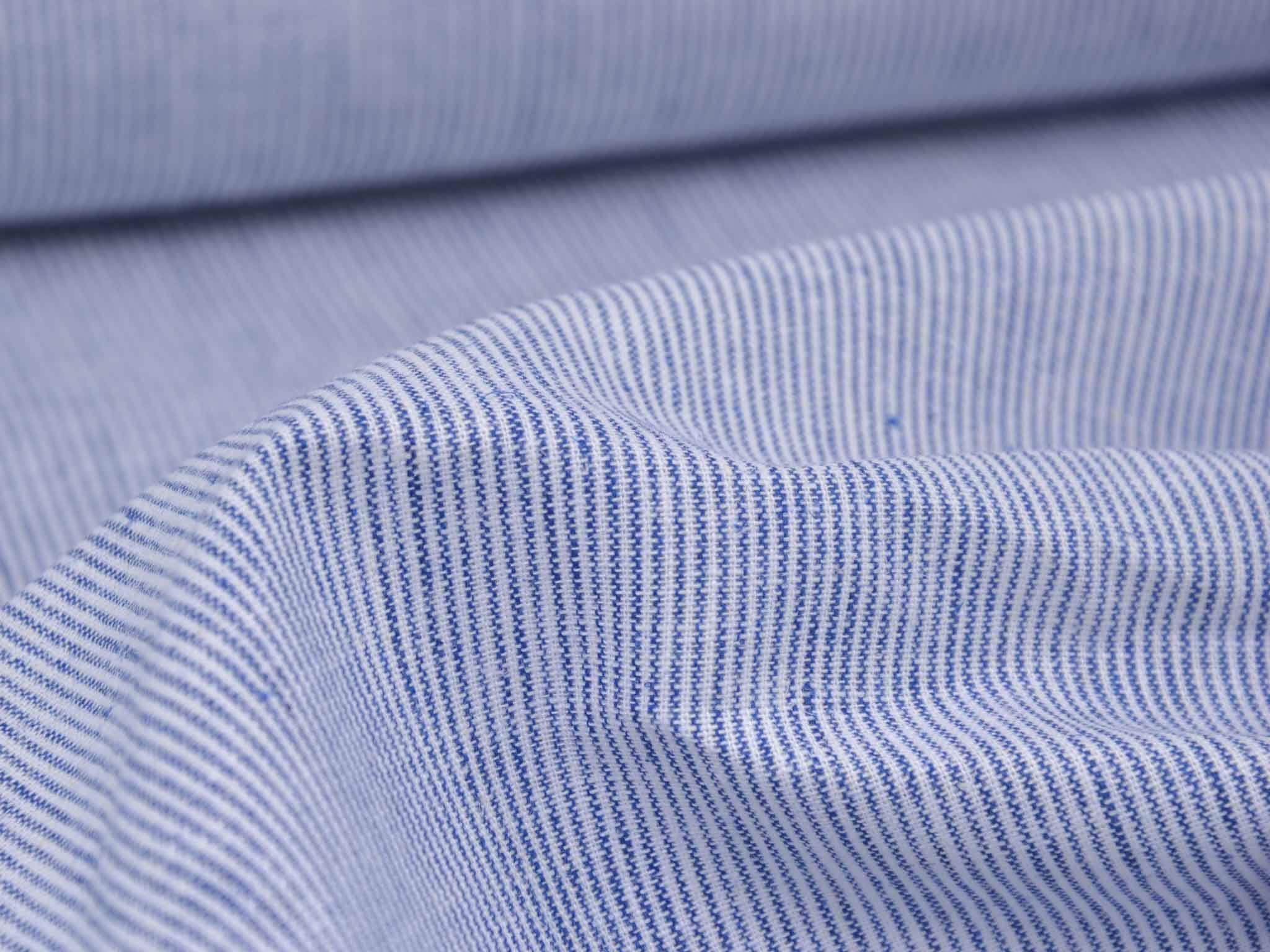 Blau-weiß gestreifter Leinenstoff mit Baumwolle. Der Stoff fühlt sich glatt an und hat eine typische Leinenstruktur. Die Streifen sind fein und ca. 1 mm breit. Er eignet sich super für Hosen, Kleider, Röcke und vieles mehr.