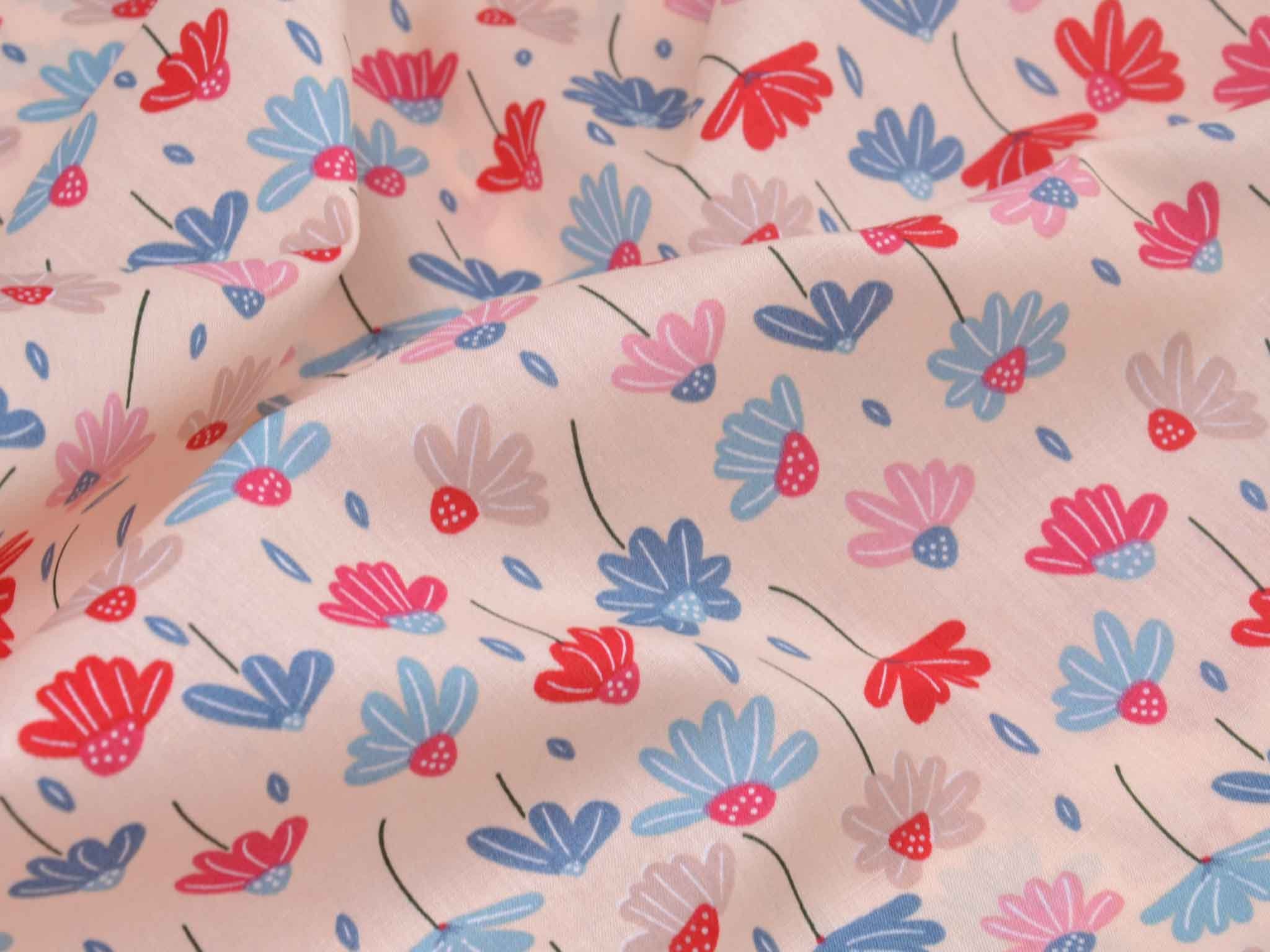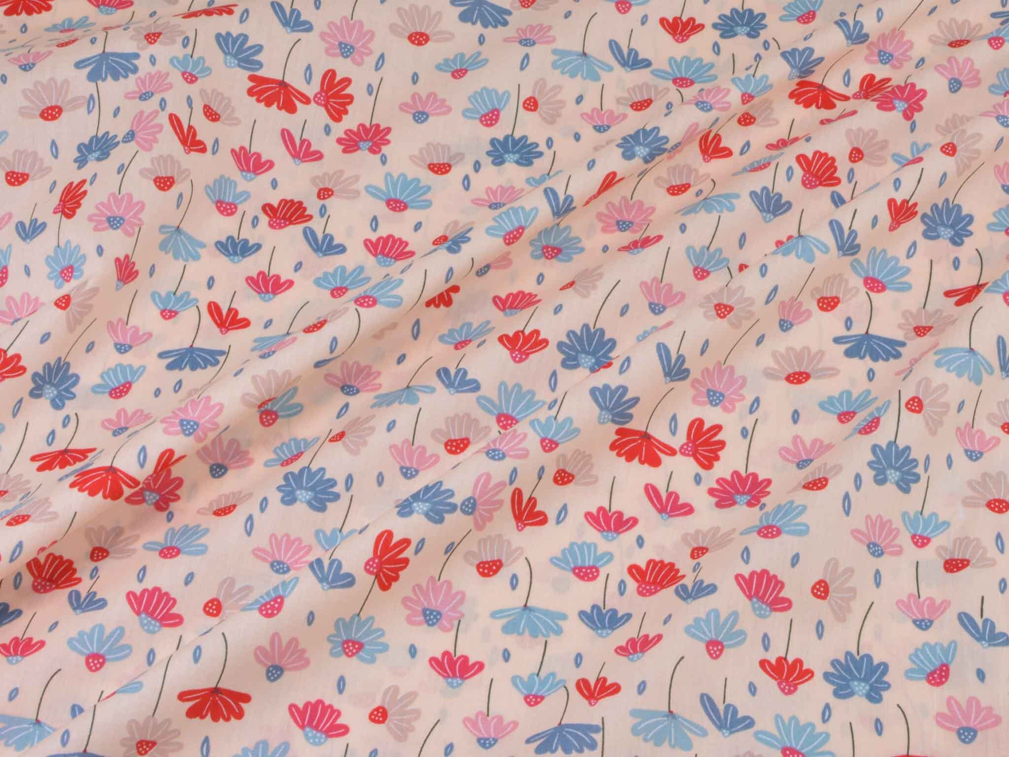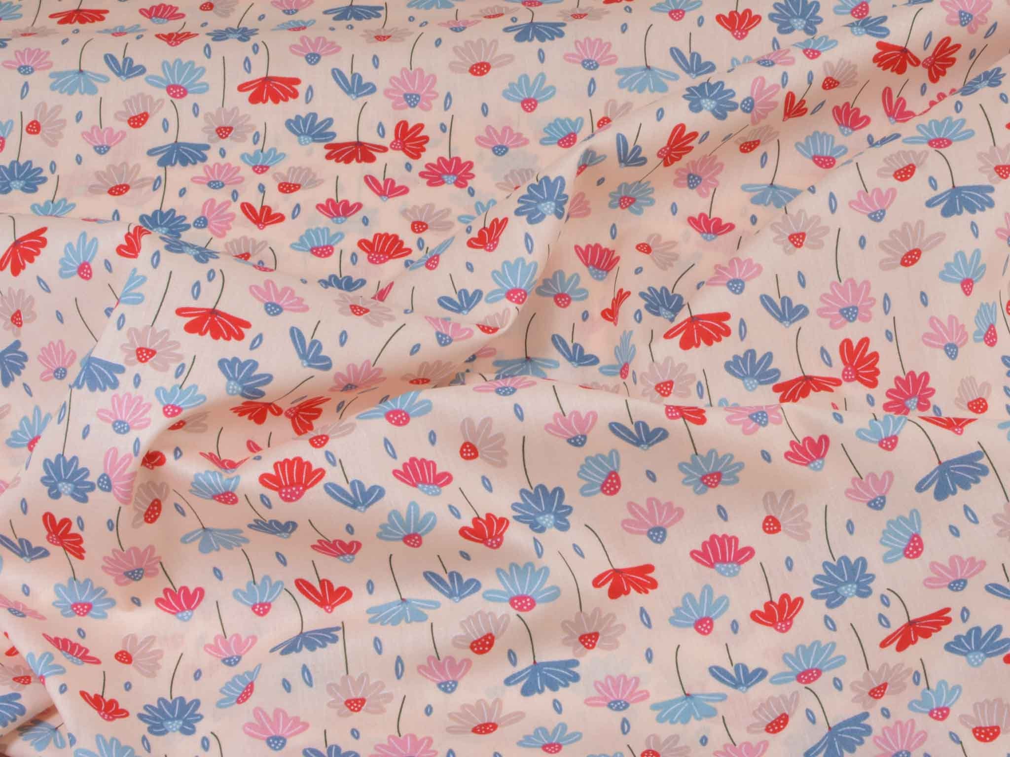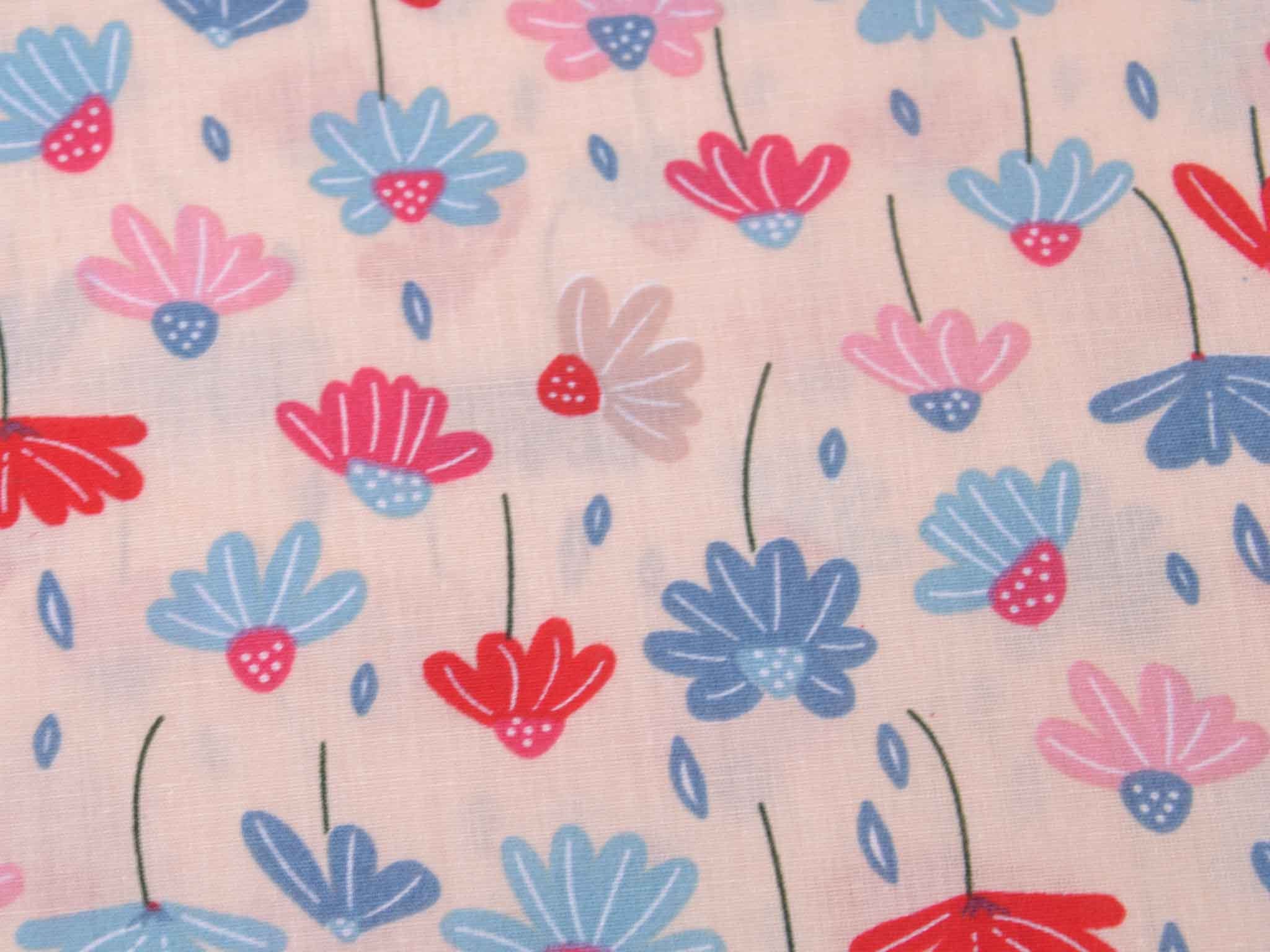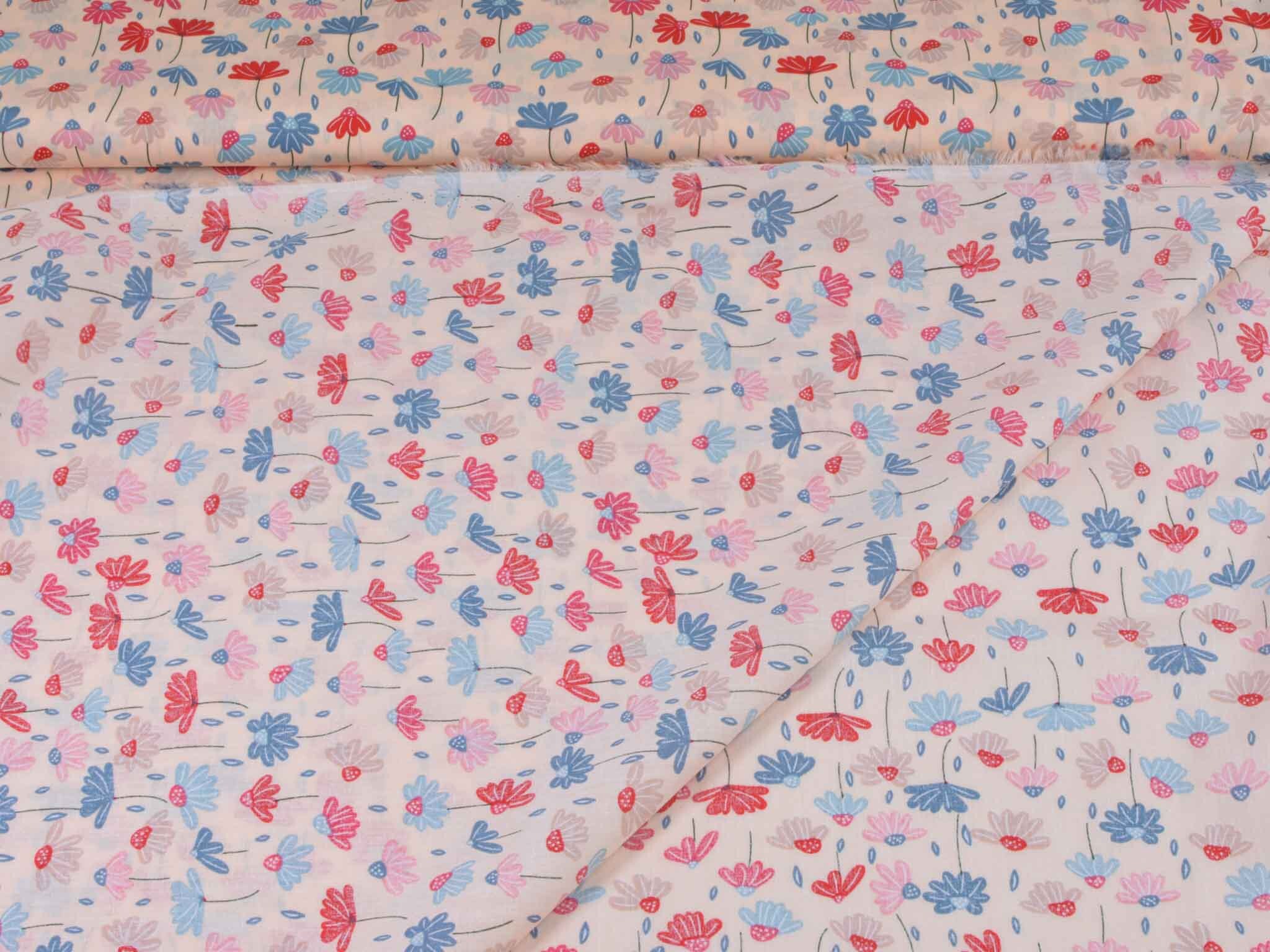 Dünner, leichter Webstoff aus Baumwolle mit Blumen in rosa, blau, rot. Der Stoff ist glatt. Nähe dir daraus tolle Sommerblusen, Kleider, Röcke, Hosen und so vieles mehr.