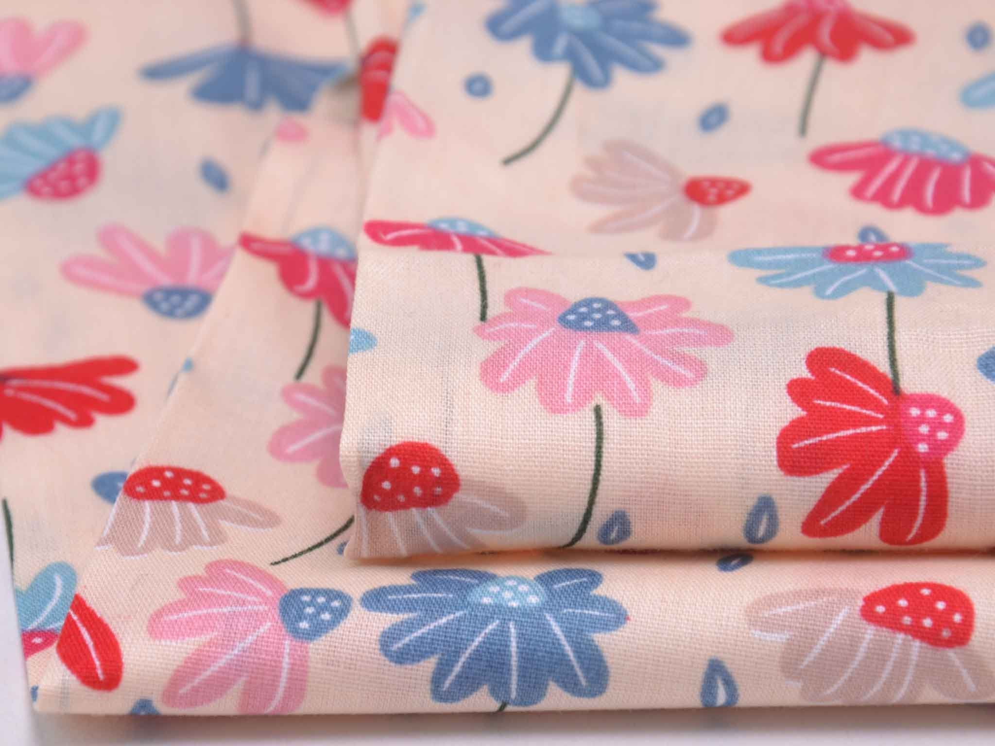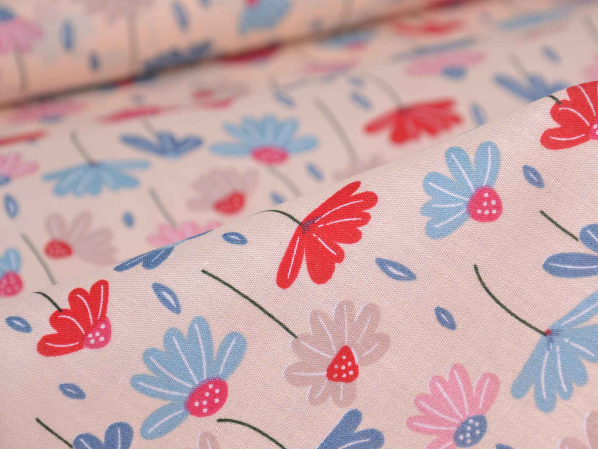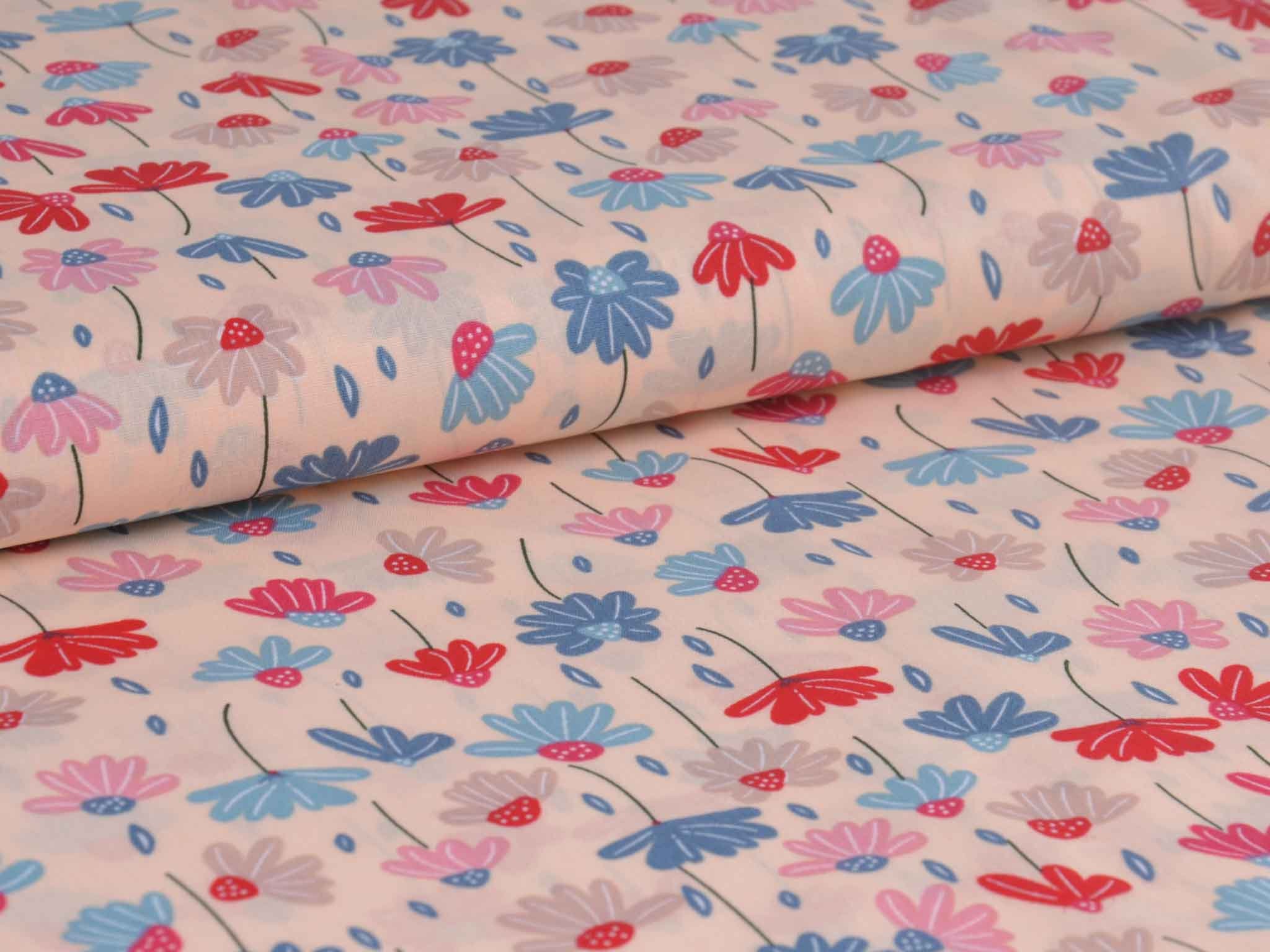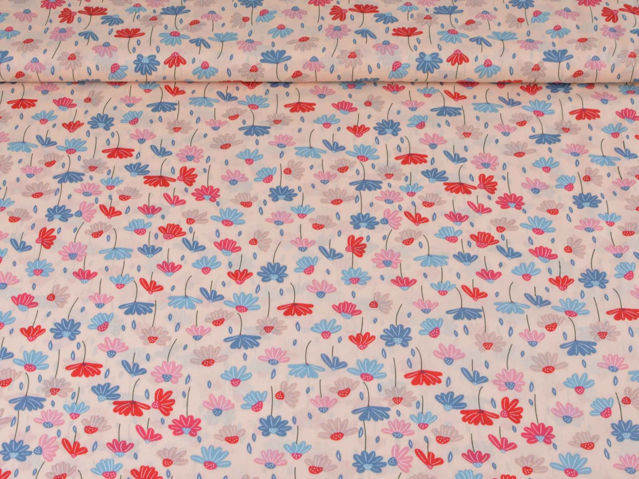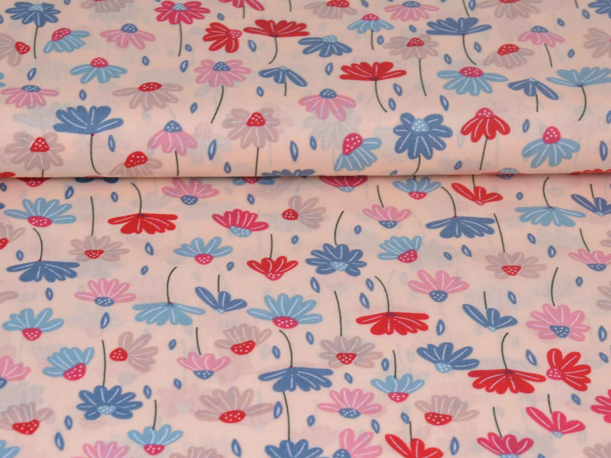 Dünner, leichter Webstoff aus Baumwolle mit Blumen in rosa, blau, rot. Der Stoff ist glatt. Nähe dir daraus tolle Sommerblusen, Kleider, Röcke, Hosen und so vieles mehr.