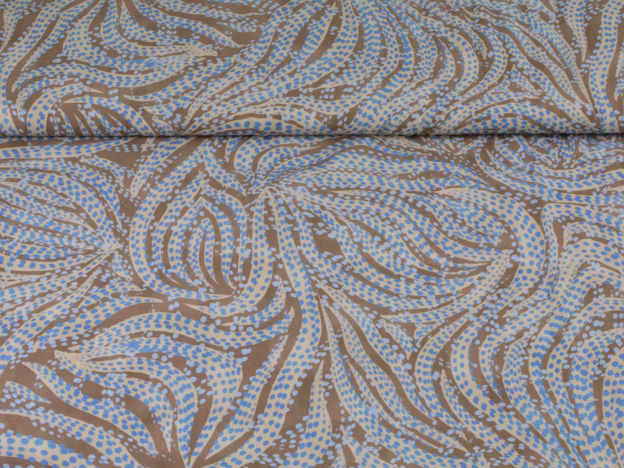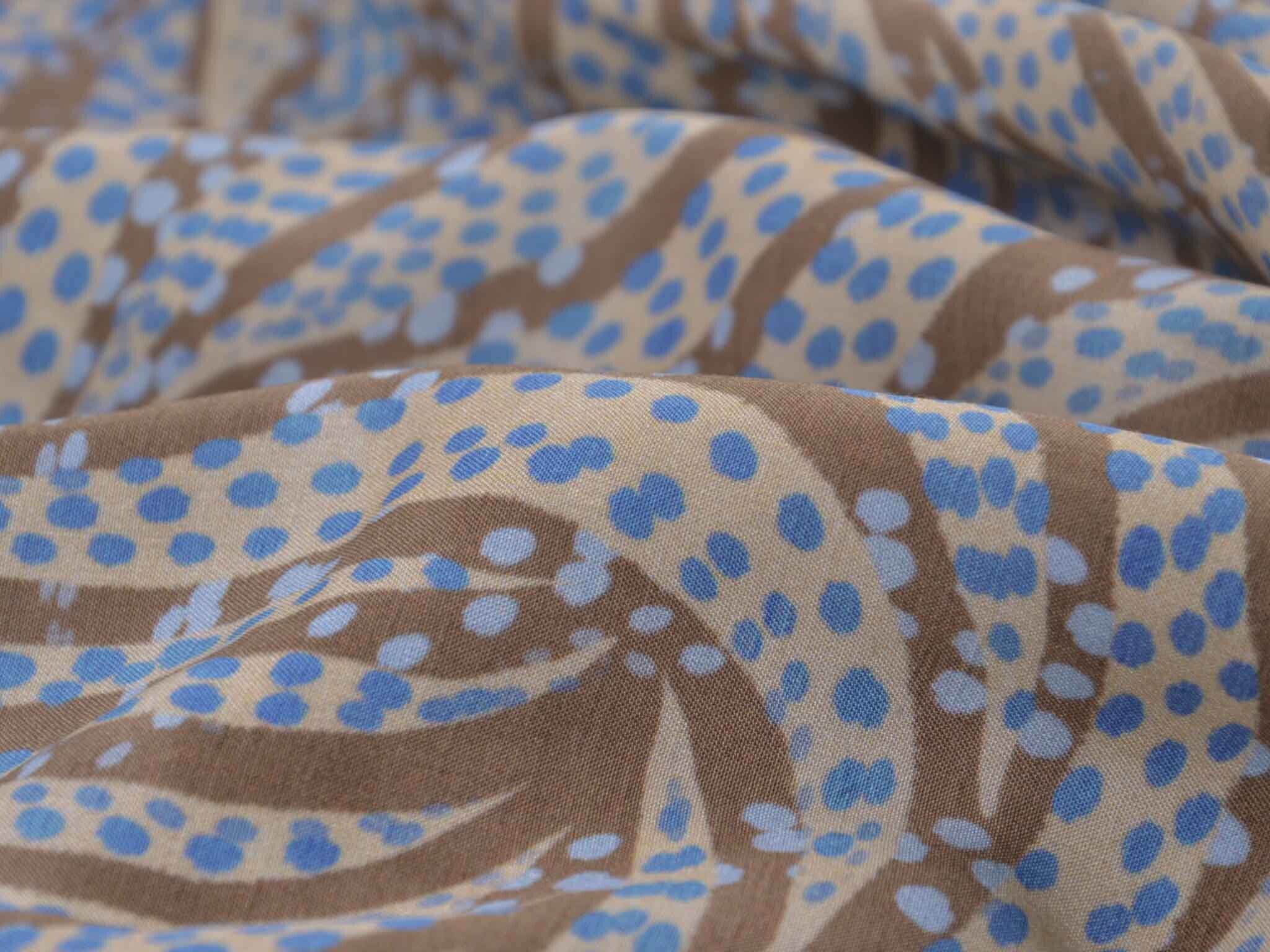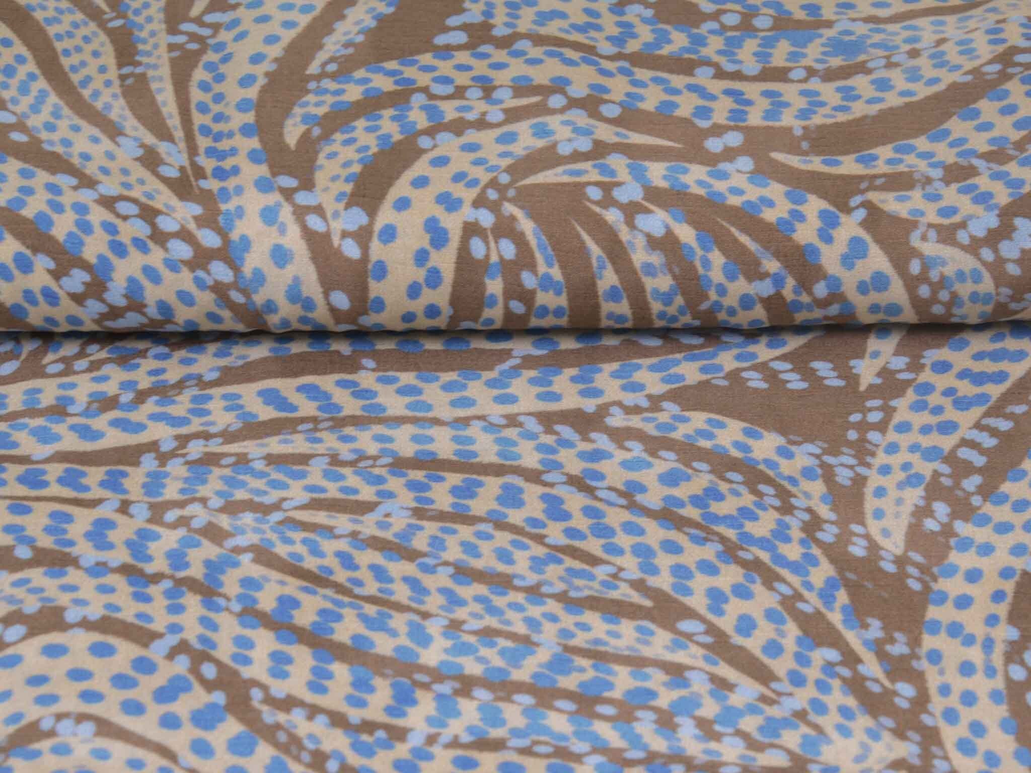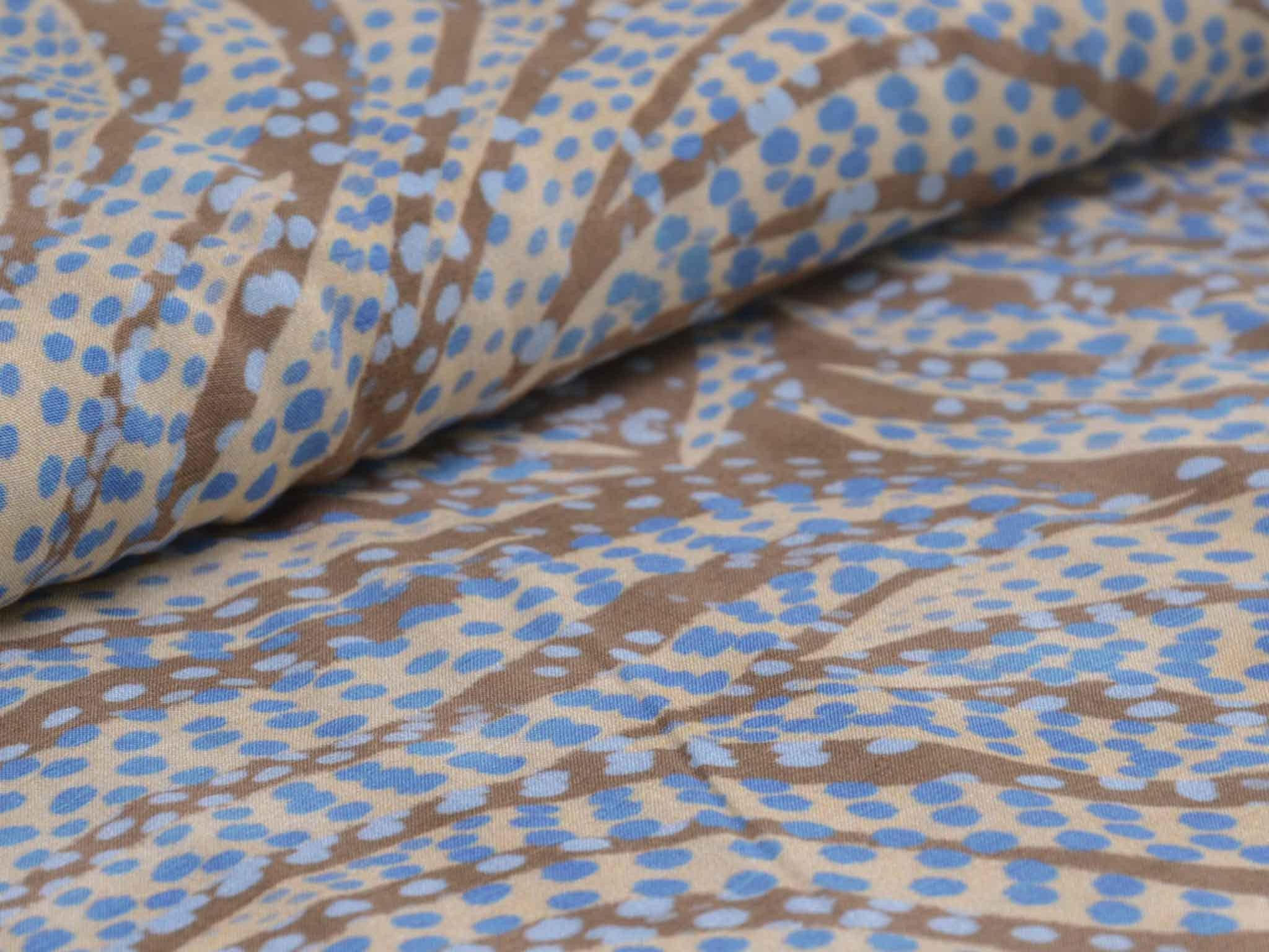 Dünner, leichter Webstoff aus Viskose mit Print in beige und blau. Der Stoff ist glatt und hat einen schönen Fall. Nähe dir daraus tolle Sommerblusen, Kleider, Röcke, Hosen und so vieles mehr.