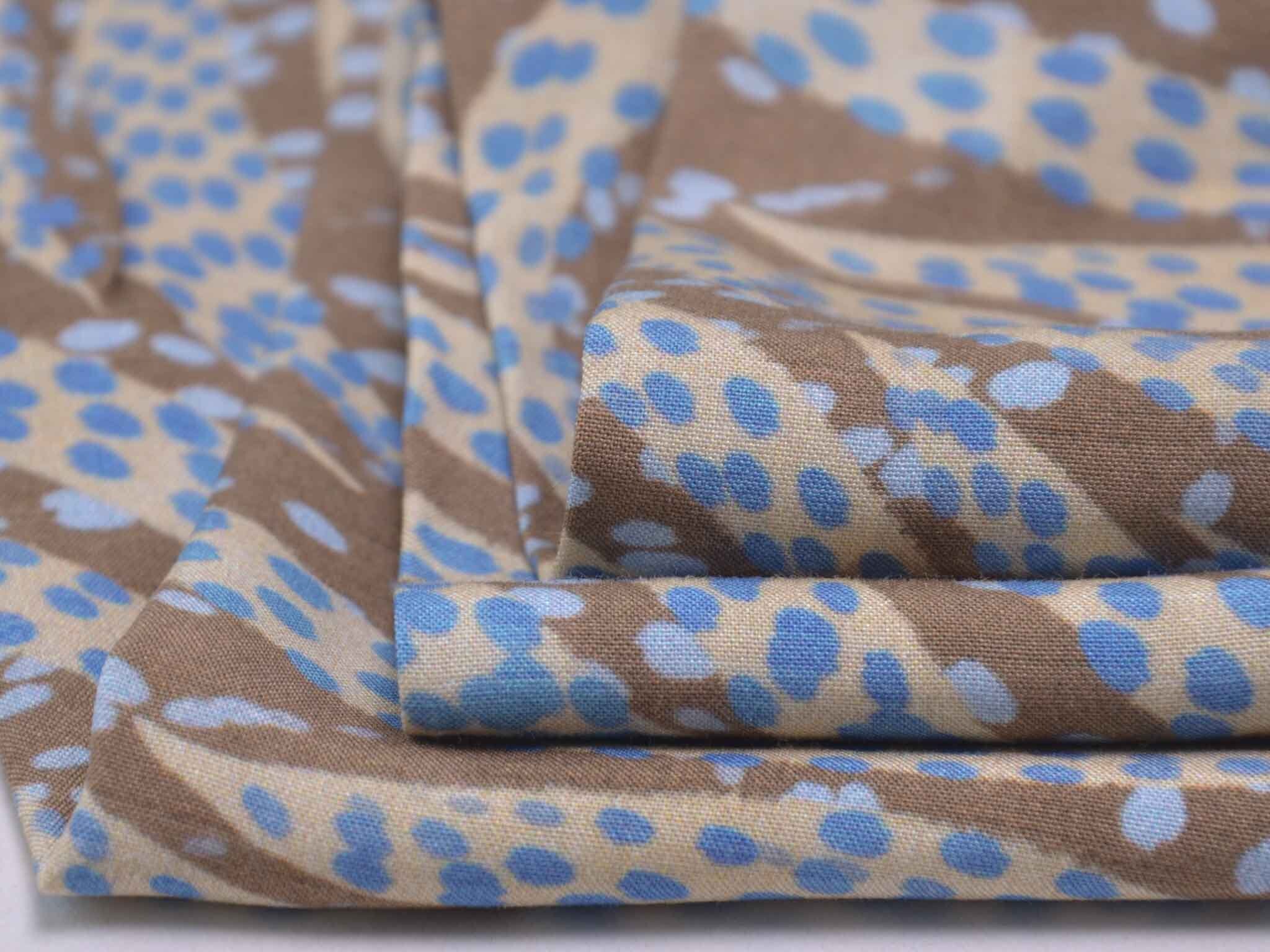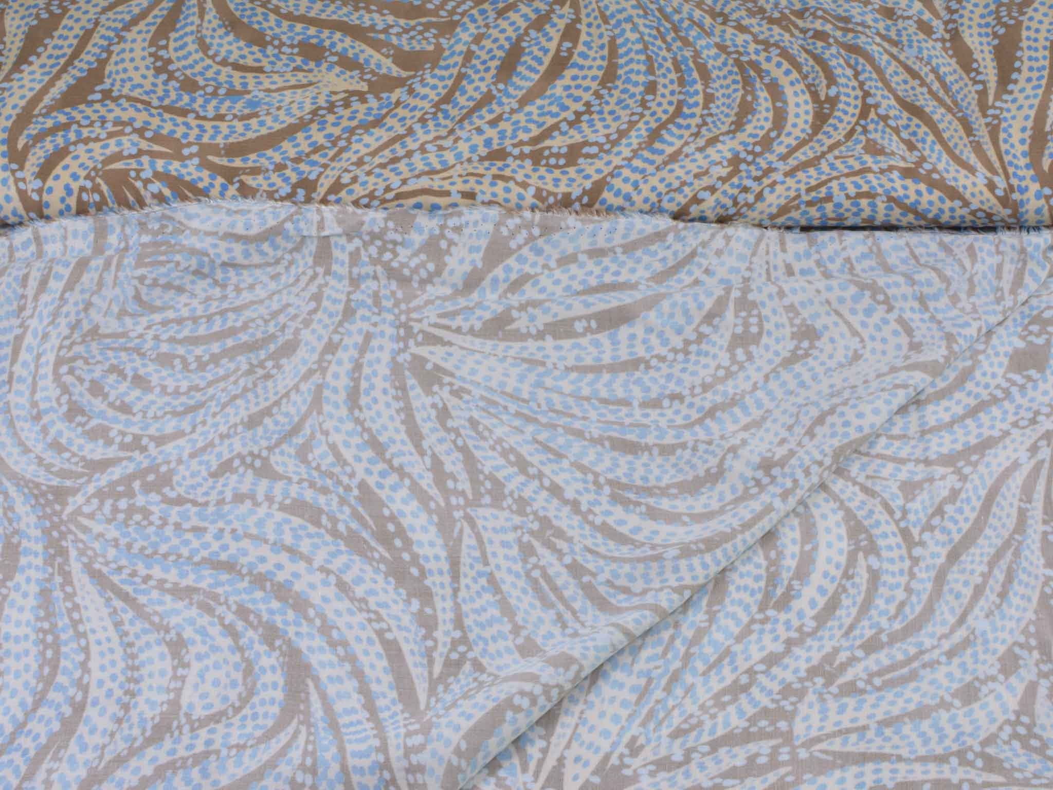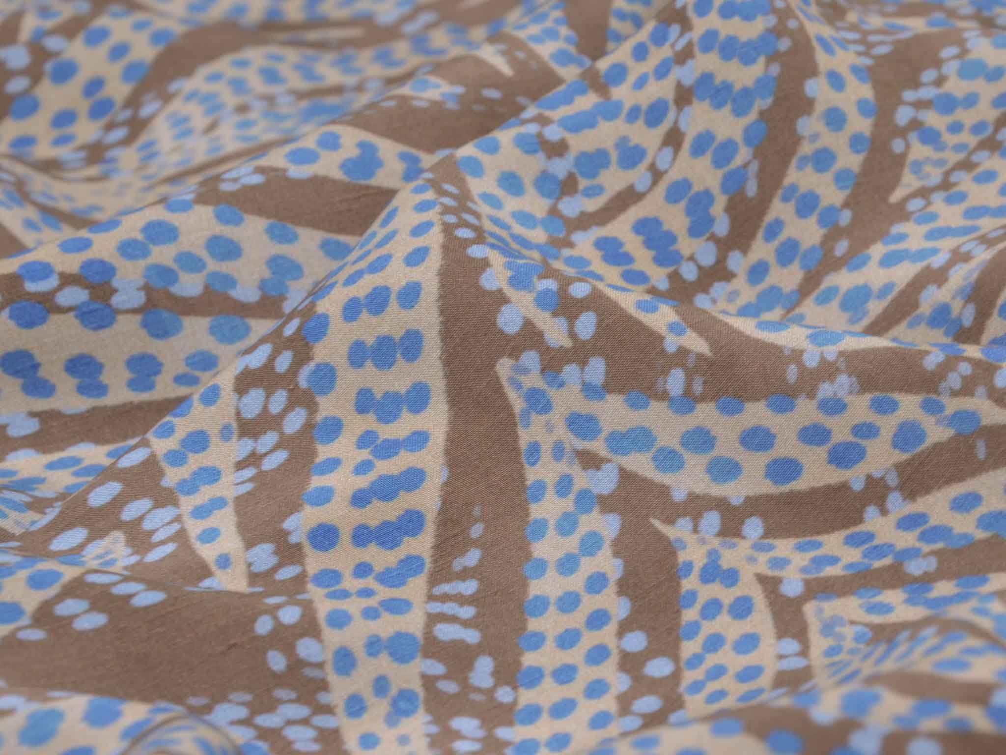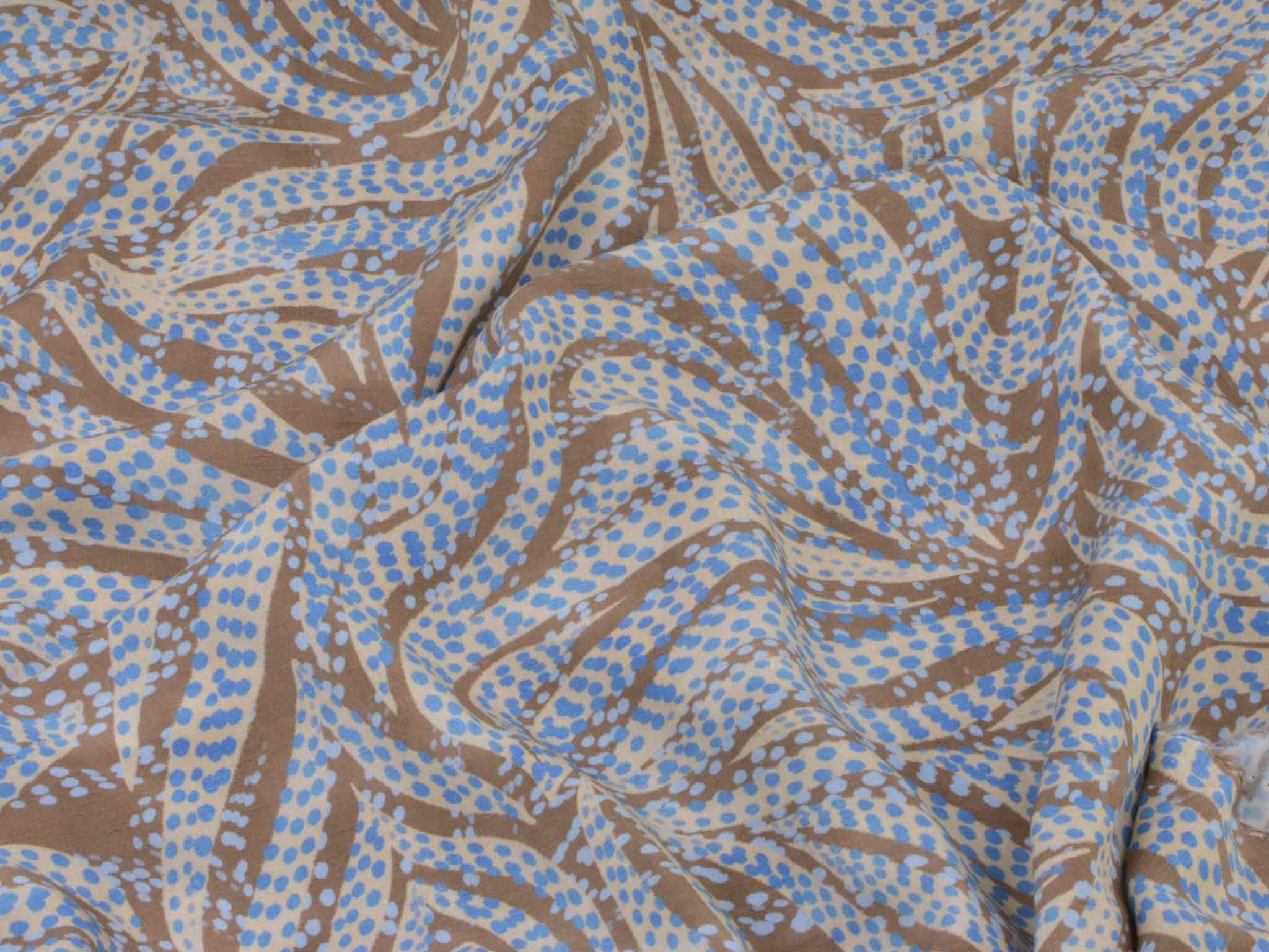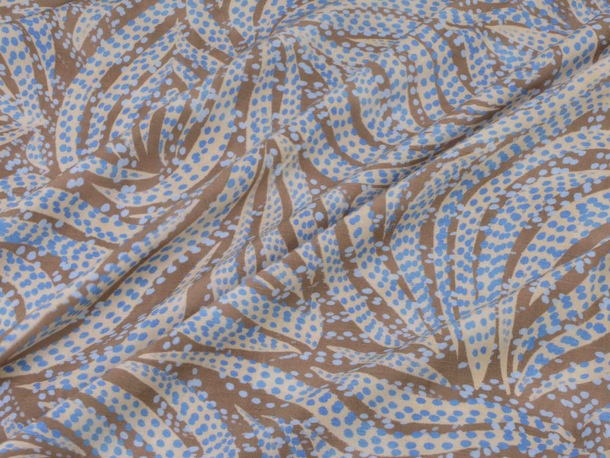 Dünner, leichter Webstoff aus Viskose mit Print in beige und blau. Der Stoff ist glatt und hat einen schönen Fall. Nähe dir daraus tolle Sommerblusen, Kleider, Röcke, Hosen und so vieles mehr.