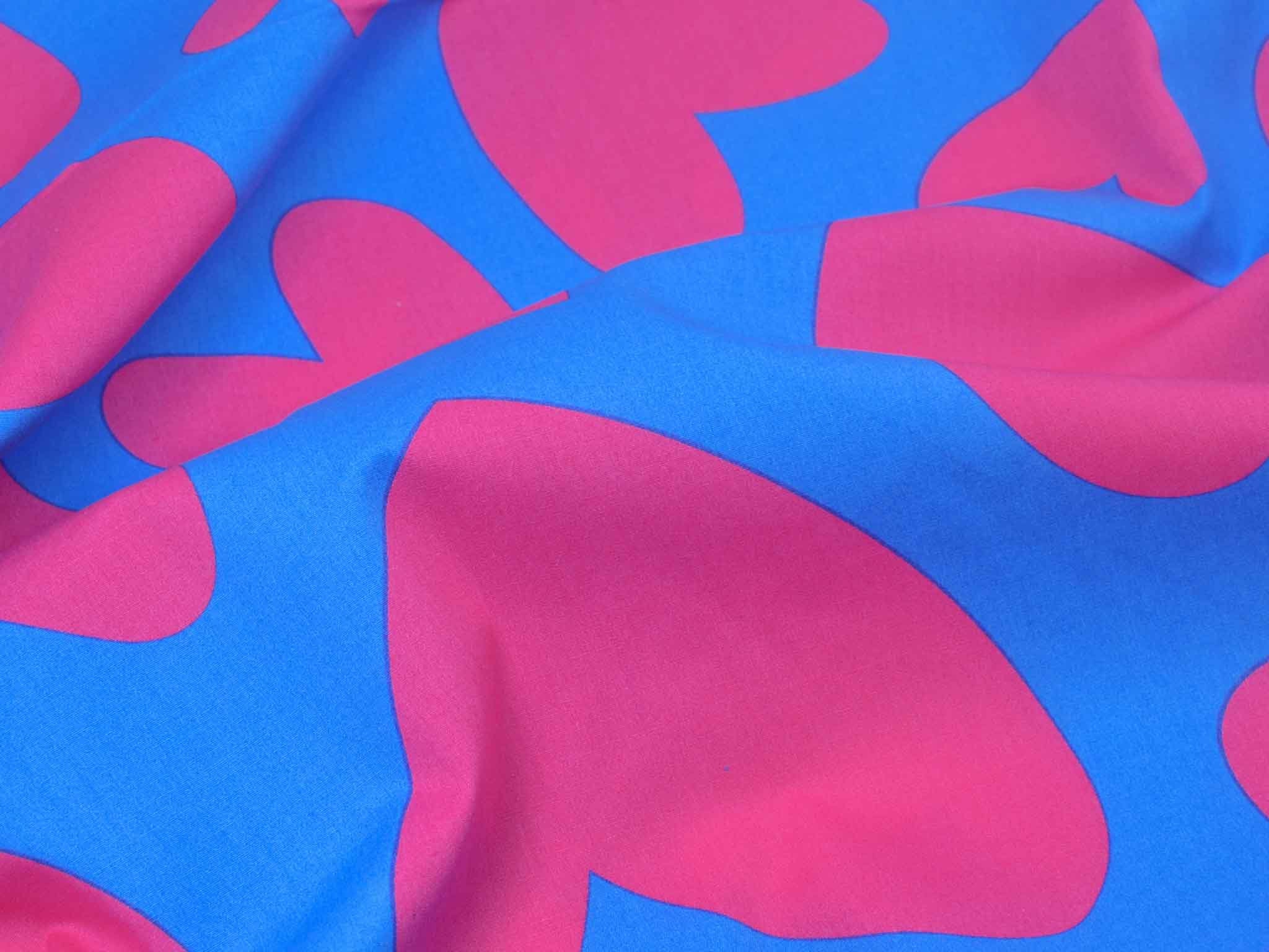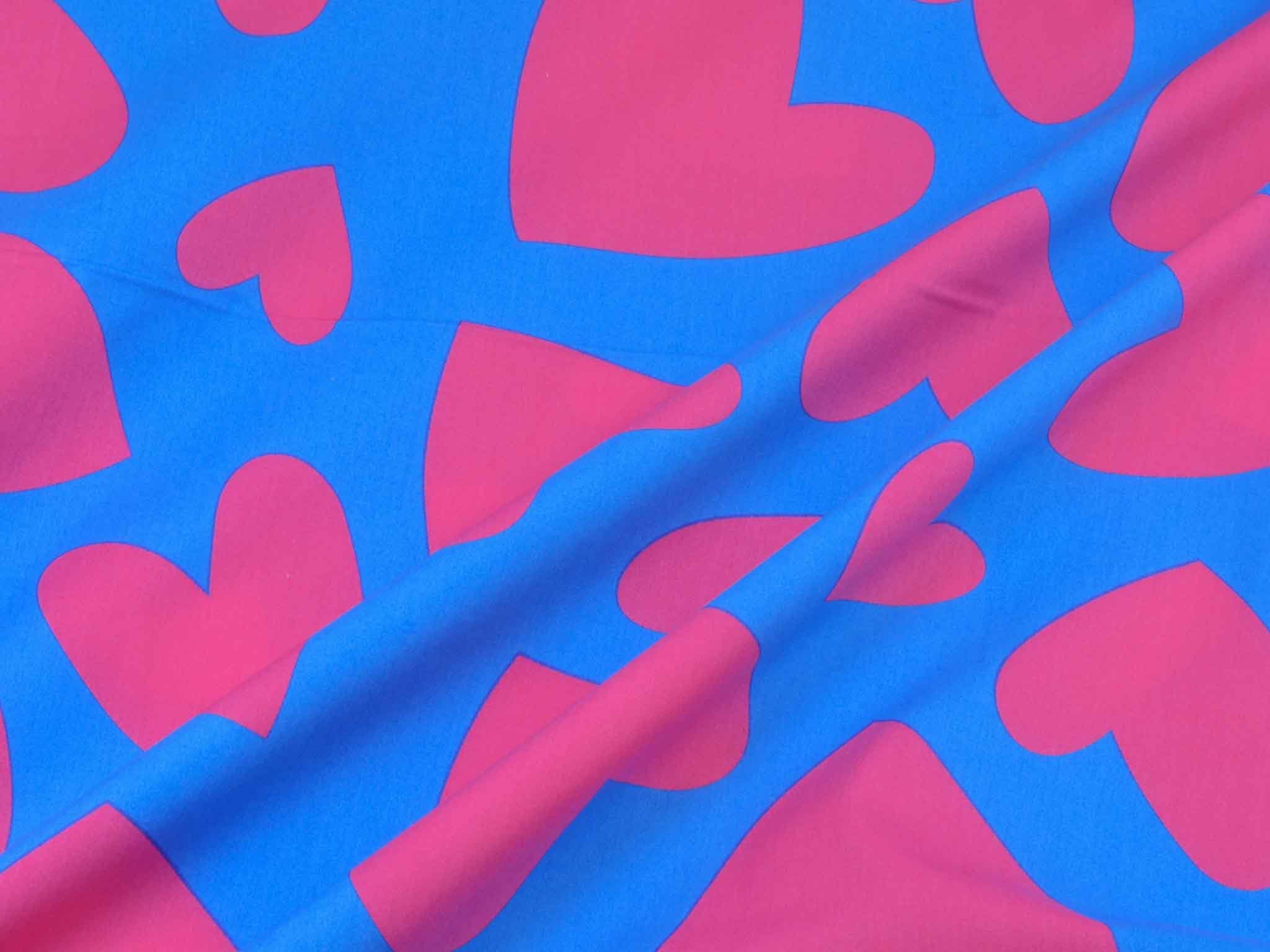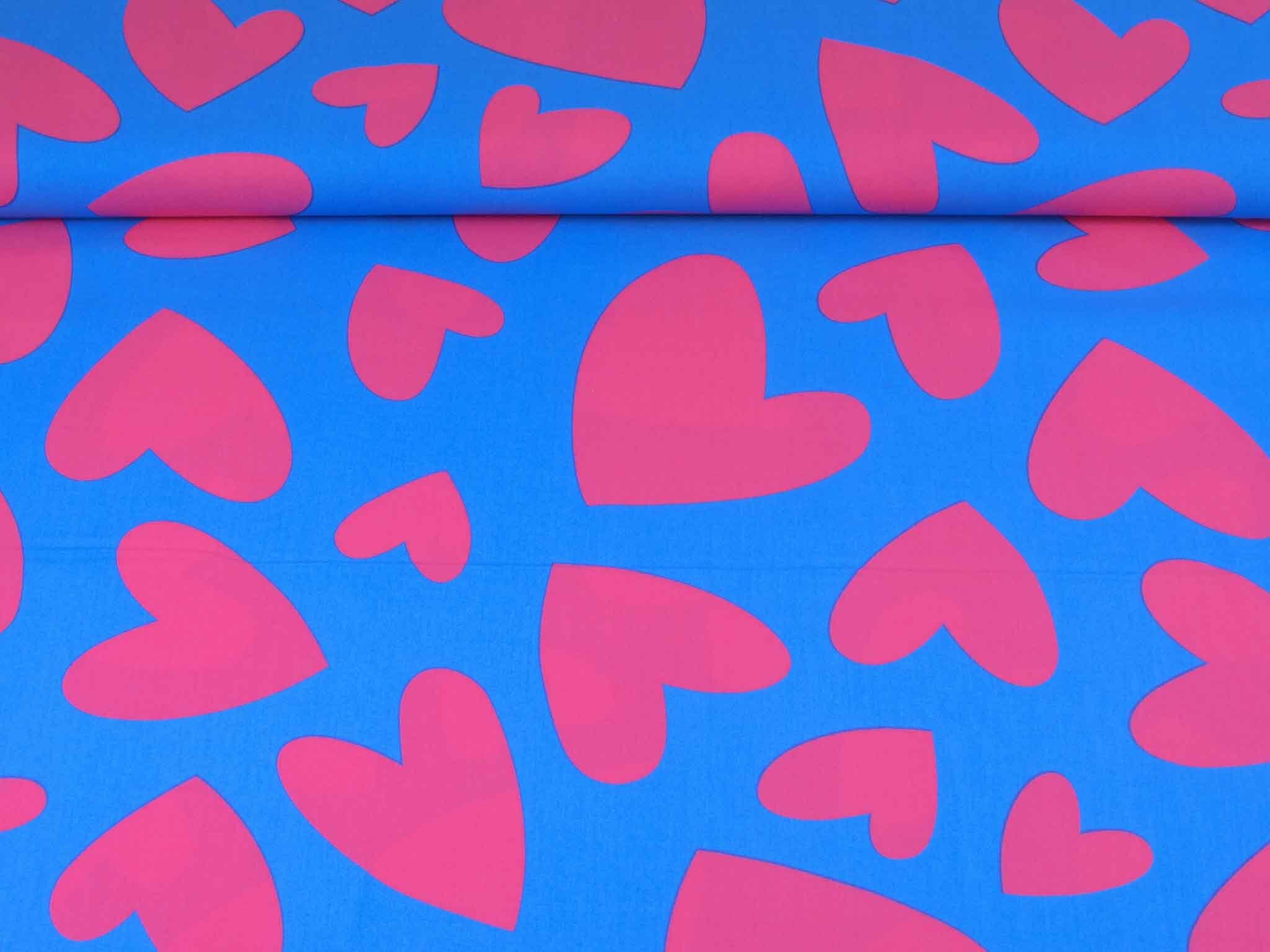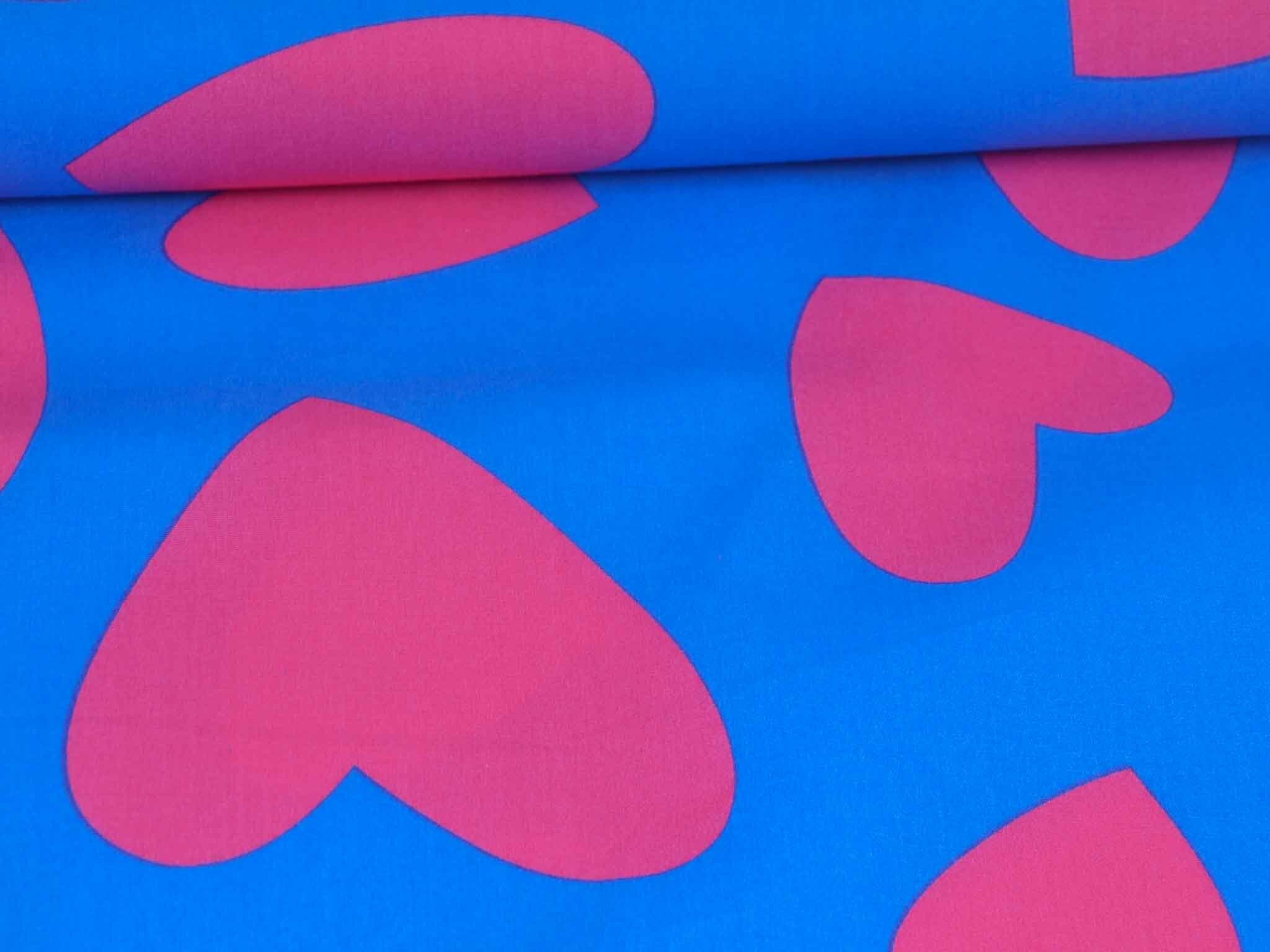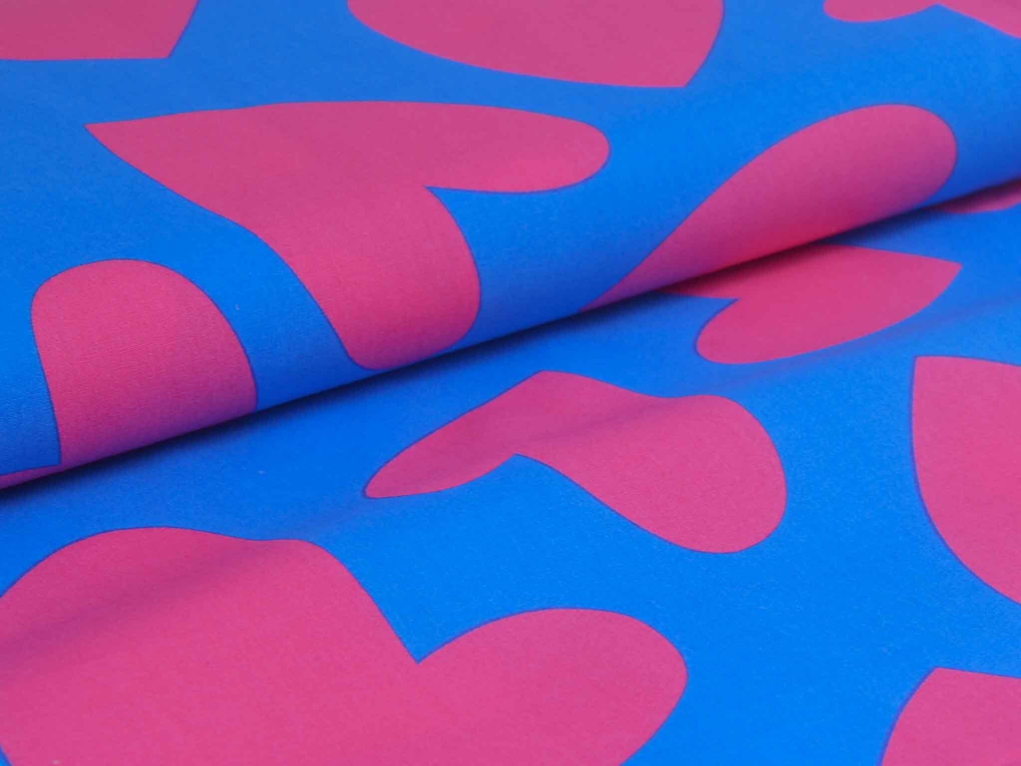Popeline aus 100 % Baumwolle. Der Stoff ist blau mit pinken Herzen ein großes Herz ist ca. 15 cm, ein kleines ca. 8 cm hoch. Er ist glatt und dünn und eignet sich zum Nähen von Blusen, Kleidern, Röcken und vielem mehr.