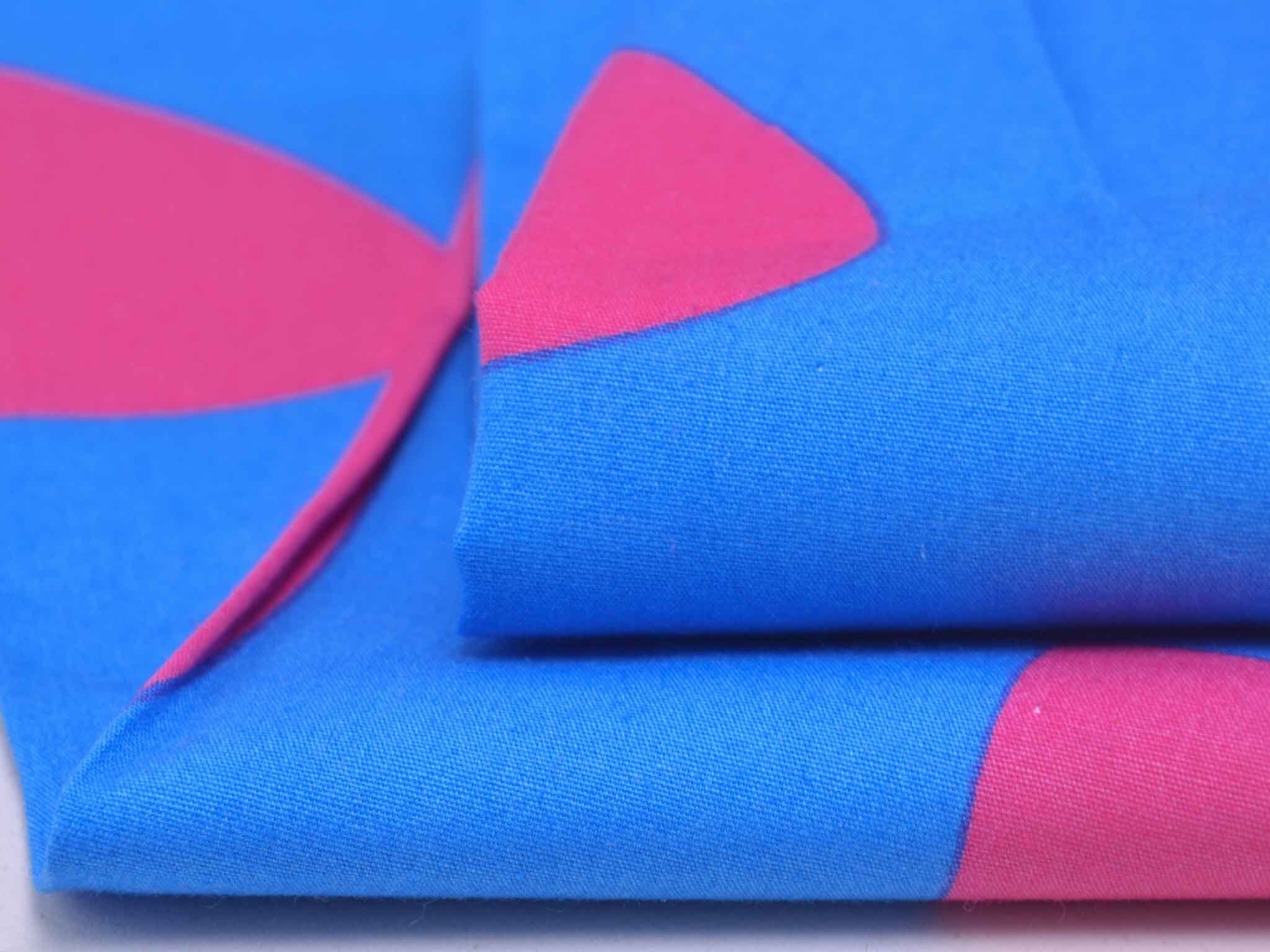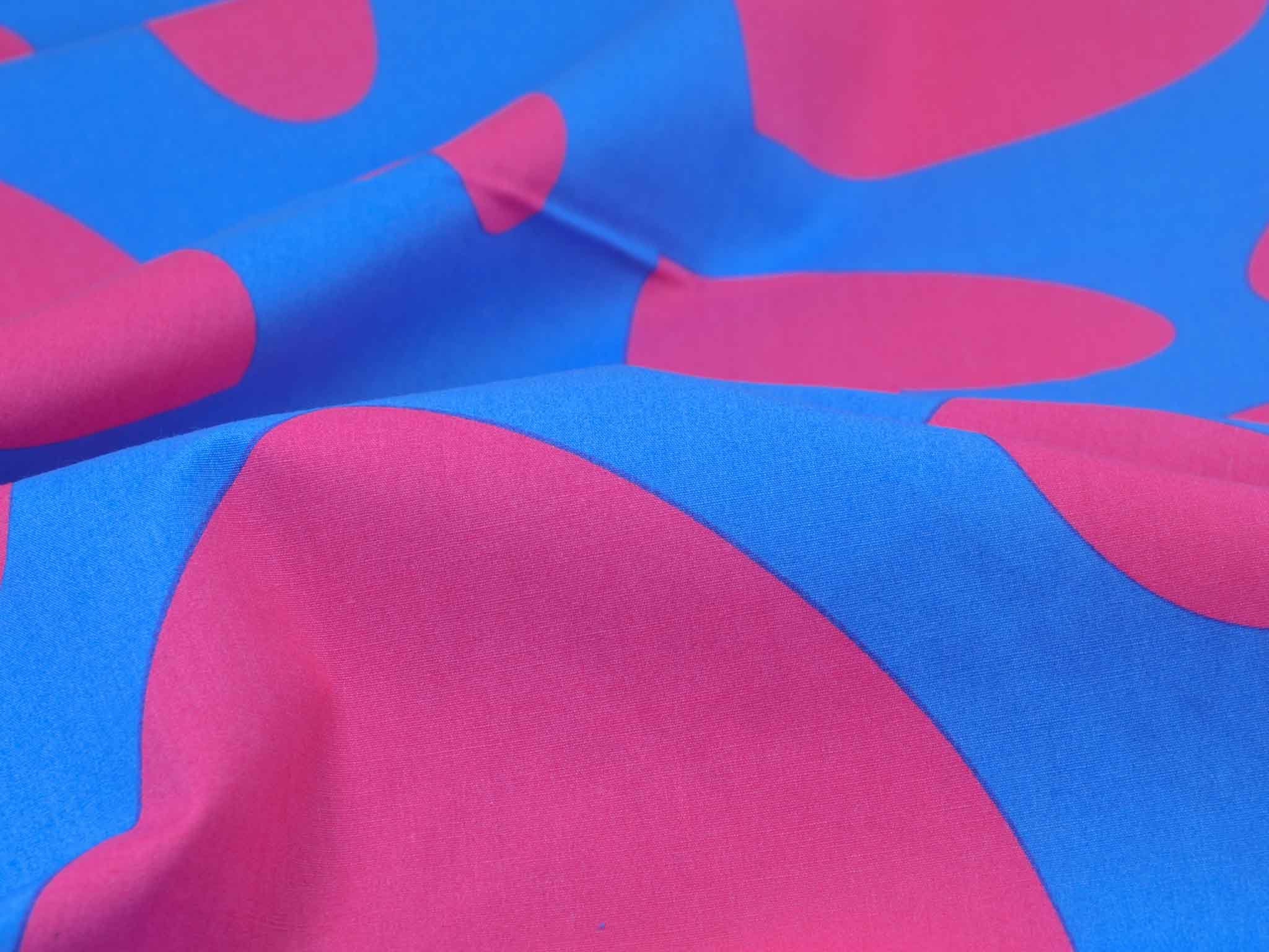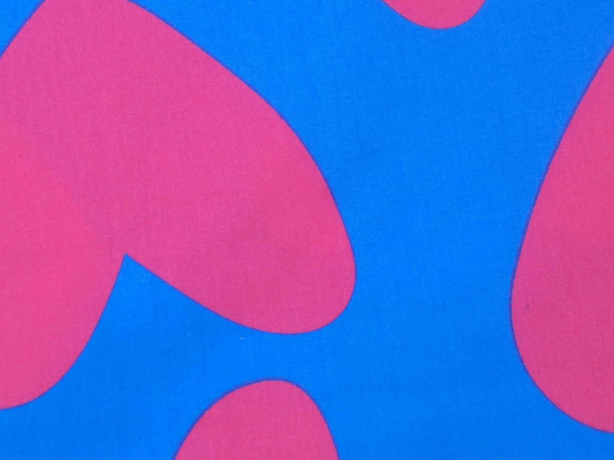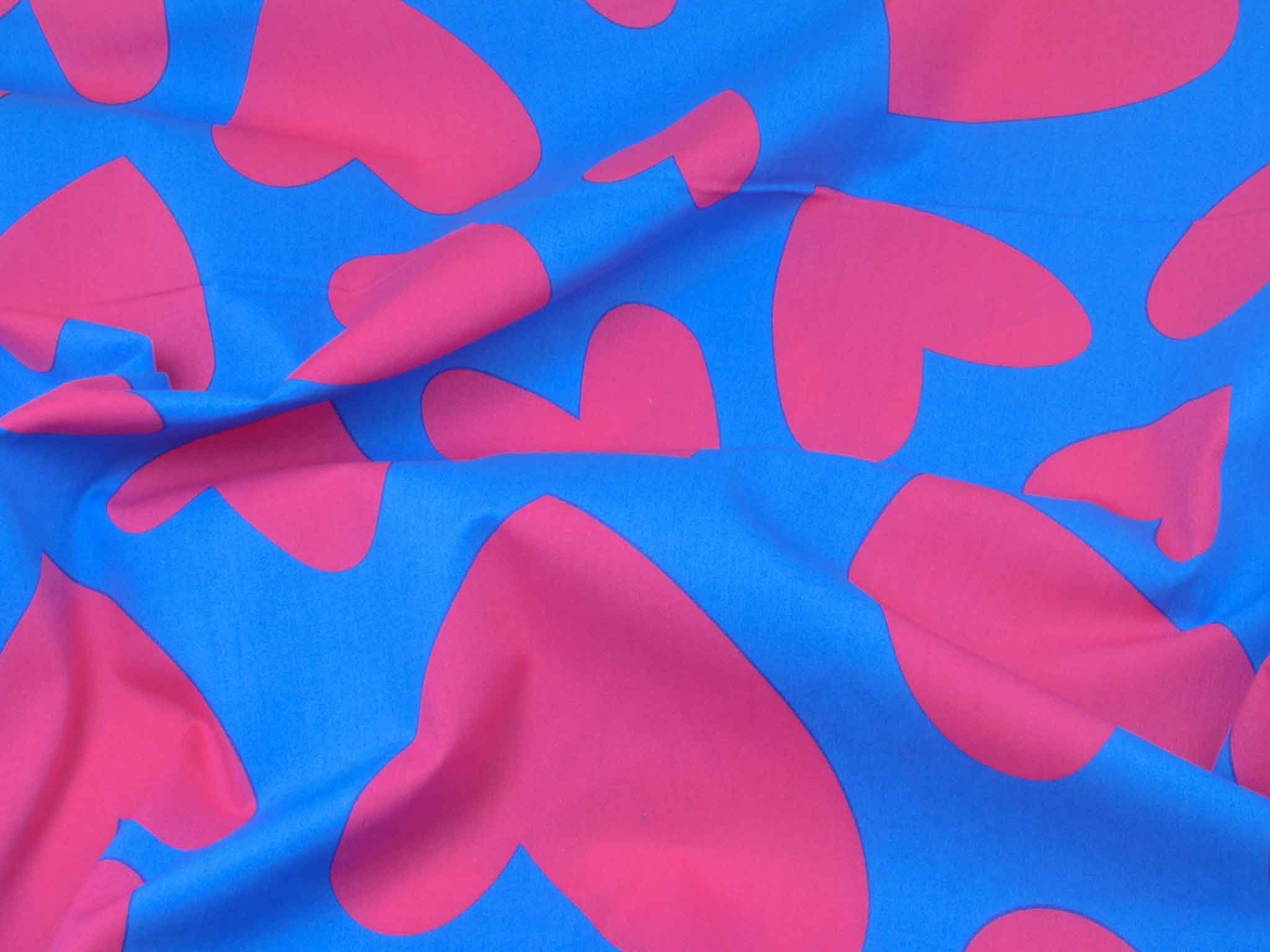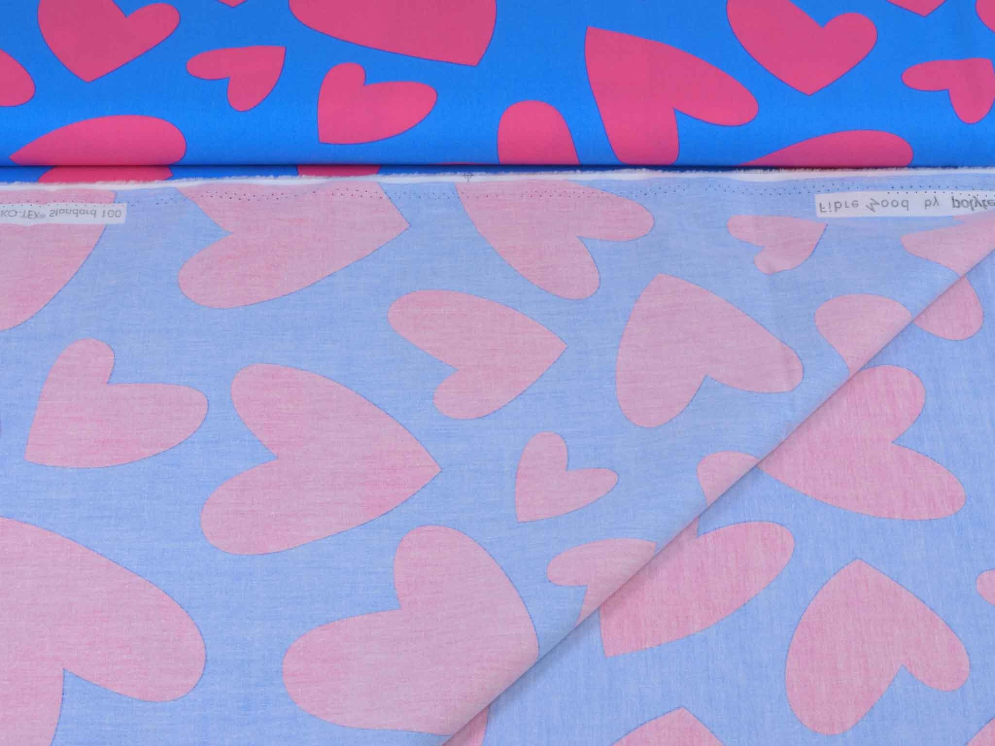 Popeline aus 100 % Baumwolle. Der Stoff ist blau mit pinken Herzen ein großes Herz ist ca. 15 cm, ein kleines ca. 8 cm hoch. Er ist glatt und dünn und eignet sich zum Nähen von Blusen, Kleidern, Röcken und vielem mehr.