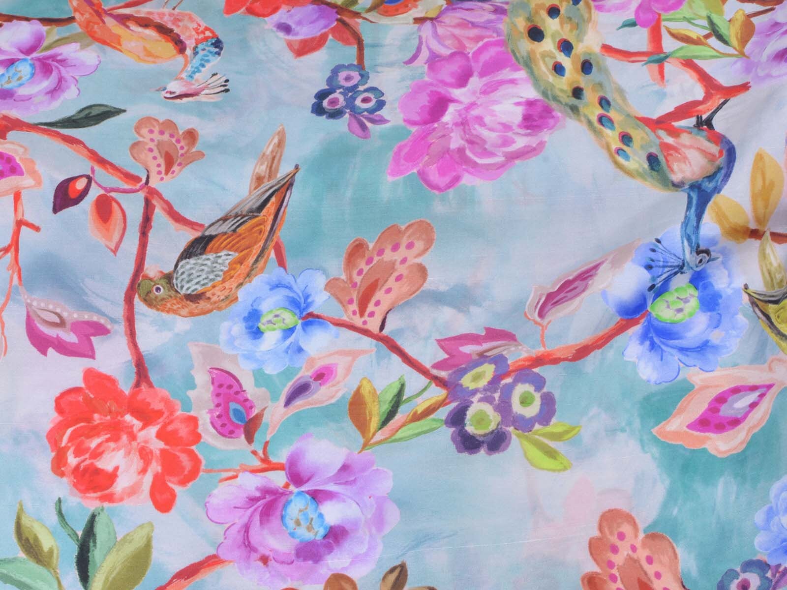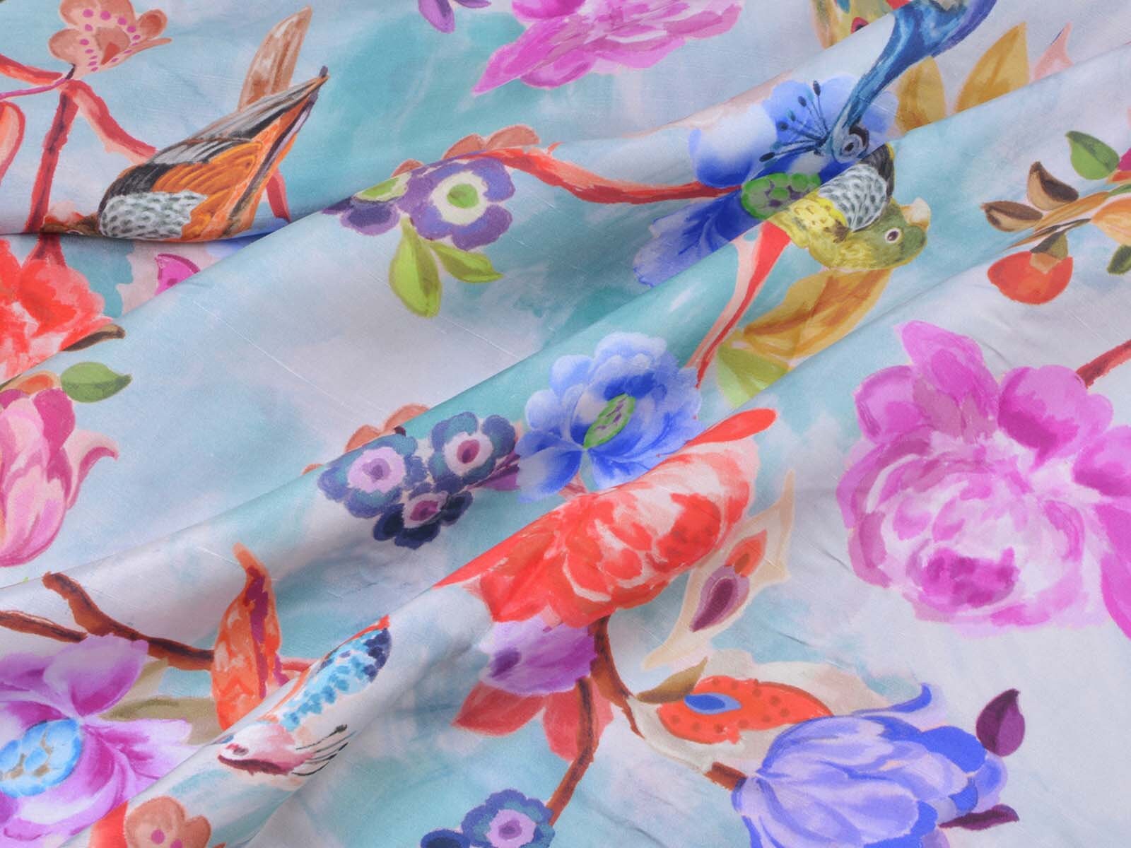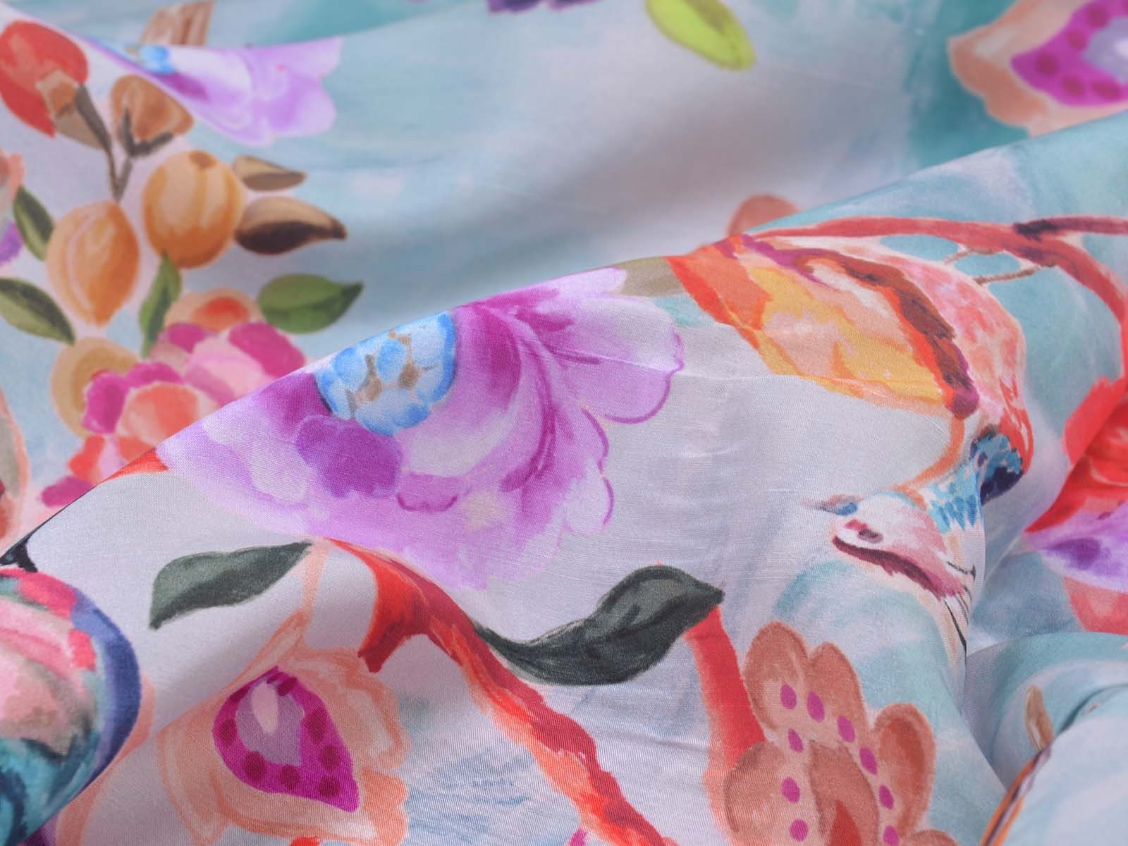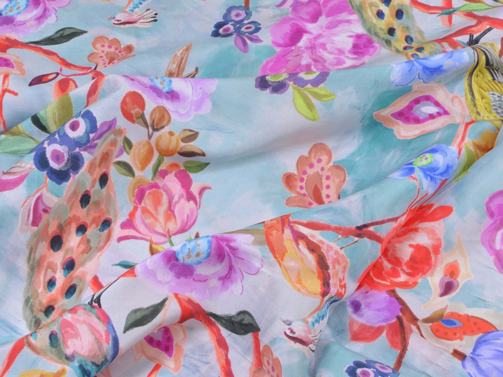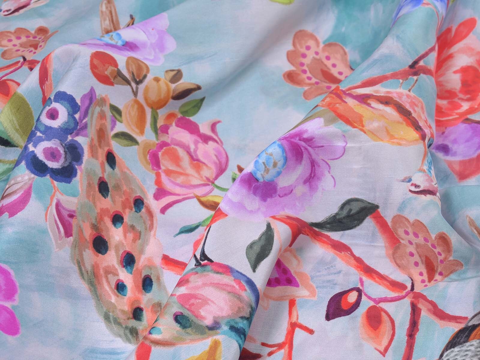 Hochwertiger Webstoff aus reiner Seide aus Italien. Der Stoff ist super leicht, dünn und glatt. Er zeigt bunte Blumen, Papageien und Pfauen. Nähe daraus Blusen, Kleider, Röcke, Tücher und vieles mehr.
