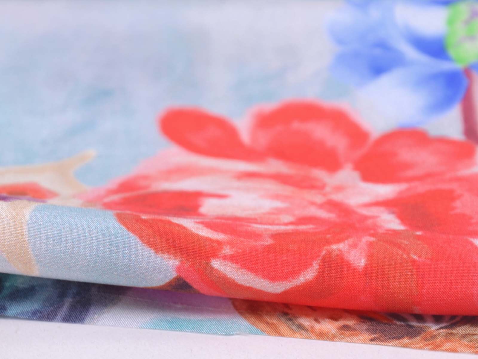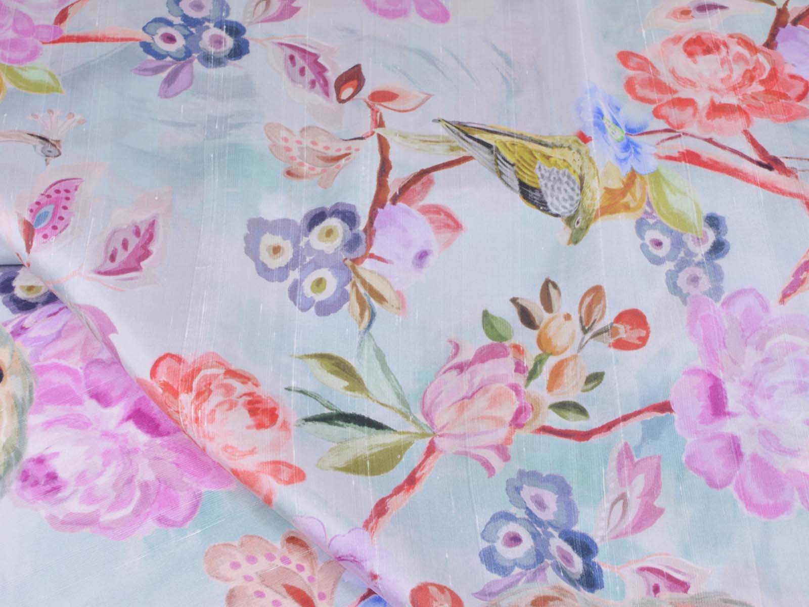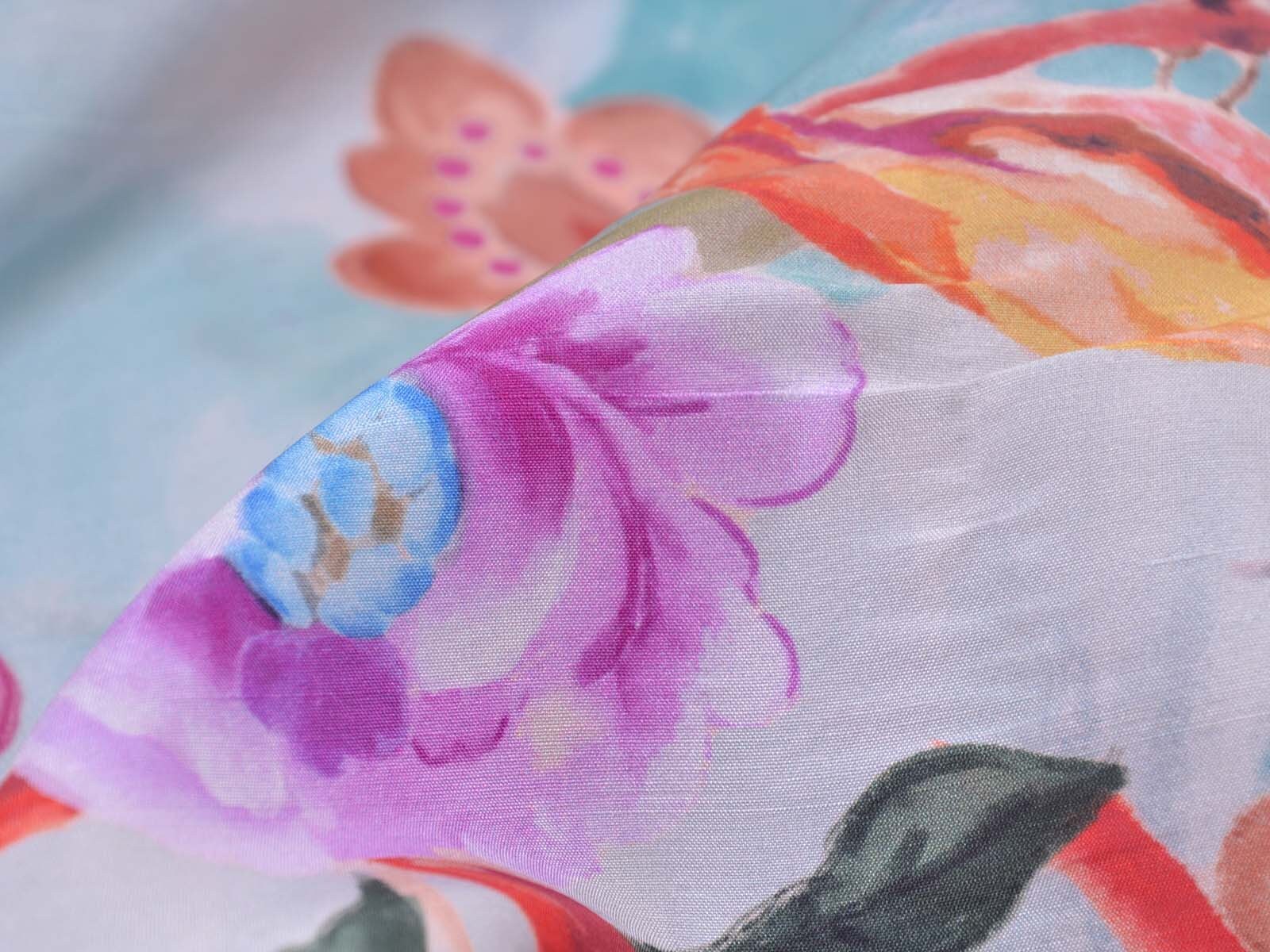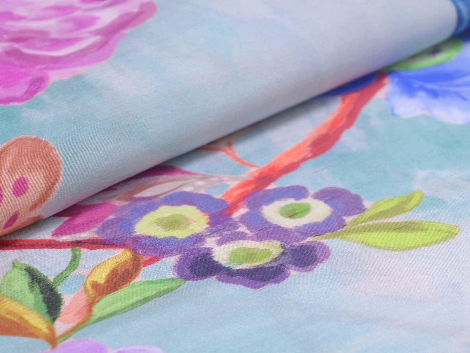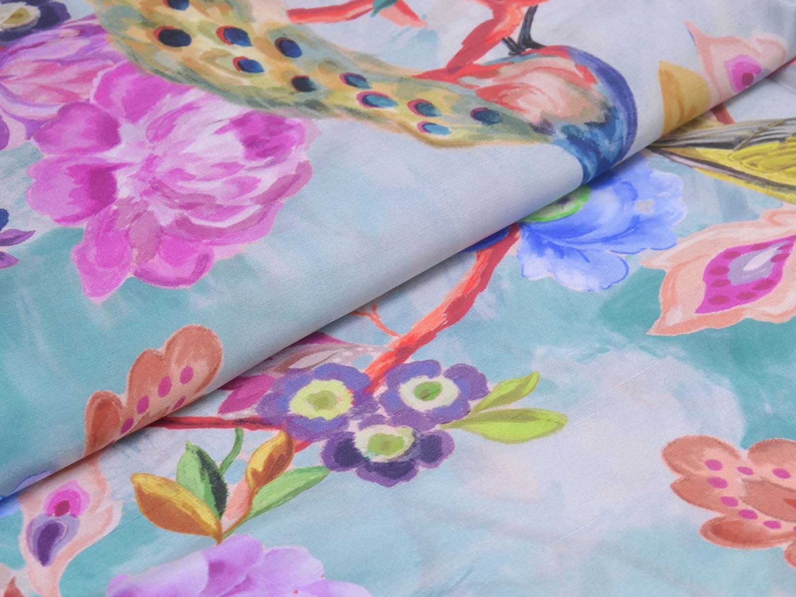 Hochwertiger Webstoff aus reiner Seide aus Italien. Der Stoff ist super leicht, dünn und glatt. Er zeigt bunte Blumen, Papageien und Pfauen. Nähe daraus Blusen, Kleider, Röcke, Tücher und vieles mehr.