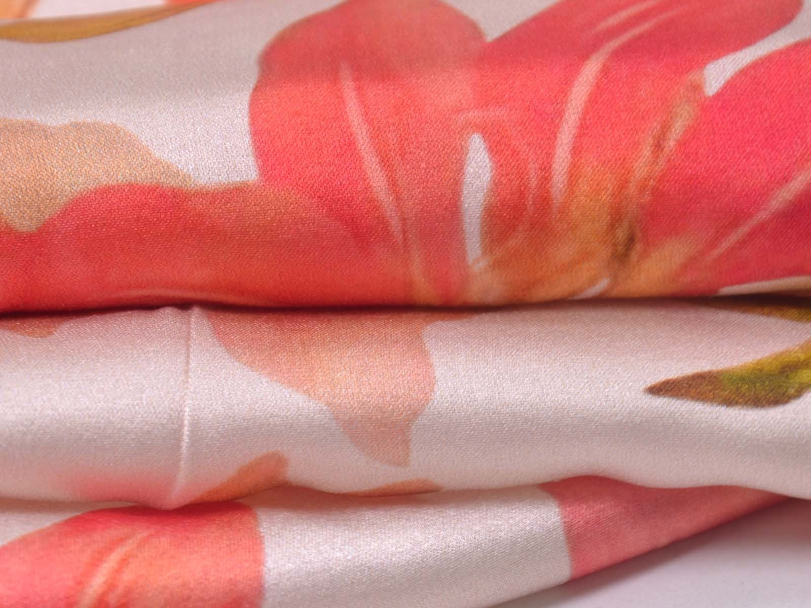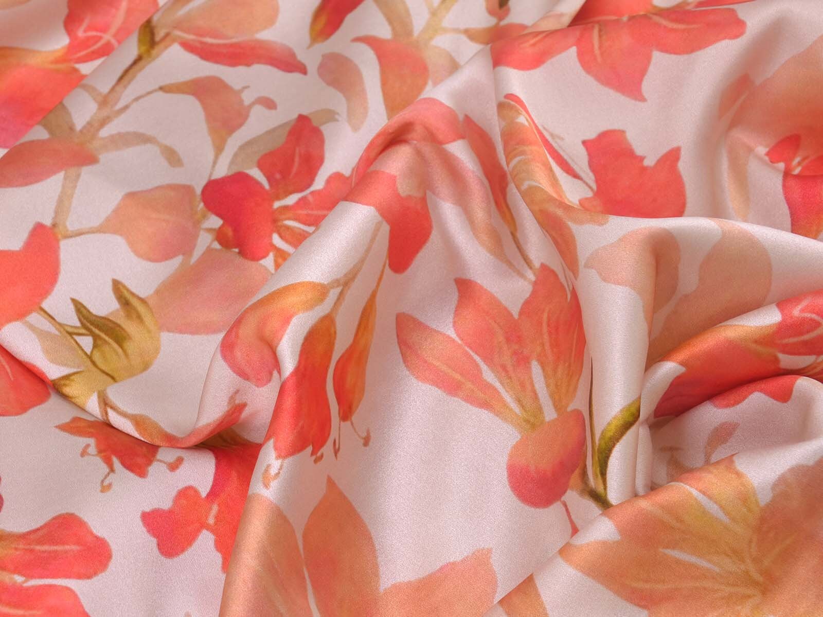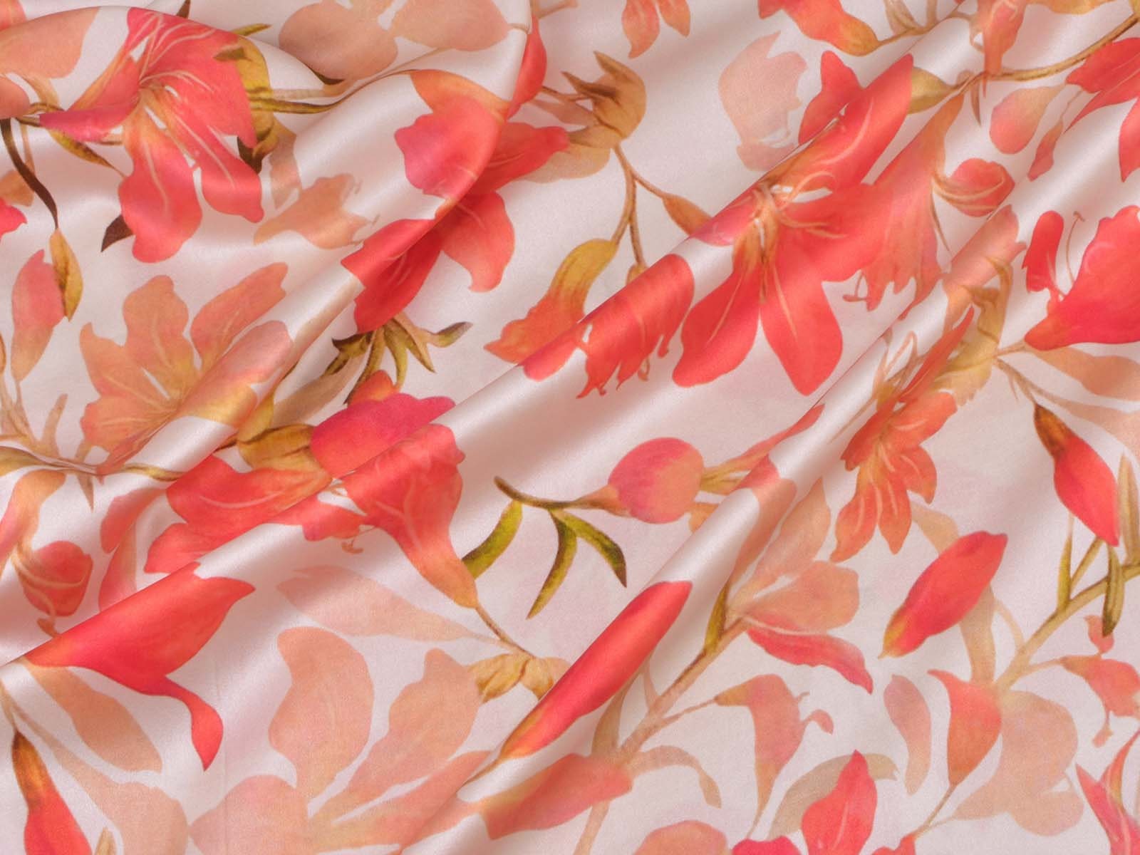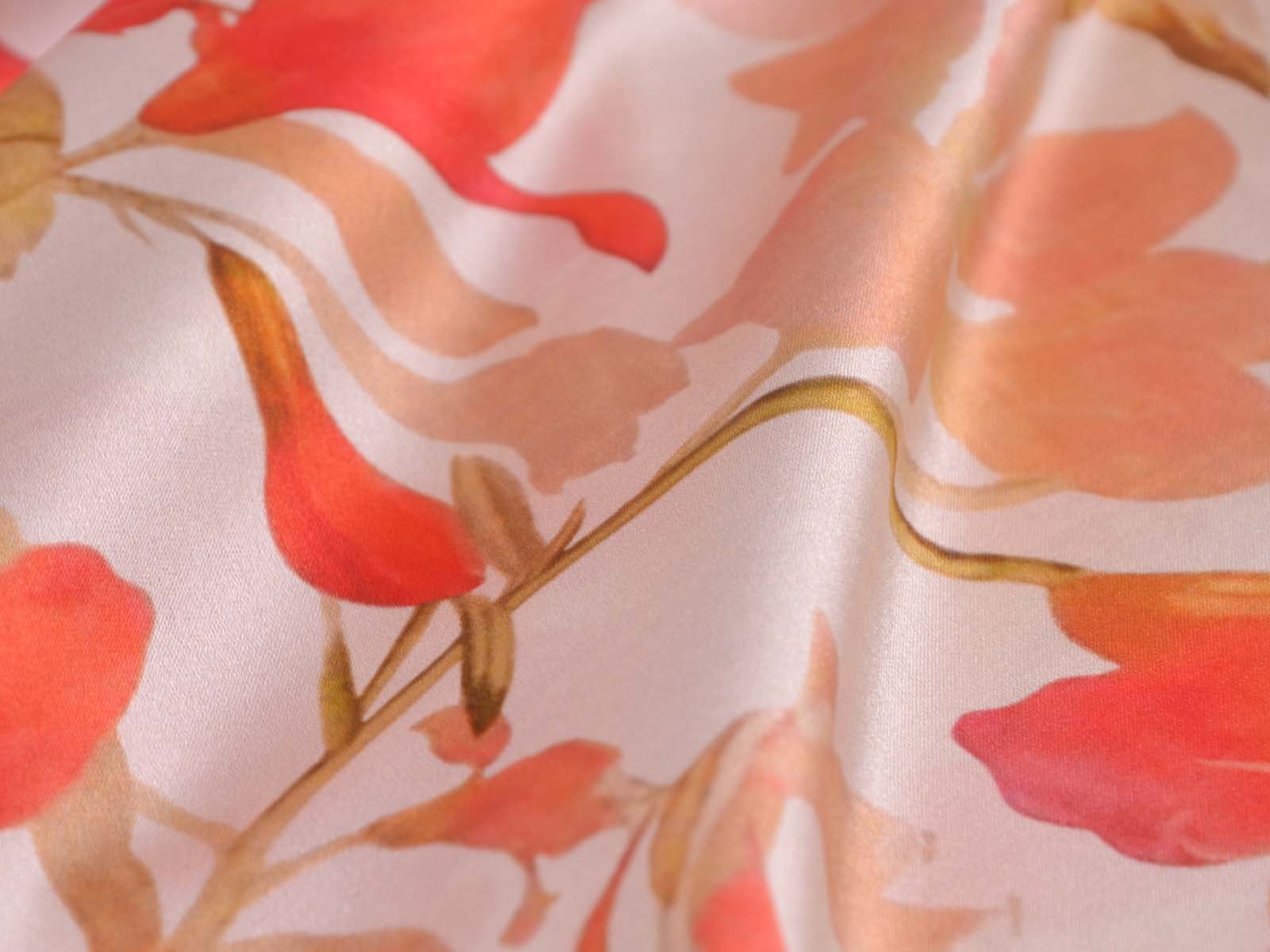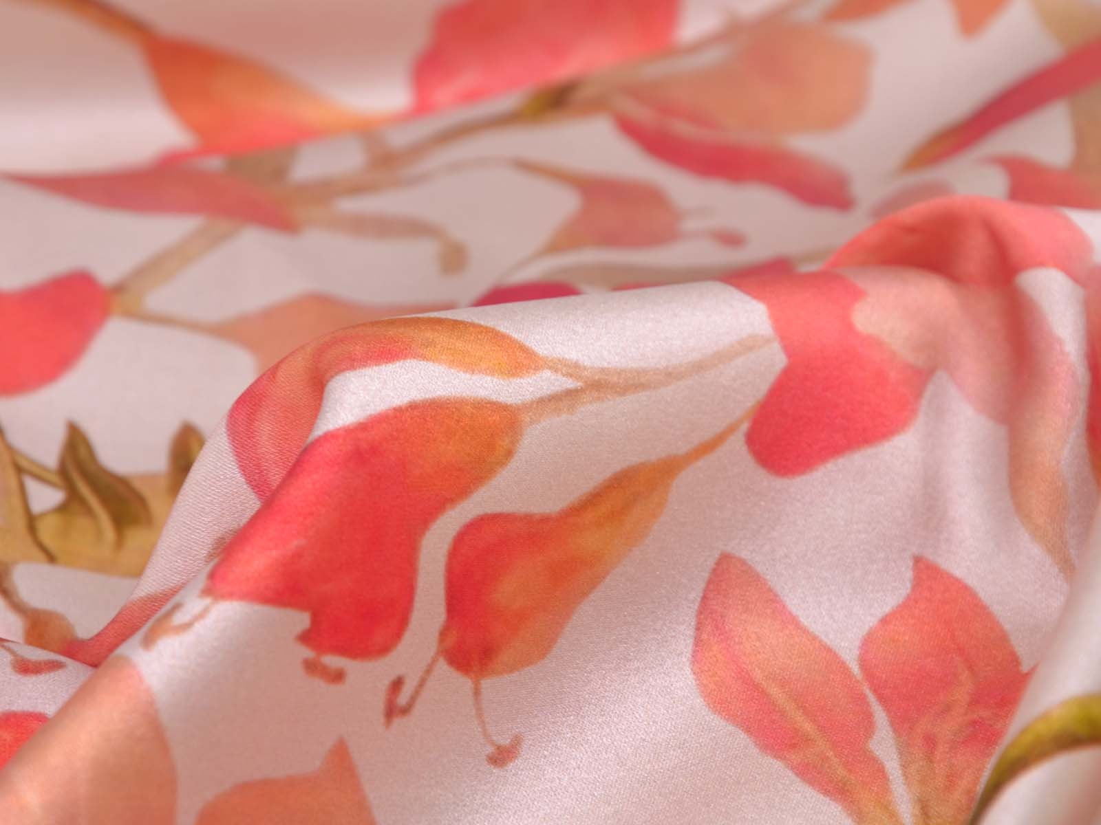 Sehr hochwertiger Seidenstoff mit Elastan aus Italian. Der Stoff zeigt rote Blumen auf beige. Die Seide glänzt edel, ist glatt und hat einen wunderschönen, fließenden Fall. Nähe dir daraus schicke Blusen und Kleider.
