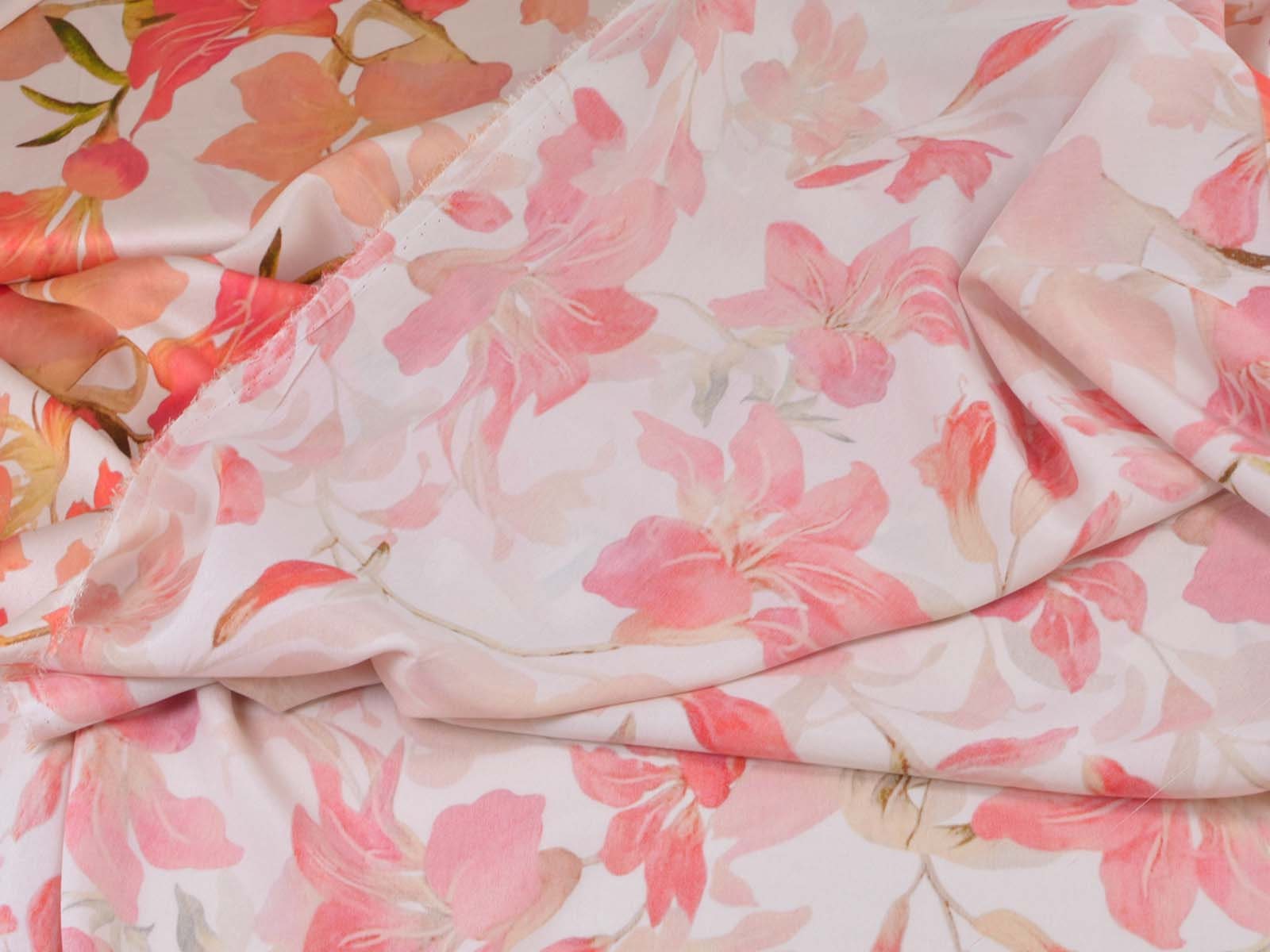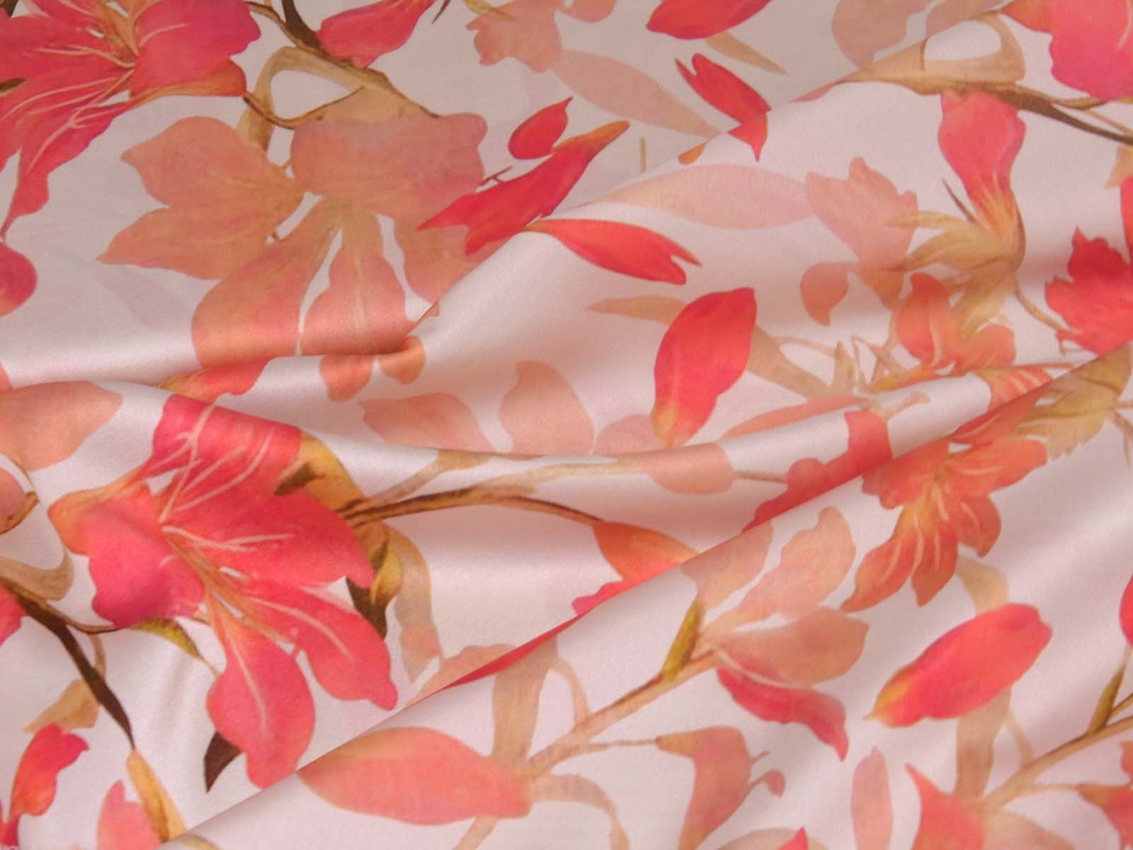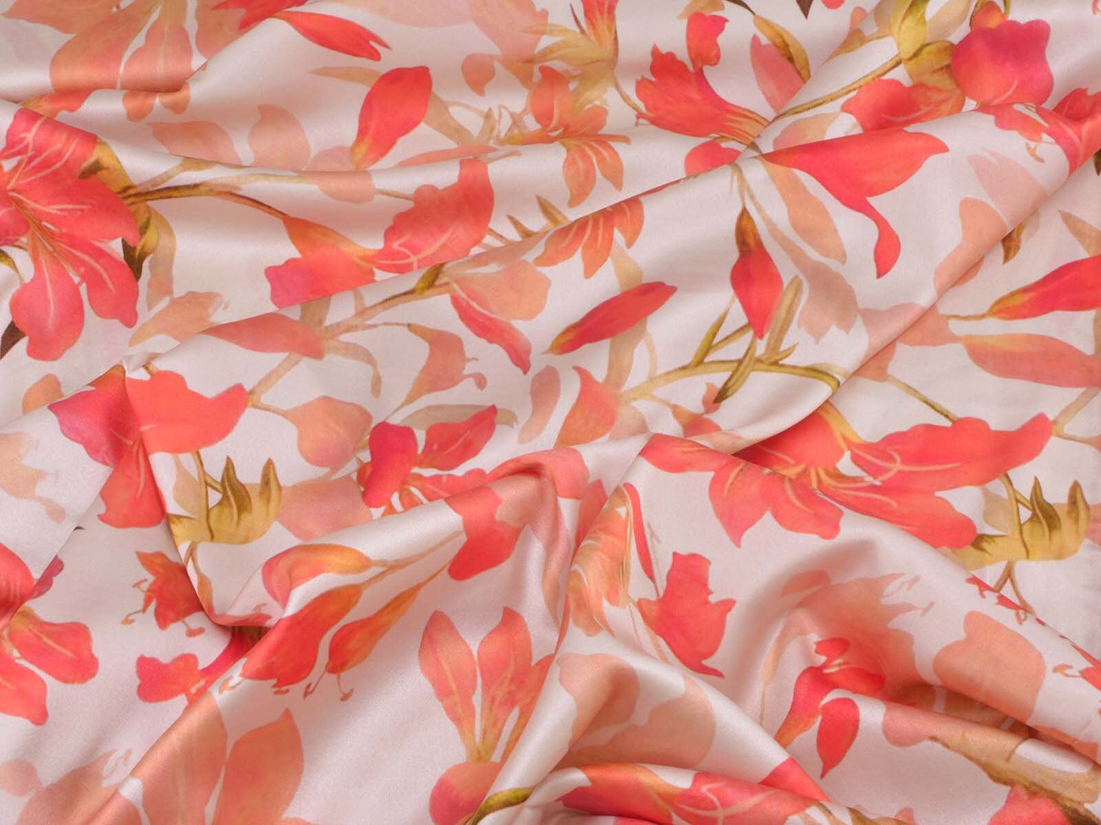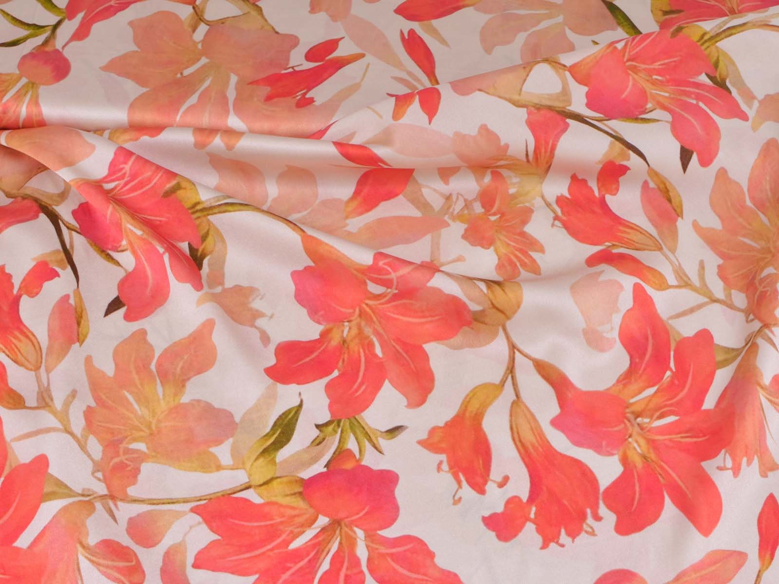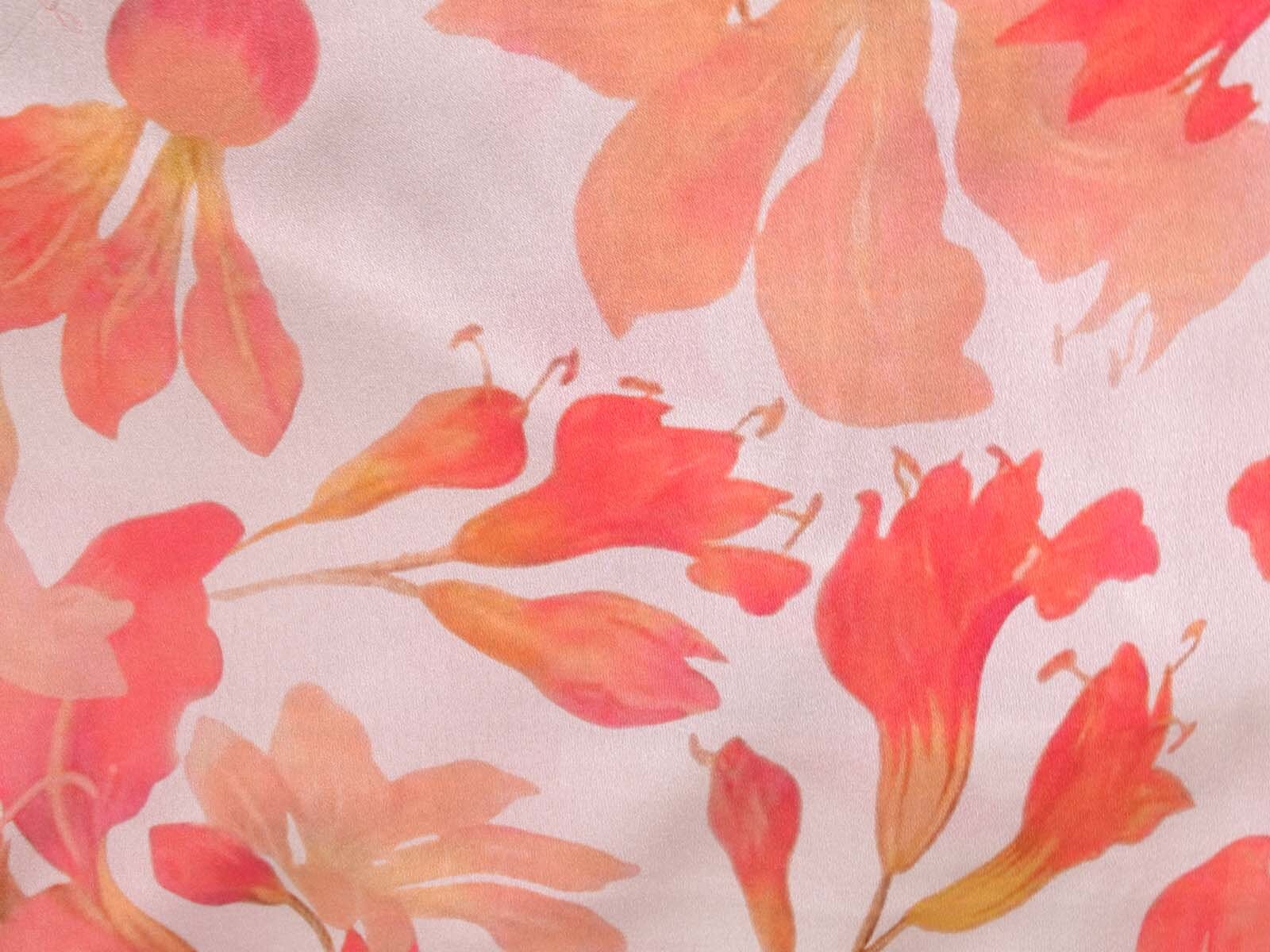 Sehr hochwertiger Seidenstoff mit Elastan aus Italian. Der Stoff zeigt rote Blumen auf beige. Die Seide glänzt edel, ist glatt und hat einen wunderschönen, fließenden Fall. Nähe dir daraus schicke Blusen und Kleider.